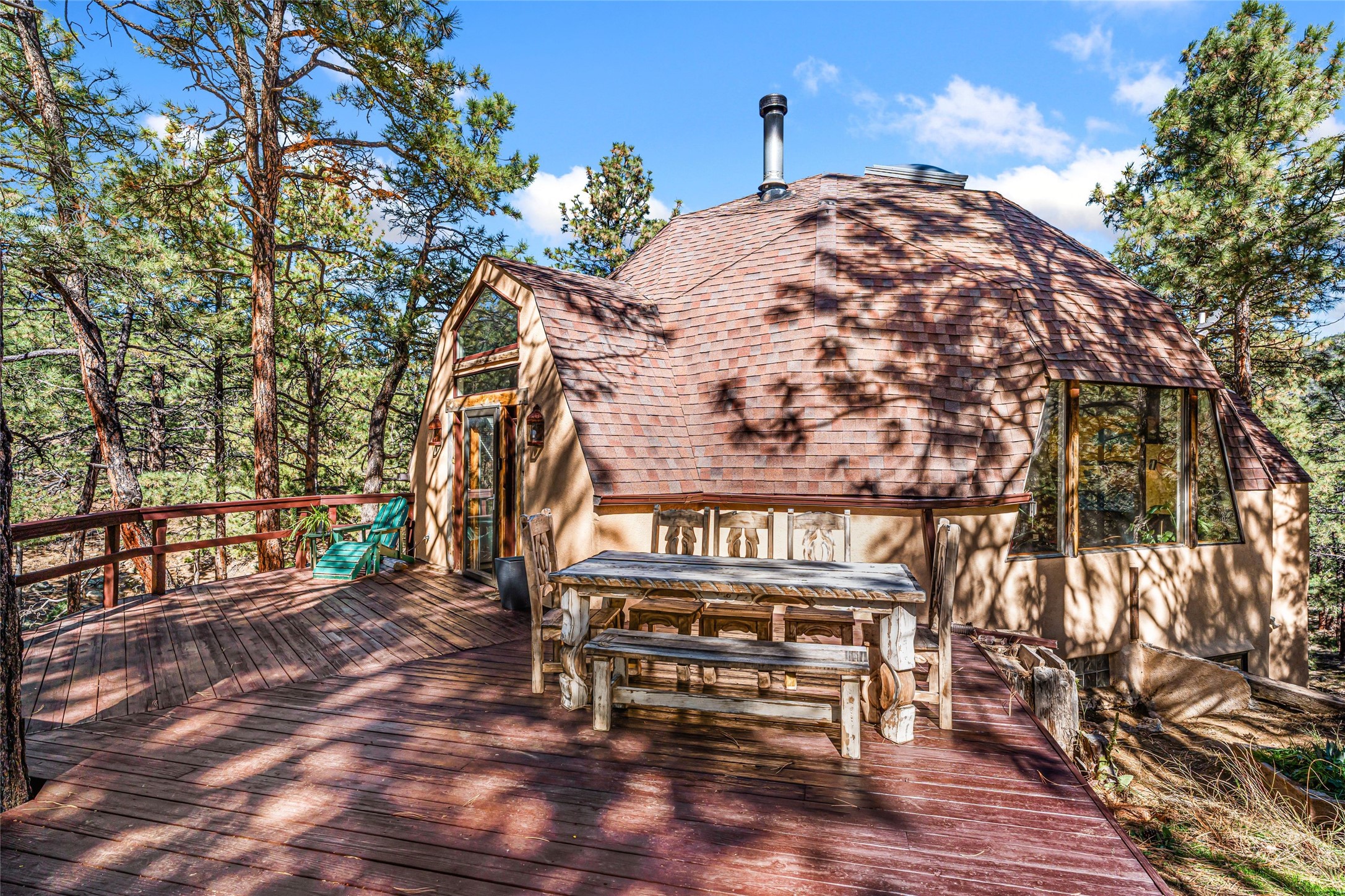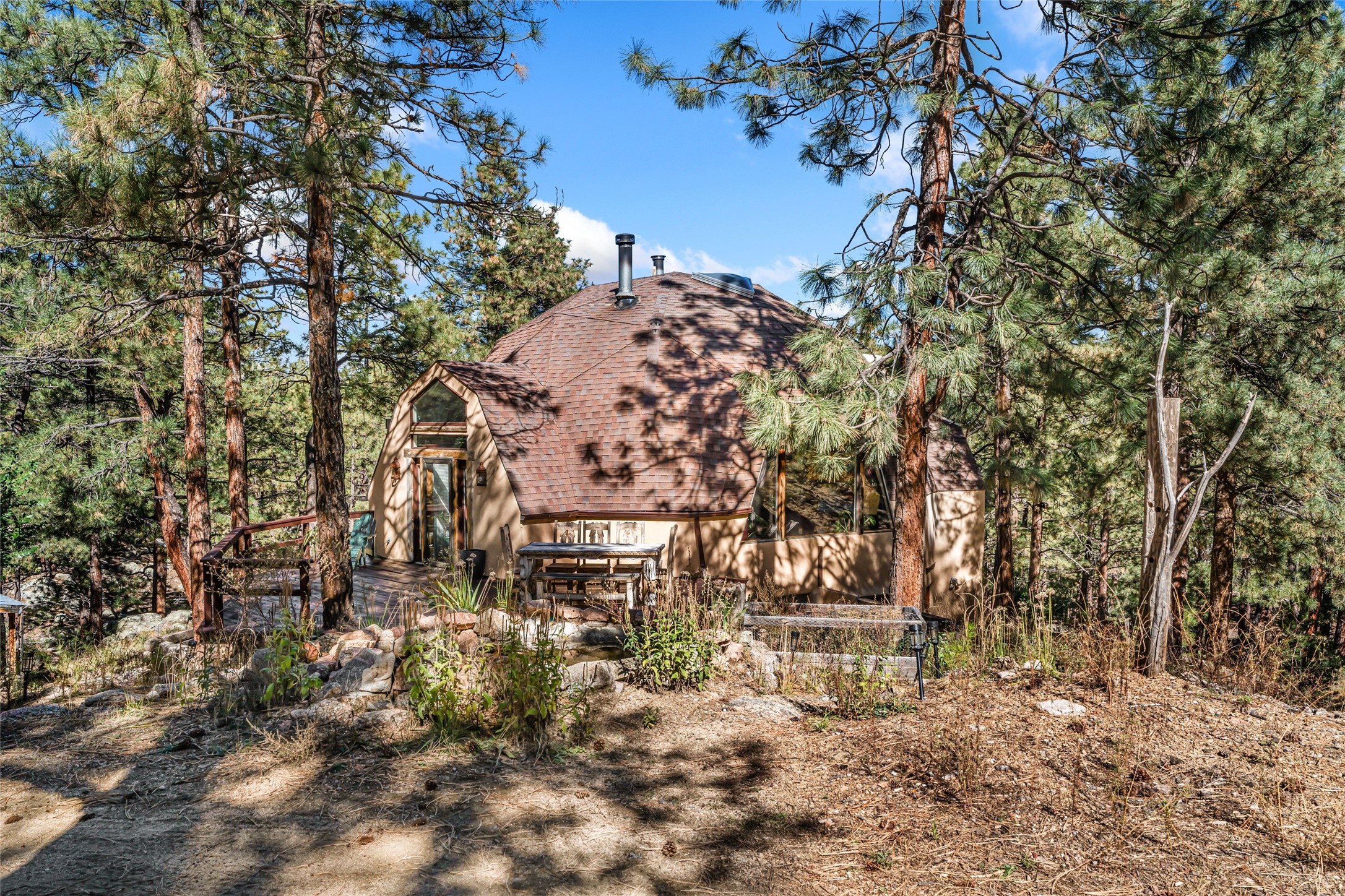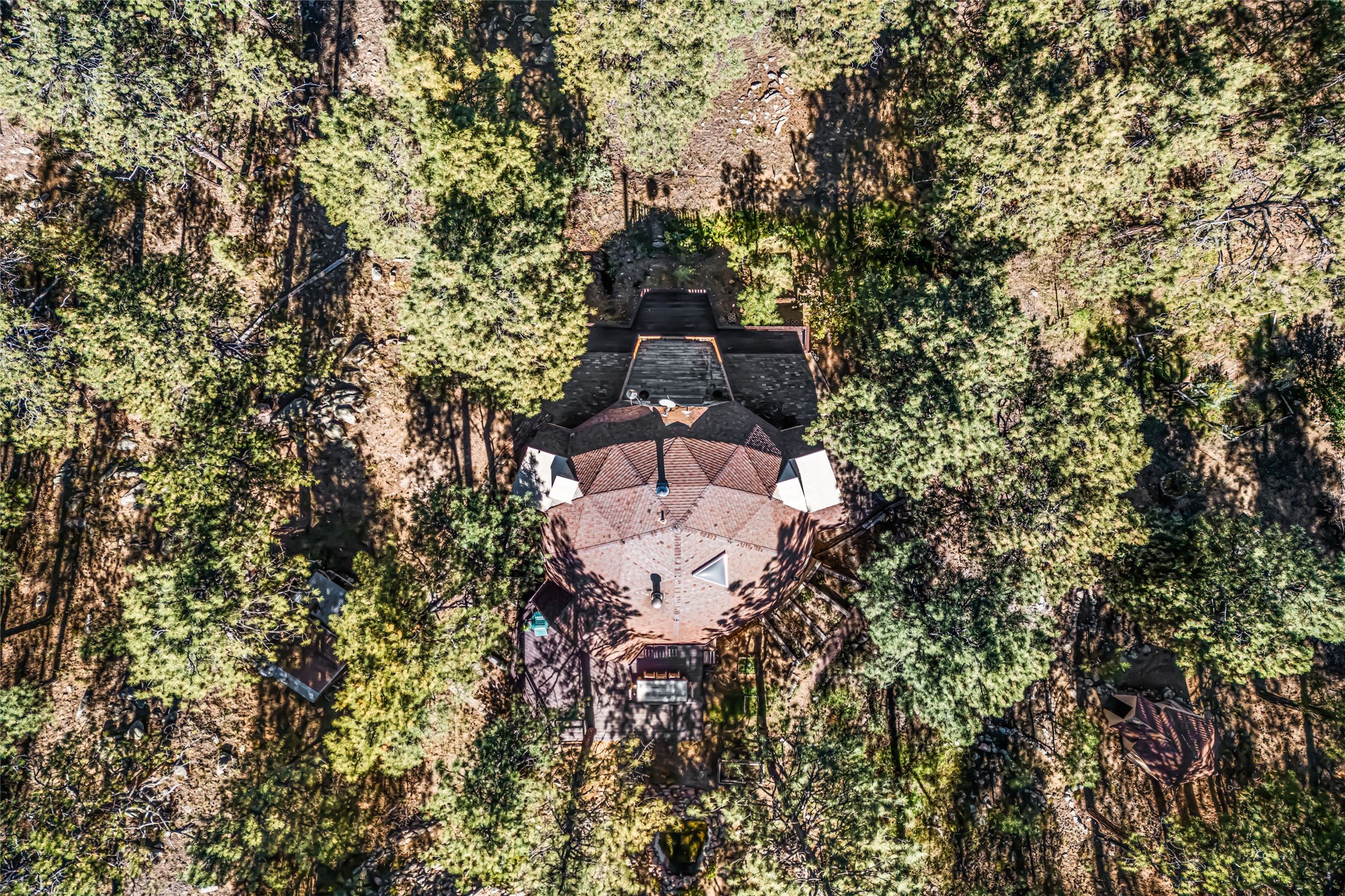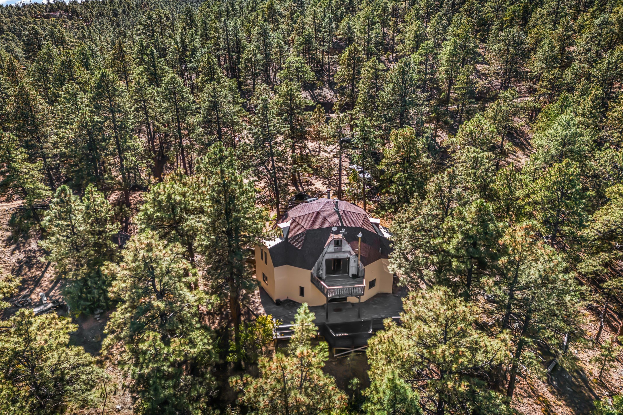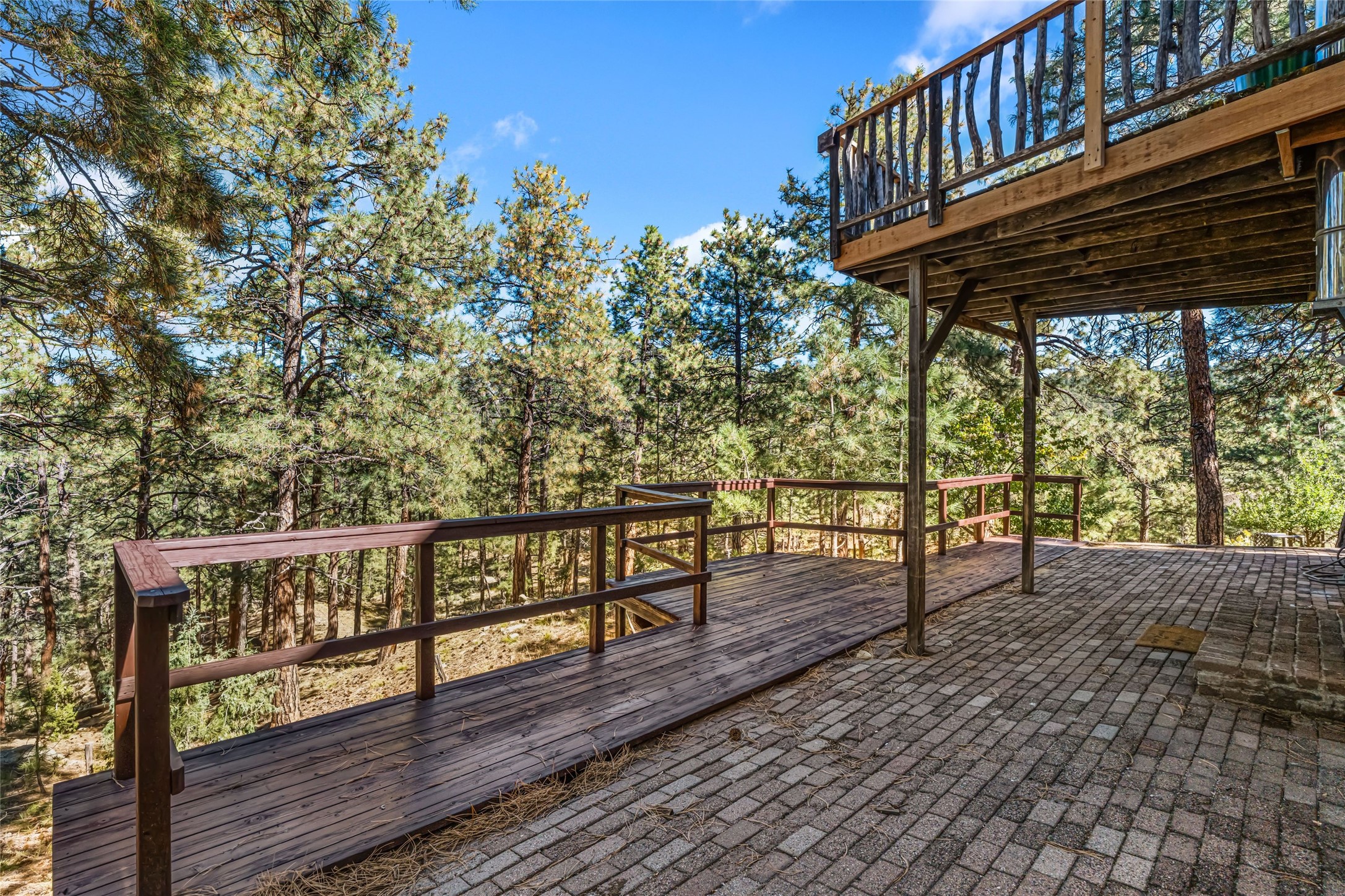 This mountain residence is located in a splendid setting on 2.7 forested acres in the tall pines off Old Santa Fe Trail. The three-level home offers a main house and guest house under the same roof and connected by a stairway internally, so it can be used as a single home or house and guest house. The main level consists of the living, kitchen, and dining rooms, primary bedroom, and bathroom. There are two enjoyable decks - a very large deck off the living room and another off the dining room. The upper level has two bedrooms, a sitting area, and bathroom. The lower lever is the two-bedroom, two-bath guest house with an open-concept living/kitchen/dining area, and which also has another wonderful large deck. The outdoor living is delightful! The topography is gentle, affording a great deal of usable land. Experience a beautiful mountain lifestyle only minutes from the Plaza.