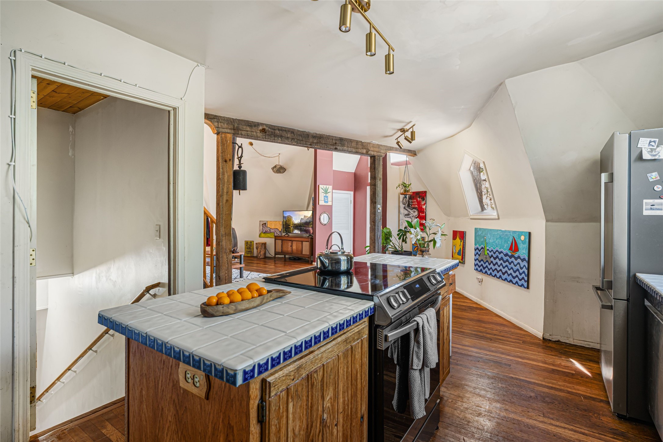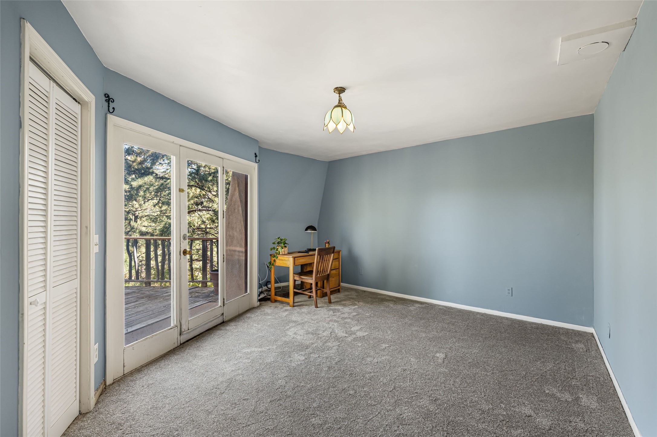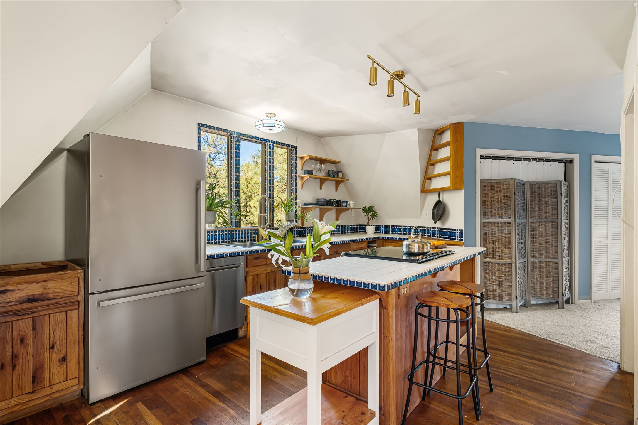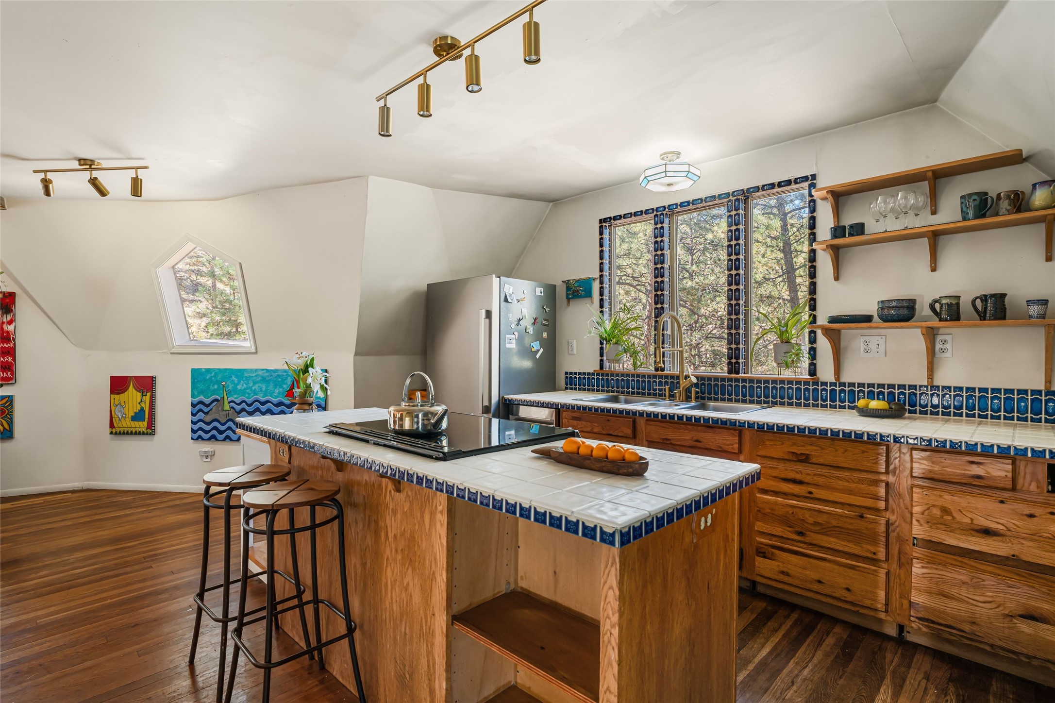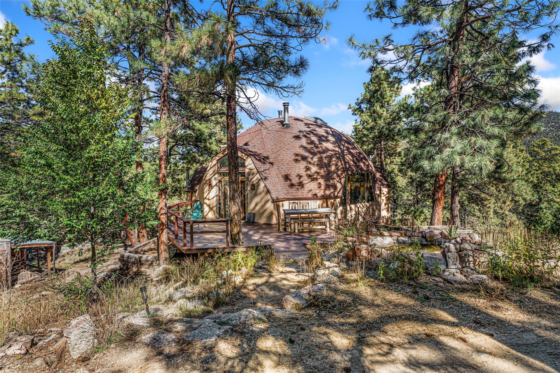 This mountain residence is located in a splendid setting on 2.7 forested acres in the tall pines off Old Santa Fe Trail. The three-level home offers a main house and guest house under the same roof and connected by a stairway internally, so it can be used as a single home or house and guest house. The main level consists of the living, kitchen, and dining rooms, primary bedroom, and bathroom. There are two enjoyable decks - a very large deck off the living room and another off the dining room. The upper level has two bedrooms, a sitting area, and bathroom. The lower lever is the two-bedroom, two-bath guest house with an open-concept living/kitchen/dining area, and which also has another wonderful large deck. The outdoor living is delightful! The topography is gentle, affording a great deal of usable land. Experience a beautiful mountain lifestyle only minutes from the Plaza.