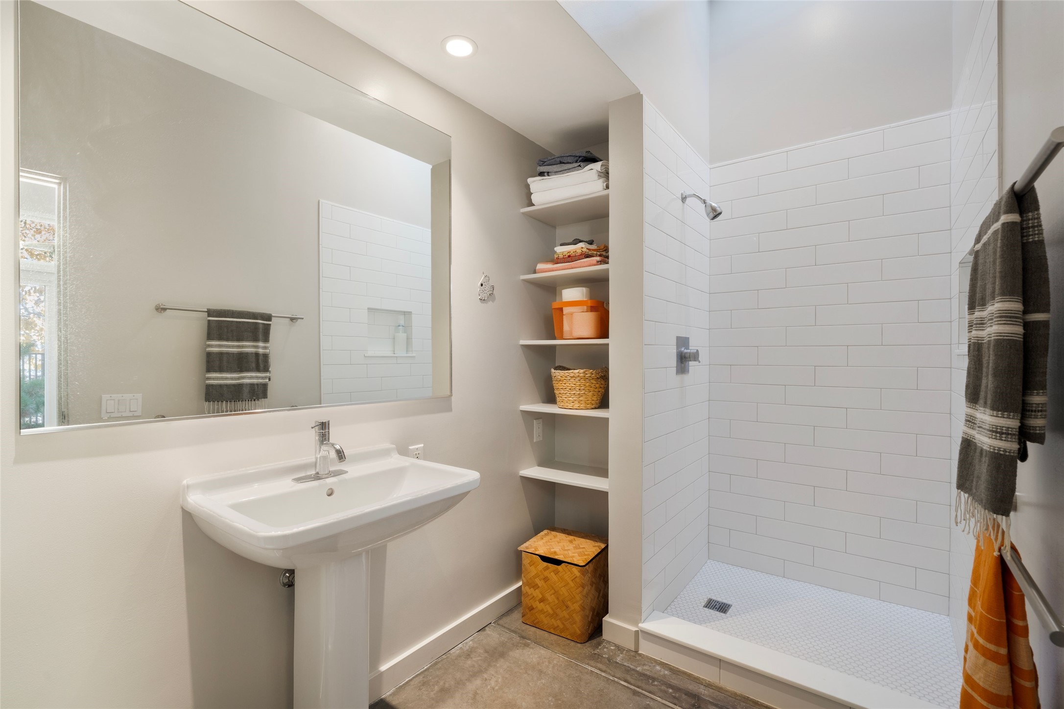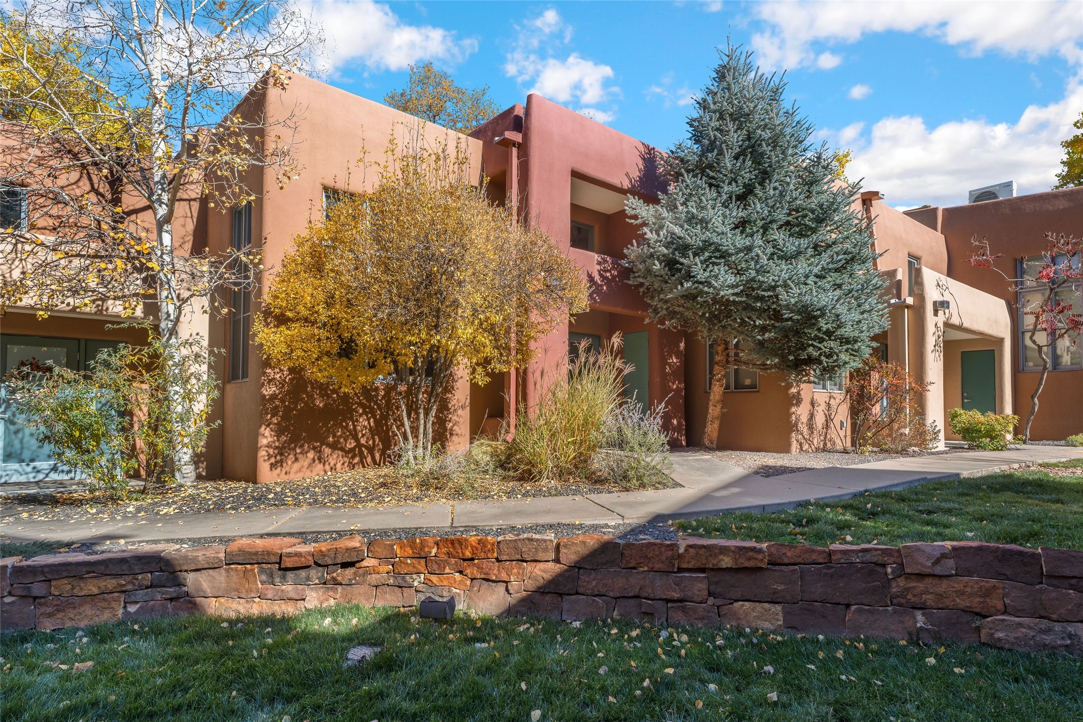 Set within the tranquil, landscaped interior of the Marquez Lofts complex, this bright, stylish condo--with no unit above it--has a desirable ground-floor entrance and rare, private back courtyard. The kitchen is creatively divided into two areas. Sink and storage are tucked tidily into a Butler's Pantry wing while a refrigerator and induction stove run along the wall behind the gorgeous, live edge, cherry and sapele wood dining counter by Boxcar Woody. A gentle flight of steps, with under-stair storage, leads to the sleeping loft. Downstairs, the spacious main bedroom has an ensuite, bath. Two double doors access the walled courtyard, perfect for pets or as an intimate retreat. Alternatively, with its back gate entry, this space could serve clients, leaving the main section for personal use. Graced with character, convenience and contemporary charm, this live-work dwelling favors the needs of creatives, entrepreneurs, and anyone seeking a residential refuge in a prime location by the Railyard, restaurants and shopping.
