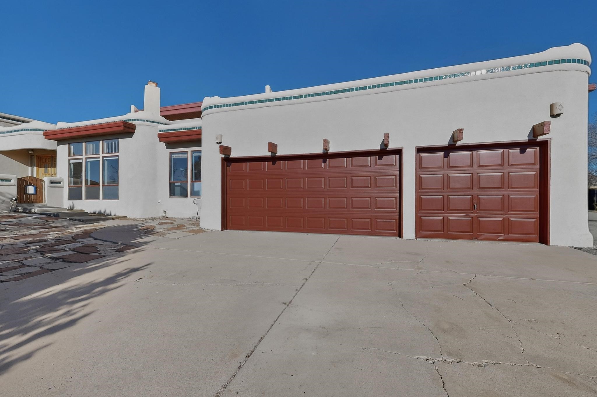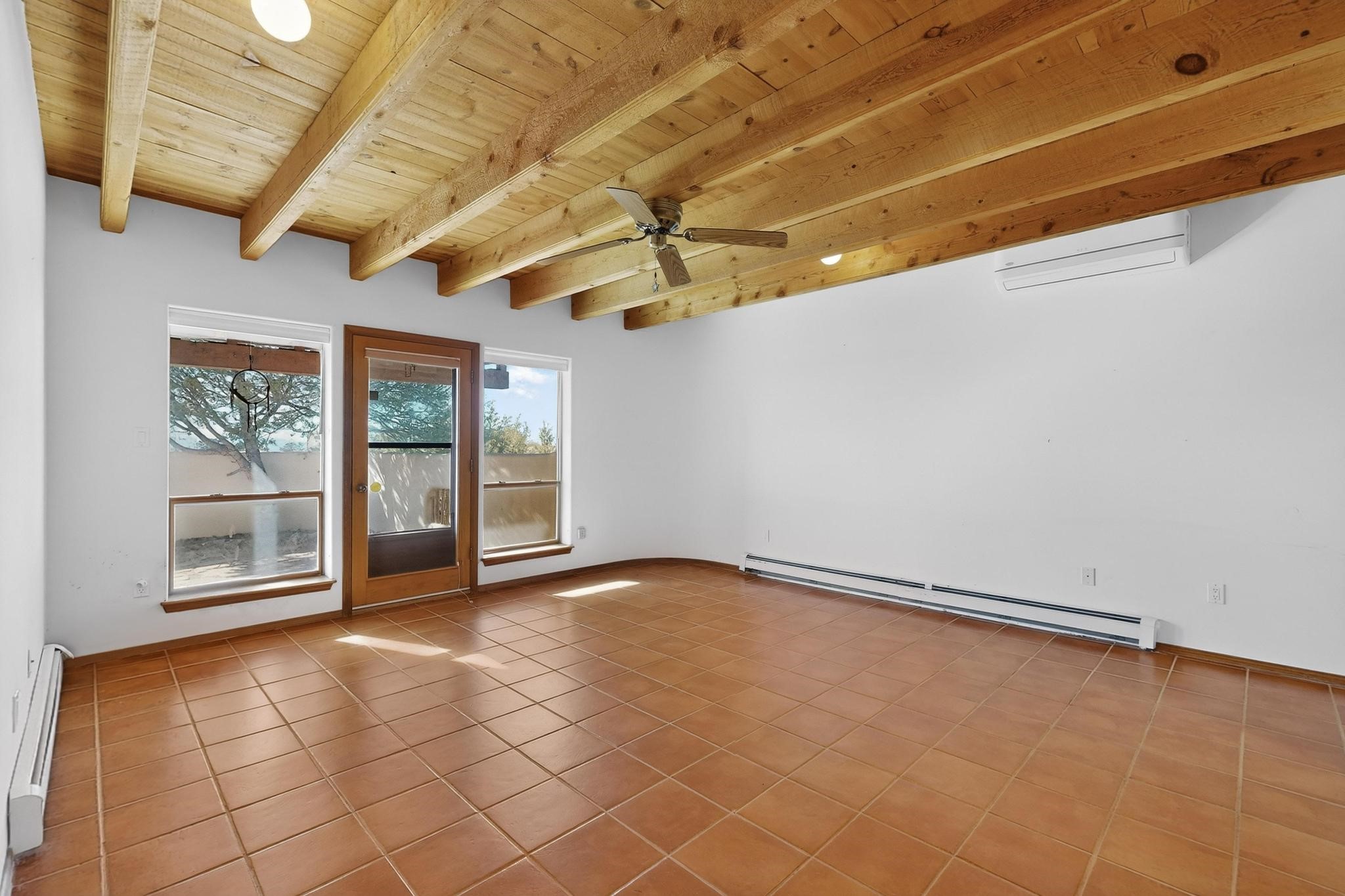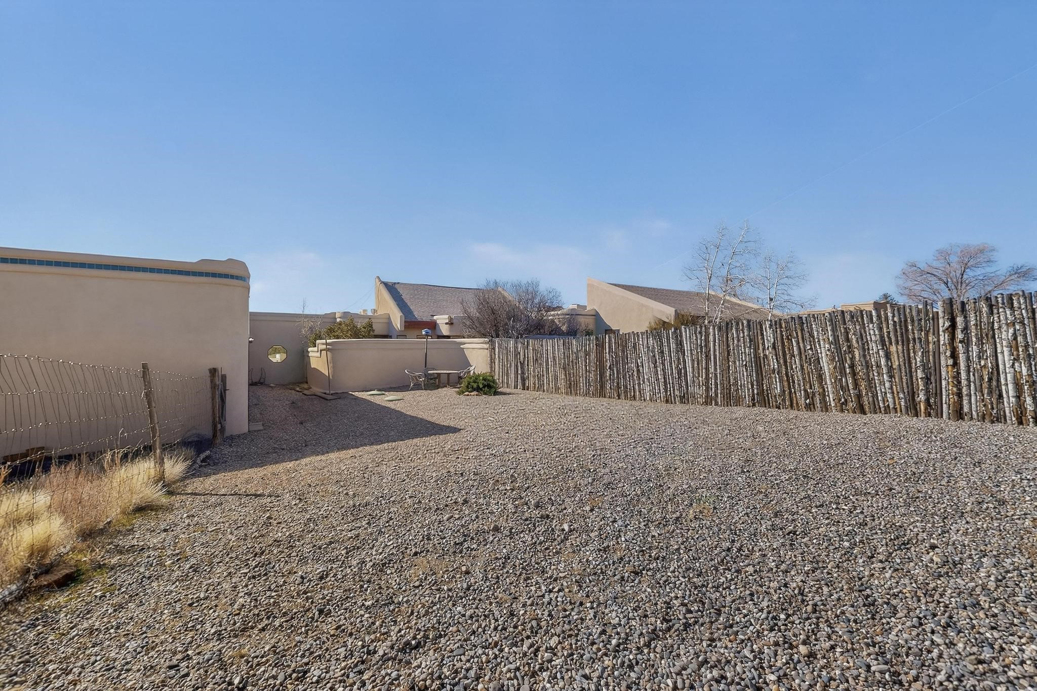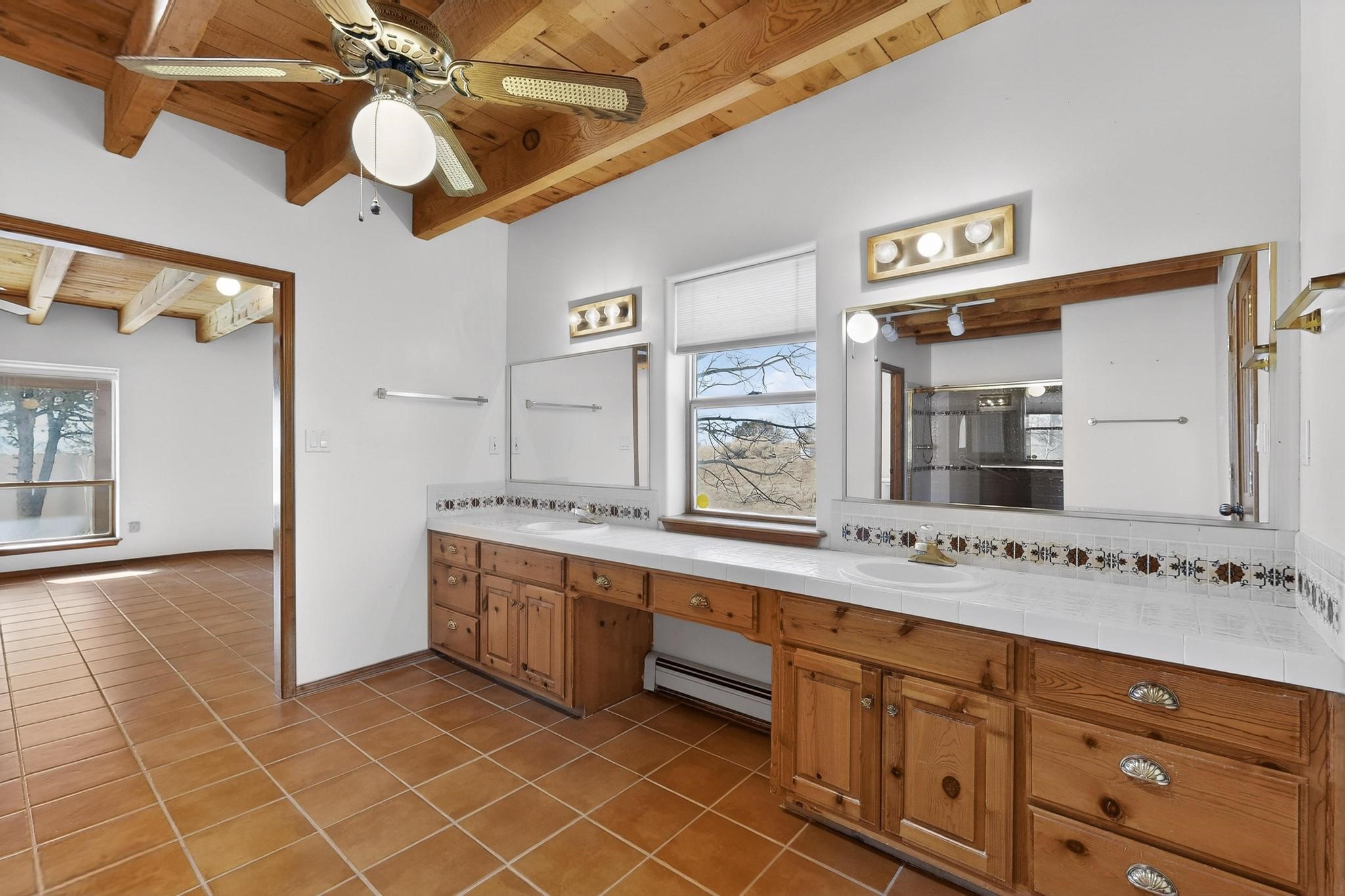 Remarkable opportunity to obtain a 3963sf multi generational 4 bedroom home in Eldorado. Born with a passive solar design and high ceilings with deep southern glazing this home is full of sunlight. Saltillo tile floors, beam and viga ceilings, high clerestories, nichos and 2 kiva fireplaces this contemporary pueblo home is amazing. A spacious country style kitchen with large breakfast bar and breakfast nook will accommodate plenty of family entertainment. There is an adjoining family room, sunken living room and a formal dining room/den off the kitchen. the owners suite features a spacious bathroom and walk in closet, plus there are 3 guest bedrooms with a 3/4 and full bath. The laundry includes a tub and plenty of extra storage. On going through the 3 bay garage you can enter the studio/guest wing which includes a 2 large rooms, bath and a separate 4th garage. A walled private flagstoned courtyard and portal in front and to the rear offer plenty of outside enjoyment. The paved driveway also includes plenty of guest parking. This home is within easy reach of the Eldorado Community Center amenities, local shopping, school, library and senior center, and only minutes into Santa Fe.