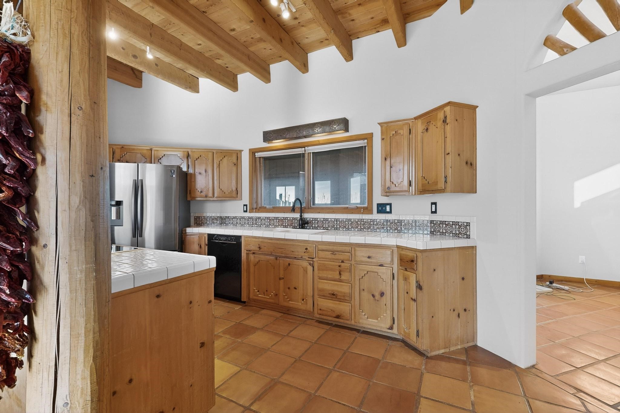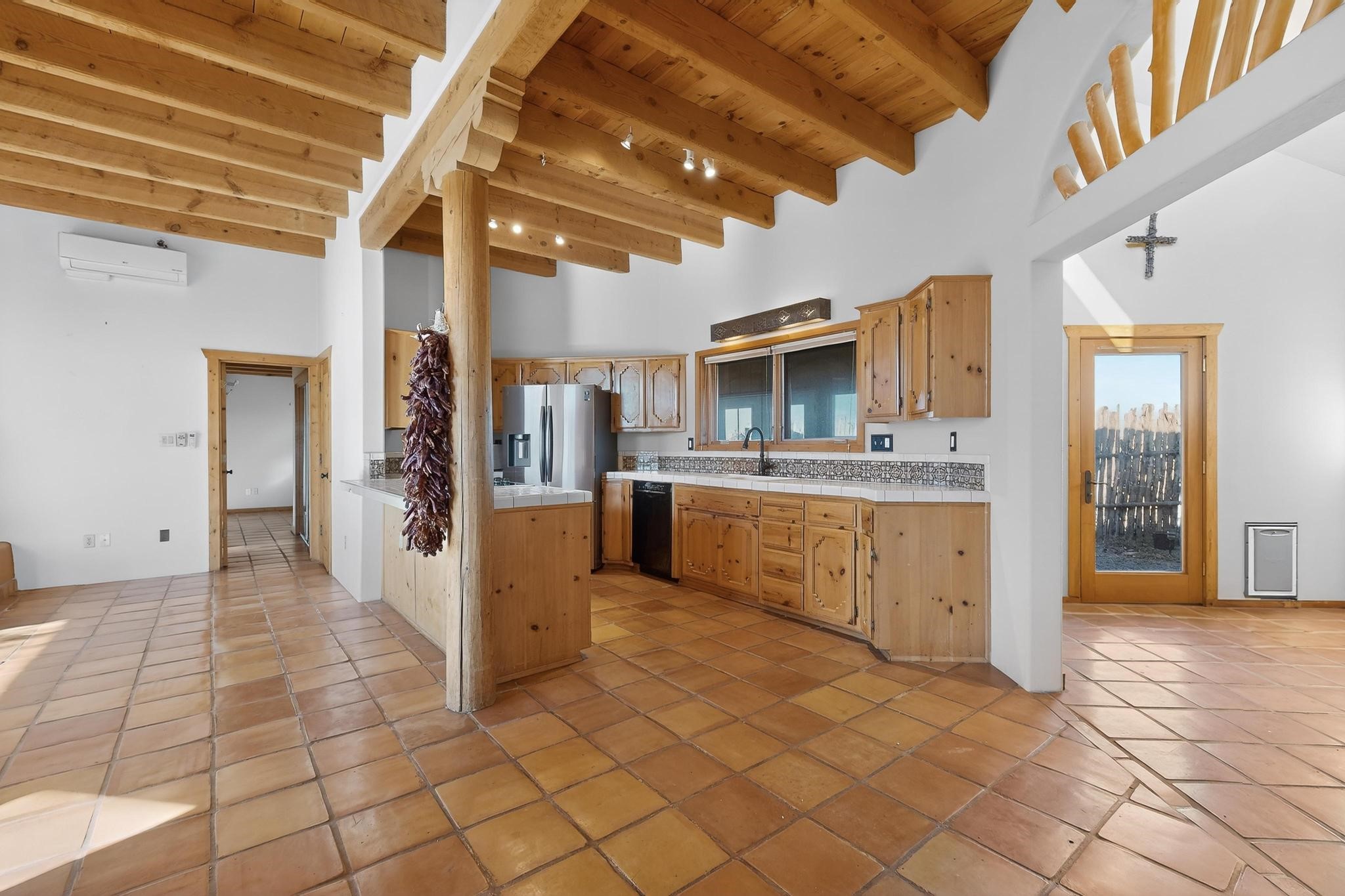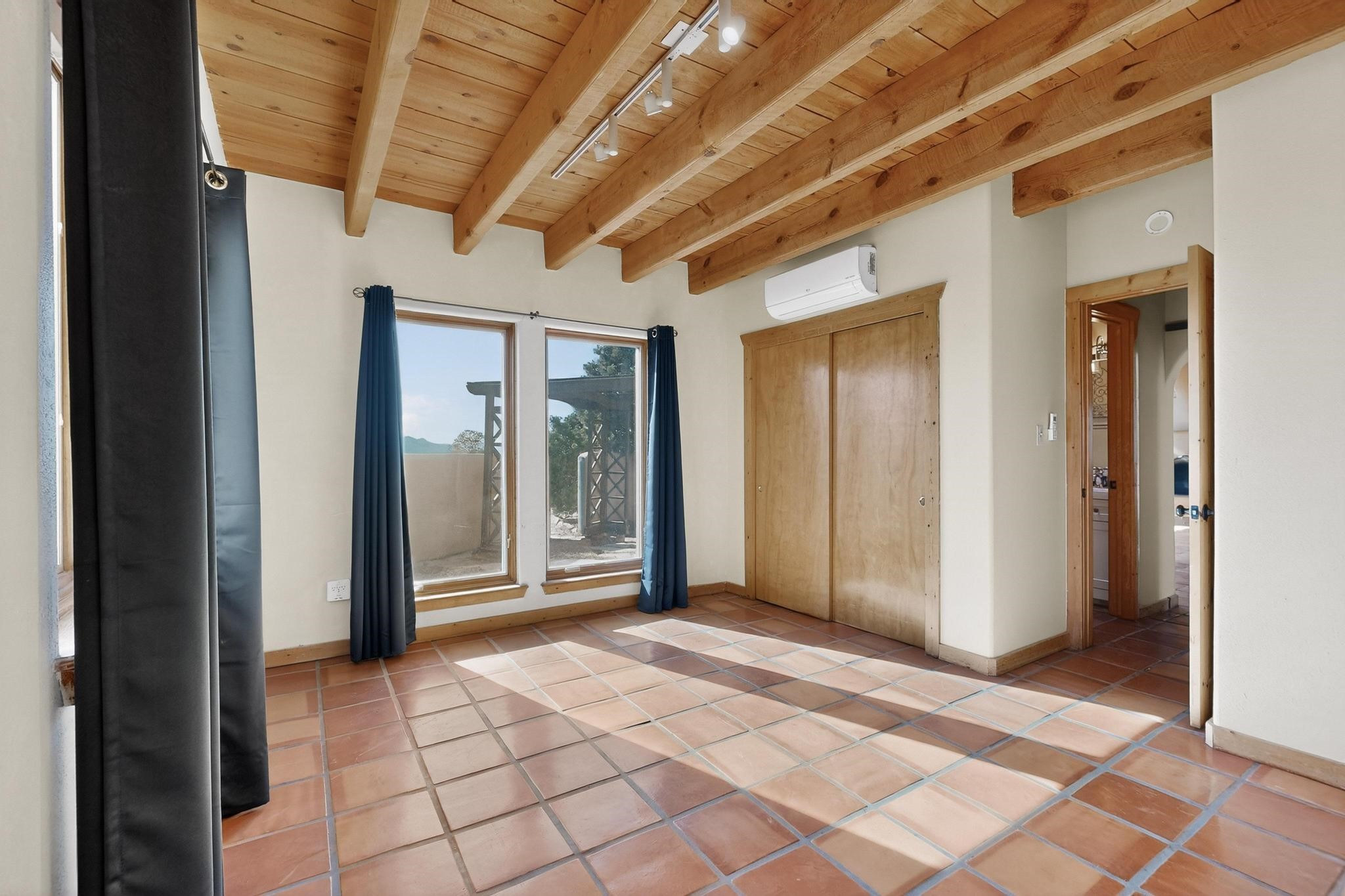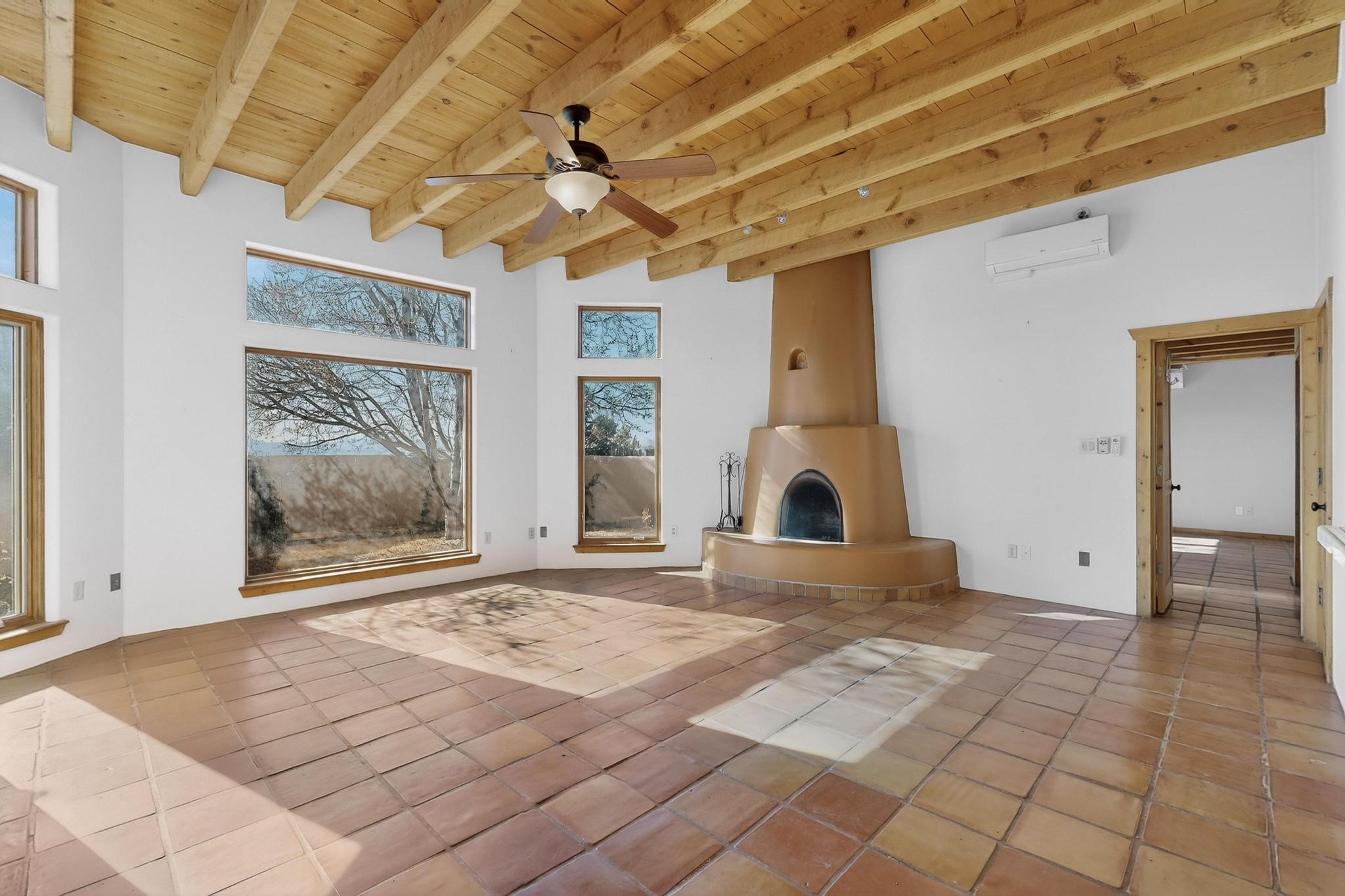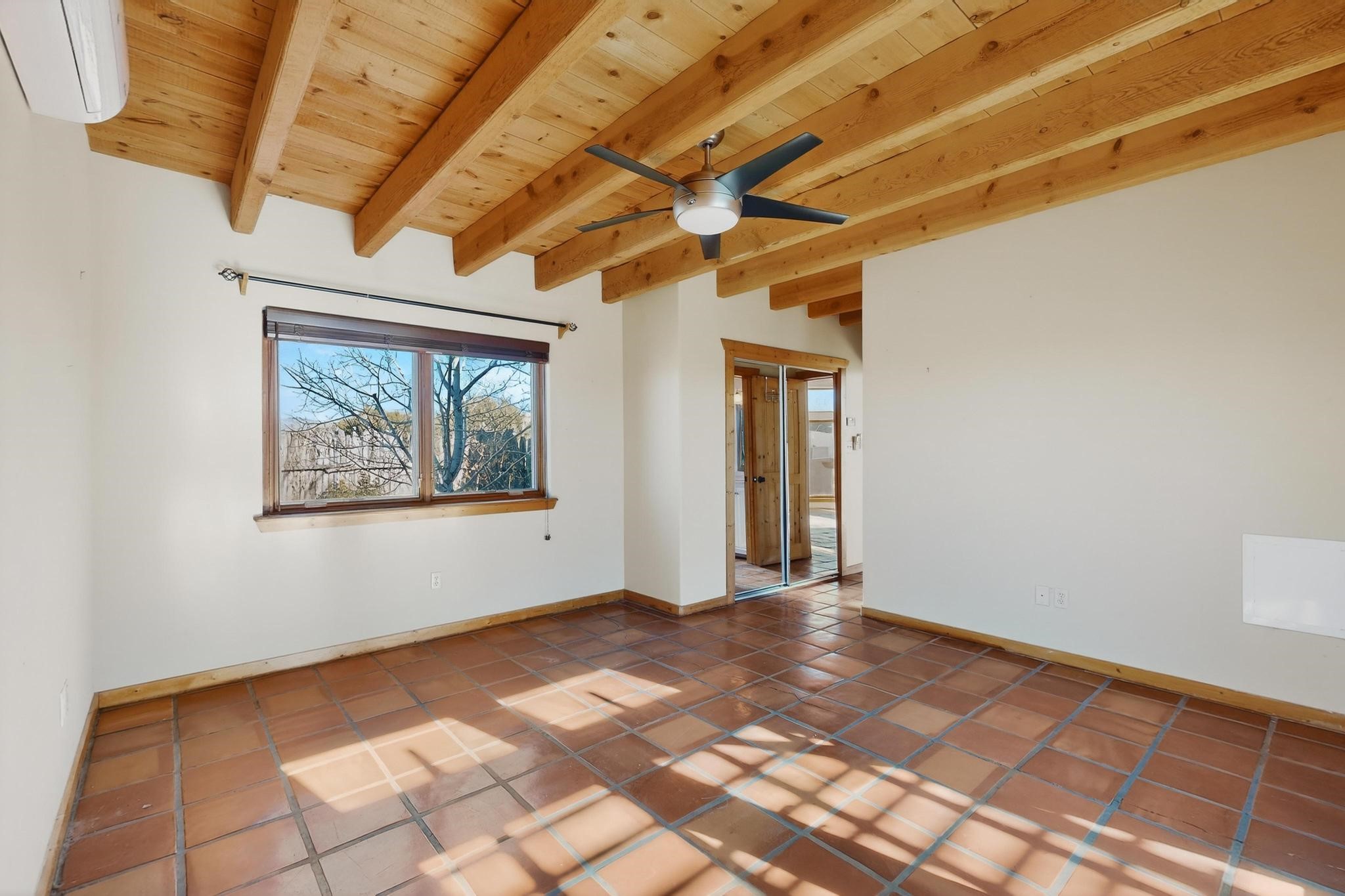 Open plan, split bedroom passive solar Eldorado cottage custom built by Santa Fe Solar homes. Beam ceilings, gleaming saltillo tile floors, a traditional kiva fireplace creates the Santa Fe ambience and warmth of character. Filled with sunlight this single level home has no steps to negotiate and flows easily from great room to kitchen/dining areas. The polybutylene radiant heating system is supplemented by mini splits which add a layer of comfortable air conditioning for summer cool. The main bedroom flows to a deck with hot tub and the guest bedroom is separated by the living areas for ultimate privacy. There is a separate study/ den with a vaulted ceiling which flows to a privately fenced rear yard and a summer enclosed atrium. There is 2 car garage plus plenty of guest parking. This home is located on the west side of Eldorado close to paved road and has access to all Eldorado amenities, close to local shopping centers and is within easy reach to Santa Fe.