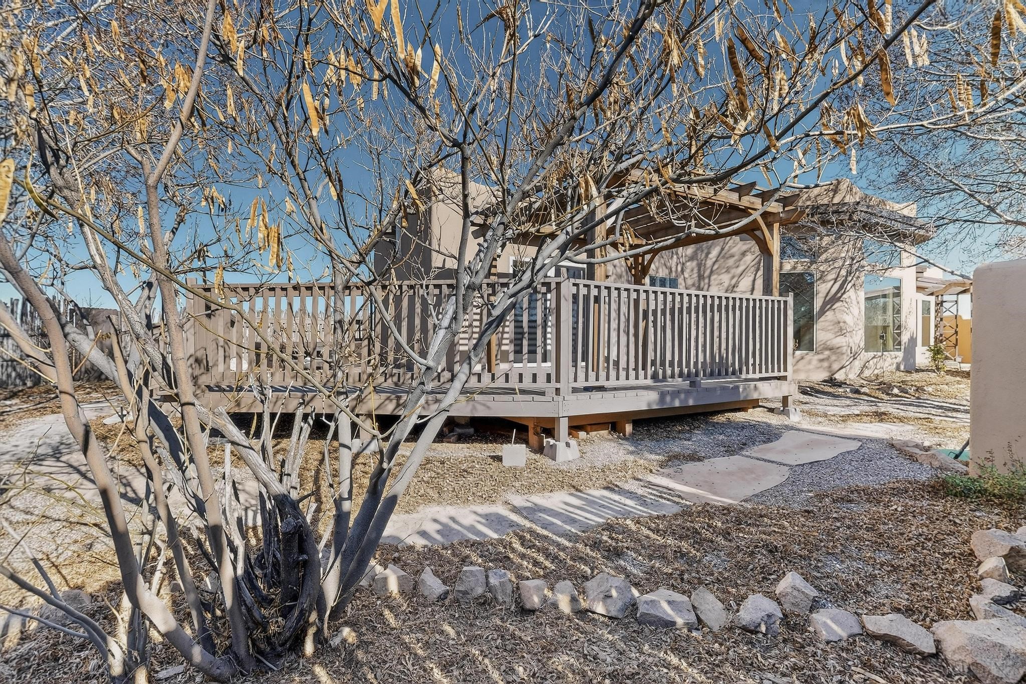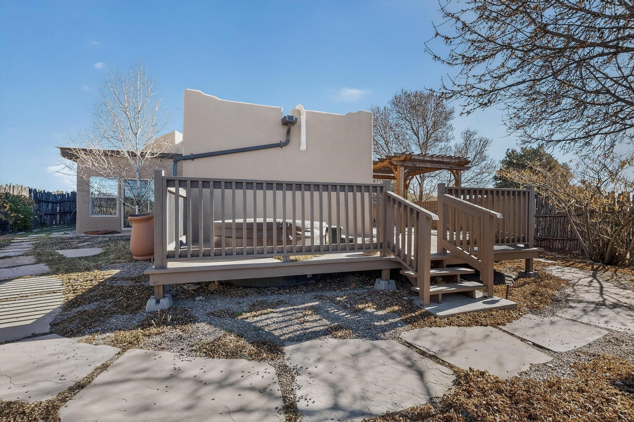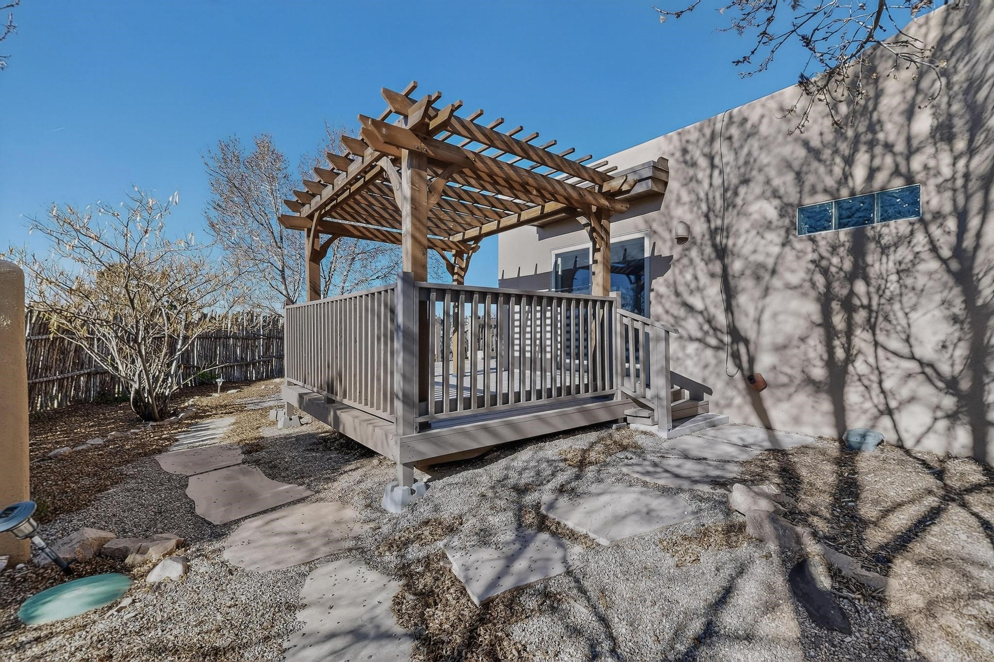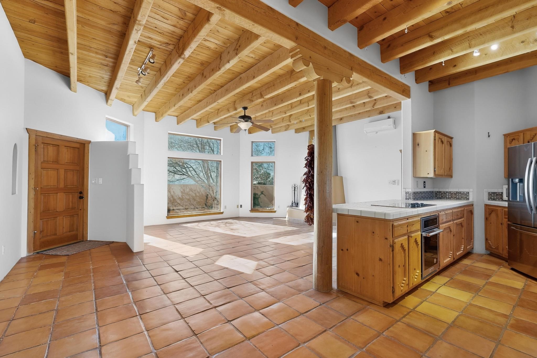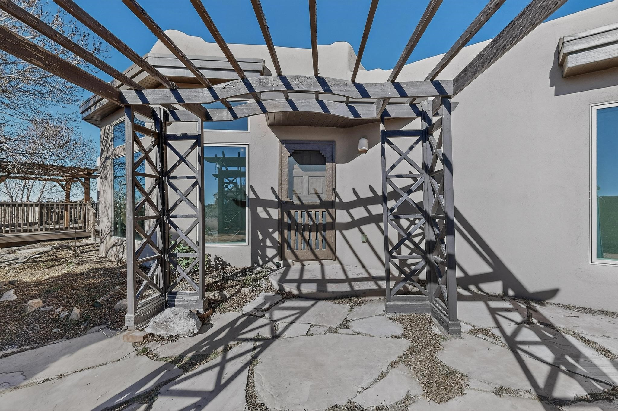 Open plan, split bedroom passive solar Eldorado cottage custom built by Santa Fe Solar homes. Beam ceilings, gleaming saltillo tile floors, a traditional kiva fireplace creates the Santa Fe ambience and warmth of character. Filled with sunlight this single level home has no steps to negotiate and flows easily from great room to kitchen/dining areas. The polybutylene radiant heating system is supplemented by mini splits which add a layer of comfortable air conditioning for summer cool. The main bedroom flows to a deck with hot tub and the guest bedroom is separated by the living areas for ultimate privacy. There is a separate study/ den with a vaulted ceiling which flows to a privately fenced rear yard and a summer enclosed atrium. There is 2 car garage plus plenty of guest parking. This home is located on the west side of Eldorado close to paved road and has access to all Eldorado amenities, close to local shopping centers and is within easy reach to Santa Fe.