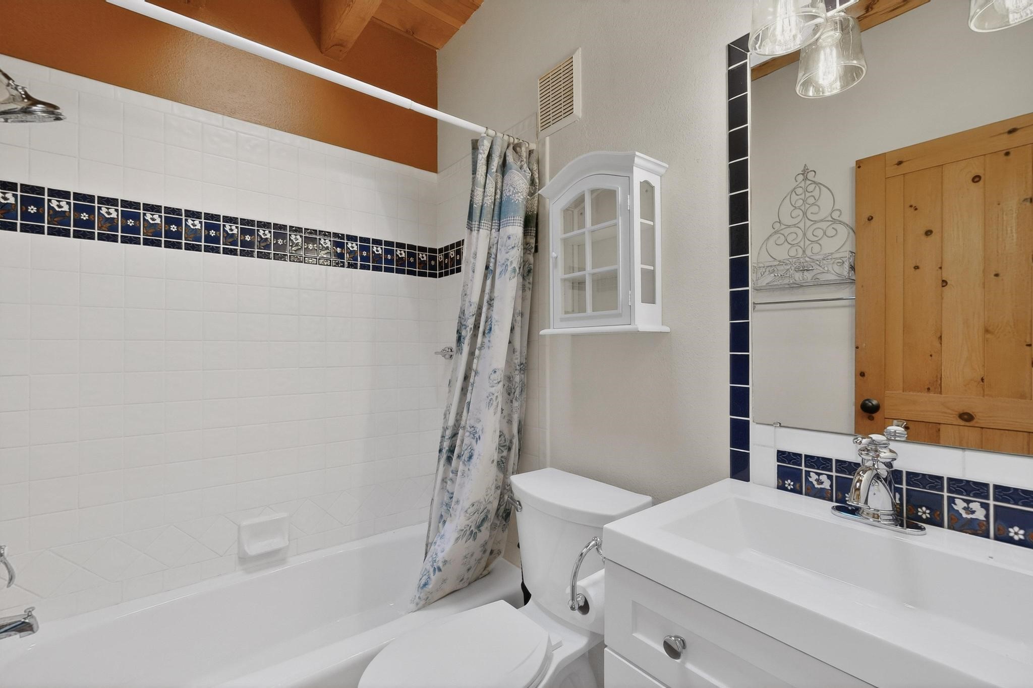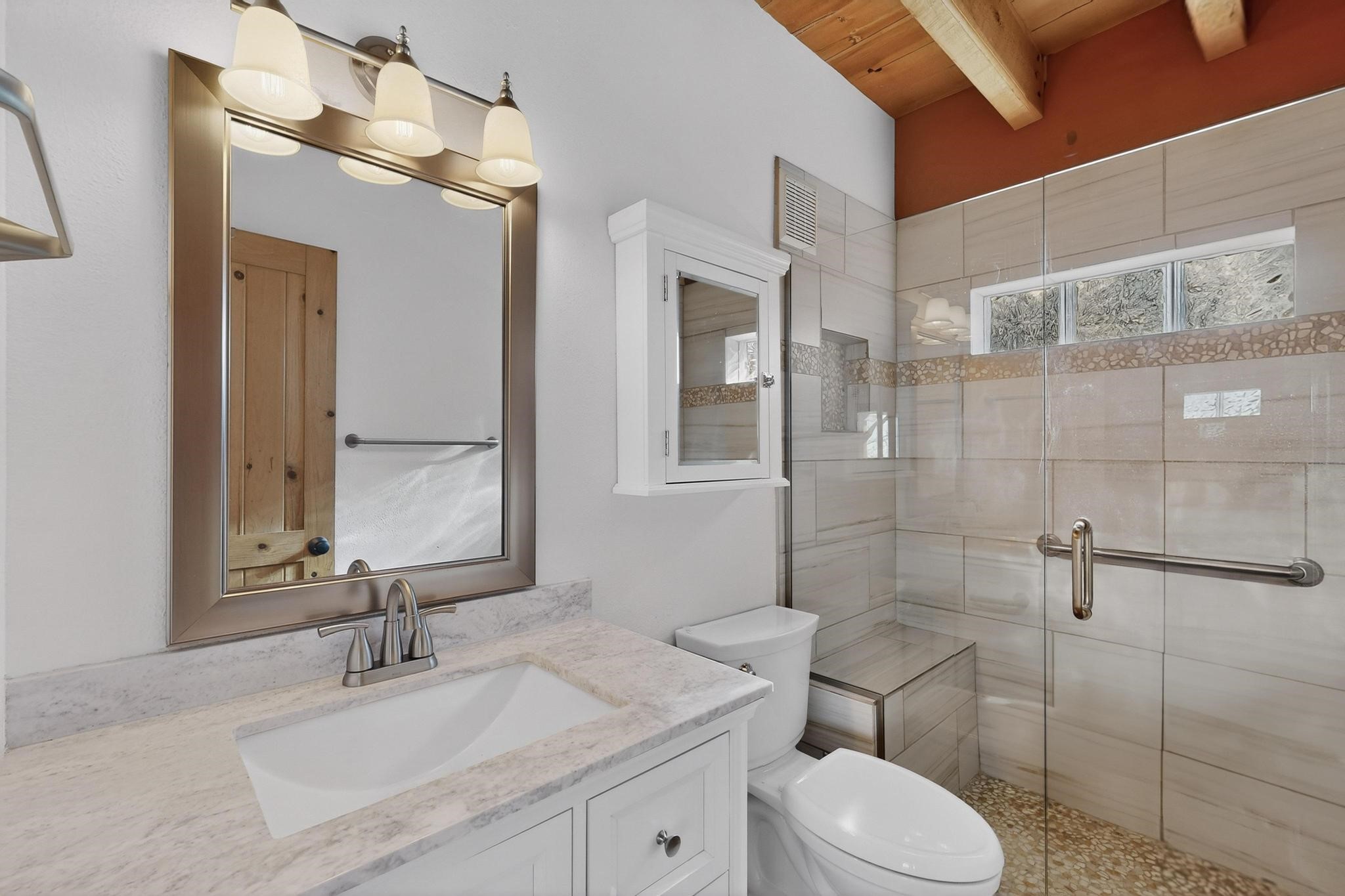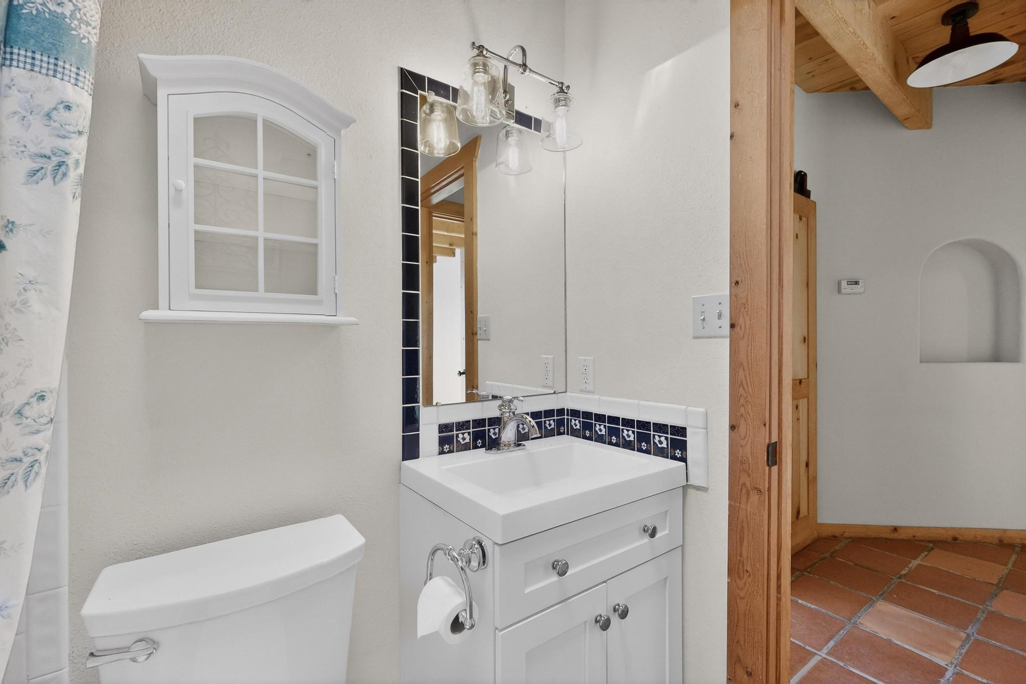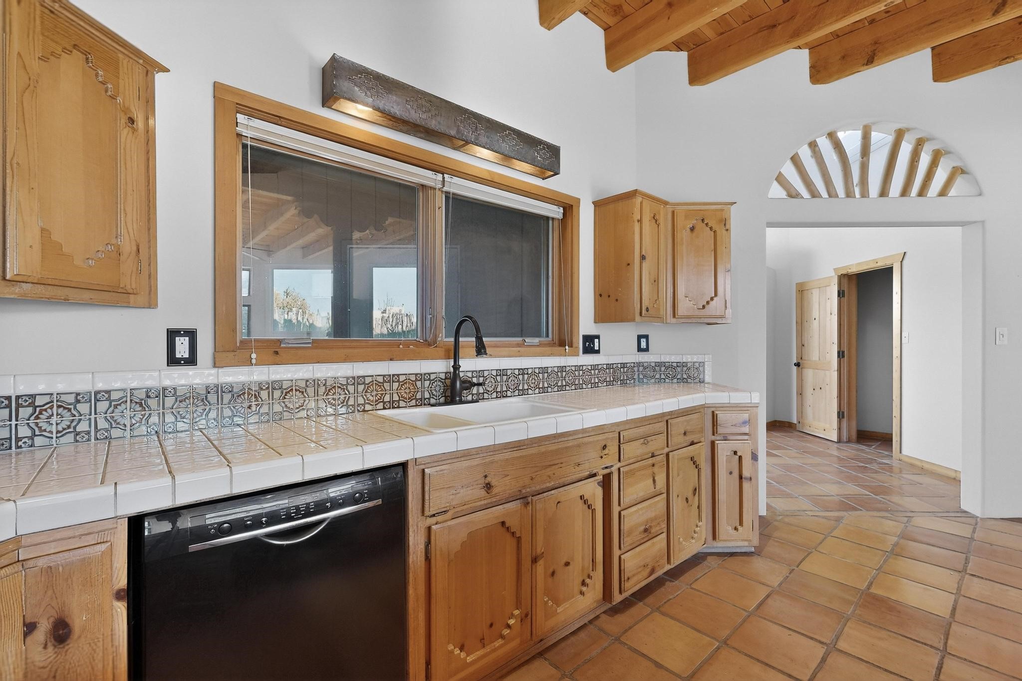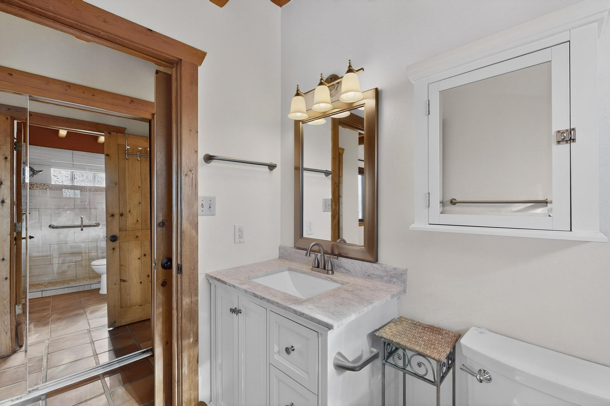 Open plan, split bedroom passive solar Eldorado cottage custom built by Santa Fe Solar homes. Beam ceilings, gleaming saltillo tile floors, a traditional kiva fireplace creates the Santa Fe ambience and warmth of character. Filled with sunlight this single level home has no steps to negotiate and flows easily from great room to kitchen/dining areas. The polybutylene radiant heating system is supplemented by mini splits which add a layer of comfortable air conditioning for summer cool. The main bedroom flows to a deck with hot tub and the guest bedroom is separated by the living areas for ultimate privacy. There is a separate study/ den with a vaulted ceiling which flows to a privately fenced rear yard and a summer enclosed atrium. There is 2 car garage plus plenty of guest parking. This home is located on the west side of Eldorado close to paved road and has access to all Eldorado amenities, close to local shopping centers and is within easy reach to Santa Fe.