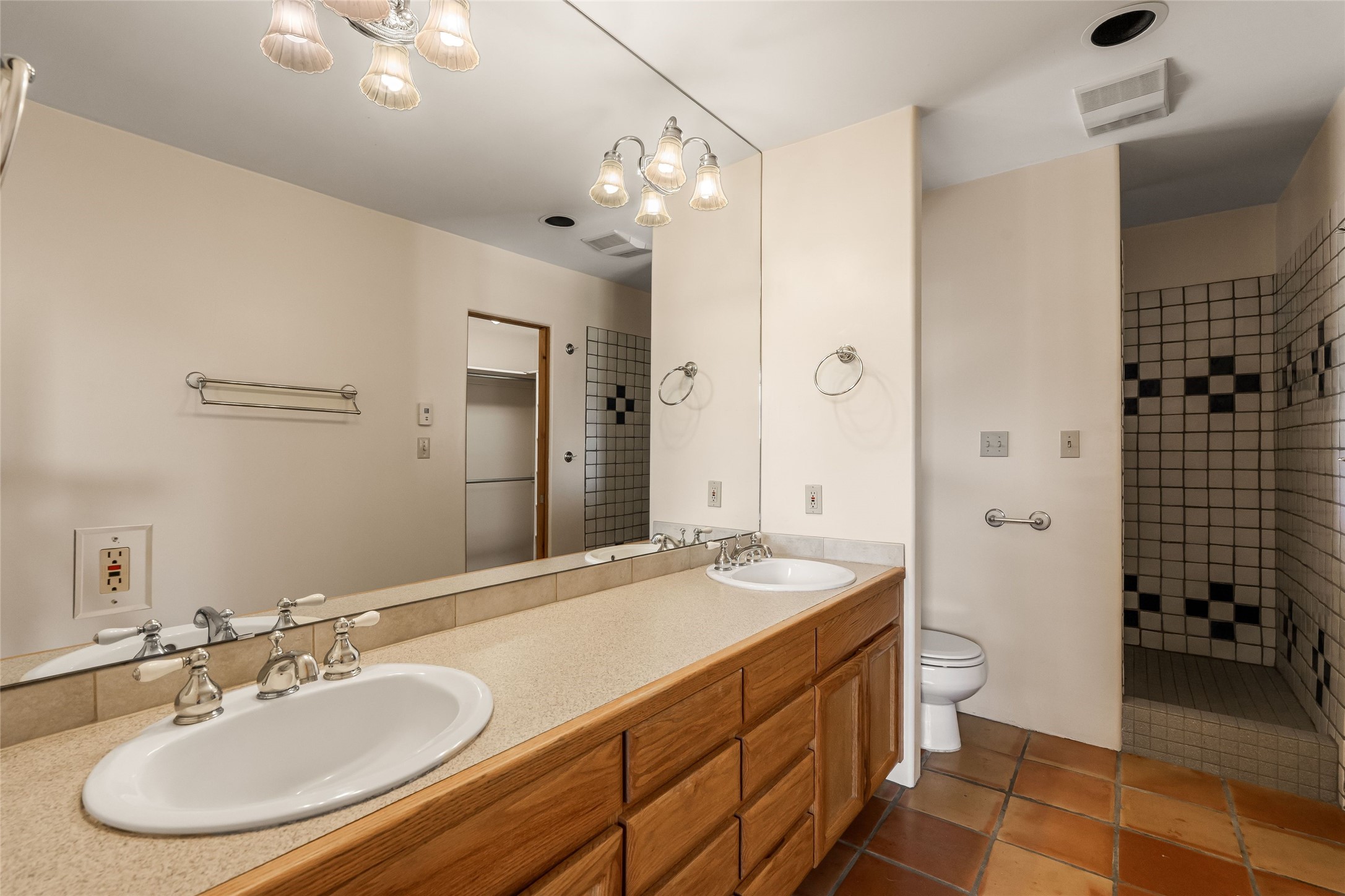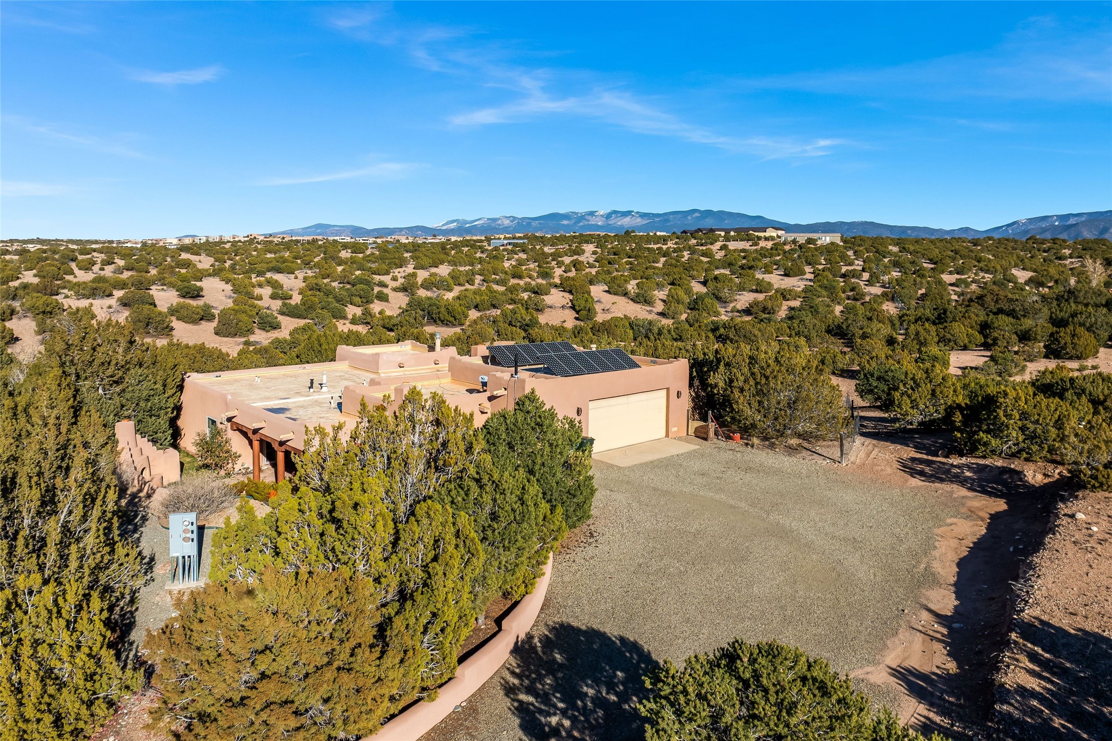 Sited within the serene landscapes of Santa Fe, this 3-bedroom 3 bath home offers a blend of comfort, style, and sustainability. This 2.5-acre property, surrounded by the natural beauty of Tres Arroyos, is within easy access to the vibrant energy of Santa Fe Plaza, allowing you to enjoy both tranquility and the lively culture of the city. The open living and dining area features exquisite Saltillo tile floors, wood beams, and a cozy wood-burning fireplace, creating a warm and inviting atmosphere. The kitchen is equipped with a center island and breakfast bar, double sink, and ample storage space. Retreat to the primary bedroom, which features beautiful wood floors, a kiva fireplace, direct access to the back portal and ensuite bath. A standout feature of this property is the small, attached studio, complete with a propane gas fireplace. This space can serve as an art studio, or home office, providing flexibility to suit your needs. The exterior of the home features two outdoor fireplaces and a pizza oven--perfect for hosting gatherings under the stars. Embrace eco-friendly living with green features that include solar panels, an instant hot water heater, and a drip irrigation system. Two-car garage. Easy access to NM-599, Santa Fe Regional Airport, restaurants, shopping, and medical.