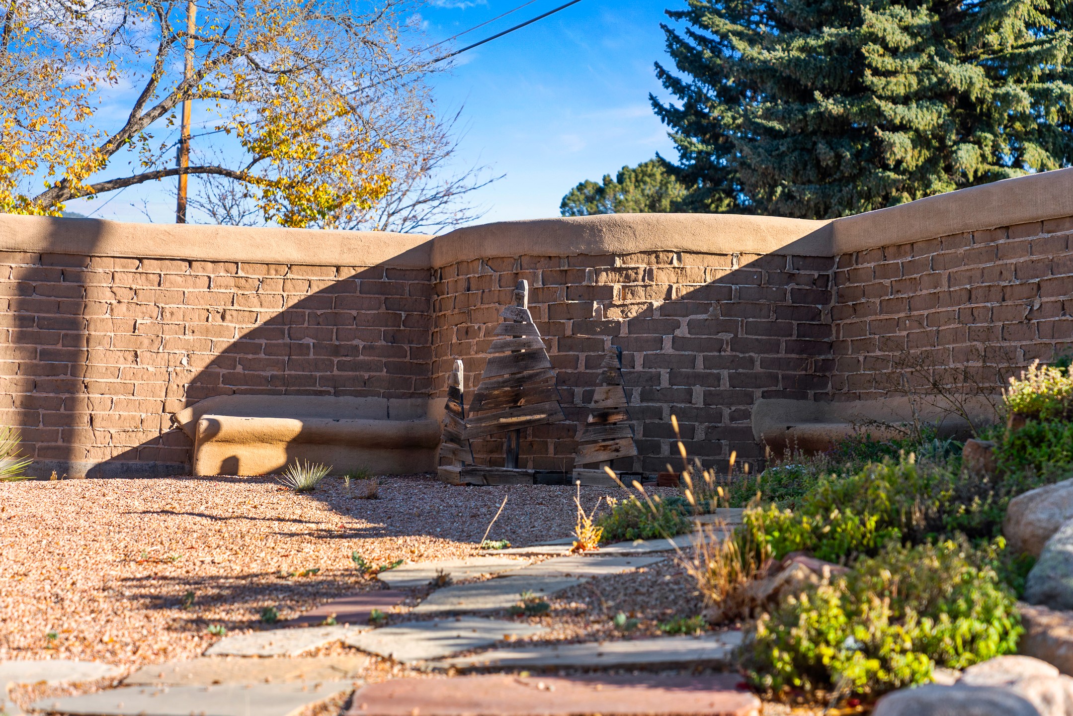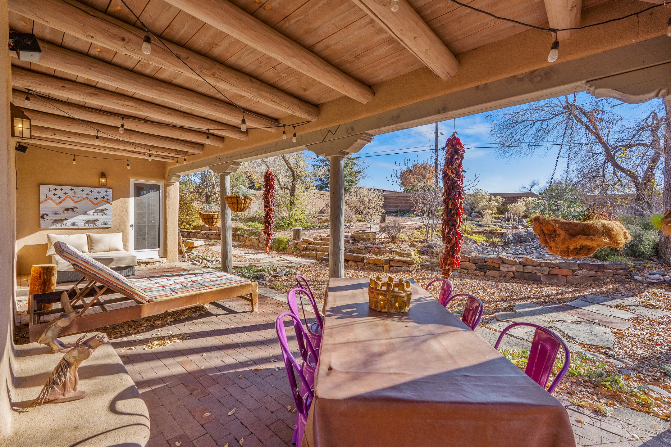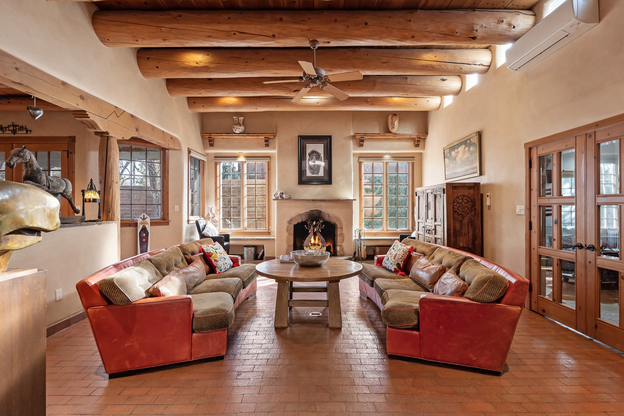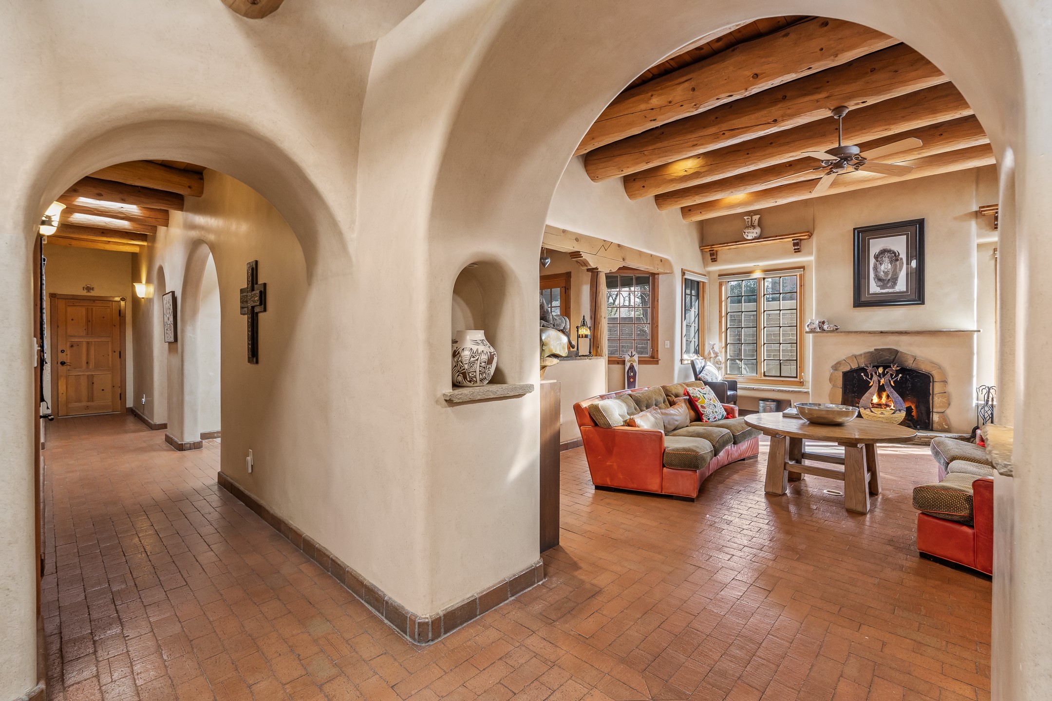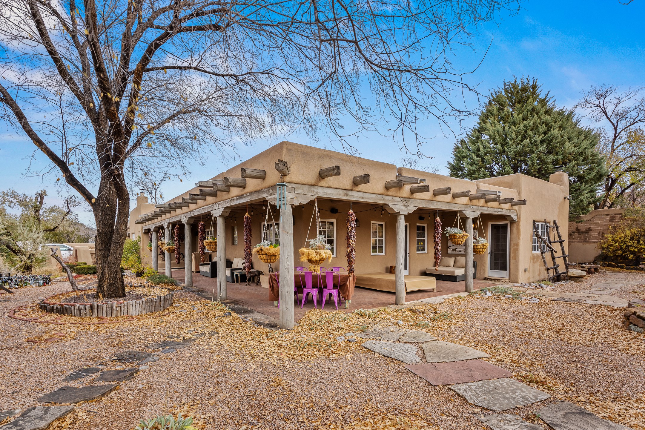 Nestled on a quiet cul-de-sac in Santa Fe's coveted South Capitol neighborhood, this beautifully crafted 3,600 sq. ft. single-level home offers 5 bedrooms, 3 bathrooms, and an attached studio/workshop. Sited on a rare 0.4-acre lot, the home provides generous space for entertaining while still maintaining an intimate, welcoming feel. Enclosed by a handsome adobe wall, the property offers both privacy and timeless Southwestern character--all just minutes from downtown and Wood Gormley Elementary.The home's central living space features a warm and inviting blend of Santa Fe style and spacious flow. Vigas, rough cut wood ceilings, and a commanding fireplace define the living room, while classically arched openings with corbels subtly distinguish the open kitchen, dining, and den areas--offering connectivity with architectural charm. A large den--just off the living room--provides additional living space, perfect for a media room or library/office space. A separate studio/workshop is another perfect space for an in-home office, gym or studio. The home's thoughtful floor plan includes two guest wings, with 2 bedrooms/1 bathroom in each guest area. The primary suite is privately situated in the SouthEast corner of the property with plenty of light and outdoor connectivity and features a wood-burning kiva fireplace, a spacious bathroom with a jetted soaking tub and walk-in shower. Outdoor spaces include a wraparound portal, a thoughtfully landscaped South yard area with a large kiva firepit and a North yard has a second outdoor fireplace, a built-in barbecue and portal that is perfect for outdoor dining. The home features an attached 2-car garage, in-floor radiant heat throughout and mini-splits for cooling. This special property combines scale, privacy, and Santa Fe charm in one of the city's most desirable neighborhoods--truly a rare find.