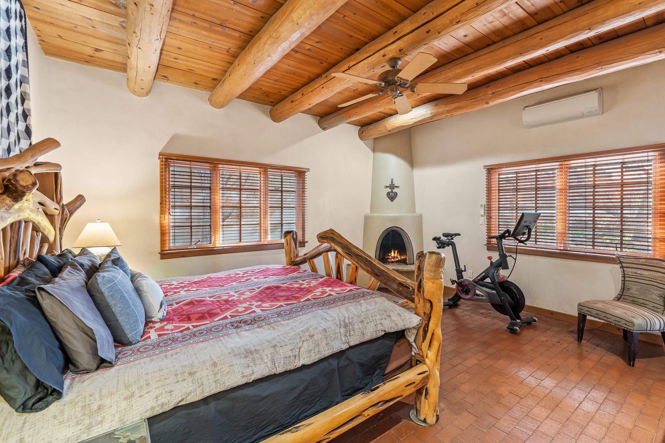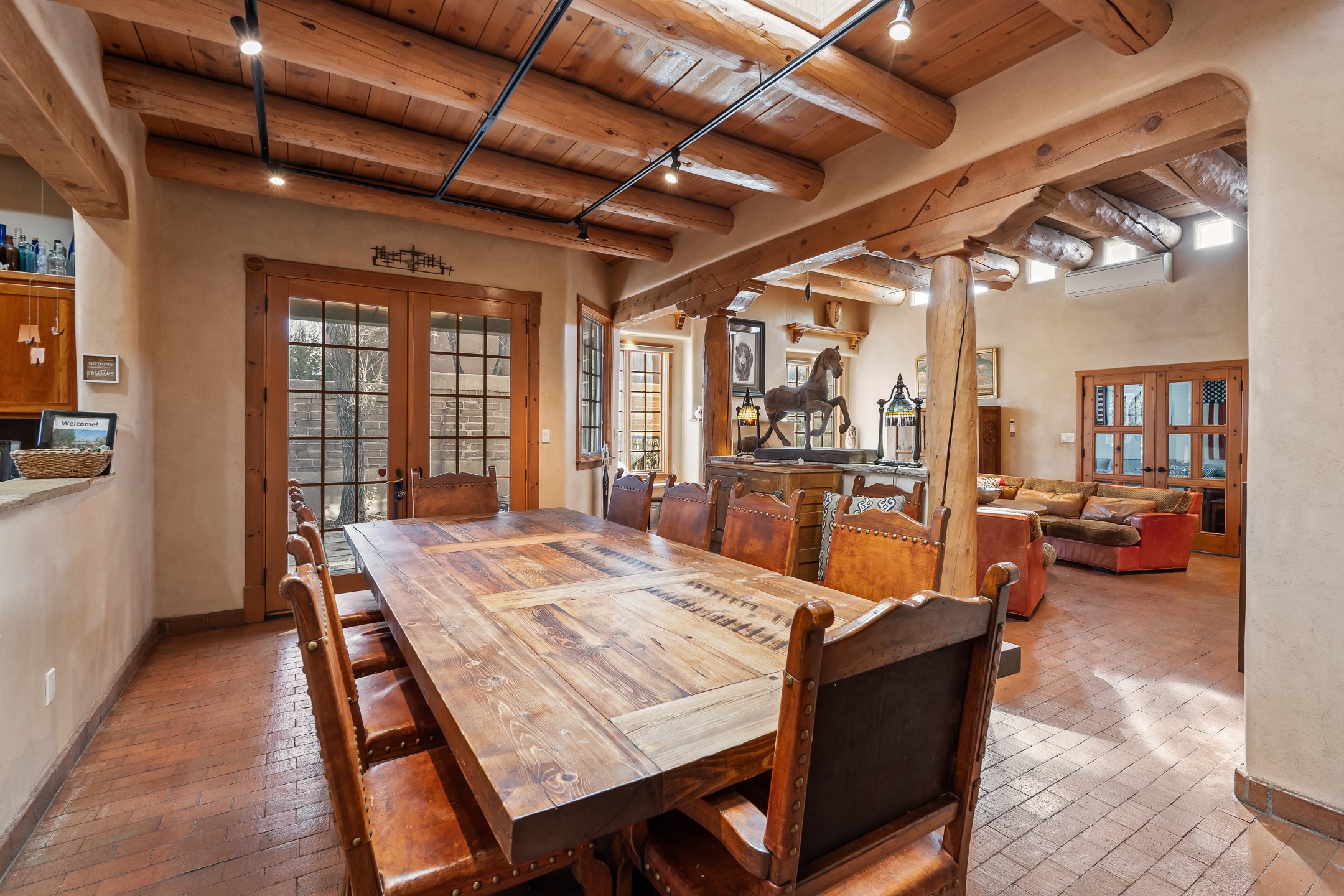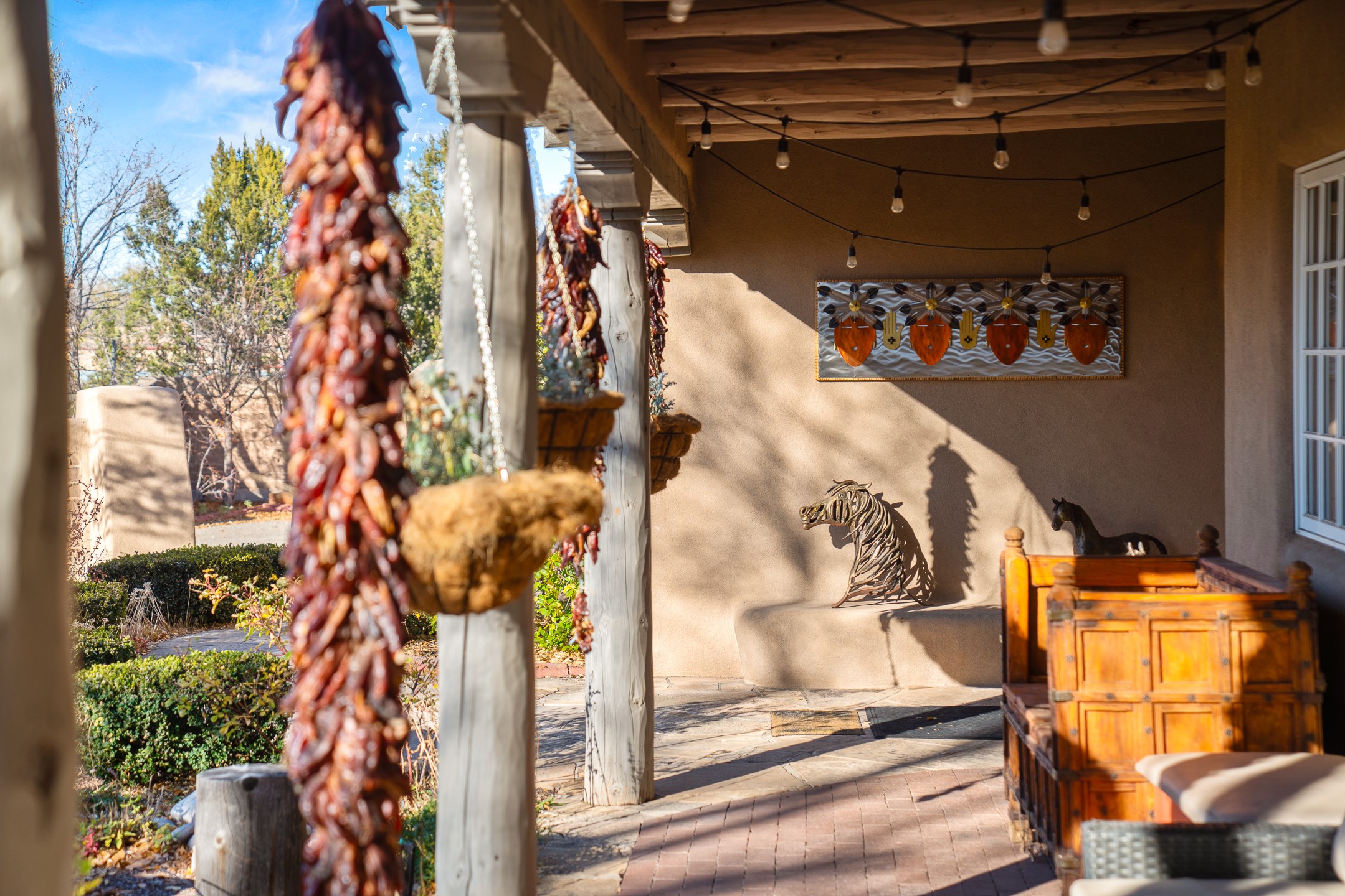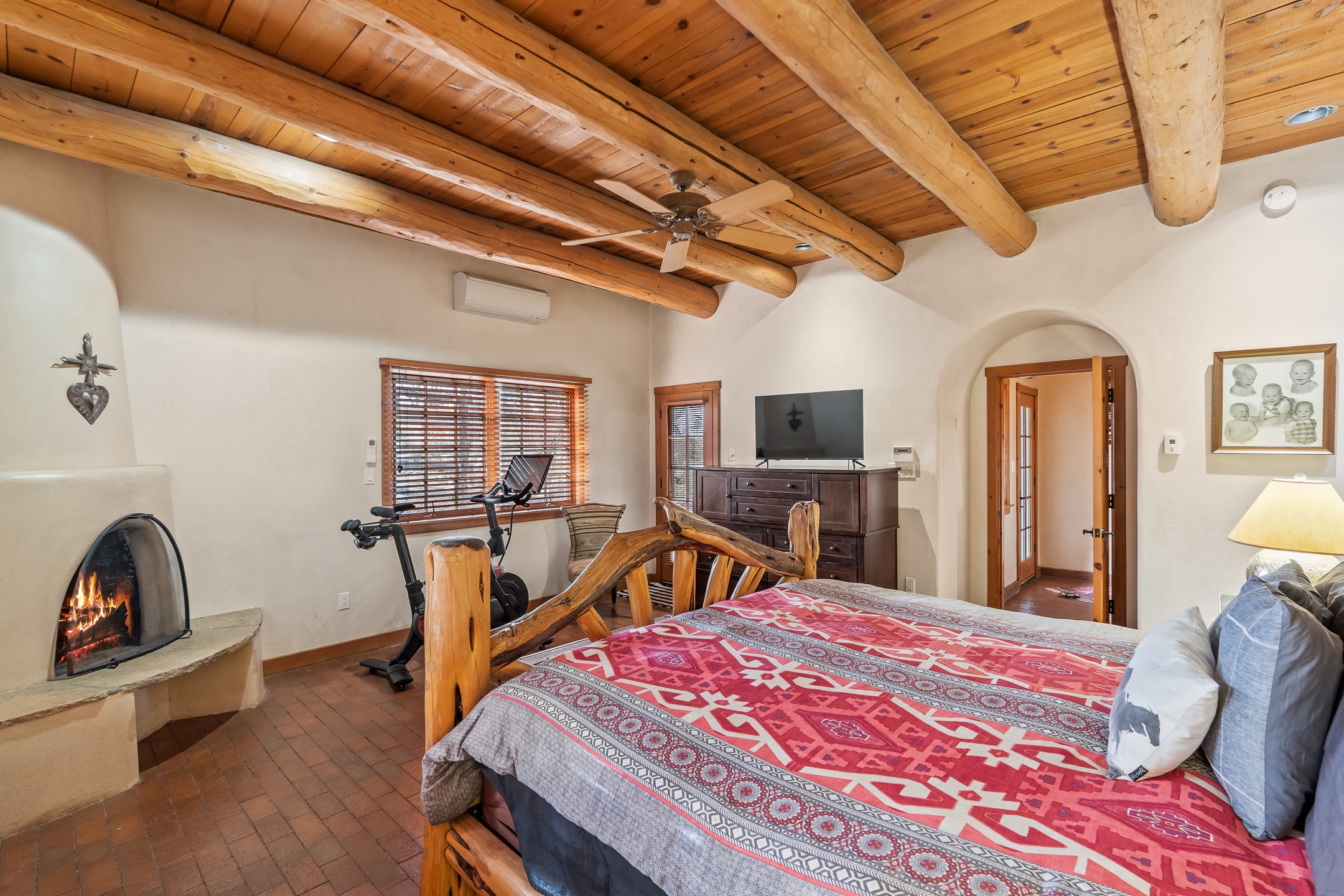 Nestled on a quiet cul-de-sac in Santa Fe's coveted South Capitol neighborhood, this beautifully crafted 3,600 sq. ft. single-level home offers 5 bedrooms, 3 bathrooms, and an attached studio/workshop. Sited on a rare 0.4-acre lot, the home provides generous space for entertaining while still maintaining an intimate, welcoming feel. Enclosed by a handsome adobe wall, the property offers both privacy and timeless Southwestern character--all just minutes from downtown and Wood Gormley Elementary.The home's central living space features a warm and inviting blend of Santa Fe style and spacious flow. Vigas, rough cut wood ceilings, and a commanding fireplace define the living room, while classically arched openings with corbels subtly distinguish the open kitchen, dining, and den areas--offering connectivity with architectural charm. A large den--just off the living room--provides additional living space, perfect for a media room or library/office space. A separate studio/workshop is another perfect space for an in-home office, gym or studio. The home's thoughtful floor plan includes two guest wings, with 2 bedrooms/1 bathroom in each guest area. The primary suite is privately situated in the SouthEast corner of the property with plenty of light and outdoor connectivity and features a wood-burning kiva fireplace, a spacious bathroom with a jetted soaking tub and walk-in shower. Outdoor spaces include a wraparound portal, a thoughtfully landscaped South yard area with a large kiva firepit and a North yard has a second outdoor fireplace, a built-in barbecue and portal that is perfect for outdoor dining. The home features an attached 2-car garage, in-floor radiant heat throughout and mini-splits for cooling. This special property combines scale, privacy, and Santa Fe charm in one of the city's most desirable neighborhoods--truly a rare find.