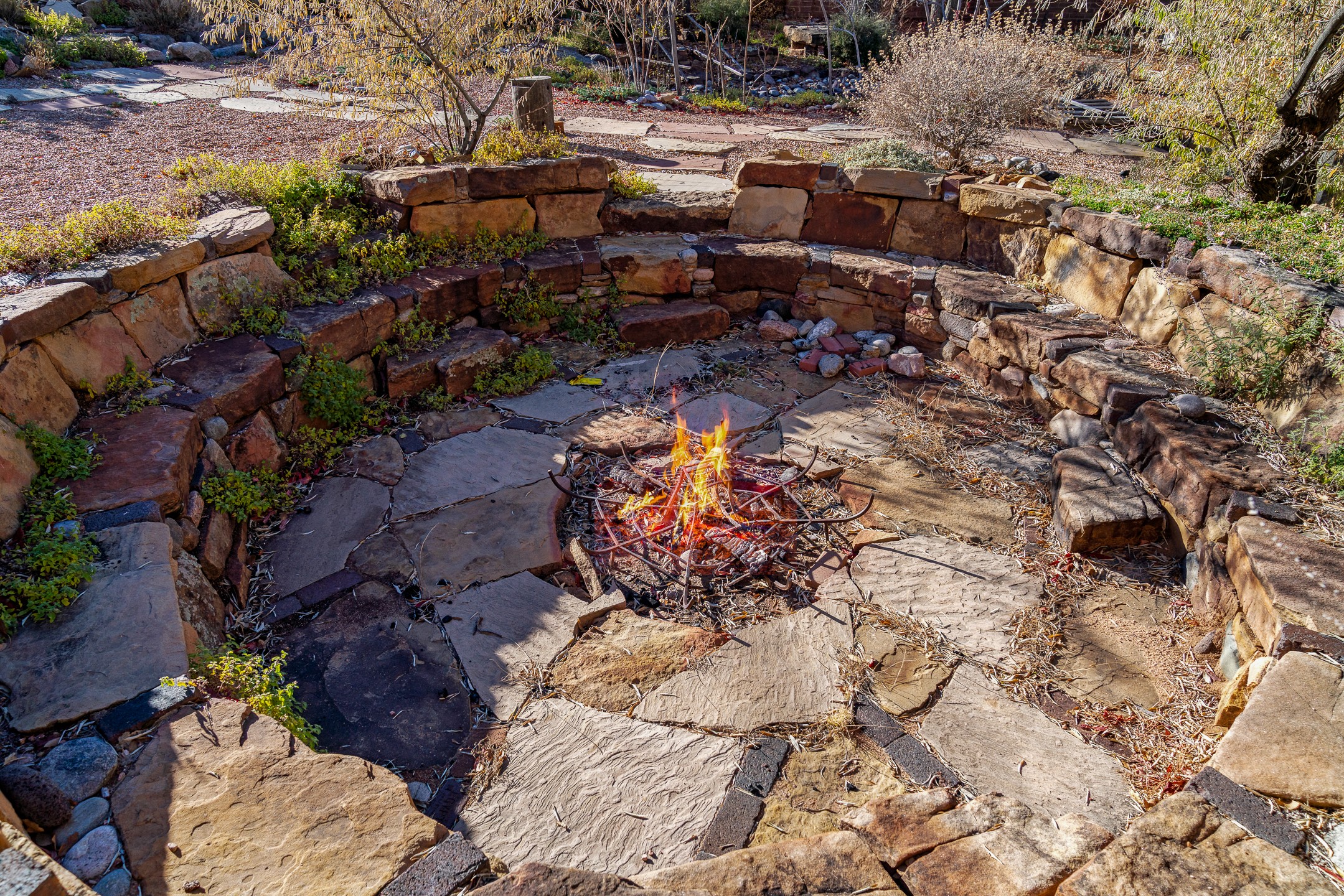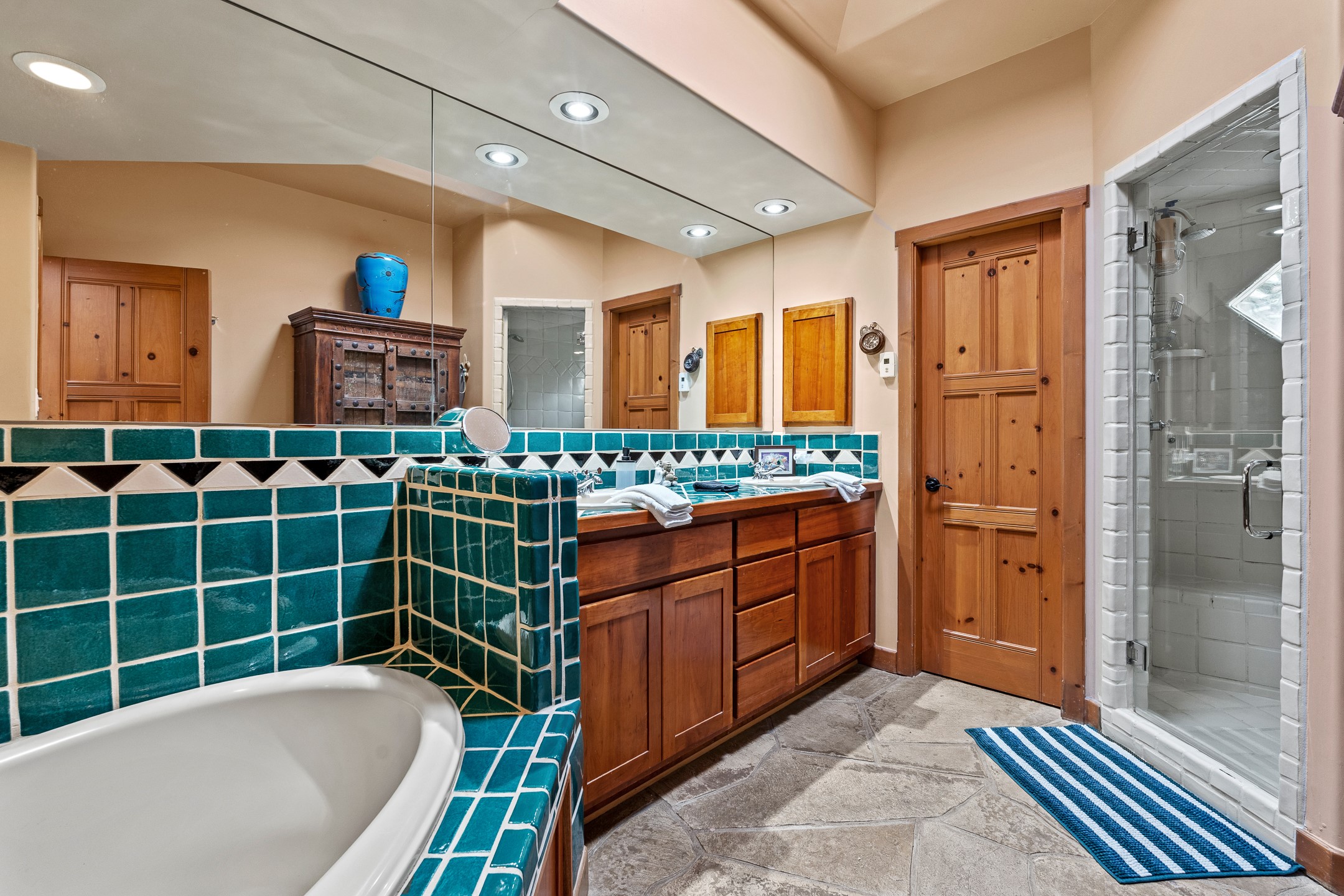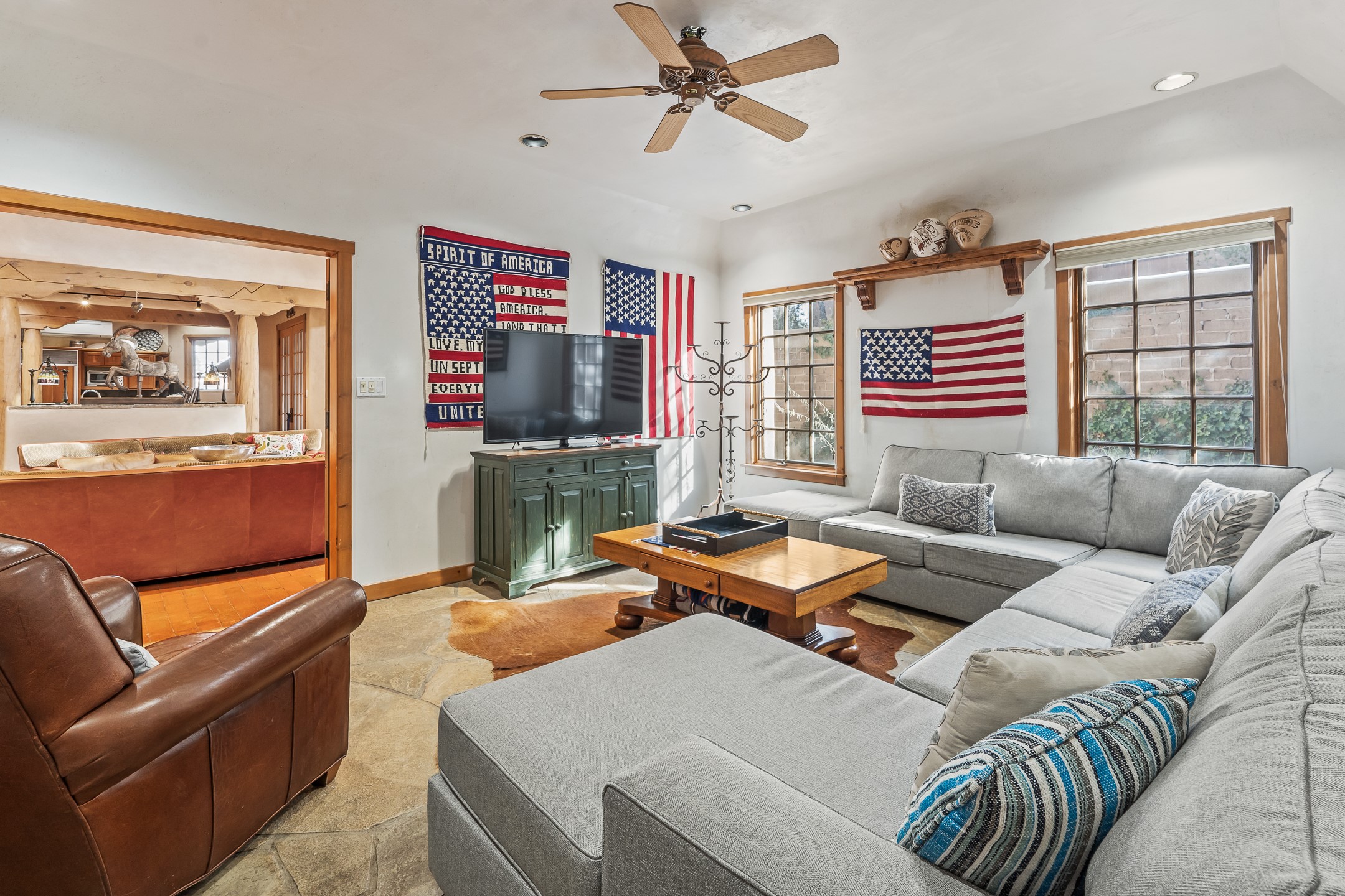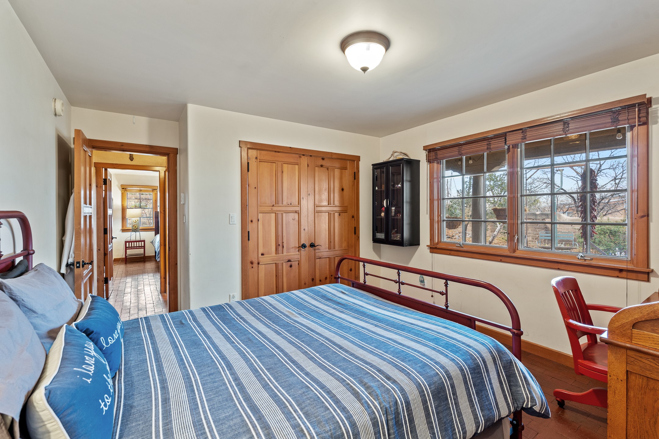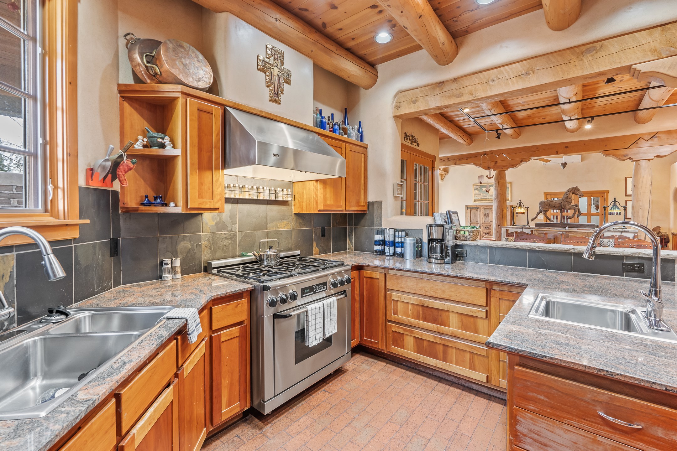 Nestled on a quiet cul-de-sac in Santa Fe's coveted South Capitol neighborhood, this beautifully crafted 3,600 sq. ft. single-level home offers 5 bedrooms, 3 bathrooms, and an attached studio/workshop. Sited on a rare 0.4-acre lot, the home provides generous space for entertaining while still maintaining an intimate, welcoming feel. Enclosed by a handsome adobe wall, the property offers both privacy and timeless Southwestern character--all just minutes from downtown and Wood Gormley Elementary.The home's central living space features a warm and inviting blend of Santa Fe style and spacious flow. Vigas, rough cut wood ceilings, and a commanding fireplace define the living room, while classically arched openings with corbels subtly distinguish the open kitchen, dining, and den areas--offering connectivity with architectural charm. A large den--just off the living room--provides additional living space, perfect for a media room or library/office space. A separate studio/workshop is another perfect space for an in-home office, gym or studio. The home's thoughtful floor plan includes two guest wings, with 2 bedrooms/1 bathroom in each guest area. The primary suite is privately situated in the SouthEast corner of the property with plenty of light and outdoor connectivity and features a wood-burning kiva fireplace, a spacious bathroom with a jetted soaking tub and walk-in shower. Outdoor spaces include a wraparound portal, a thoughtfully landscaped South yard area with a large kiva firepit and a North yard has a second outdoor fireplace, a built-in barbecue and portal that is perfect for outdoor dining. The home features an attached 2-car garage, in-floor radiant heat throughout and mini-splits for cooling. This special property combines scale, privacy, and Santa Fe charm in one of the city's most desirable neighborhoods--truly a rare find.