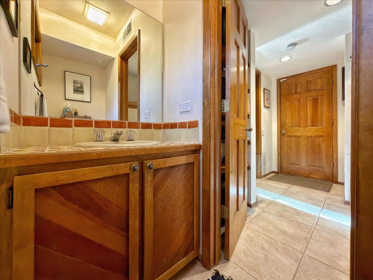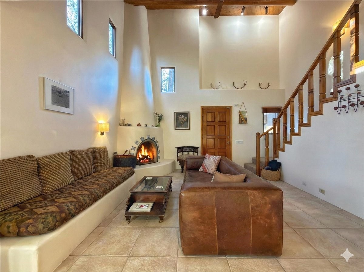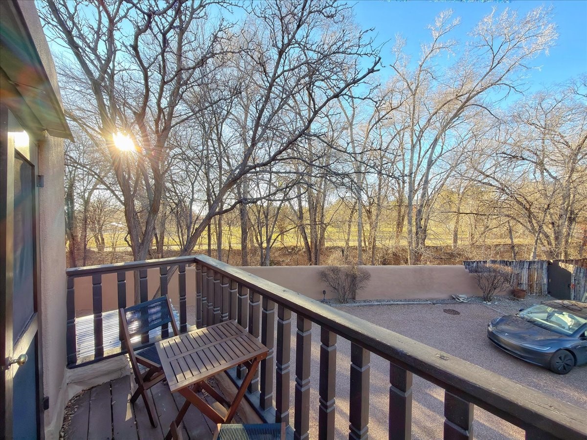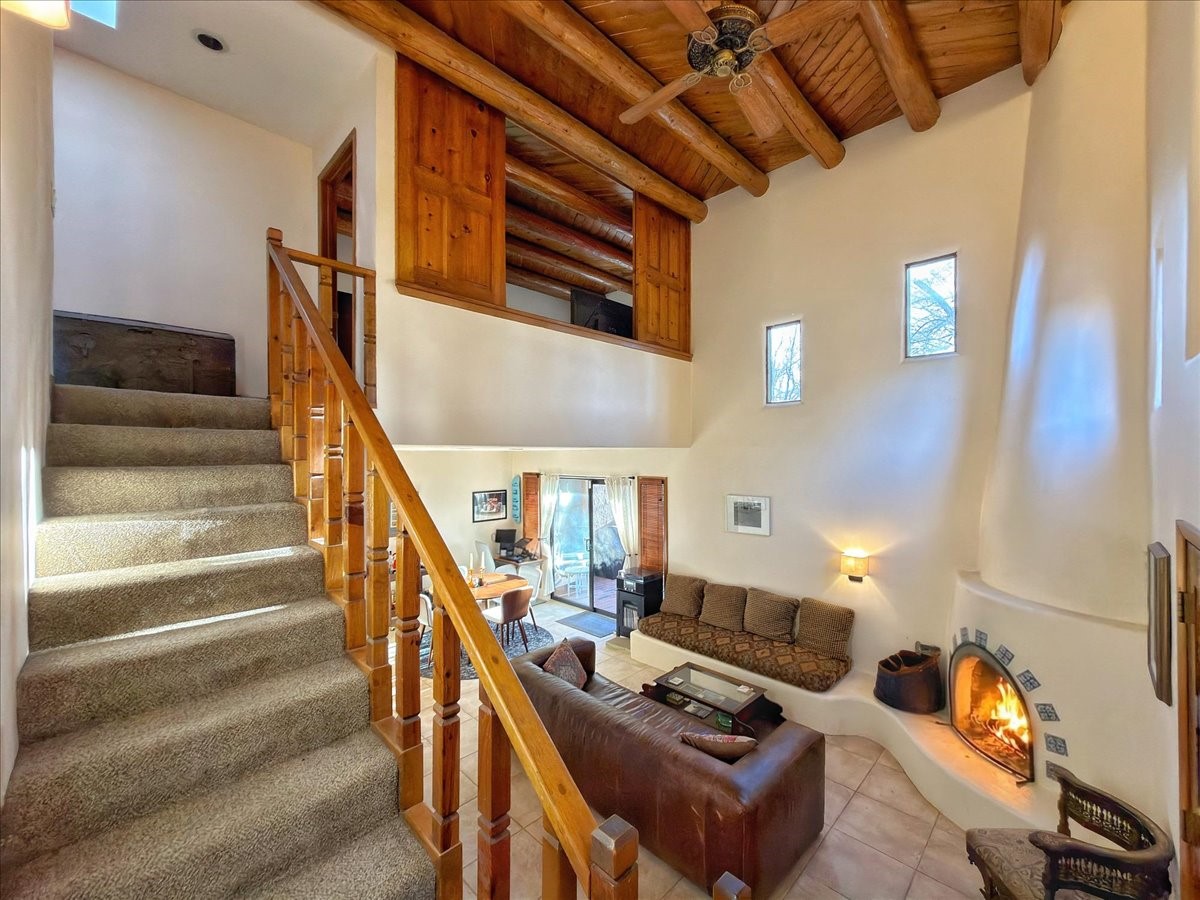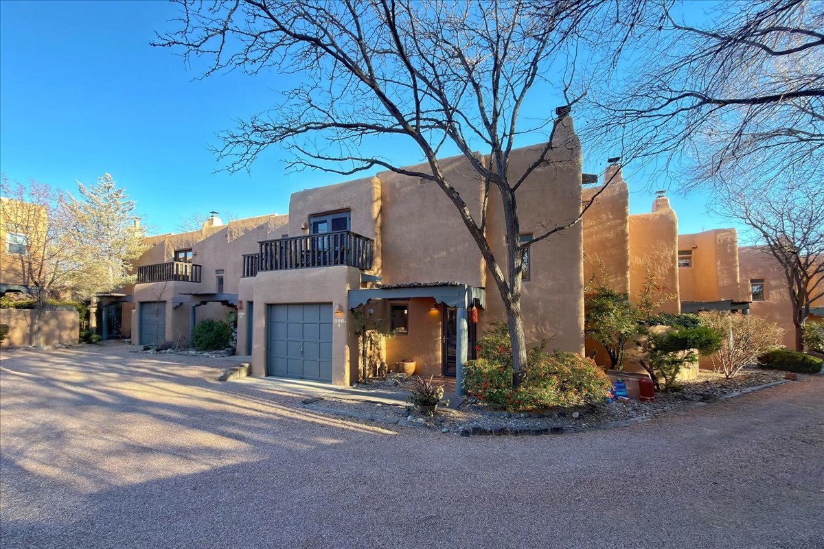 Lovely condominium desirable Griffin Park Condominiums that's highly walkable to the Plaza. This charming end-unit home features 2 bedrooms, 2 1/2 baths, outdoor living area, a one-car garage and forced air heating and cooling, plus two kiva fireplaces. The open plan living area has a cute banco, kiva fireplace and soaring two-story ceiling with vigas. The living area flows to the dining area and well-sized kitchen, as well as to the outdoor living space. Santa Fe charm abounds with Talavera tiles throughout. The kitchen offers plenty of counter space and storage and has a gas oven/range. Immediately off the kitchen is a laundry room and powder room. The primary bedroom upstairs has an ensuite bathroom with double sinks. The second bedroom has a balcony and its own bathroom with walk-in shower. Griffin Park is one of Santa Fe's most charming condo compounds offering privacy and serenity. Live here full or part-time and enjoy all that Santa Fe has to offer.