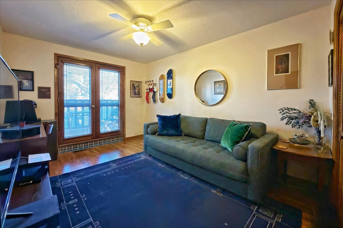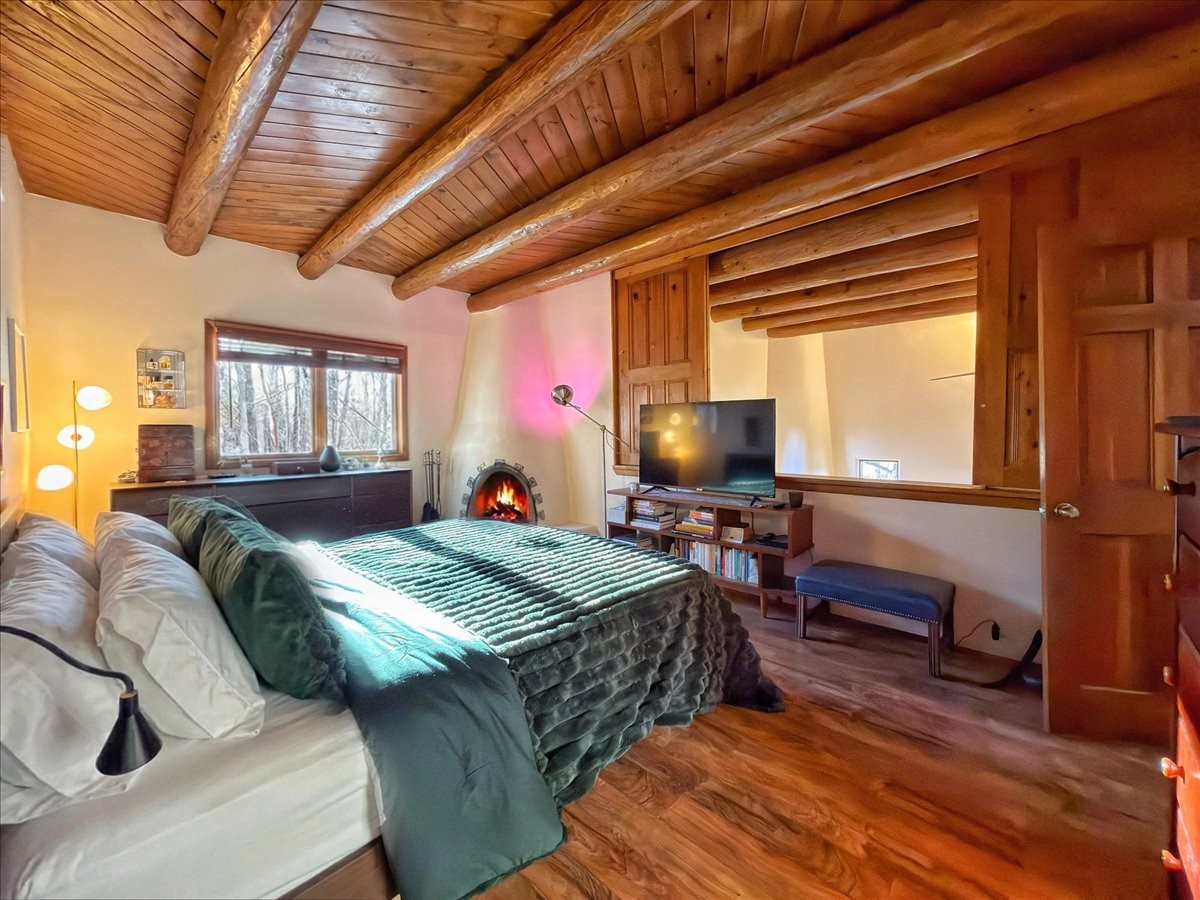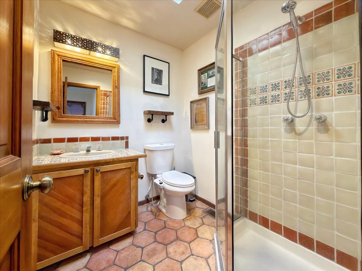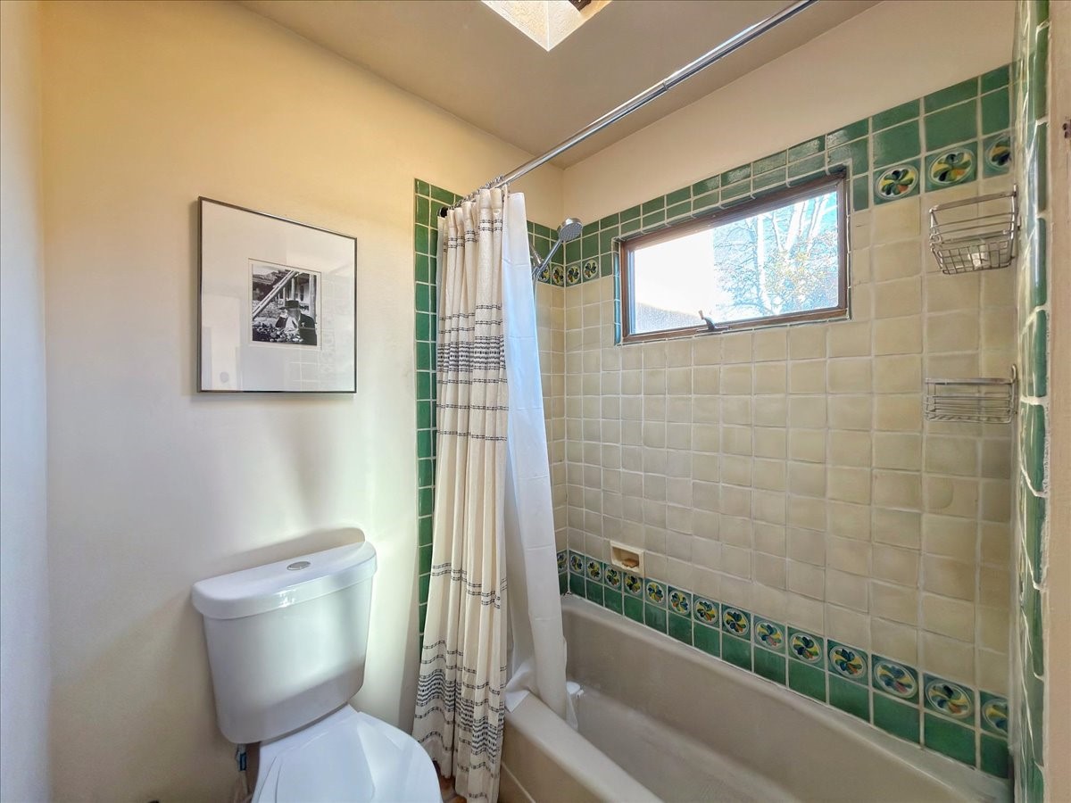 Lovely condominium desirable Griffin Park Condominiums that's highly walkable to the Plaza. This charming end-unit home features 2 bedrooms, 2 1/2 baths, outdoor living area, a one-car garage and forced air heating and cooling, plus two kiva fireplaces. The open plan living area has a cute banco, kiva fireplace and soaring two-story ceiling with vigas. The living area flows to the dining area and well-sized kitchen, as well as to the outdoor living space. Santa Fe charm abounds with Talavera tiles throughout. The kitchen offers plenty of counter space and storage and has a gas oven/range. Immediately off the kitchen is a laundry room and powder room. The primary bedroom upstairs has an ensuite bathroom with double sinks. The second bedroom has a balcony and its own bathroom with walk-in shower. Griffin Park is one of Santa Fe's most charming condo compounds offering privacy and serenity. Live here full or part-time and enjoy all that Santa Fe has to offer.