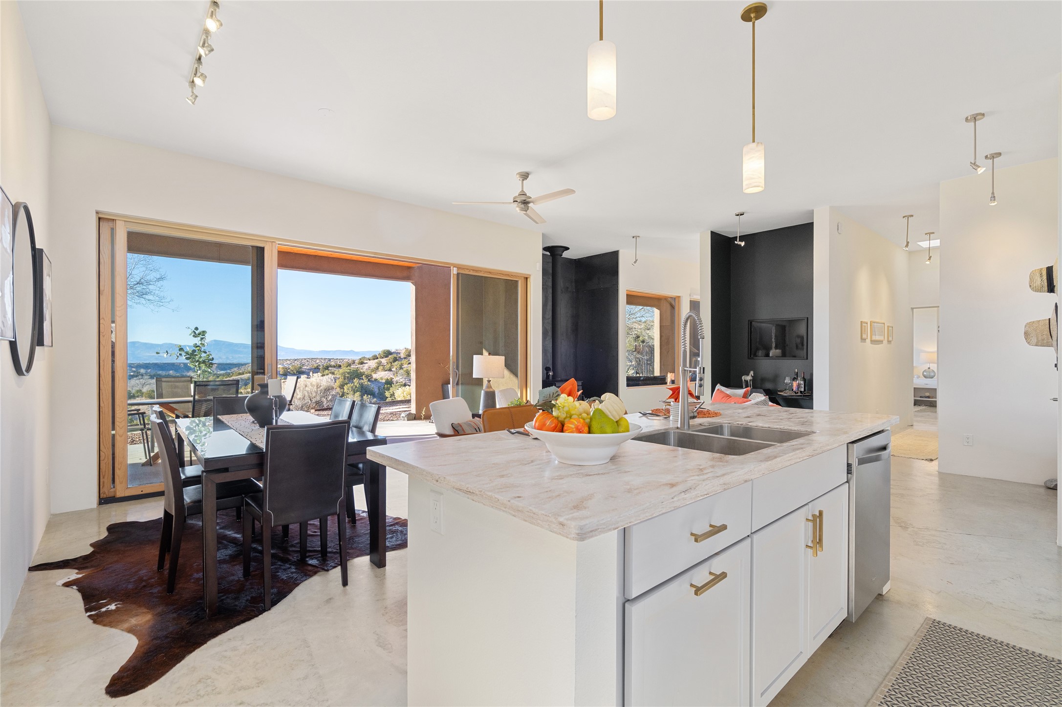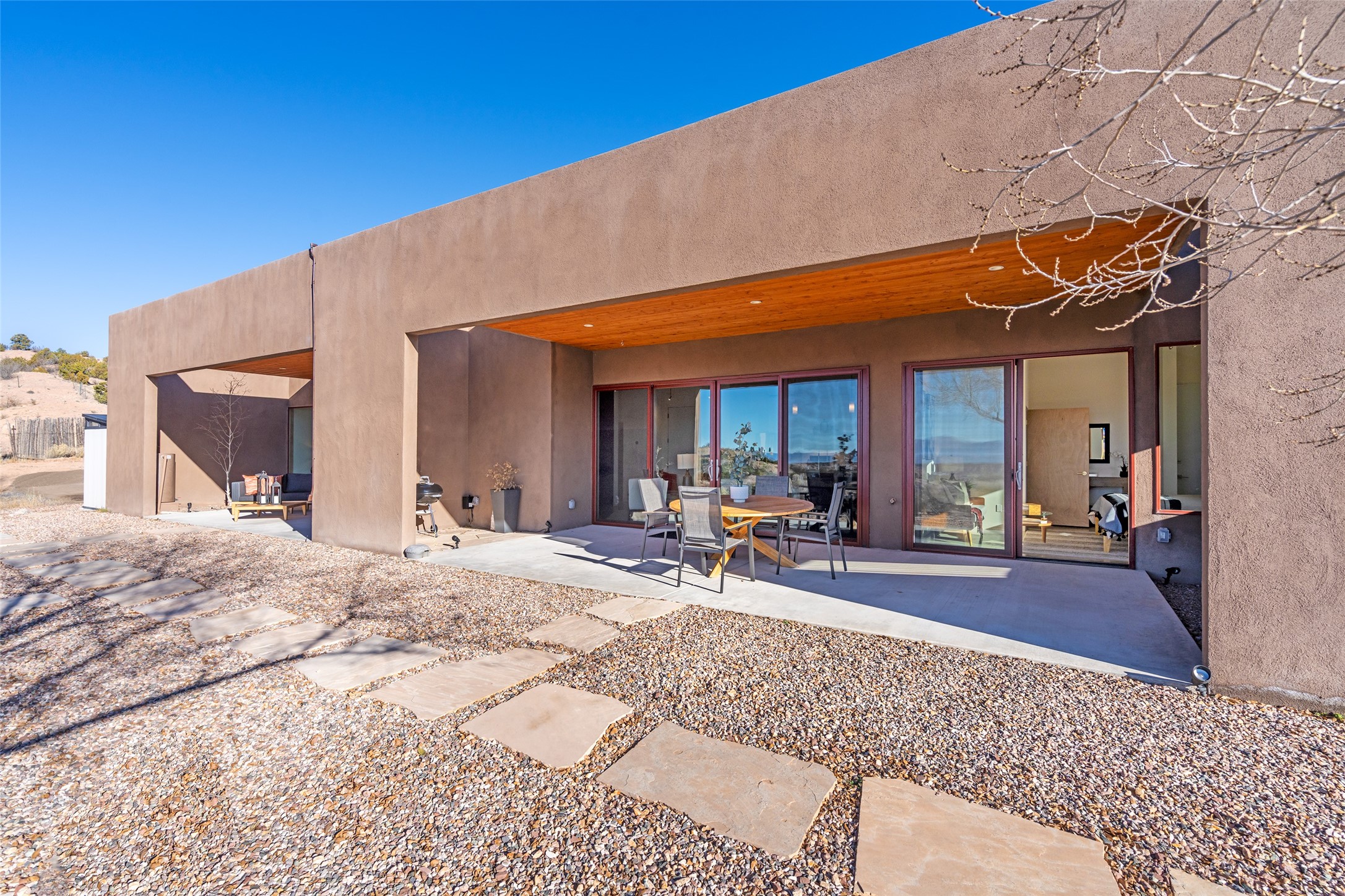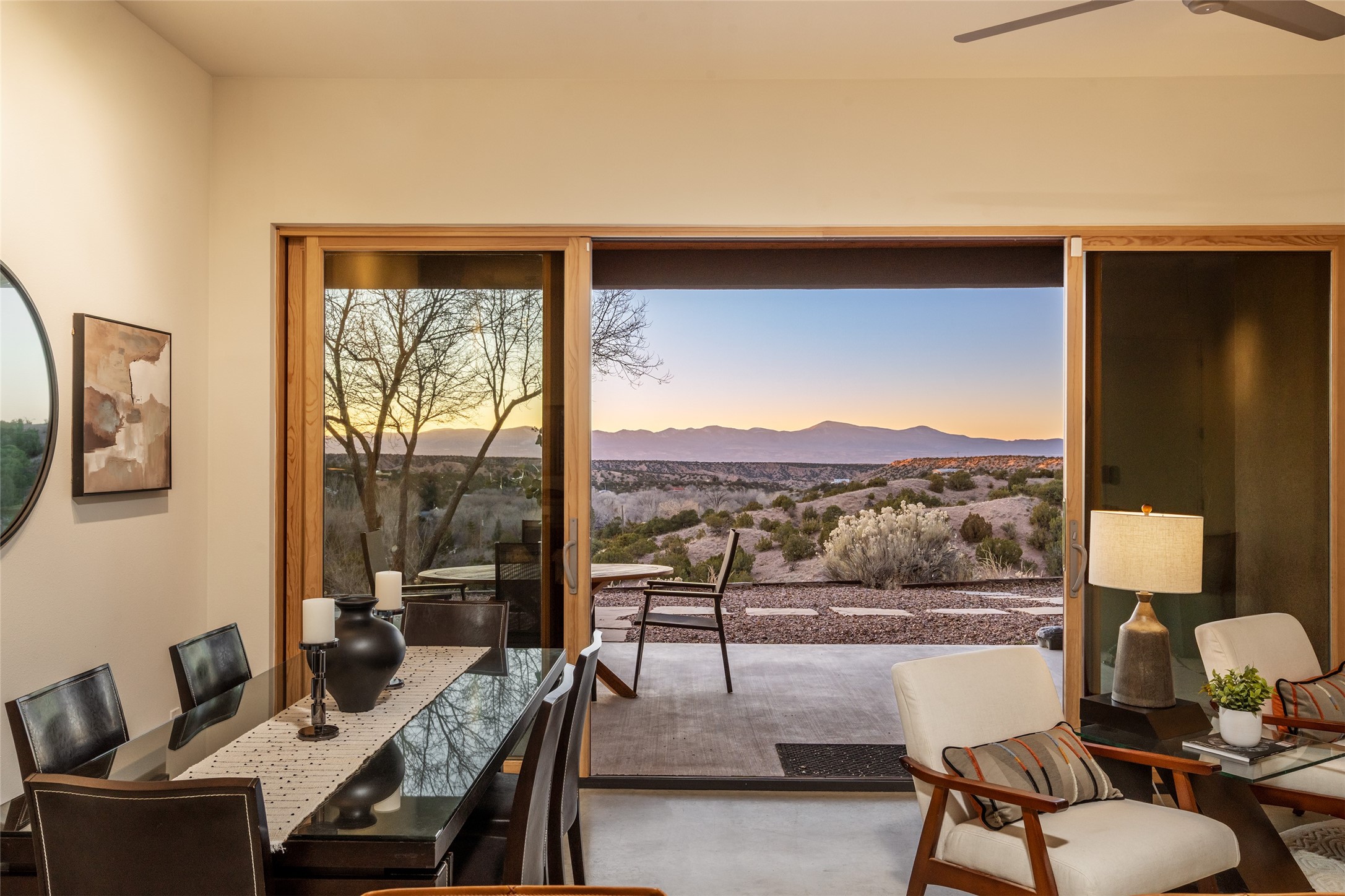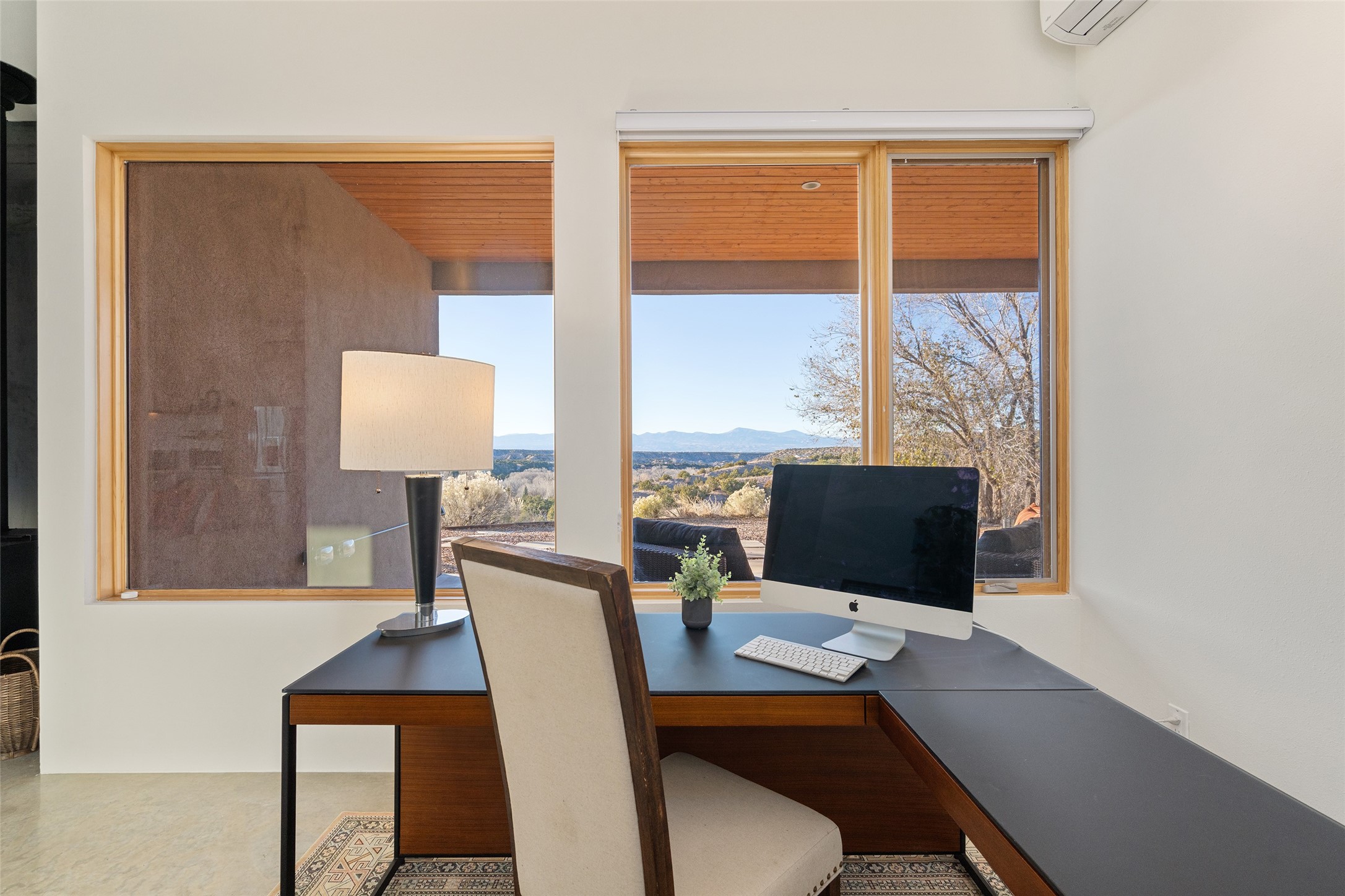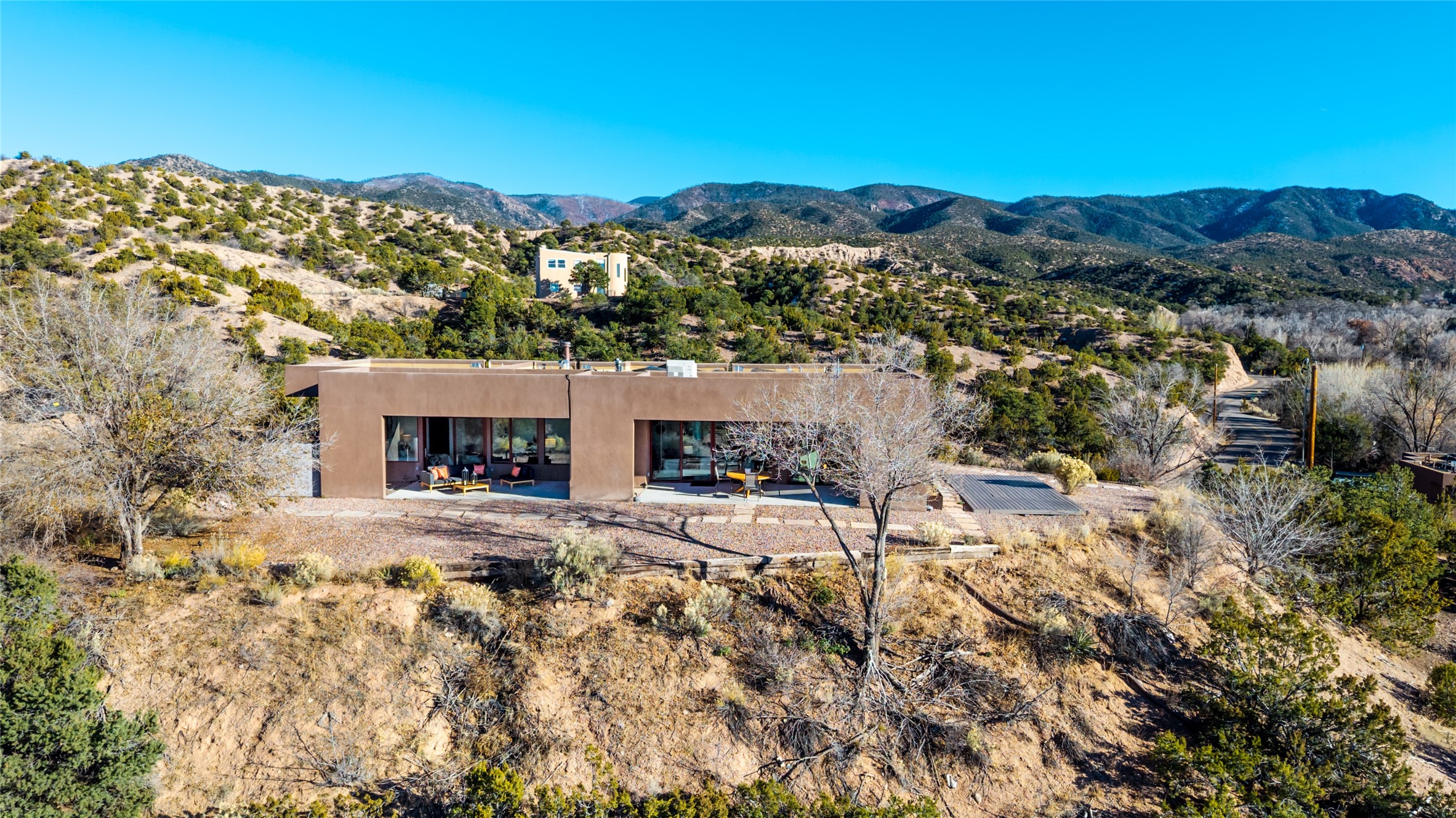 Perched atop a private hill in the storied community of Chupadero, this contemporary split floor plan 2-bed, 2-bath residence delivers the kind of views most people only dream about. Thoughtfully designed for high-desert living, the home includes solar power and water catchment, underscoring a sustainable, forward-thinking approach to life in this remarkable landscape. Indoor-outdoor living shines here, with each room offering direct access to the surrounding patios and the panorama beyond.Comfort comes easily thanks to radiant in-floor heating, a wood-burning stove, and ductless mini splits that both warm and cool the home year-round. Even everyday moments feel elevated--the kitchen sink frames a stunning view of the Sangre de Cristos.Just 20 minutes from downtown Santa Fe--and even closer to beloved amenities such as the Four Seasons, El Nido Restaurant, and Tesuque Village Market--Chupadero offers a lifestyle that feels both connected and wonderfully serene. Make an appointment to experience this special home for yourself.