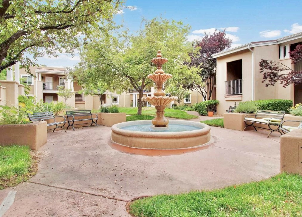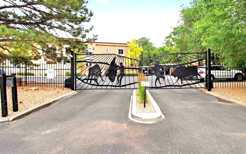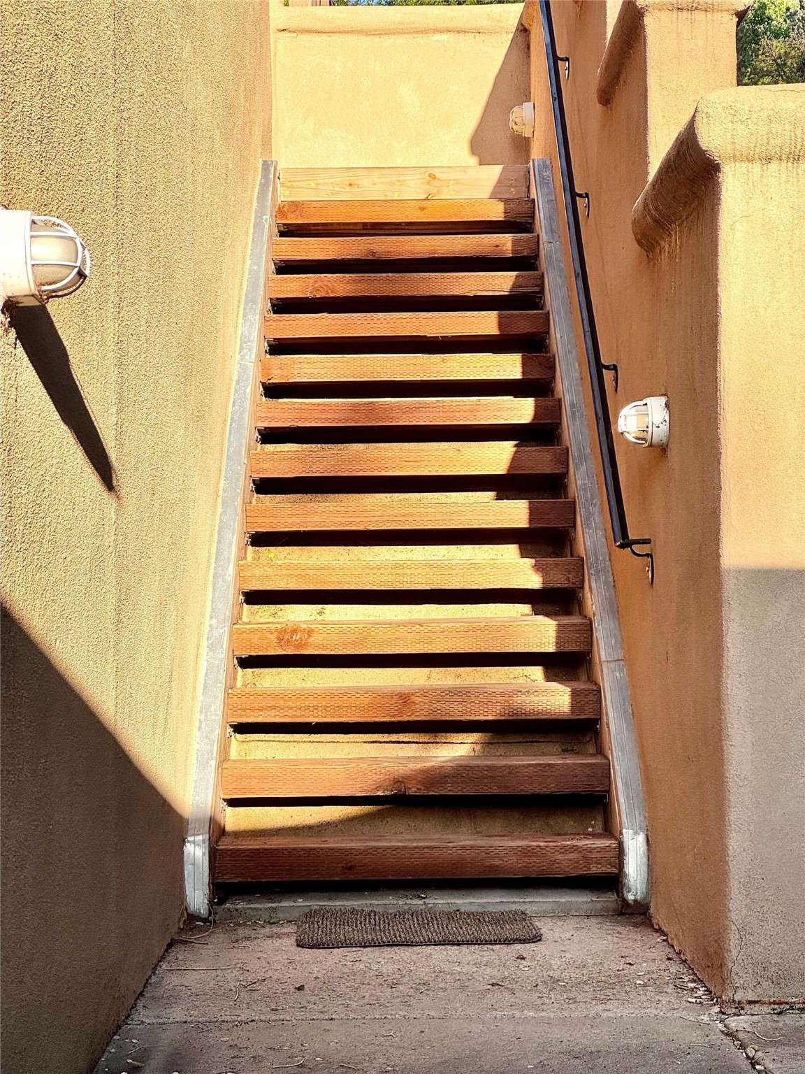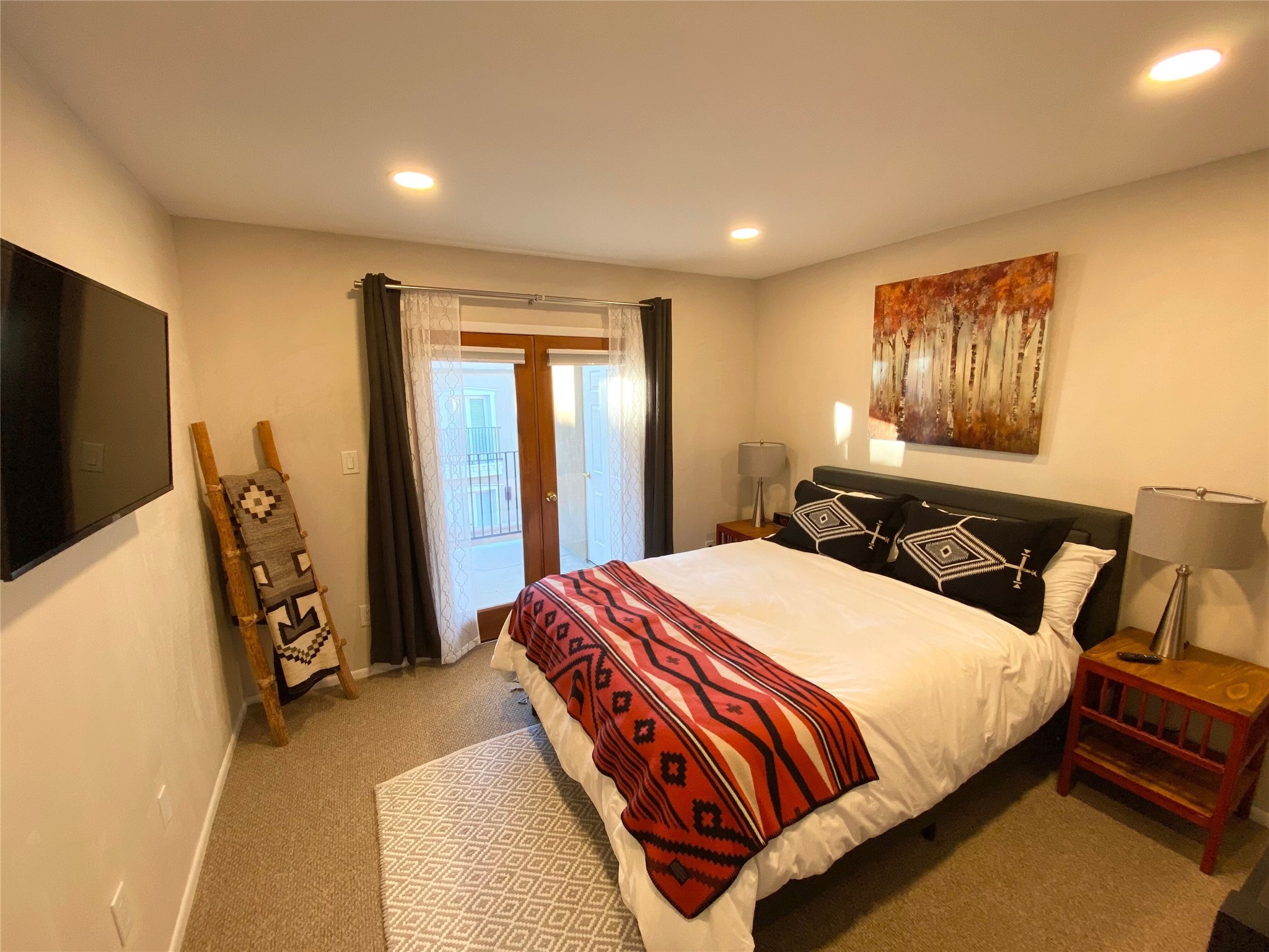 Ideally located just six blocks from the Santa Fe Plaza, this spacious one-bedroom, one-bath condominium offers rare walkability paired with privacy and quiet. Situated on the second floor at the back of the complex, this corner unit enjoys a peaceful setting along with a covered, dedicated parking space. Thoughtfully upgraded throughout, the home features granite countertops, stainless steel appliances, new wood flooring in the kitchen and bath, diamond plaster walls, and updated lighting. Built-in bookcases flank the cozy gas fireplace, adding both charm and function. French doors open to a tranquil patio with two private storage closets, creating an inviting indoor-outdoor flow. Additional highlights include central heating and air conditioning, a second balcony, and an HOA that covers exterior maintenance, landscaping, and gated security, making this an easy full-time residence or a perfect Santa Fe lock-and-leave. A furniture package is available with a satisfactory offer, allowing for a seamless move-in experience.