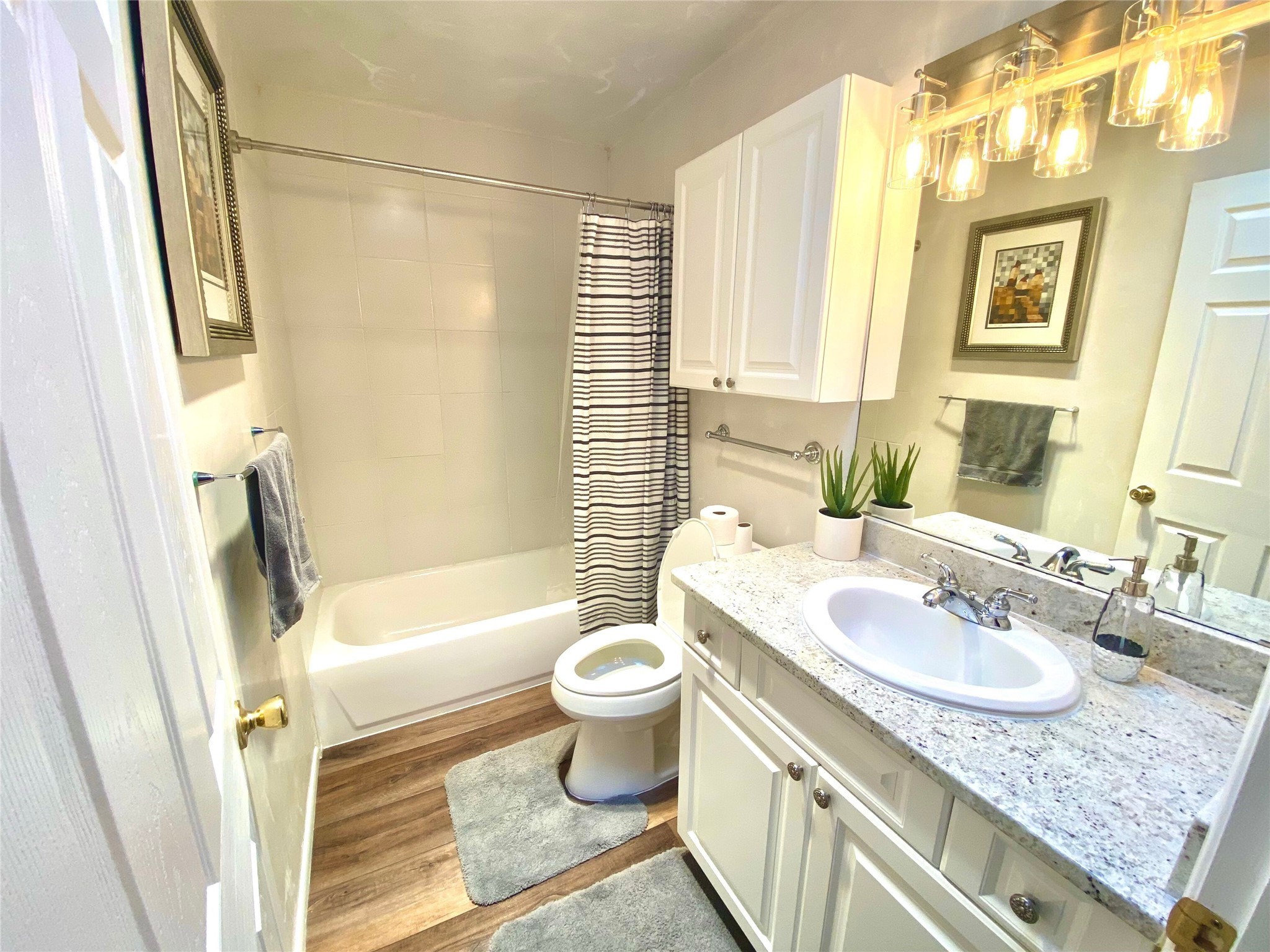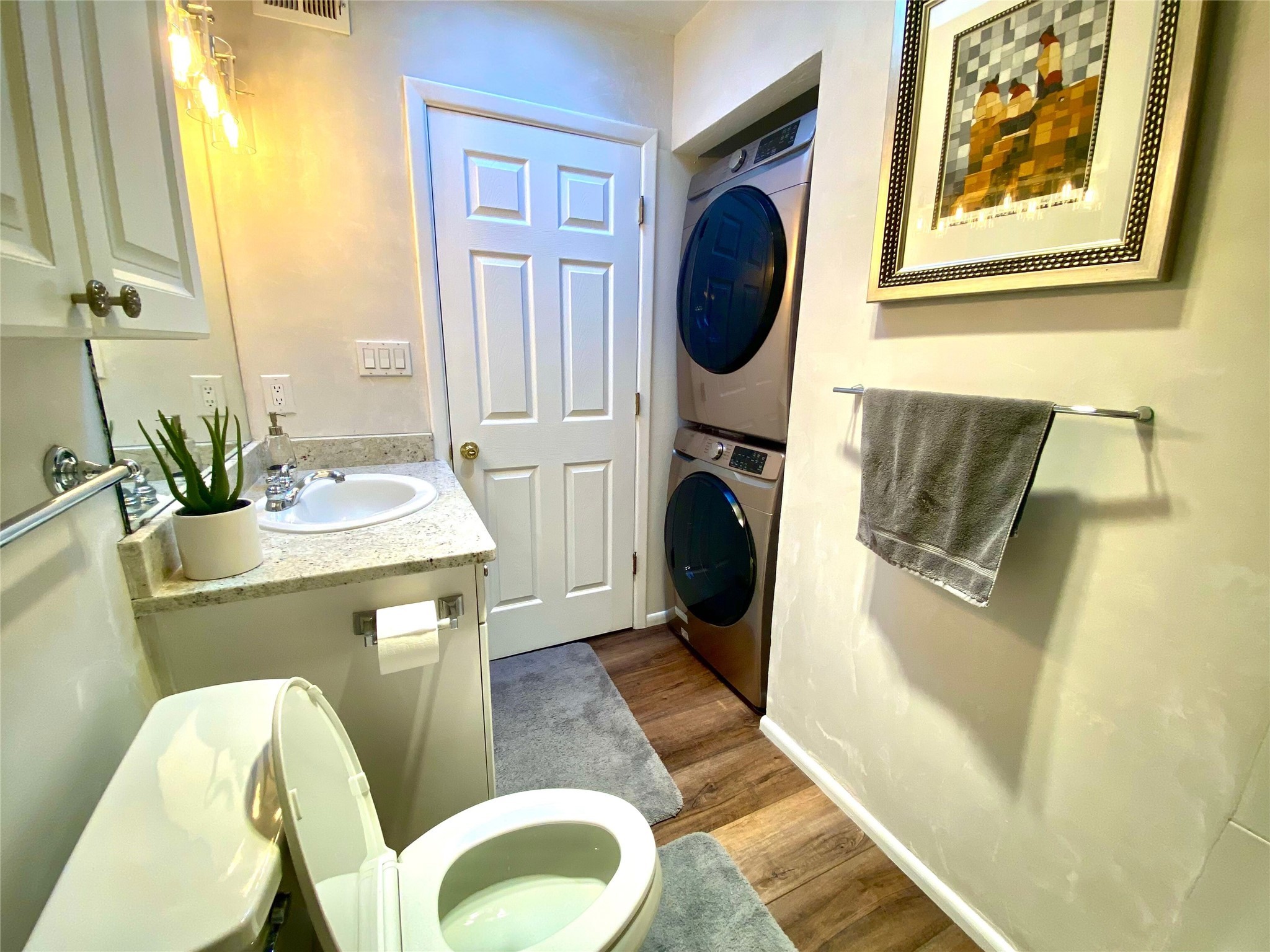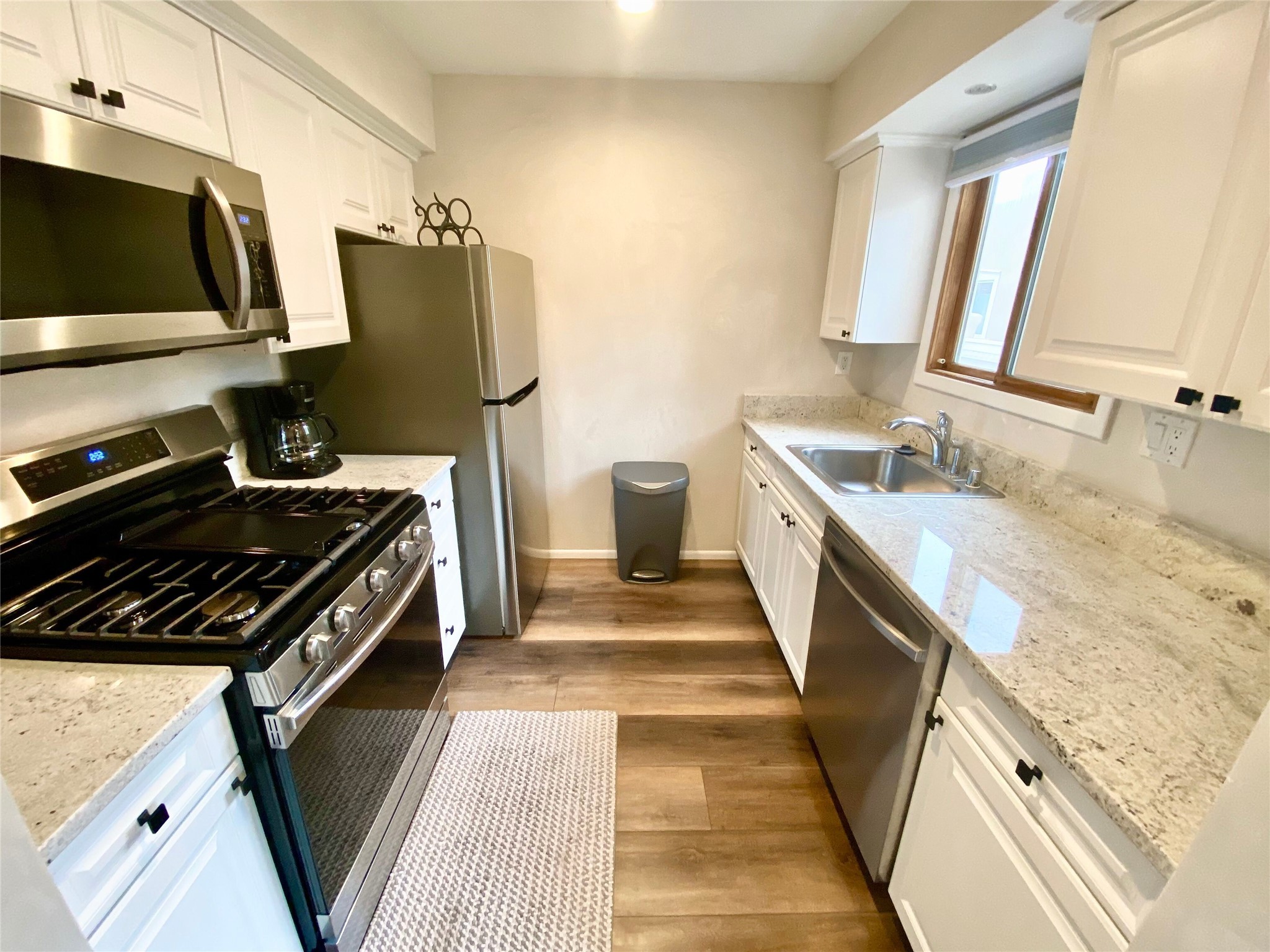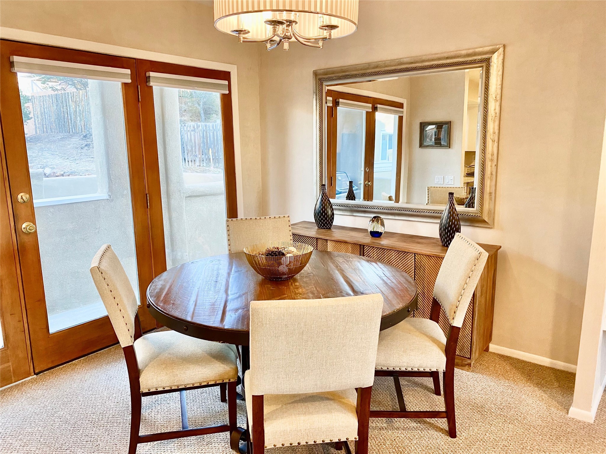 Ideally located just six blocks from the Santa Fe Plaza, this spacious one-bedroom, one-bath condominium offers rare walkability paired with privacy and quiet. Situated on the second floor at the back of the complex, this corner unit enjoys a peaceful setting along with a covered, dedicated parking space. Thoughtfully upgraded throughout, the home features granite countertops, stainless steel appliances, new wood flooring in the kitchen and bath, diamond plaster walls, and updated lighting. Built-in bookcases flank the cozy gas fireplace, adding both charm and function. French doors open to a tranquil patio with two private storage closets, creating an inviting indoor-outdoor flow. Additional highlights include central heating and air conditioning, a second balcony, and an HOA that covers exterior maintenance, landscaping, and gated security, making this an easy full-time residence or a perfect Santa Fe lock-and-leave. A furniture package is available with a satisfactory offer, allowing for a seamless move-in experience.
