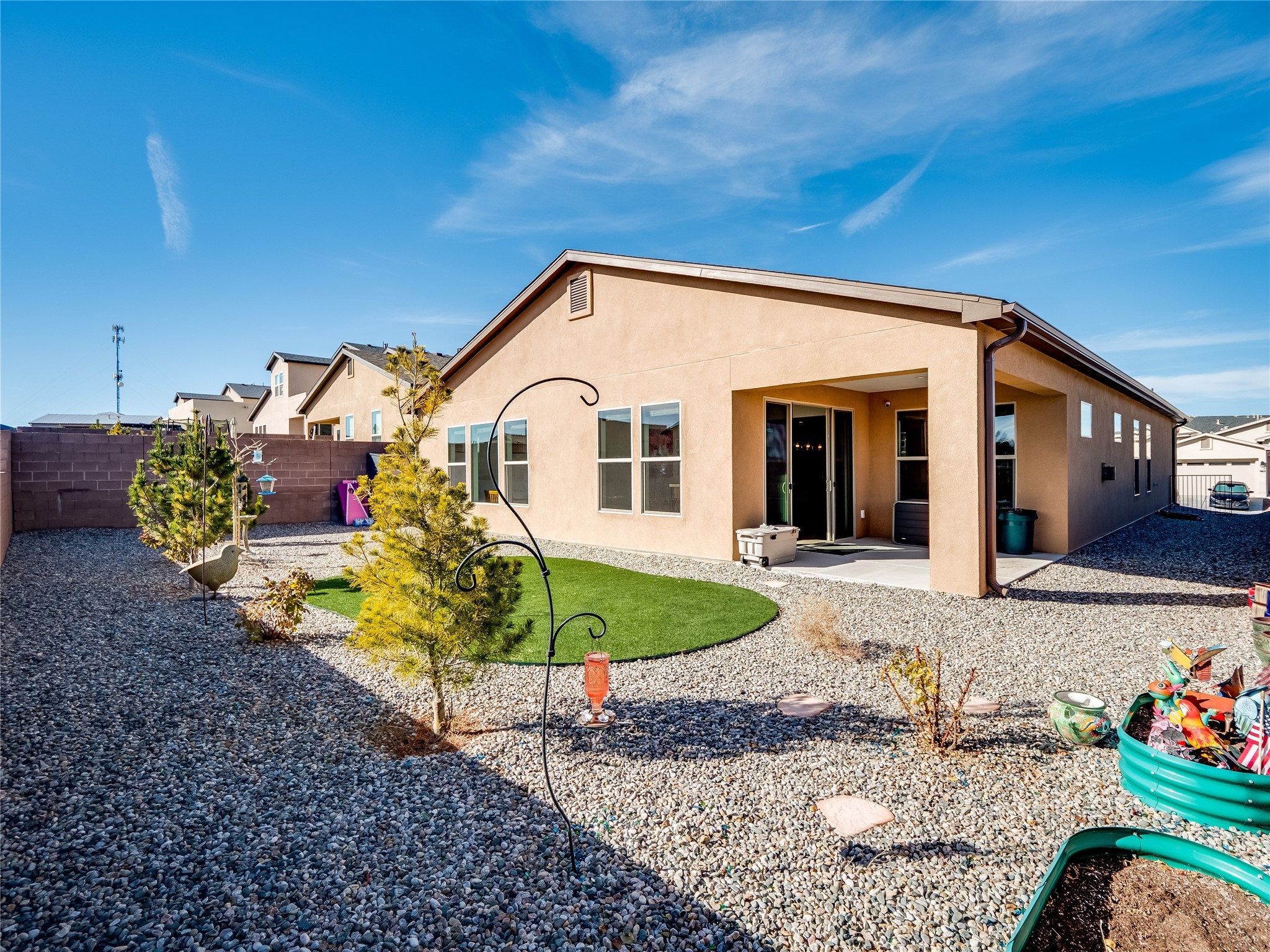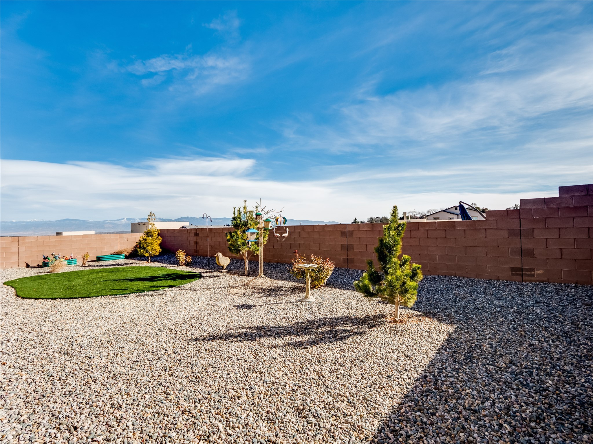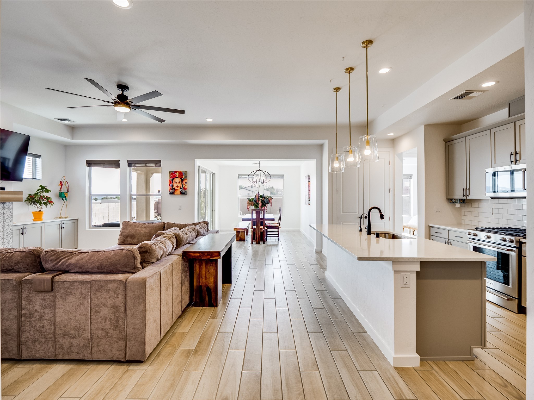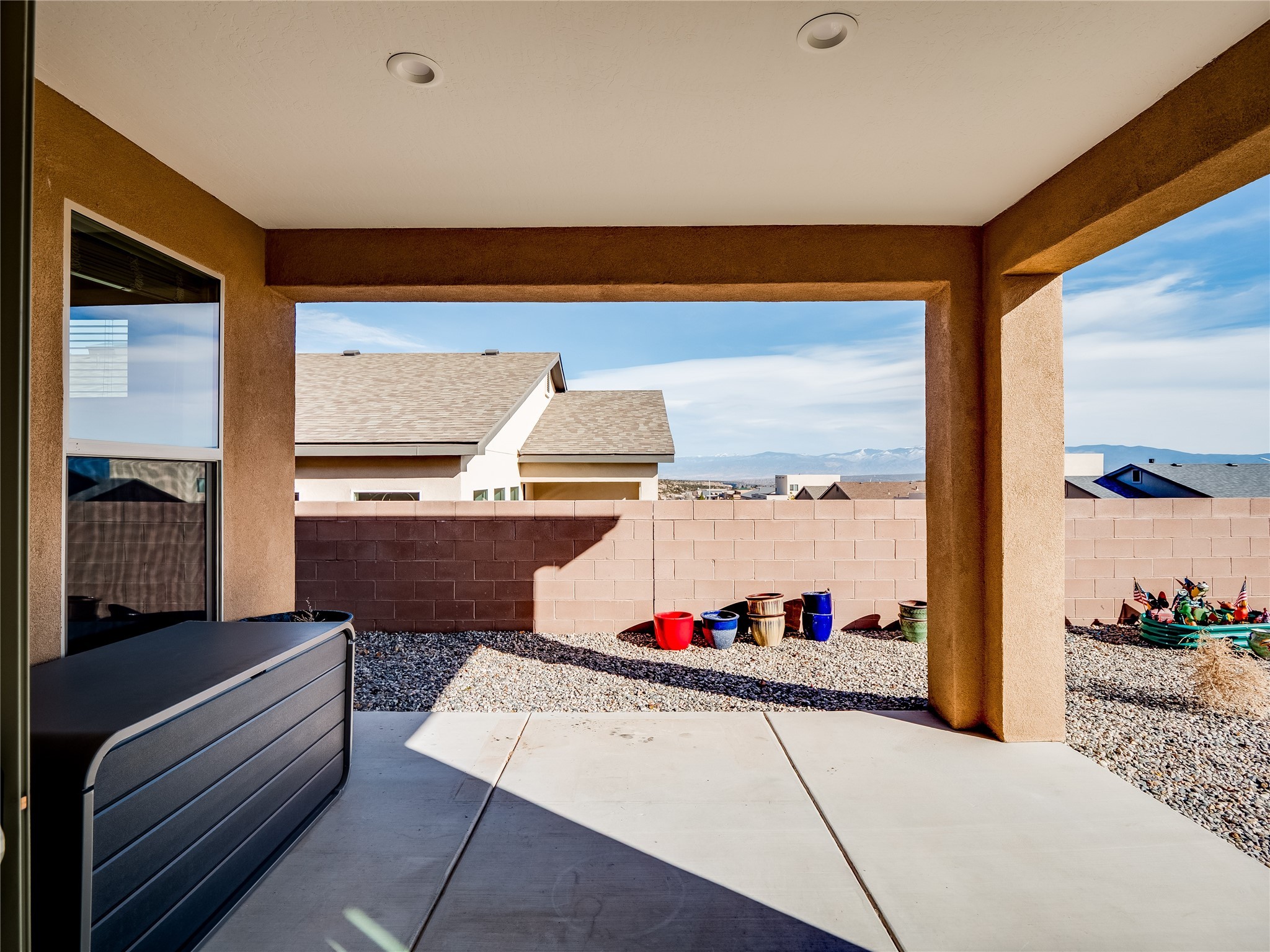 Gorgeous single level modern home blends clean design, natural light, and effortless livability in the desirable White Rock community. A low maintenance front yard invites you to a covered porch, creating welcoming curb appeal without the burden of upkeep. Step inside to a long, skylit foyer with durable tile flooring that flows through the main living areas. Natural light leads you into a bright, great room layout. The spacious living room easily accommodates a large sectional, perfect for movie nights and everyday comfort. Centered is a gas fireplace with decorative tile surround, framed by built-in cabinets for style and storage. The adjacent kitchen offers modern sophistication with warm, cohesive finishes. A large center island provides seating and workspace, highlighted by gold pendant lighting. Taupe cabinets with bronze hardware pair beautifully with a white tile backsplash, quartz counters, and stainless steel appliances. A sizable pantry enhances organization and convenience. The dining area features sliding doors that open to a covered patio and a fully fenced backyard designed for low-maintenance enjoyment. Complete with turf, trees, and mountain views, the space offers room for creativity, ideal for, planters, or personal design. Near the entry, two guest bedrooms with carpet share a Jack-and-Jill full bathroom for a smart, efficient layout. A secondary hallway hosts an additional guest bedroom and bathroom with single sink vanity and tiled walk-in shower with glass enclosure. This hall also includes a laundry room with sink and direct access to the two-car garage for added practicality. Tucked toward the back, the primary suite serves as a peaceful retreat with carpet flooring, expansive windows, and mountain views. The spa like ensuite features tile flooring, double-sink vanity, and a walk-in tiled shower with built-in bench. A custom-organized walk-in closet maximizes storage. Move-in ready and waiting for you to schedule your tour today!