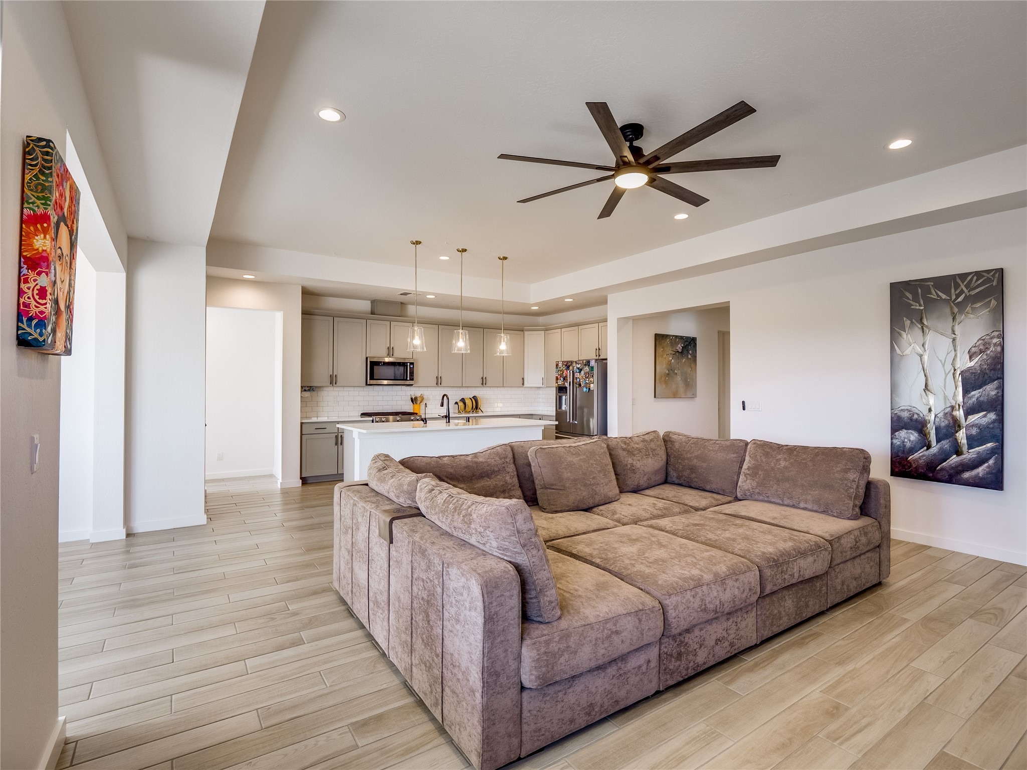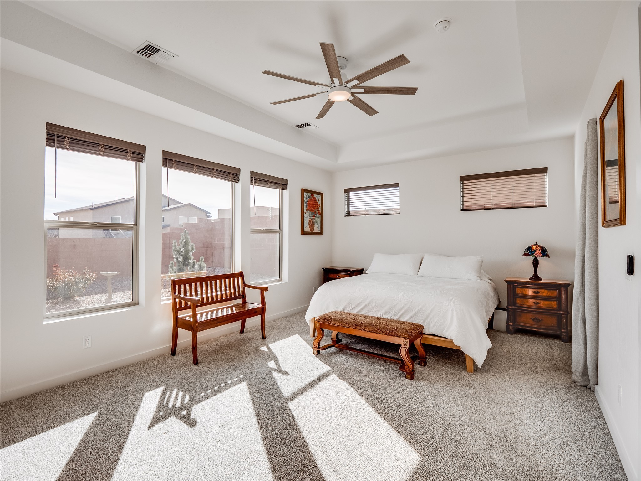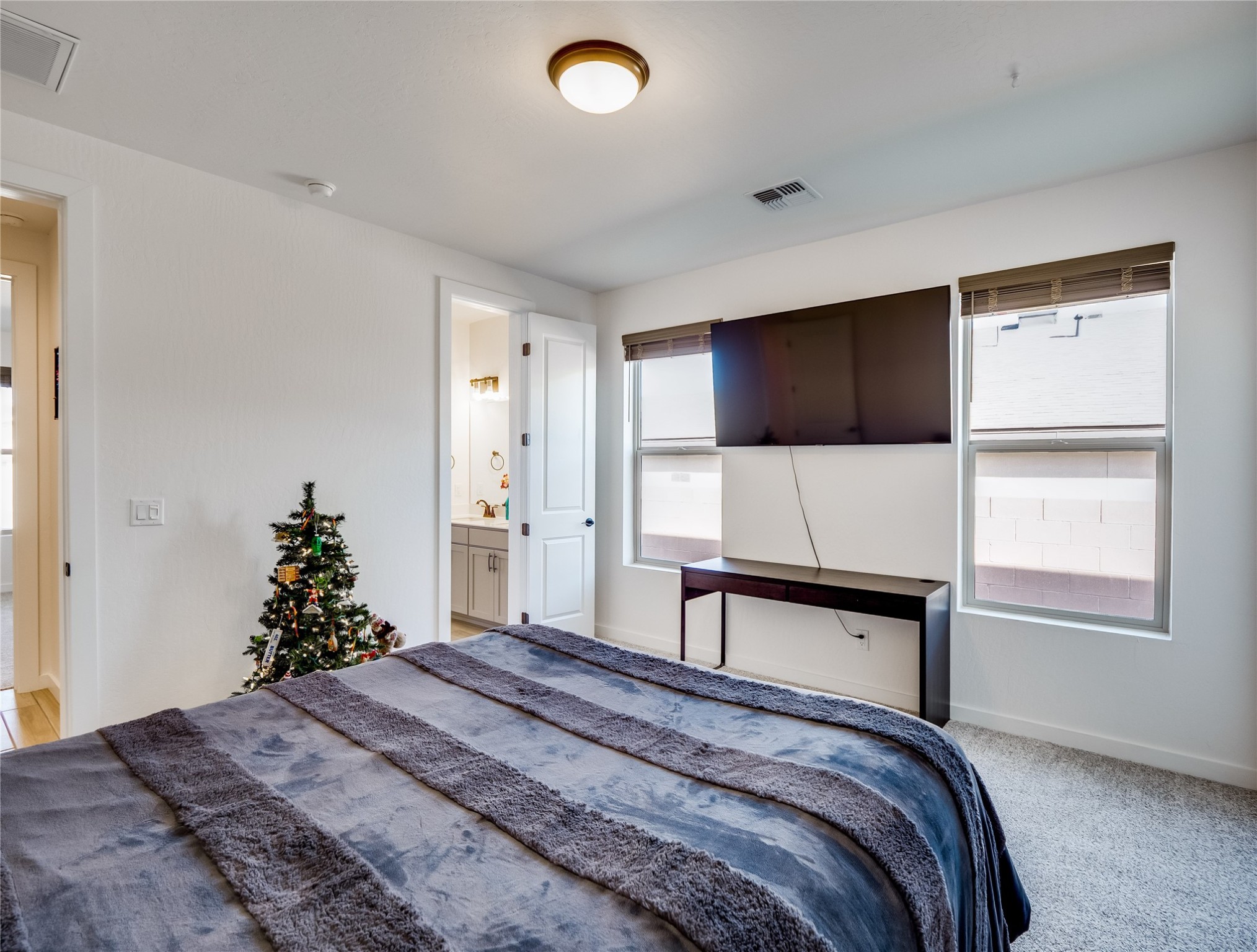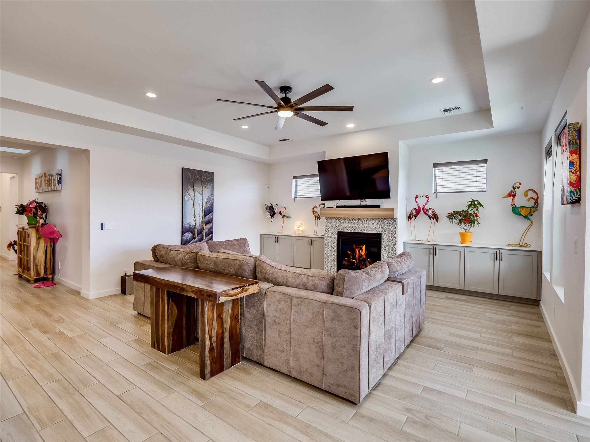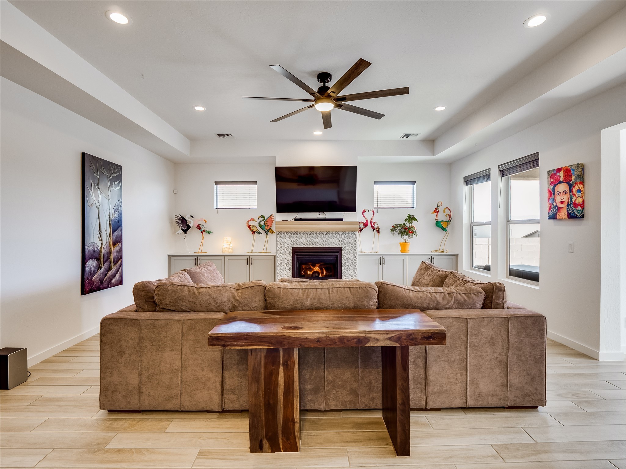 Gorgeous single level modern home blends clean design, natural light, and effortless livability in the desirable White Rock community. A low maintenance front yard invites you to a covered porch, creating welcoming curb appeal without the burden of upkeep. Step inside to a long, skylit foyer with durable tile flooring that flows through the main living areas. Natural light leads you into a bright, great room layout. The spacious living room easily accommodates a large sectional, perfect for movie nights and everyday comfort. Centered is a gas fireplace with decorative tile surround, framed by built-in cabinets for style and storage. The adjacent kitchen offers modern sophistication with warm, cohesive finishes. A large center island provides seating and workspace, highlighted by gold pendant lighting. Taupe cabinets with bronze hardware pair beautifully with a white tile backsplash, quartz counters, and stainless steel appliances. A sizable pantry enhances organization and convenience. The dining area features sliding doors that open to a covered patio and a fully fenced backyard designed for low-maintenance enjoyment. Complete with turf, trees, and mountain views, the space offers room for creativity, ideal for, planters, or personal design. Near the entry, two guest bedrooms with carpet share a Jack-and-Jill full bathroom for a smart, efficient layout. A secondary hallway hosts an additional guest bedroom and bathroom with single sink vanity and tiled walk-in shower with glass enclosure. This hall also includes a laundry room with sink and direct access to the two-car garage for added practicality. Tucked toward the back, the primary suite serves as a peaceful retreat with carpet flooring, expansive windows, and mountain views. The spa like ensuite features tile flooring, double-sink vanity, and a walk-in tiled shower with built-in bench. A custom-organized walk-in closet maximizes storage. Move-in ready and waiting for you to schedule your tour today!