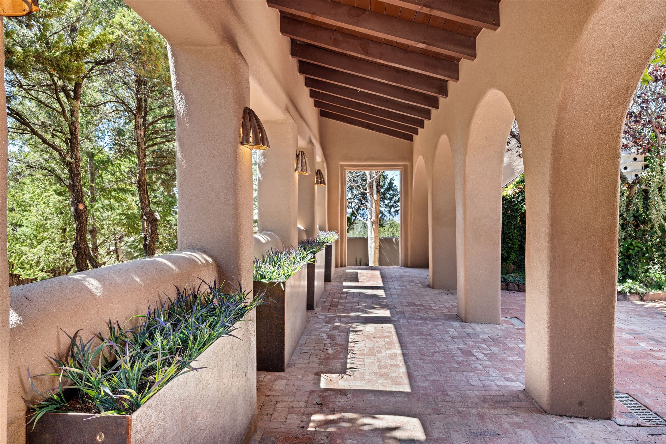 Have you dreamed of living in a true, classic Santa Fe Style Buzz Bainbridge ADOBE Hacienda? (If you know his work you have!) This 5 bedroom/7 bath masterpiece has had a facelift and is now totally reimagined with an updated floor plan and fresh new ambiance while honoring the great Bainbridge bones; extravagant ceiling finishes, generous rooms, thoughtful infrastructure and 30" DOUBLE ADOBE walls. Glamorous yet livable, this rambling estate with gorgeous architecture on 2.5 private, wooded view acres offers spectacular entertaining amid smashing mountain views and total, gated privacy! It has been home to many a sunset fiesta, Town & Country brunch, jaw dropping wedding, plus noteworthy spectacular parties. Brilliantly conceived by the legendary master builder Buzz Bainbridge this is the entertainers ultimate dream inside and out with oversized rooms, breezy wrap around covered flagstone portals with magnificent mountain views, romantic courtyards, airy patios out nearly every room, amid lush gardens, pinons and lofty aspen. Fireplaces inside and out-7 of them! The central, custom, chef's kitchen is efficient and stylish with Wolf and Sub-Zero appliances and custom cabinetry by Jonathan Boyd. The sumptuous primary suite is a hedonist's dream - with Sangre de Cristo views from your bed, and bathtub in the palatial new marble master bath. There are 4 large, comfortable guest suites as well, each with new bath; plus an impressive library/ media room and a third cozy central sitting room. Located on prestigious Calle San Martin, it is 7-10 minutes to downtown. No HOA. Nice neighbors. Fabulous property! This Hacienda has it all!