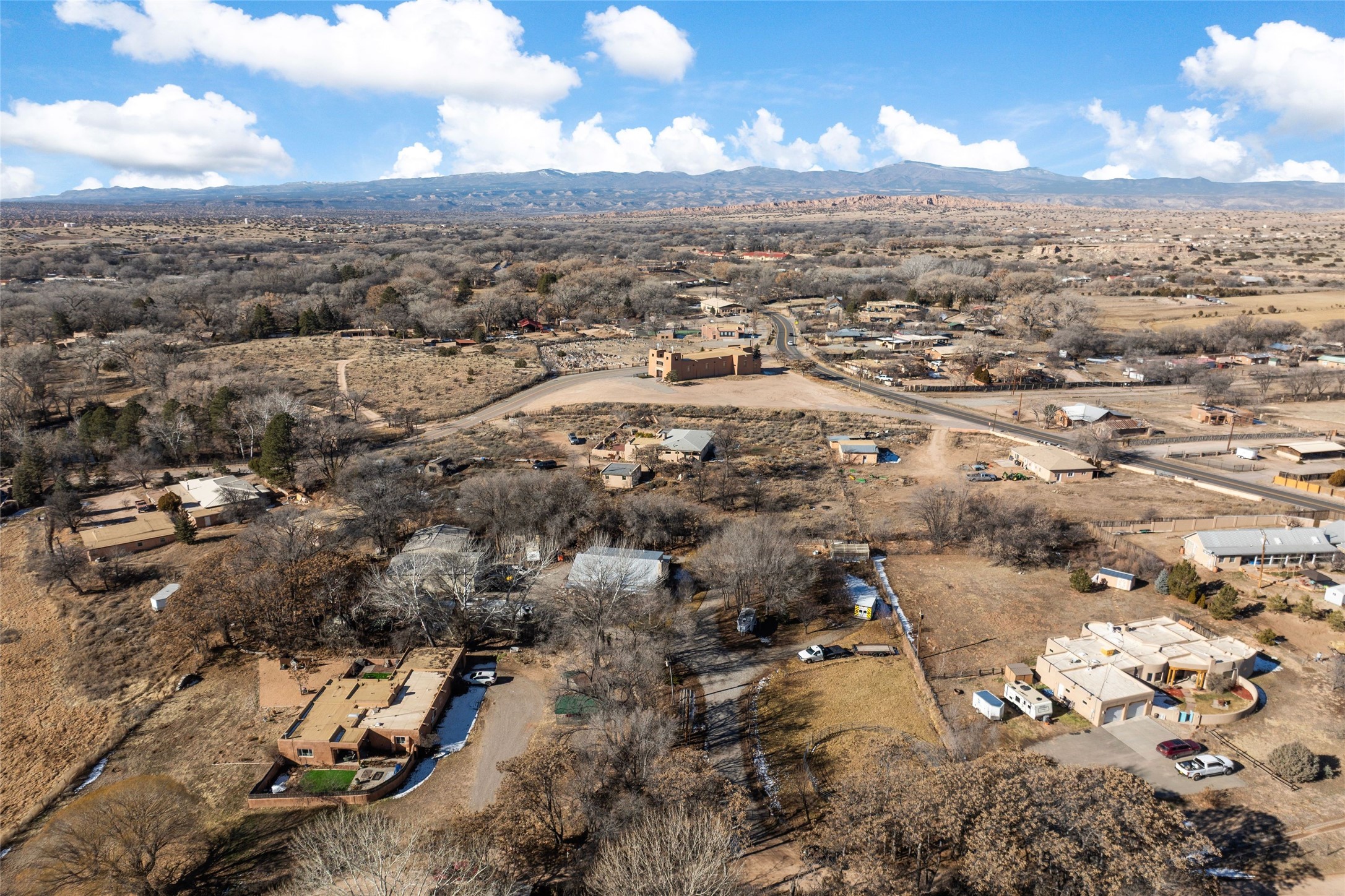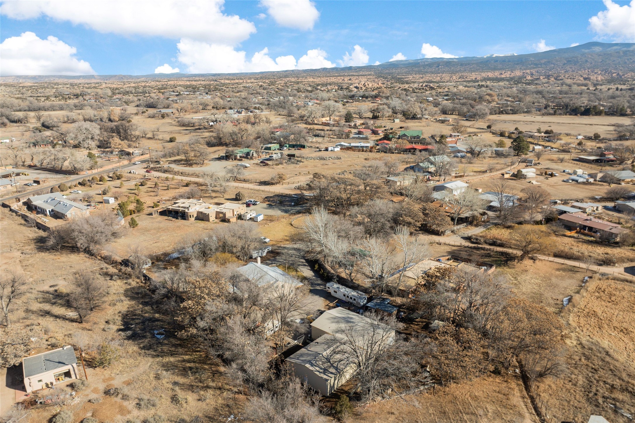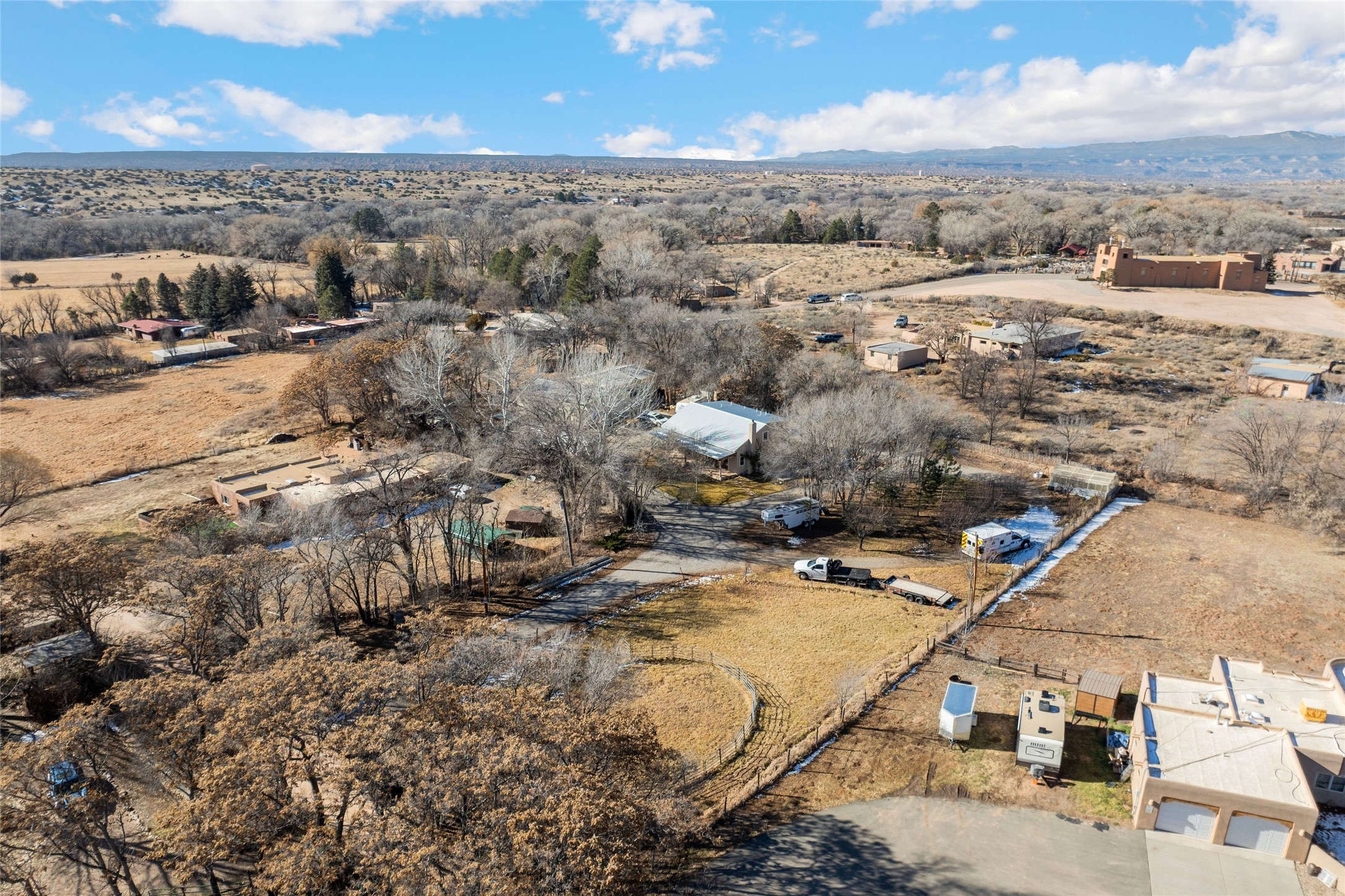 This rare Santa Fe County (Namb area), fenced horse property has water rights, mountain views, lots of shade trees, a barn, a shop, and a greenhouse. Situated on 1.389 lush, irrigated and fenced acres, this 3-bedroom, 2-bath, custom northern NM style home offers 2,196 sq ft with refrigerated-air, HVAC, ceiling fans, vaulted pine ceilings, exposed vigas, solid ash hardwood floors,and a spacious loft for hobbies or relaxing. Open living area features high-efficiency Acucraft wood-burning fireplace insert. Kitchen includes granite countertops, island, custom cabinets with pull-out shelving, wine storage, and quality appliances. Primary suite offers walk-in closets, spa-style bath with air-jetted tub, and natural travertine tile. Private guest suite includes separate exterior entrance and ensuite bath with travertine tile and cave horse art accent tiles by a local artist. Outdoor living features flagstone portals and walkways, ceiling fan, 1620 Trex deck, patio with fire pit, mature landscaping with drip irrigation, fruit trees, 1220 greenhouse, raised-bed garden, solar-powered gate, perimeter fencing (partial latilla), RV trailer parking and horse trailer parking. Horse amenities include grassy fenced turnout, 3035 three/four stall barn with partially insulated feed/tack room, huge area for hay storage, large corral, and ability to ride out from the property on shady trails (also Bureau of Land Management access within 3 miles). The 3045 metal building "dream shop" features three roll-up doors, reinforced slab for heavy-duty car lift installation, 110V and 220V electricity, workbench with lower shelf, generous fluorescent lighting, and two overhead piping systems (shop vacuum and compressor). All of this plus deeded acequia water rights and a private well. This unique offering--just off the High Road to Taos--is set against beautiful views of Sacred Heart Church, Santa Fe Ski Basin, and Santa Fe Baldy, just minutes from Pojoaque and an easy drive to Santa Fe and Los Alamos. Bring all of your animals, and move right in! Come visit and you will want to stay forever!