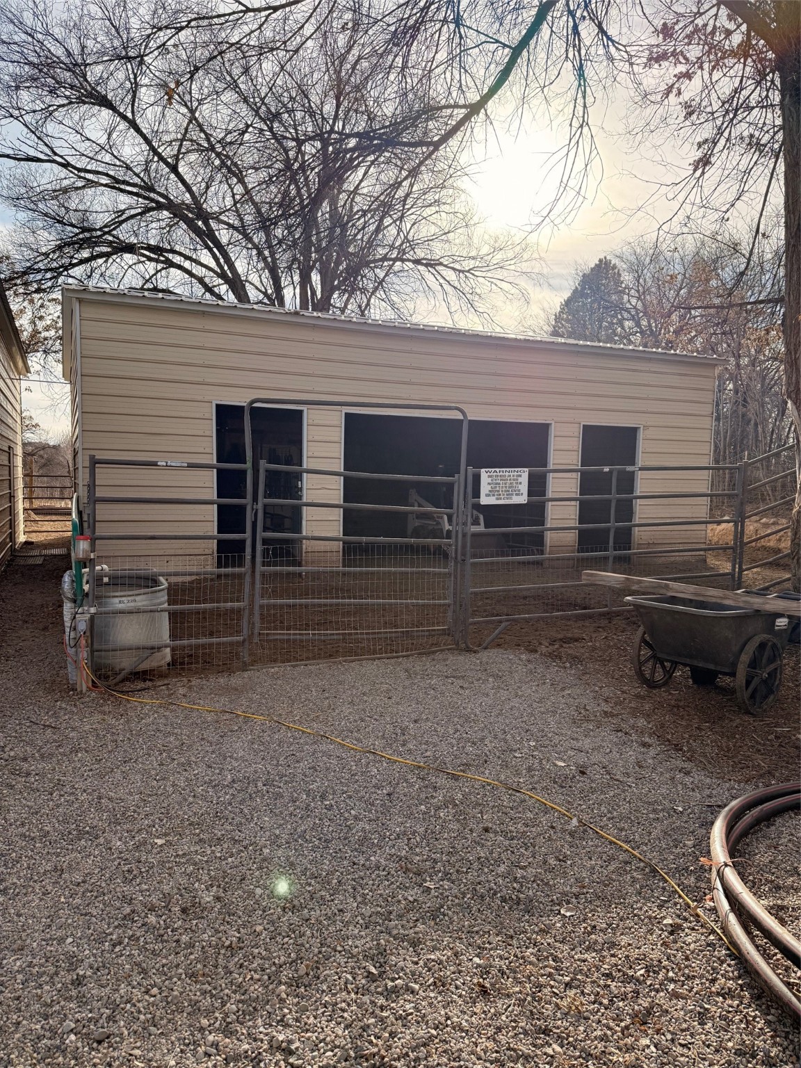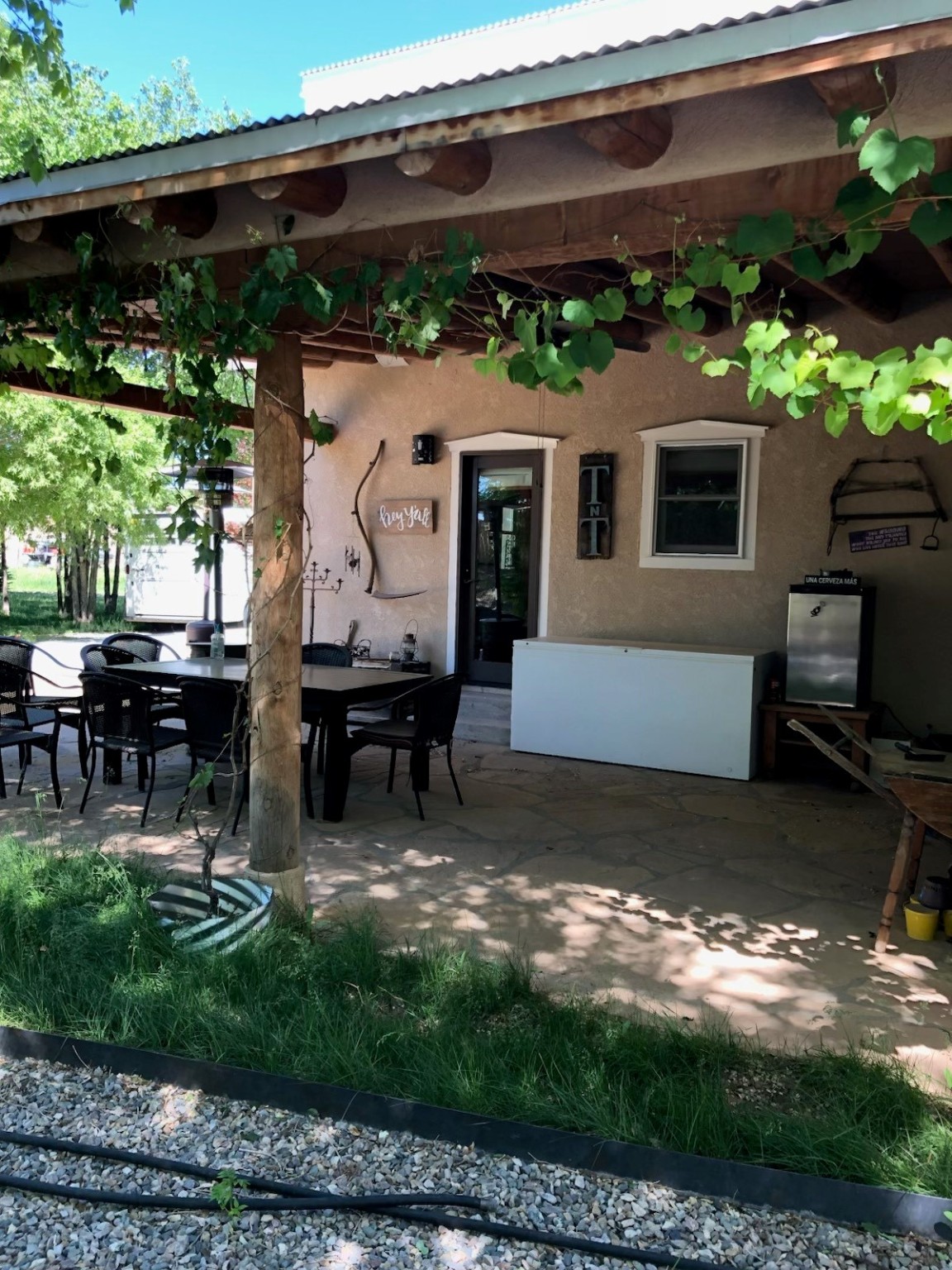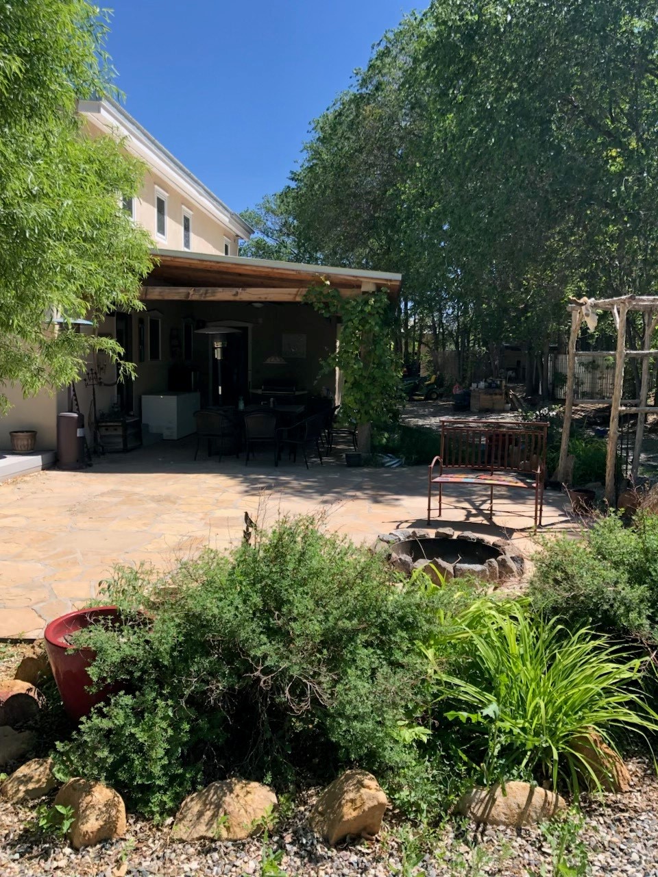 This rare Santa Fe County (Namb area), fenced horse property has water rights, mountain views, lots of shade trees, a barn, a shop, and a greenhouse. Situated on 1.389 lush, irrigated and fenced acres, this 3-bedroom, 2-bath, custom northern NM style home offers 2,196 sq ft with refrigerated-air, HVAC, ceiling fans, vaulted pine ceilings, exposed vigas, solid ash hardwood floors,and a spacious loft for hobbies or relaxing. Open living area features high-efficiency Acucraft wood-burning fireplace insert. Kitchen includes granite countertops, island, custom cabinets with pull-out shelving, wine storage, and quality appliances. Primary suite offers walk-in closets, spa-style bath with air-jetted tub, and natural travertine tile. Private guest suite includes separate exterior entrance and ensuite bath with travertine tile and cave horse art accent tiles by a local artist. Outdoor living features flagstone portals and walkways, ceiling fan, 1620 Trex deck, patio with fire pit, mature landscaping with drip irrigation, fruit trees, 1220 greenhouse, raised-bed garden, solar-powered gate, perimeter fencing (partial latilla), RV trailer parking and horse trailer parking. Horse amenities include grassy fenced turnout, 3035 three/four stall barn with partially insulated feed/tack room, huge area for hay storage, large corral, and ability to ride out from the property on shady trails (also Bureau of Land Management access within 3 miles). The 3045 metal building "dream shop" features three roll-up doors, reinforced slab for heavy-duty car lift installation, 110V and 220V electricity, workbench with lower shelf, generous fluorescent lighting, and two overhead piping systems (shop vacuum and compressor). All of this plus deeded acequia water rights and a private well. This unique offering--just off the High Road to Taos--is set against beautiful views of Sacred Heart Church, Santa Fe Ski Basin, and Santa Fe Baldy, just minutes from Pojoaque and an easy drive to Santa Fe and Los Alamos. Bring all of your animals, and move right in! Come visit and you will want to stay forever!