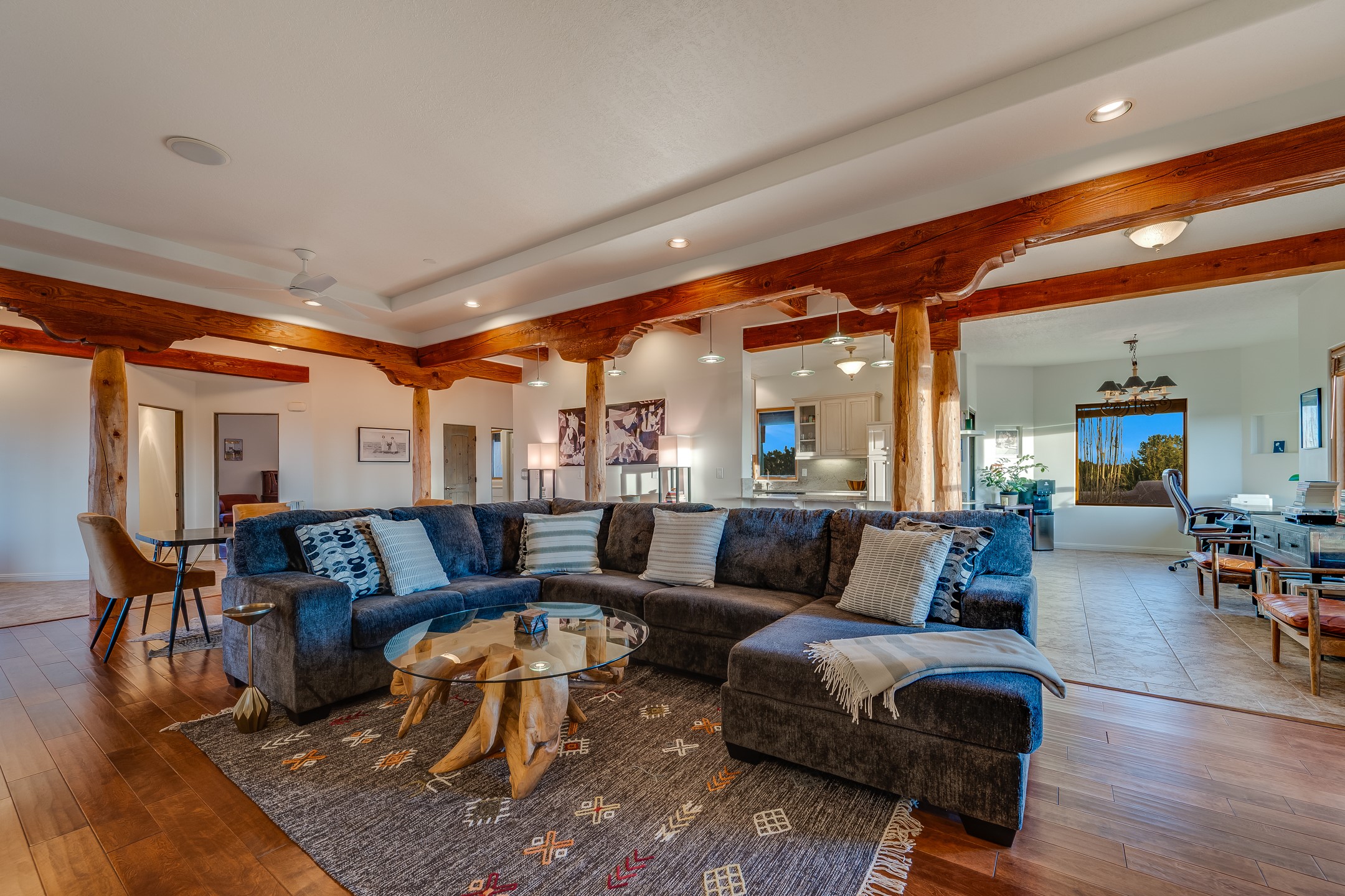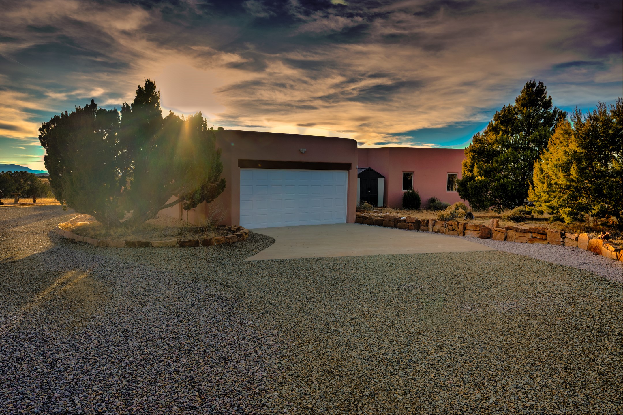 This spacious light view filled home offers a great value! Through the gated entry and into an extraordinarily captivating entrance this home feels like it is miles from everyone and yet it's within the neighborhood. Just a few minutes drive to Las Campanas and another few minutes to 599. This location is ideal for Living in style in the Northwest aea of Santa Fe.Each bedroom has views, natural light, access to the outside portals and ensuite baths. The natural minimalist landscaping is easy to maintain attractive from outside areaa, there is hard wiring lighting to the trees and irrigation.in addition why not have a party, there's plenty of within the grounds parking as well as a detached carport replete with Vegas and a propanel roof perfect for your recreational vehicles. There is also an attached two-car garage that is finished inside.Two fireplaces, Excellent storage and all the amenities one would expect can be yours. This is move-in ready.
