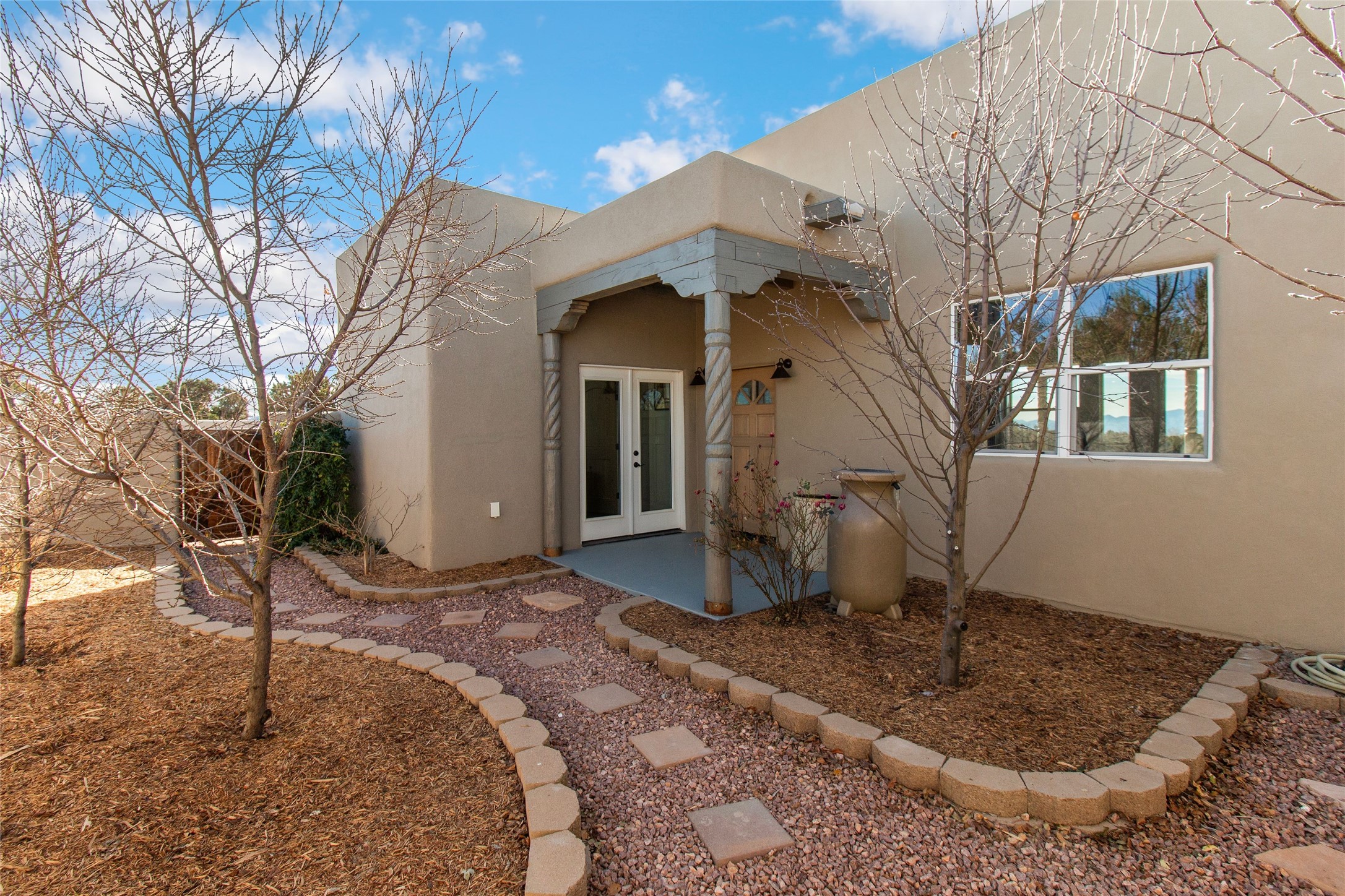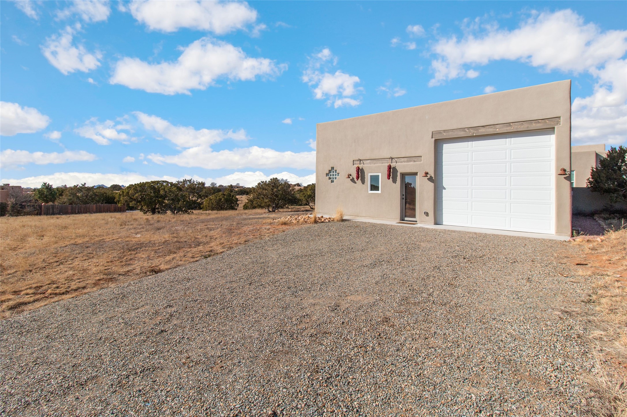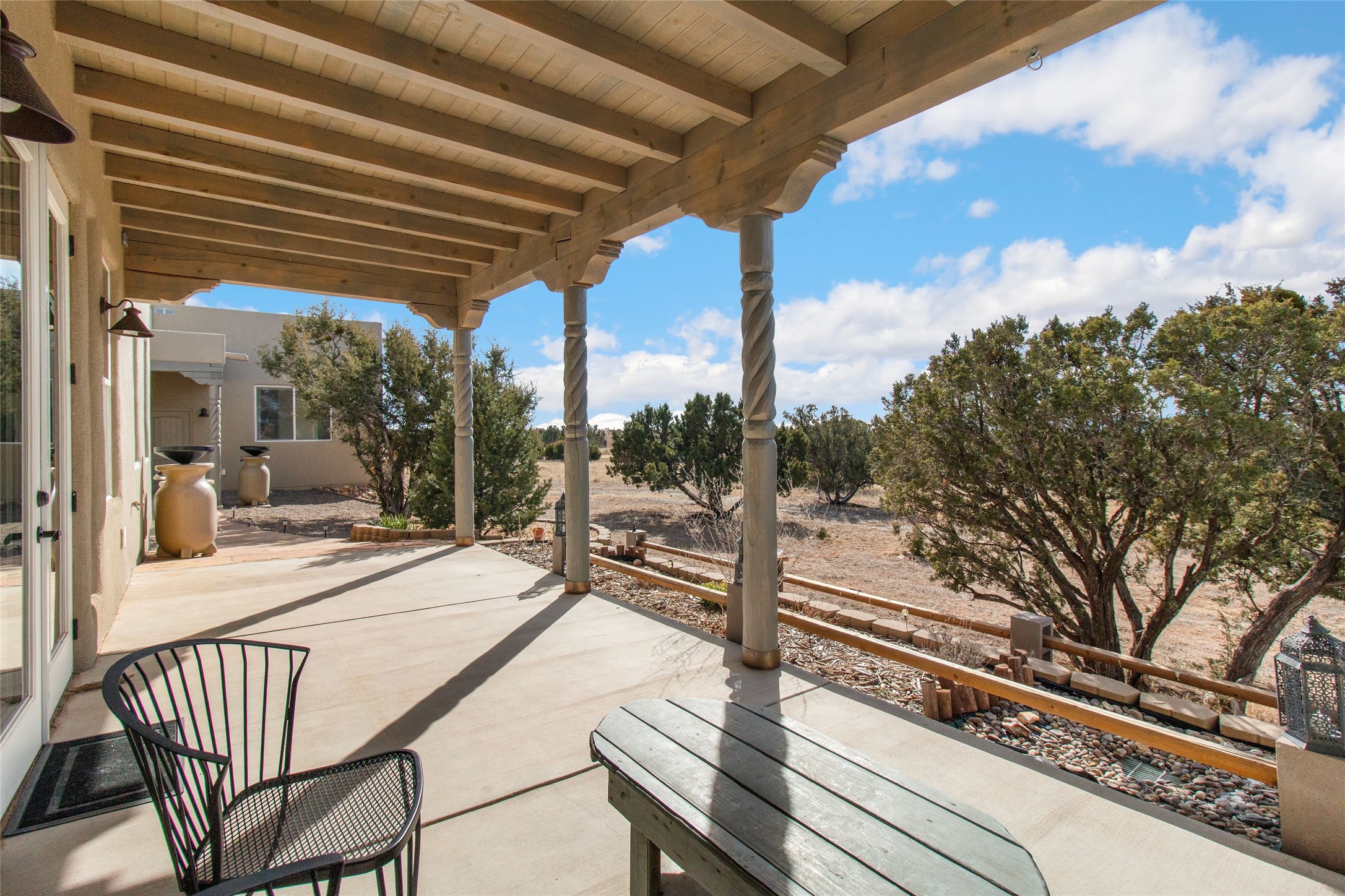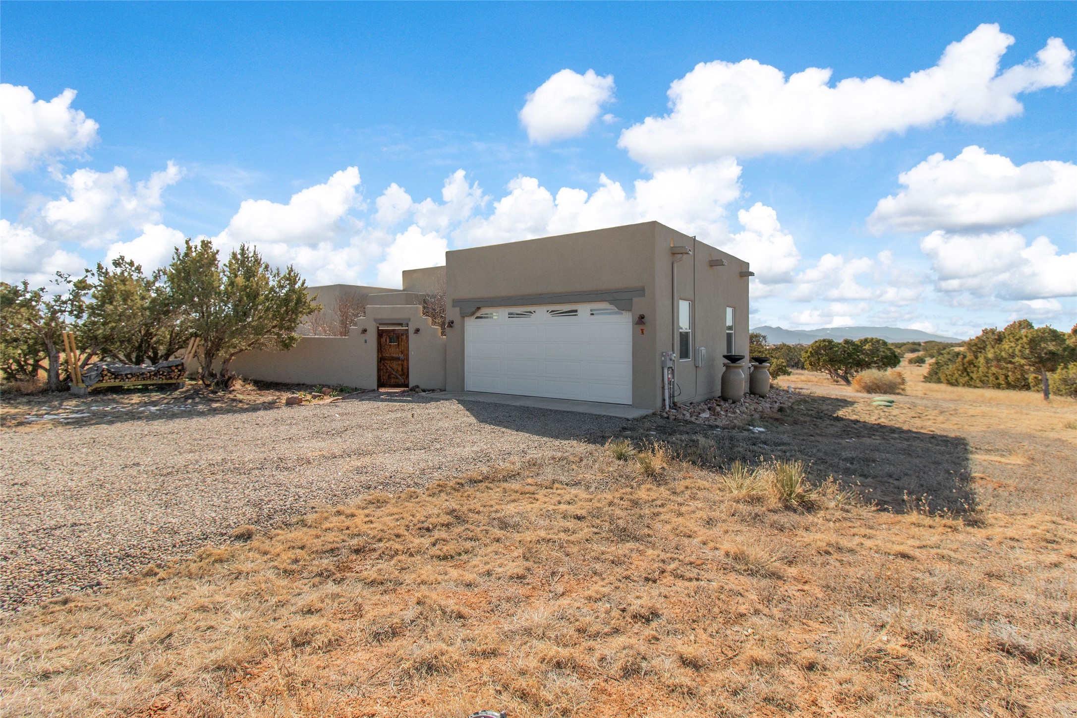 Pride of ownership is apparent the minute you walk into this exceptional 2019 contemporary build in Eldorado. Upon entry into the front court yard, you are greeted by apple, peach and cherry trees. The main house offers 3 bedrooms, 2 baths and open living concept with a split bedroom configuration for owner and guest privacy. Stunning views from the living room and back portal await you on this 1.4 acres. This home was built for energy efficiency as a priority with a HERS rating of 70. A solar panel system attached to the grid was added to the home in 2024 for ultra low electric bills. A Hearthstone Green Mountain convection wood stove takes the chill off those really cold winter evenings. An annually serviced tankless water heater ensures you never run out of hot water. Central cooling and heating. A detached one bedroom casita with a 3/4 quarters bathroom is perfect for guests or an in-law suite, plus an adjacent RV garage. For all the amenities available to homeowners in Eldorado, check out www.eldoradosf.org