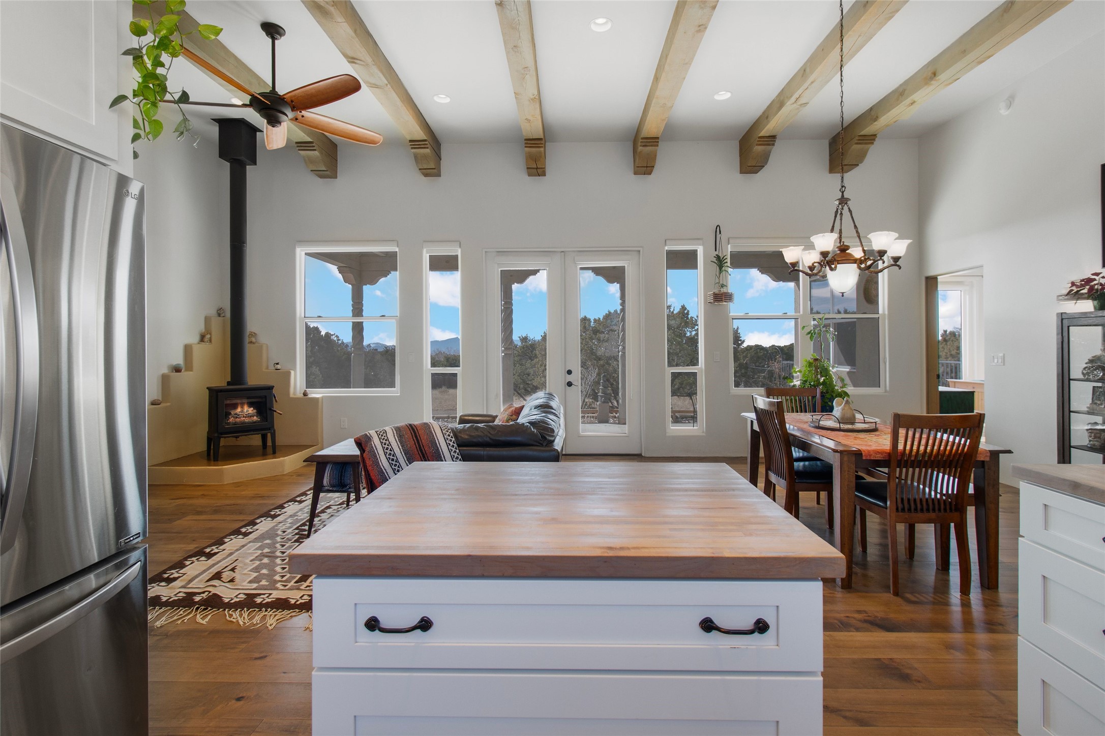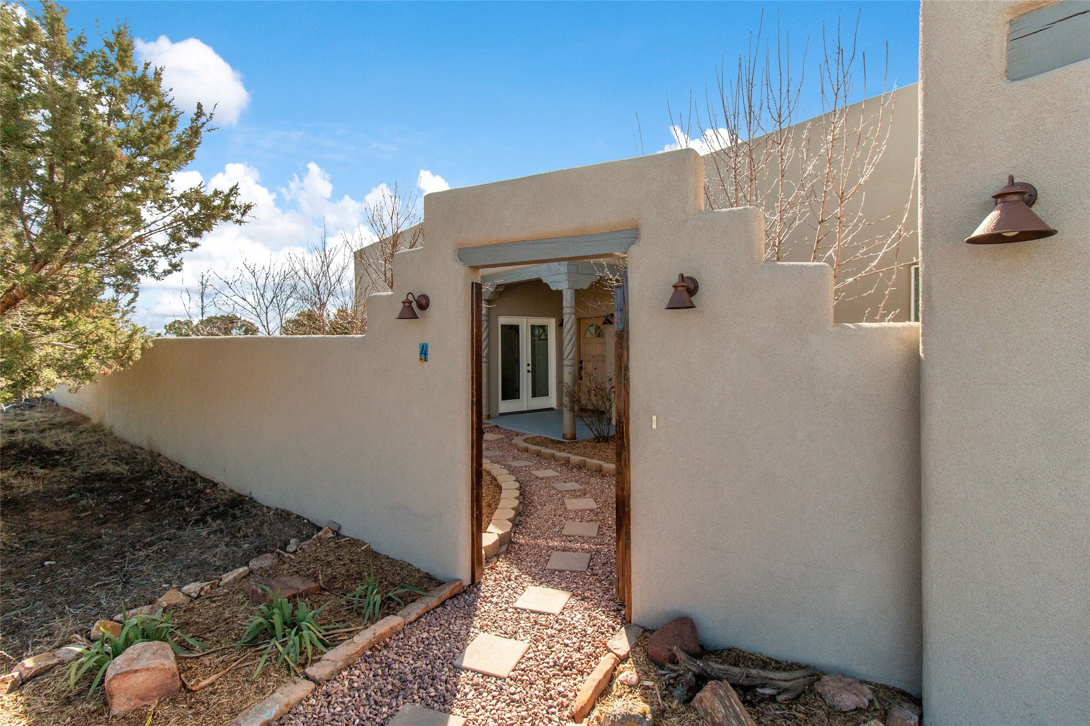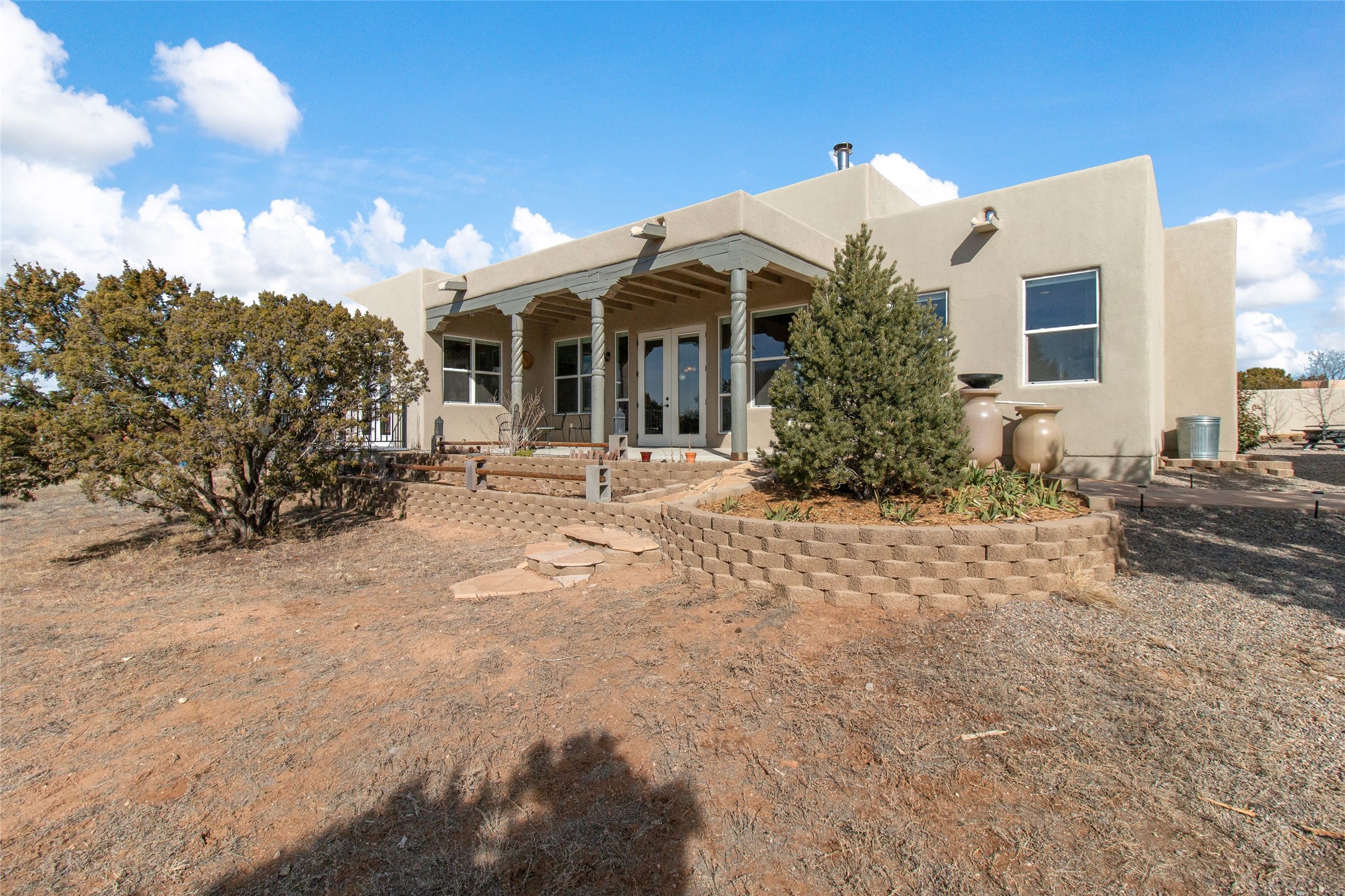 Pride of ownership is apparent the minute you walk into this exceptional 2019 contemporary build in Eldorado. Upon entry into the front court yard, you are greeted by apple, peach and cherry trees. The main house offers 3 bedrooms, 2 baths and open living concept with a split bedroom configuration for owner and guest privacy. Stunning views from the living room and back portal await you on this 1.4 acres. This home was built for energy efficiency as a priority with a HERS rating of 70. A solar panel system attached to the grid was added to the home in 2024 for ultra low electric bills. A Hearthstone Green Mountain convection wood stove takes the chill off those really cold winter evenings. An annually serviced tankless water heater ensures you never run out of hot water. Central cooling and heating. A detached one bedroom casita with a 3/4 quarters bathroom is perfect for guests or an in-law suite, plus an adjacent RV garage. For all the amenities available to homeowners in Eldorado, check out www.eldoradosf.org