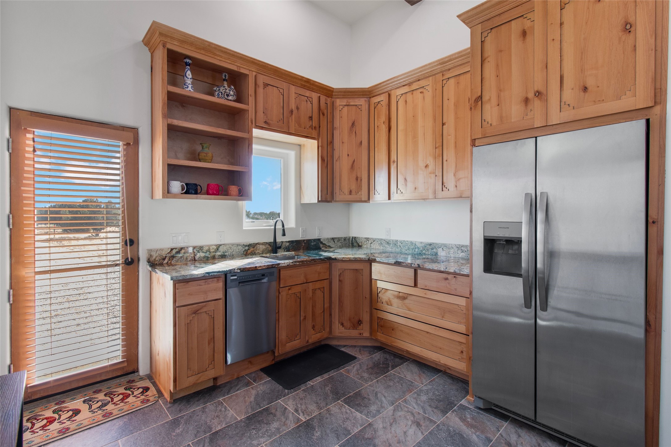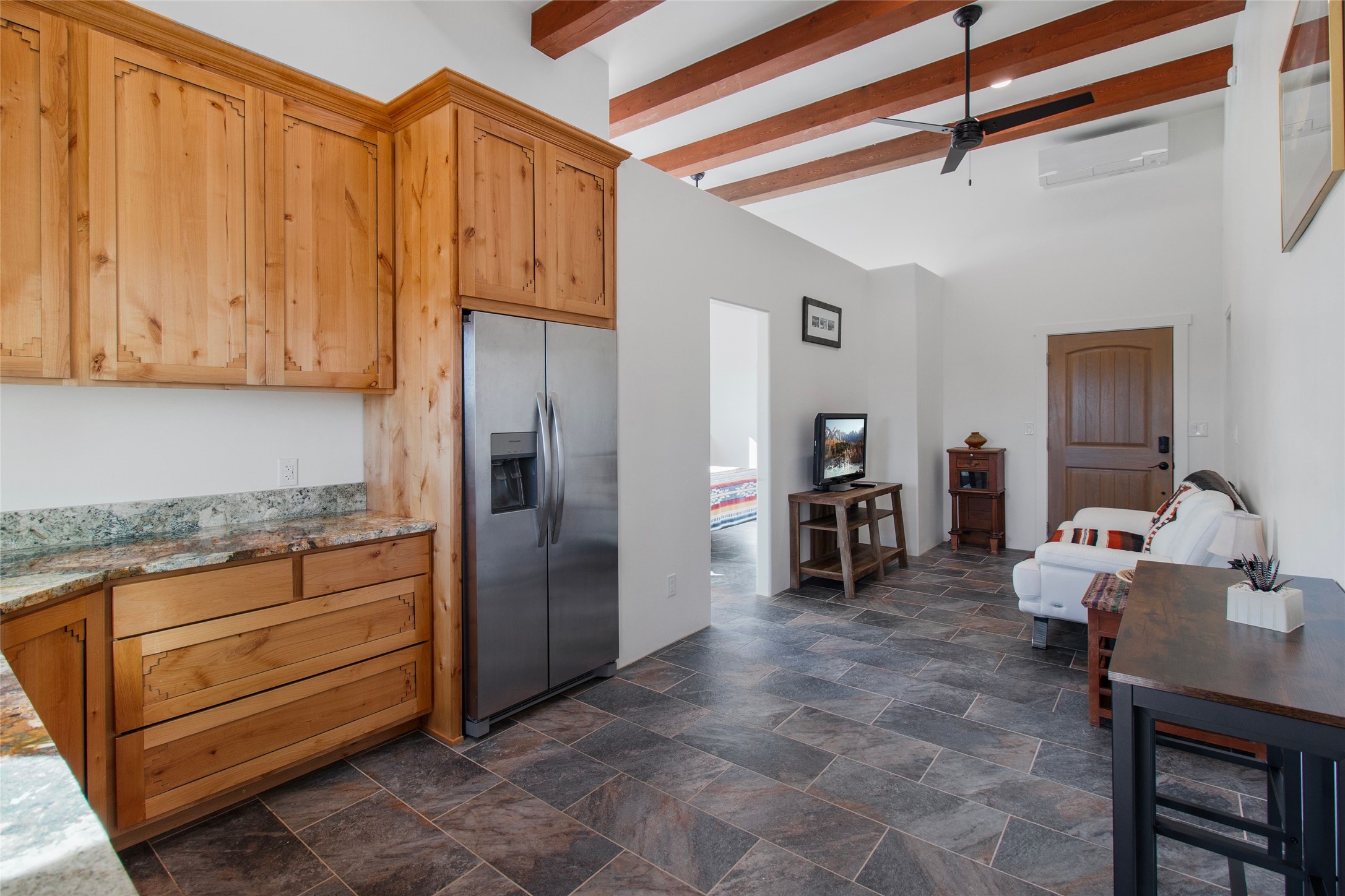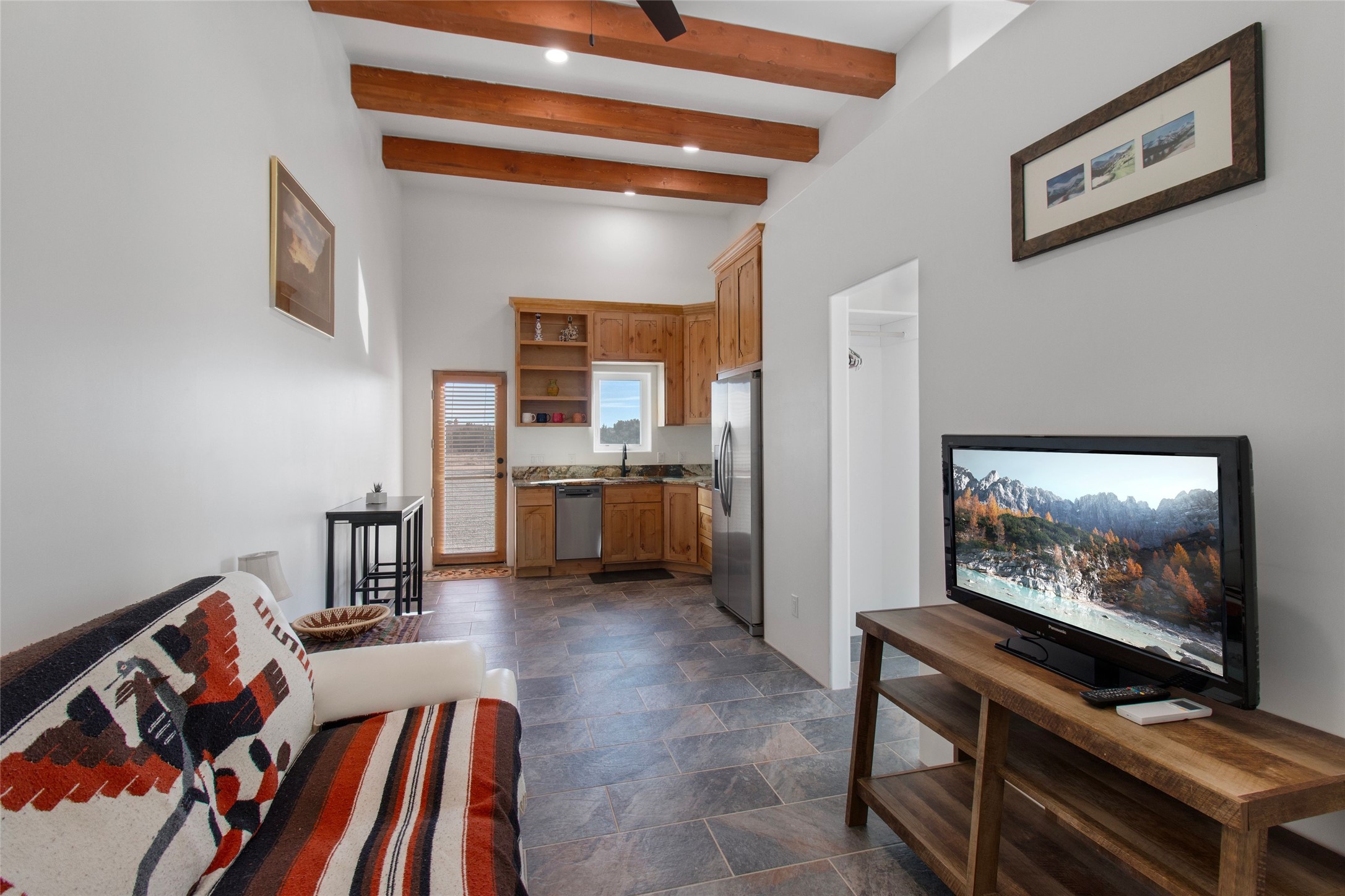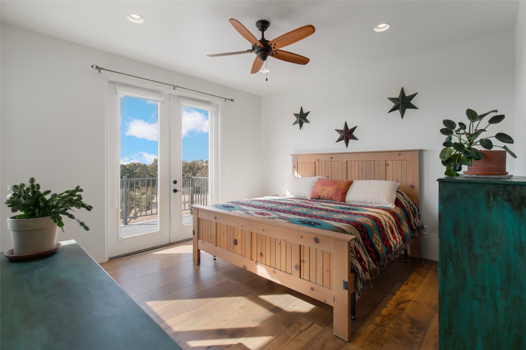 Pride of ownership is apparent the minute you walk into this exceptional 2019 contemporary build in Eldorado. Upon entry into the front court yard, you are greeted by apple, peach and cherry trees. The main house offers 3 bedrooms, 2 baths and open living concept with a split bedroom configuration for owner and guest privacy. Stunning views from the living room and back portal await you on this 1.4 acres. This home was built for energy efficiency as a priority with a HERS rating of 70. A solar panel system attached to the grid was added to the home in 2024 for ultra low electric bills. A Hearthstone Green Mountain convection wood stove takes the chill off those really cold winter evenings. An annually serviced tankless water heater ensures you never run out of hot water. Central cooling and heating. A detached one bedroom casita with a 3/4 quarters bathroom is perfect for guests or an in-law suite, plus an adjacent RV garage. For all the amenities available to homeowners in Eldorado, check out www.eldoradosf.org