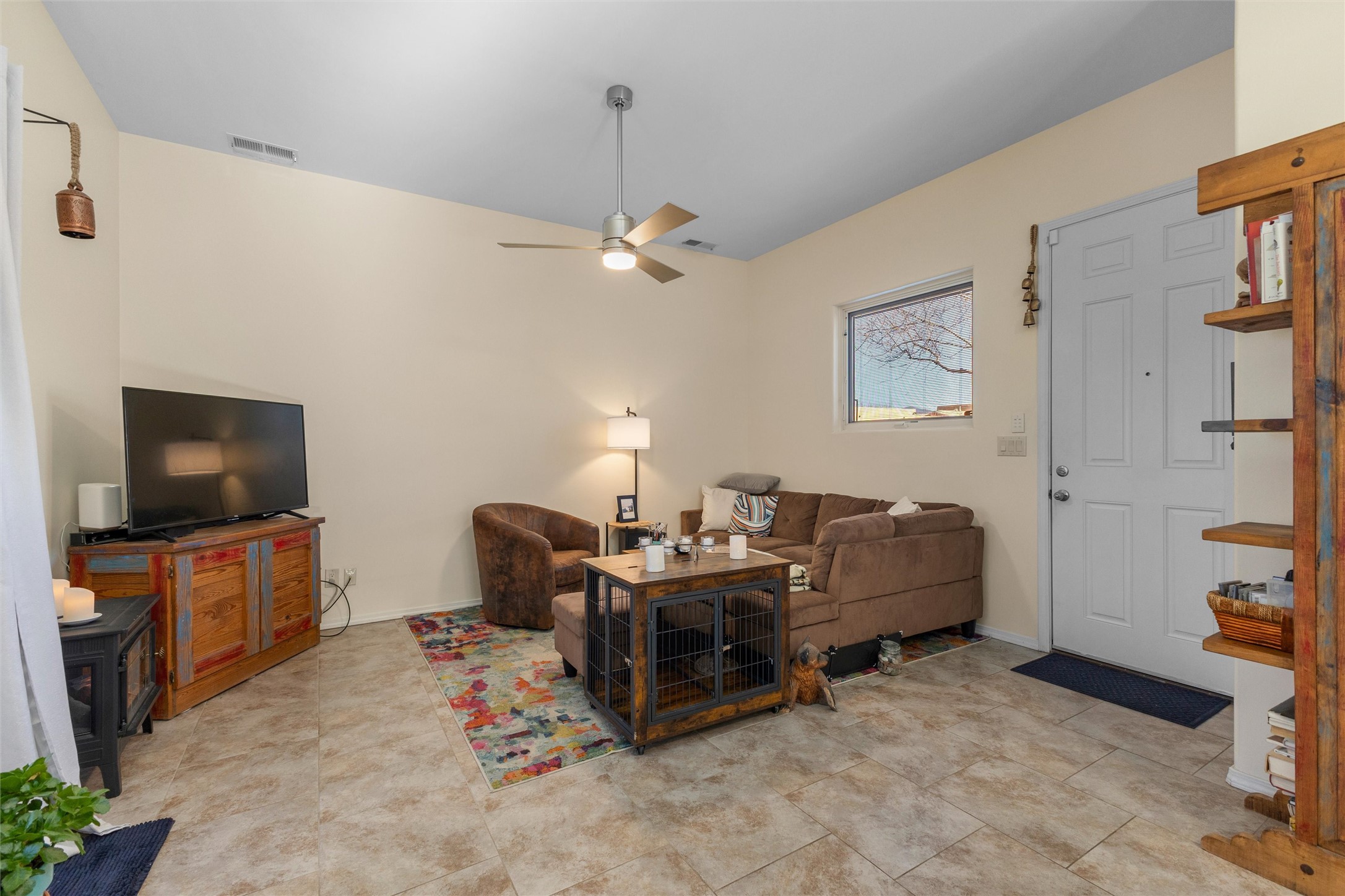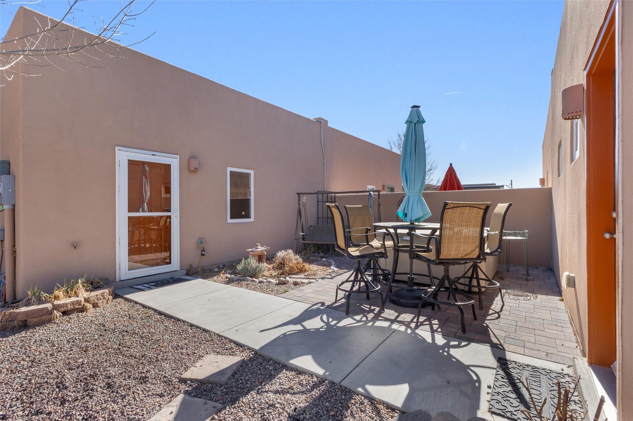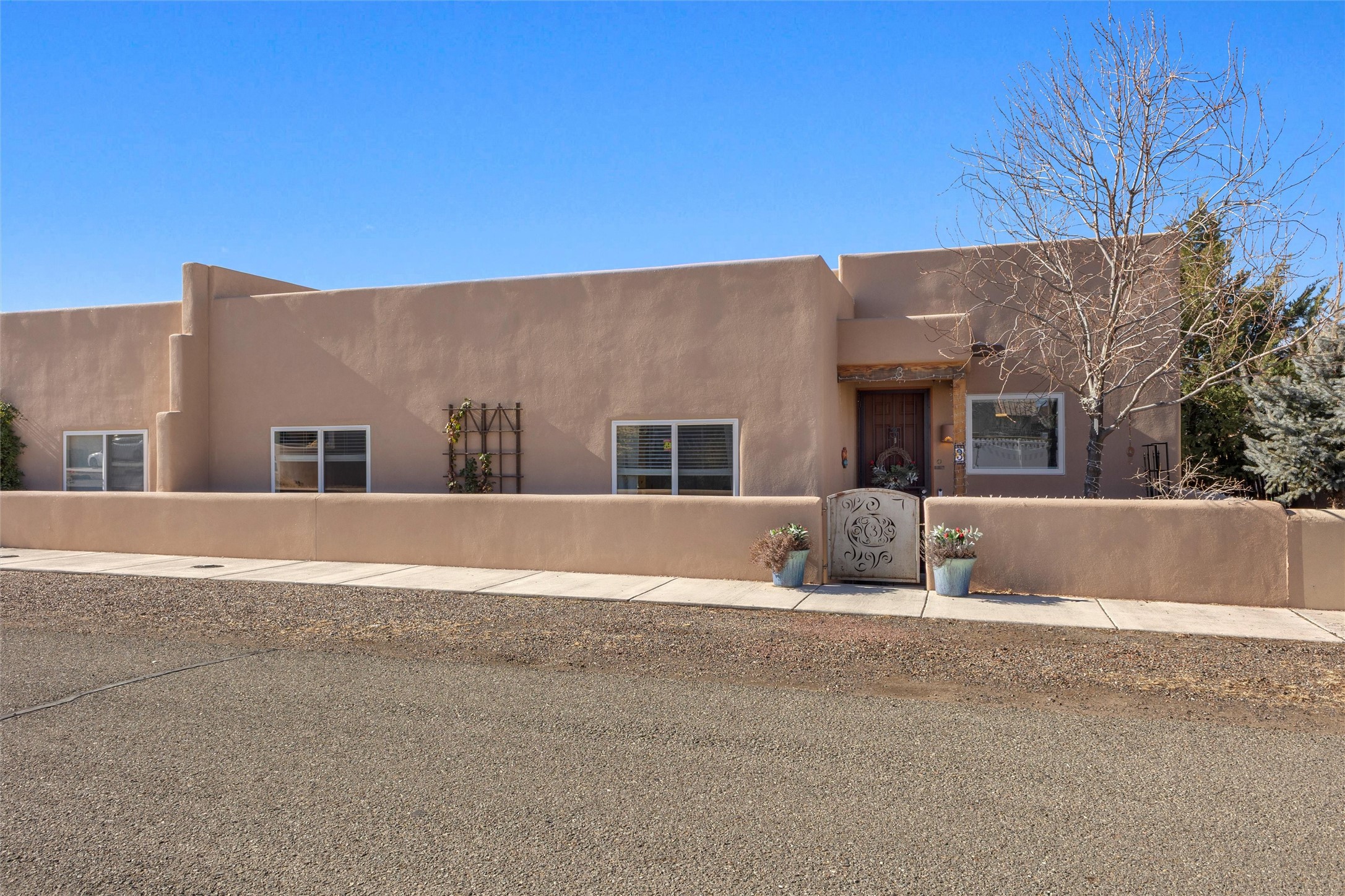 WAKE UP TO SWEEPING MOUNTAIN VIEWS FRONT AND BACK AND END EACH DAY WITH A GOLDEN SANTA FE SUNSET FROM YOUR PORTAL. This 3 bedroom, 2 bath Oshara Village townhouse pairs quality construction with Anderson windows and a TANKLESS water heater plus a modern design with a smart layout that separates the peaceful primary suite from the other bedrooms. Tile floors ground the living spaces, bedrooms are softly carpeted, and a galley kitchen with adjacent dining makes everyday living effortless. A beautiful sitting area overlooks a courtyard, while the xeriscaped backyard and lovely porch invite quiet mornings and serene evenings. Enjoy a walk in closet, double sinks, tiled shower, detached 2-car garage, AND hookup to graywater to water plants! Near Oshara Village Park and minutes to the Plaza via Richards or Rabbit, with favorites like Pantry Dos nearby! This is it! Call today!