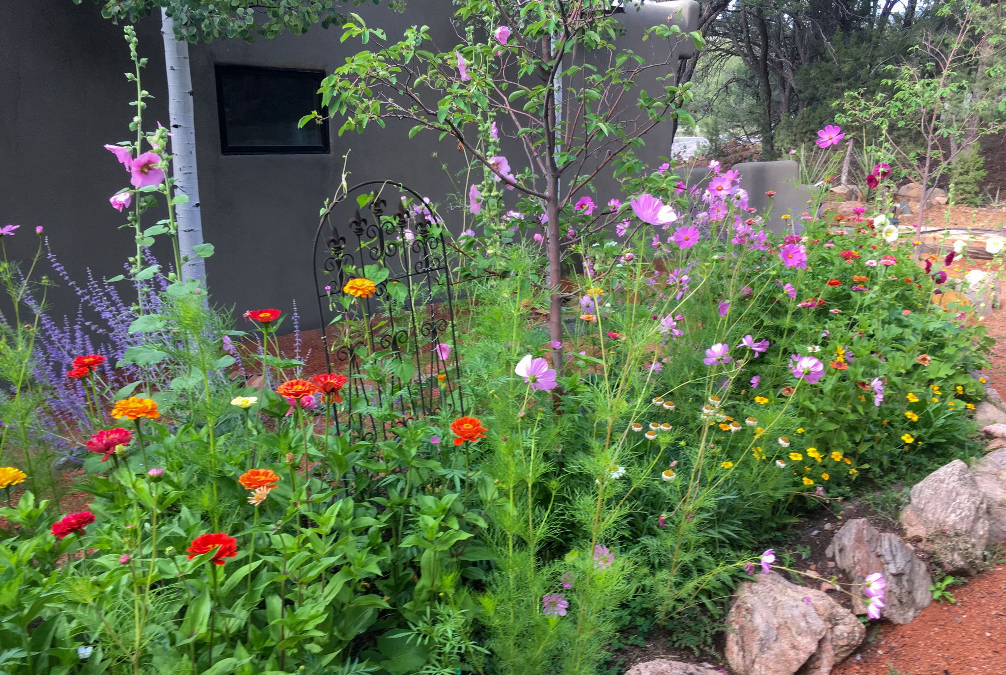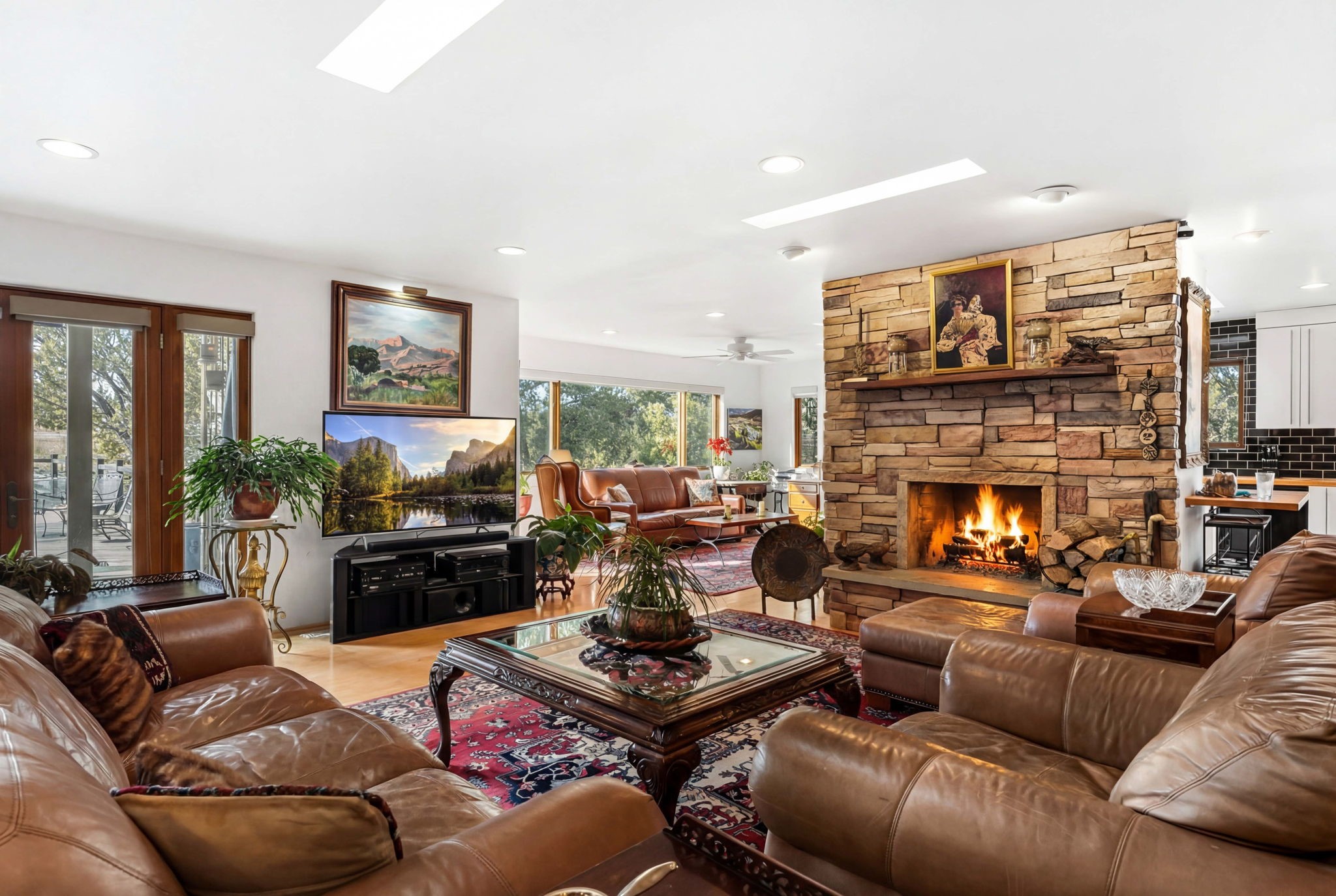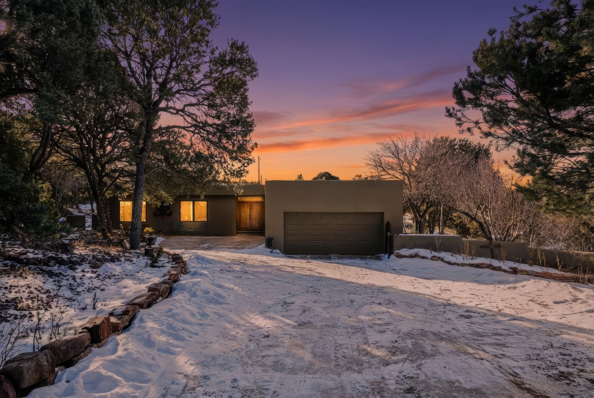 Light and Sky - where Santa Fe light meets endless sky, this enchanting 3 BR / 2BA single-level home reveals itself with effortless elegance. Set on apx 2.14 acres and offering apx 2,600 sqft of luminous living, it is a sanctuary of quiet refinement - rooms that welcome the day, frame the horizon, and inspire reflection and imagination. Warm and gracious, this home was designed to be lived in, admired, and remembered. Expansive windows and skylights draw abundant sunlight inward, illuminating blonde wood floors and interiors anchored by a sculptural stacked-stone fireplace. The living spaces embrace light and landscape with subtlety and sophistication, offering a calm serenity while effortlessly accommodating small and large gatherings. Outdoors, a generous entertaining deck extends the living space beneath vast skies. A manicured grass lawn, mature trees, and thoughtfully planted gardens create a private setting. There are abundant pinon trees, aspens, Japanese maples, and fruit trees, including apricot, pear, and apple. Also, annuals and perennials of Shasta daisies, hollyhocks, cosmos, iris, morning glories, a variety of roses and Russian sage. An ancillary structure provides for versatility - ideal as a private office, yoga or fitness studio, artist's atelier, or intimate library. An efficient HVAC system provides comfort year-round for heat and refrigerated air-conditioning. There is also an attached two-car garage. Moments from Harry's Roadhouse, El Gancho, nearby amenities and shopping with easy access to I-25, the home offers serene privacy while remaining effortlessly suited for entertaining. More than a residence, this is a home of quiet distinction, reflecting a lifestyle of beauty and serenity.