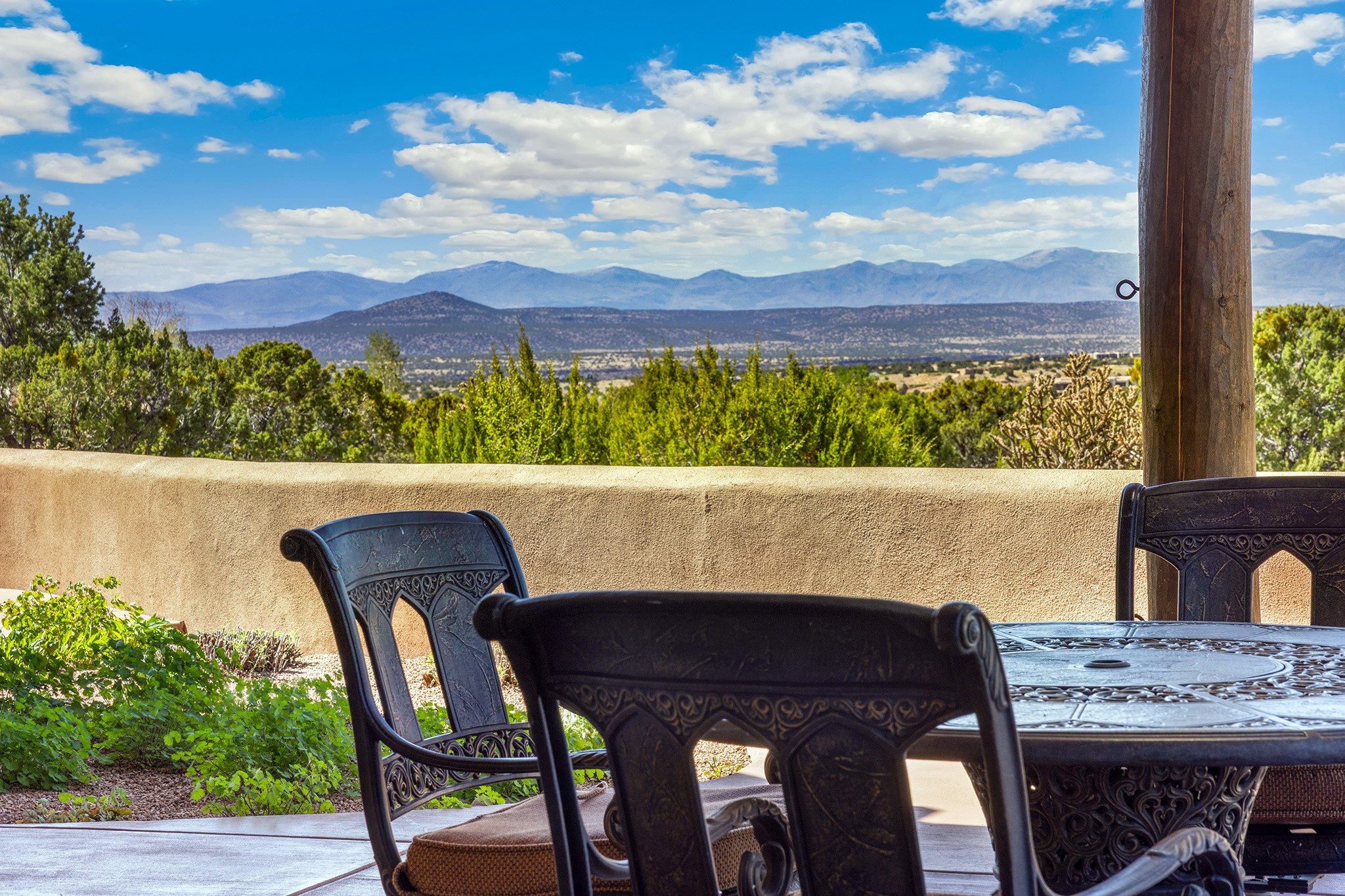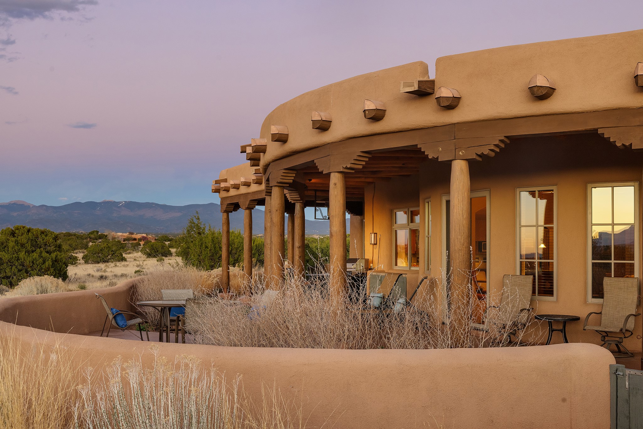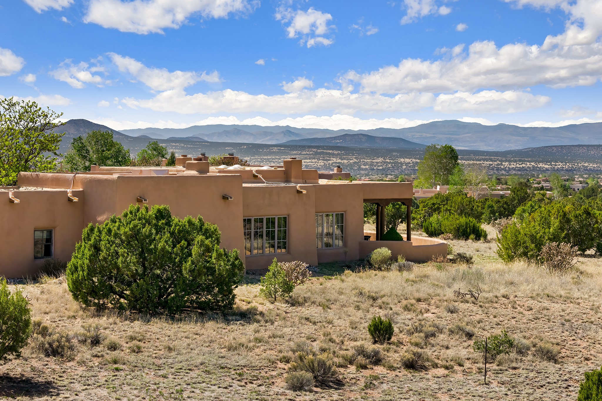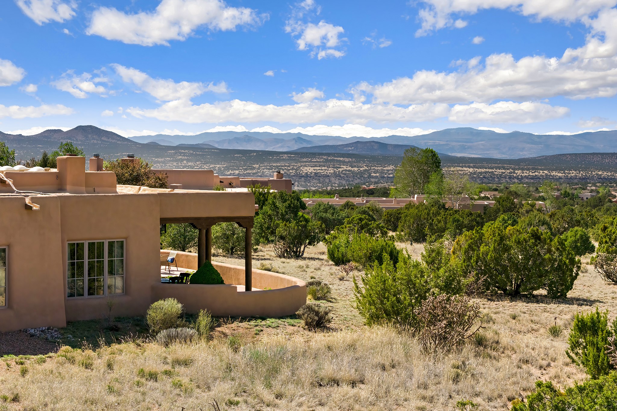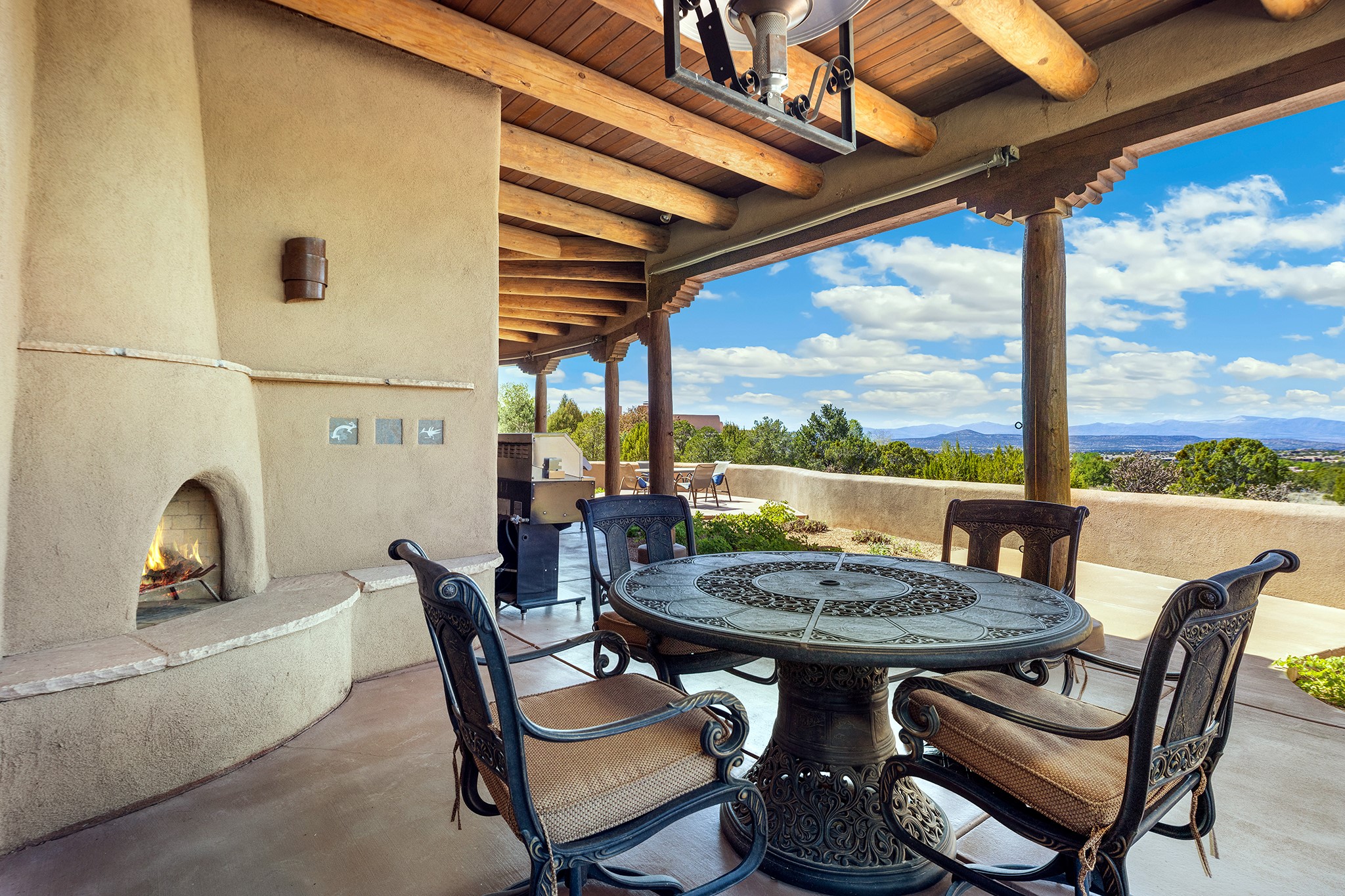 Panoramic views of the Jemez and Sangre de Cristo Mountains set the stage for this beautifully composed 3,833 sq. ft. residence on 2.67 acres in Las Campanas. As you enter the tree-filled front courtyard, a sense of quiet elegance unfolds--an immediate feeling of calm, privacy, and thoughtful design.The entry opens into a formal living room, where vigas fan gracefully toward the horizon, drawing the eye outward to the ever-changing mountain landscape. Just beyond, the dining room opens through glass doors to an expansive covered portal--nearly 1,000 sq. ft.--designed for seamless indoor-outdoor living. An outdoor fireplace and heater create an inviting setting for dining and gathering beneath Santa Fe's vast skies.Arched passageways lead into a striking kitchen and living space, where sculptural curves and a commanding kiva fireplace anchor the room. Granite countertops, stainless steel appliances, double ovens, and a 6-burner gas cooktop are complemented by a generous island with prep sink. A built-in banco offers a quintessential Southwestern moment--casual, intimate, and always oriented toward the view.The primary suite is a private retreat, opening to the portal and framed by breathtaking vistas. Its bath is equally serene, with dual vanities, a soaking tub, and a walk-in shower. A thoughtfully separated guest wing offers two spacious bedrooms, each enjoying its own connection to the surrounding landscape. Even the laundry room captures a quiet view of the front courtyard.Additional features include an 850 sq. ft. three-car garage, radiant in-floor heat, mini-split cooling, new stucco (2021), and a new $120K foam roof to be completed prior to closing.Set on 2.67 acres within Las Campanas, 81 Calle Ventoso W offers a rare opportunity to live immersed in light, landscape, and the timeless beauty of Santa Fe--where every moment is shaped by sky, horizon, and home.