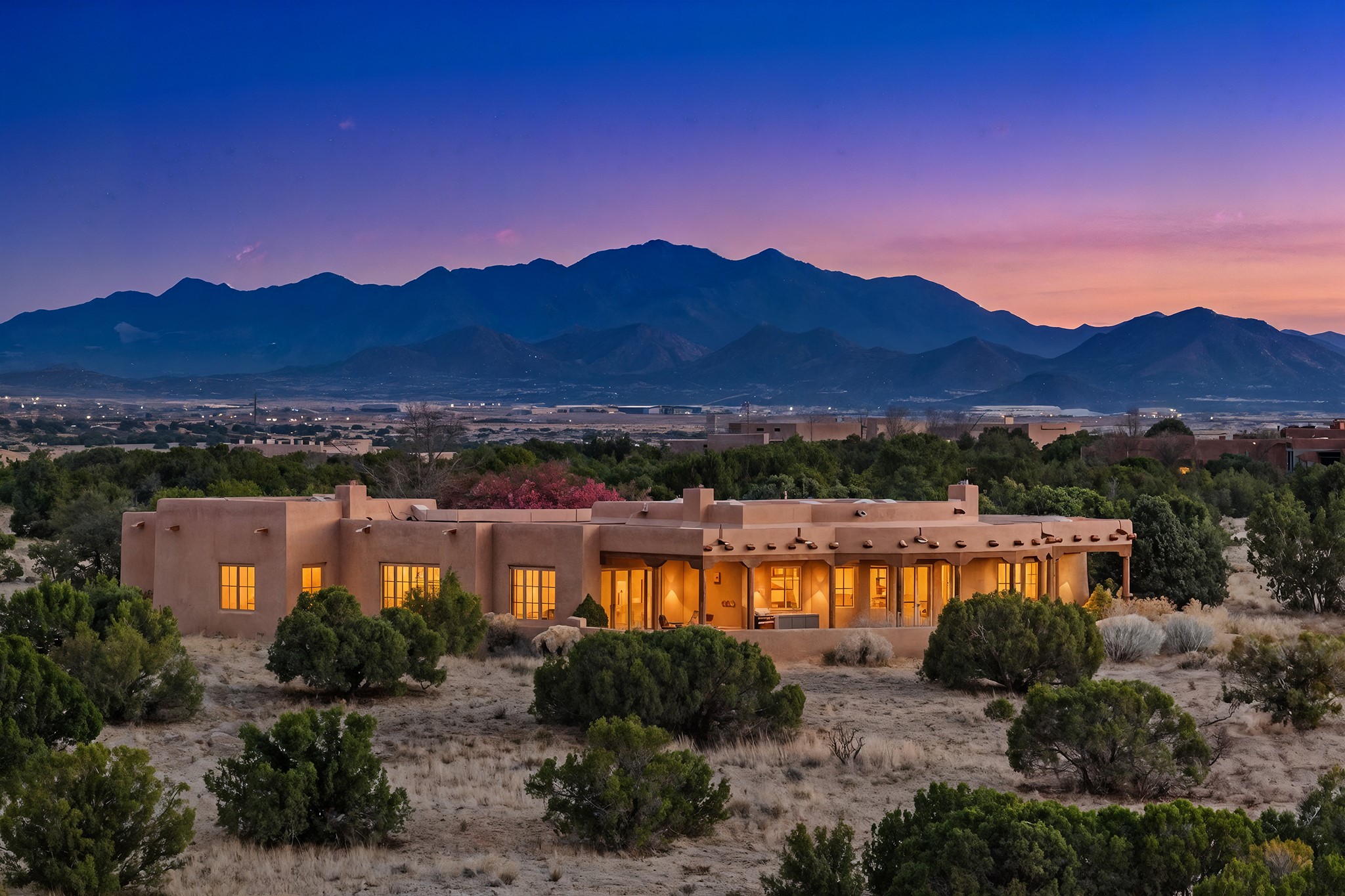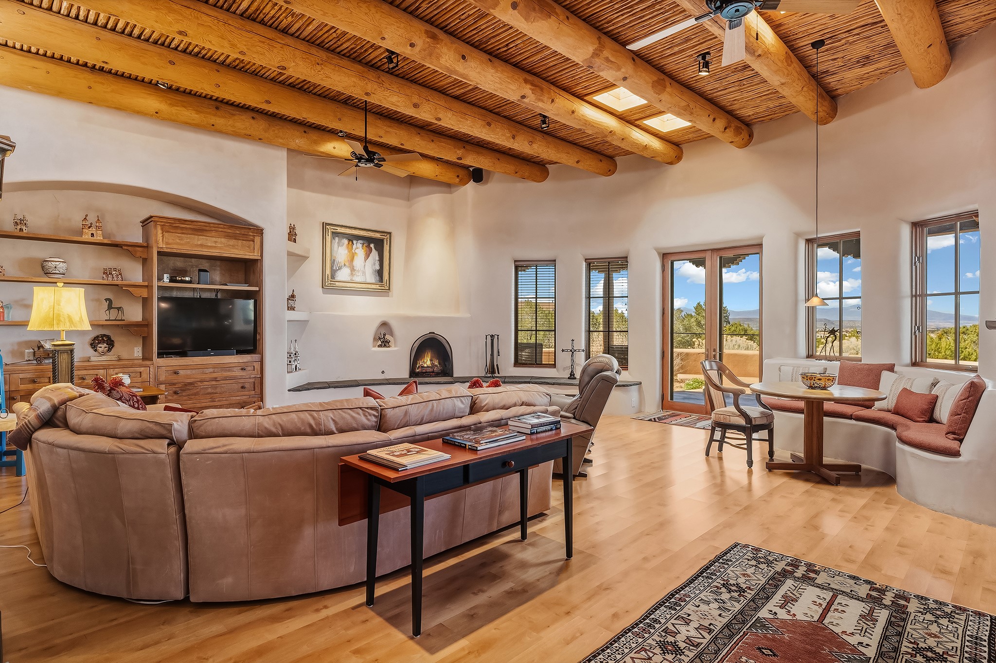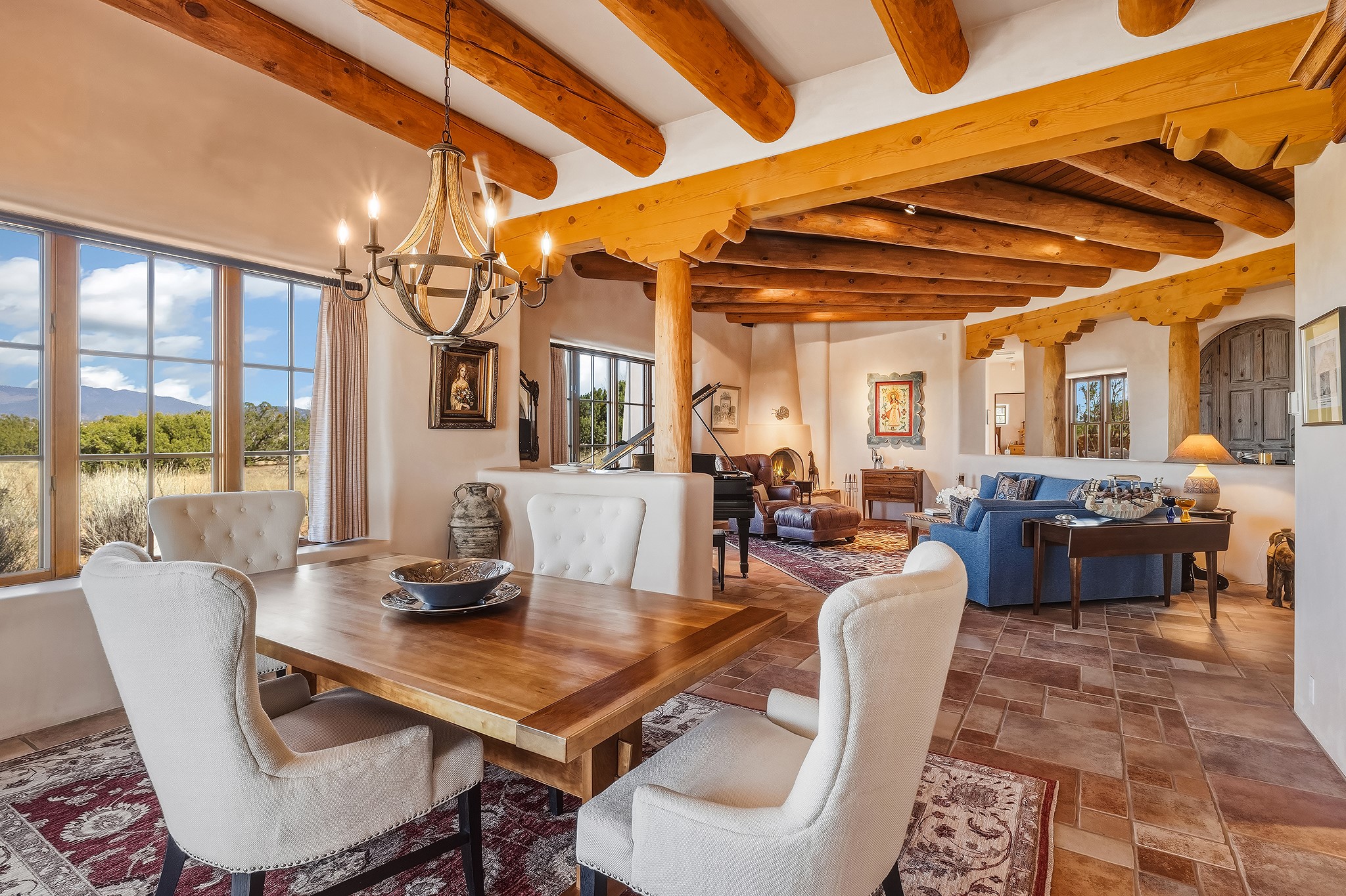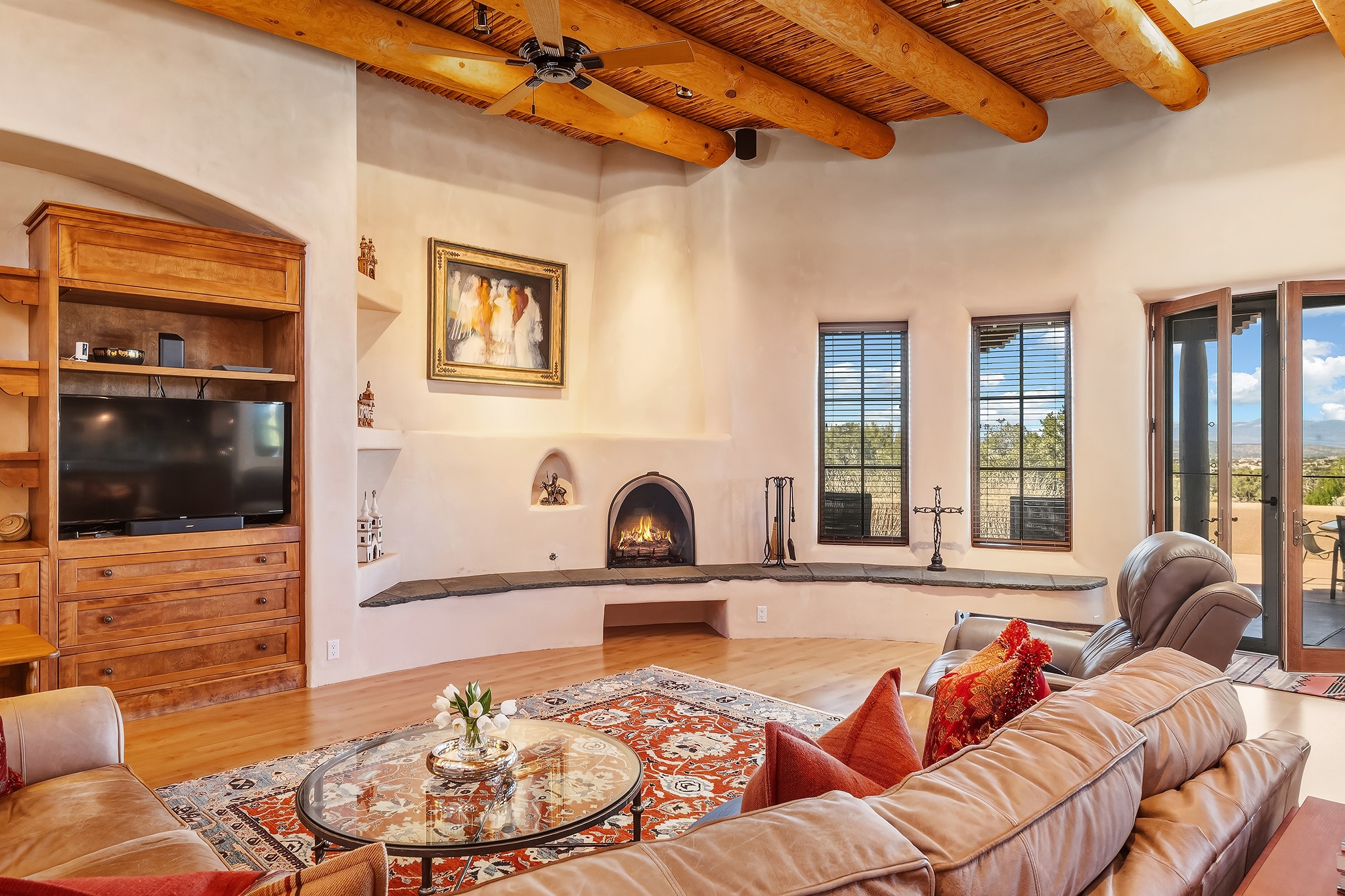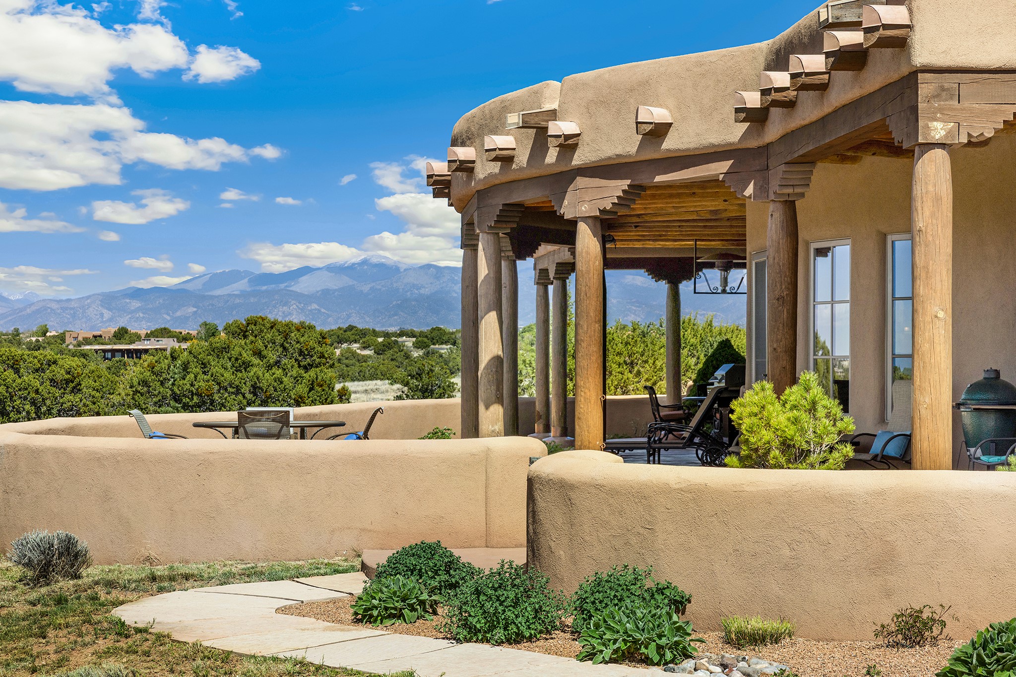 Panoramic views of the Jemez and Sangre de Cristo Mountains set the stage for this beautifully composed 3,833 sq. ft. residence on 2.67 acres in Las Campanas. As you enter the tree-filled front courtyard, a sense of quiet elegance unfolds--an immediate feeling of calm, privacy, and thoughtful design.The entry opens into a formal living room, where vigas fan gracefully toward the horizon, drawing the eye outward to the ever-changing mountain landscape. Just beyond, the dining room opens through glass doors to an expansive covered portal--nearly 1,000 sq. ft.--designed for seamless indoor-outdoor living. An outdoor fireplace and heater create an inviting setting for dining and gathering beneath Santa Fe's vast skies.Arched passageways lead into a striking kitchen and living space, where sculptural curves and a commanding kiva fireplace anchor the room. Granite countertops, stainless steel appliances, double ovens, and a 6-burner gas cooktop are complemented by a generous island with prep sink. A built-in banco offers a quintessential Southwestern moment--casual, intimate, and always oriented toward the view.The primary suite is a private retreat, opening to the portal and framed by breathtaking vistas. Its bath is equally serene, with dual vanities, a soaking tub, and a walk-in shower. A thoughtfully separated guest wing offers two spacious bedrooms, each enjoying its own connection to the surrounding landscape. Even the laundry room captures a quiet view of the front courtyard.Additional features include an 850 sq. ft. three-car garage, radiant in-floor heat, mini-split cooling, new stucco (2021), and a new $120K foam roof to be completed prior to closing.Set on 2.67 acres within Las Campanas, 81 Calle Ventoso W offers a rare opportunity to live immersed in light, landscape, and the timeless beauty of Santa Fe--where every moment is shaped by sky, horizon, and home.