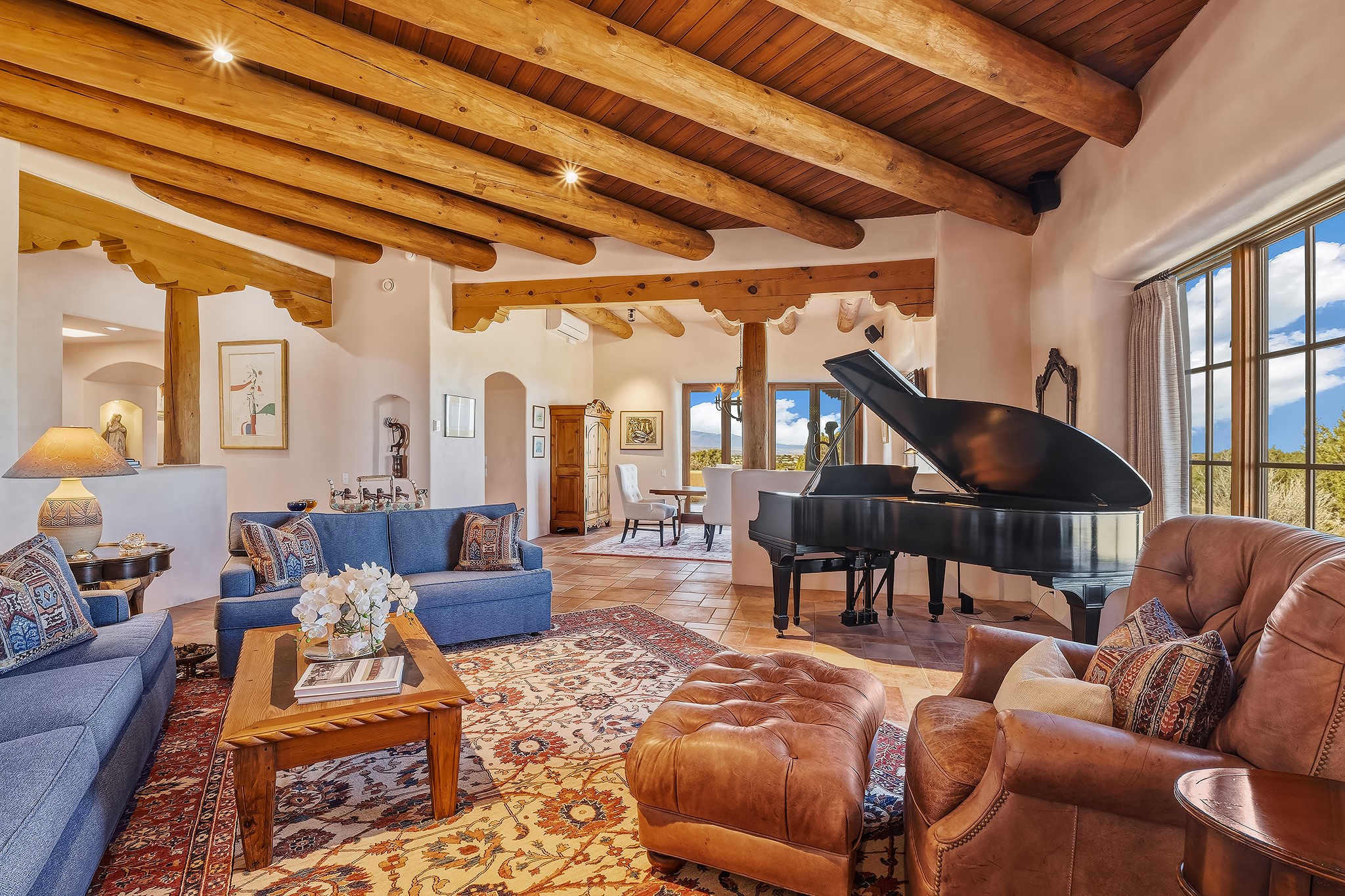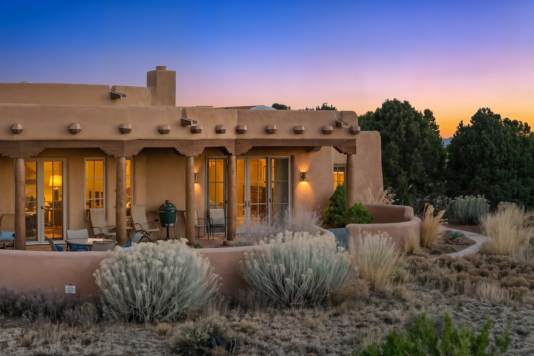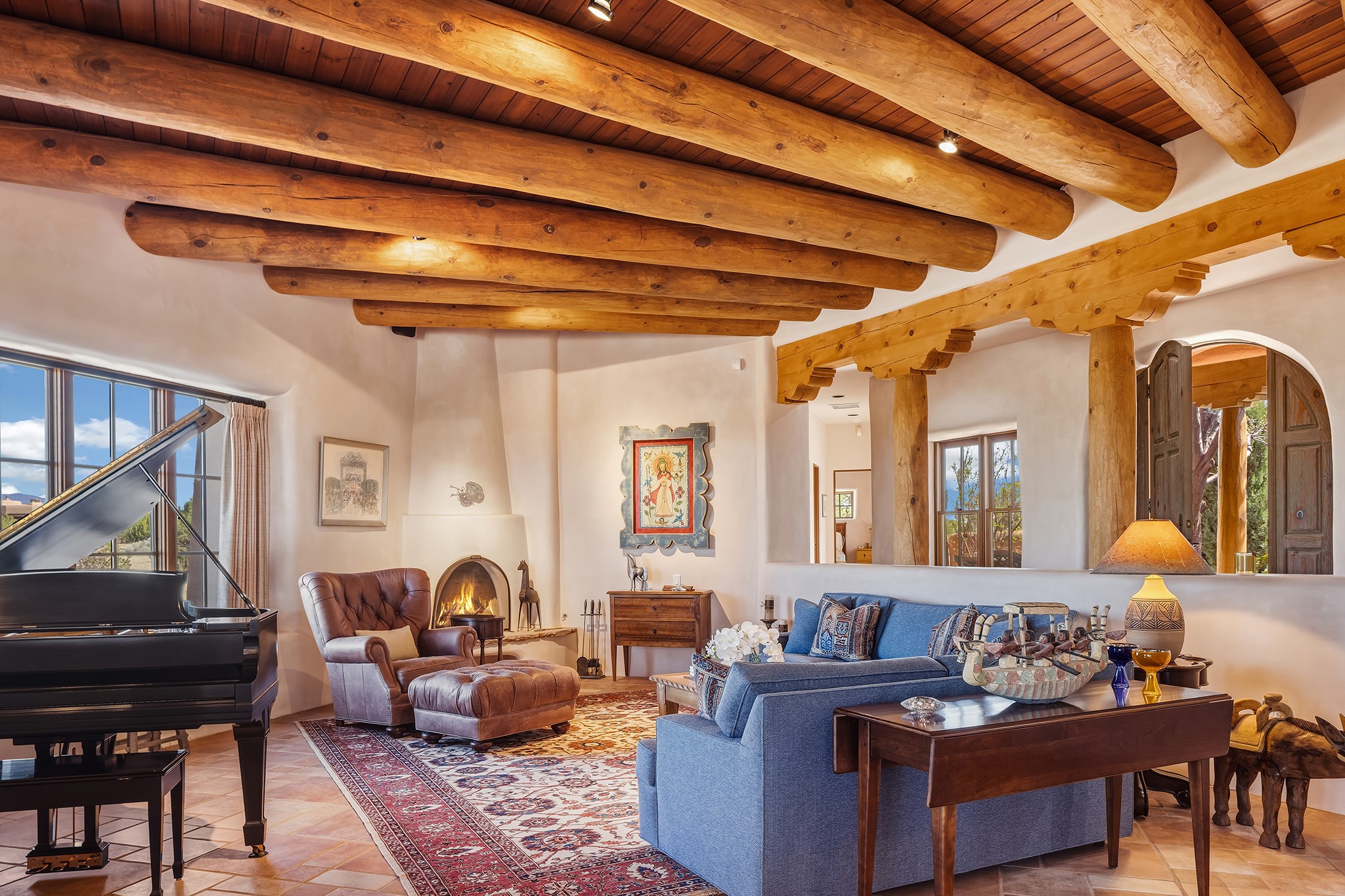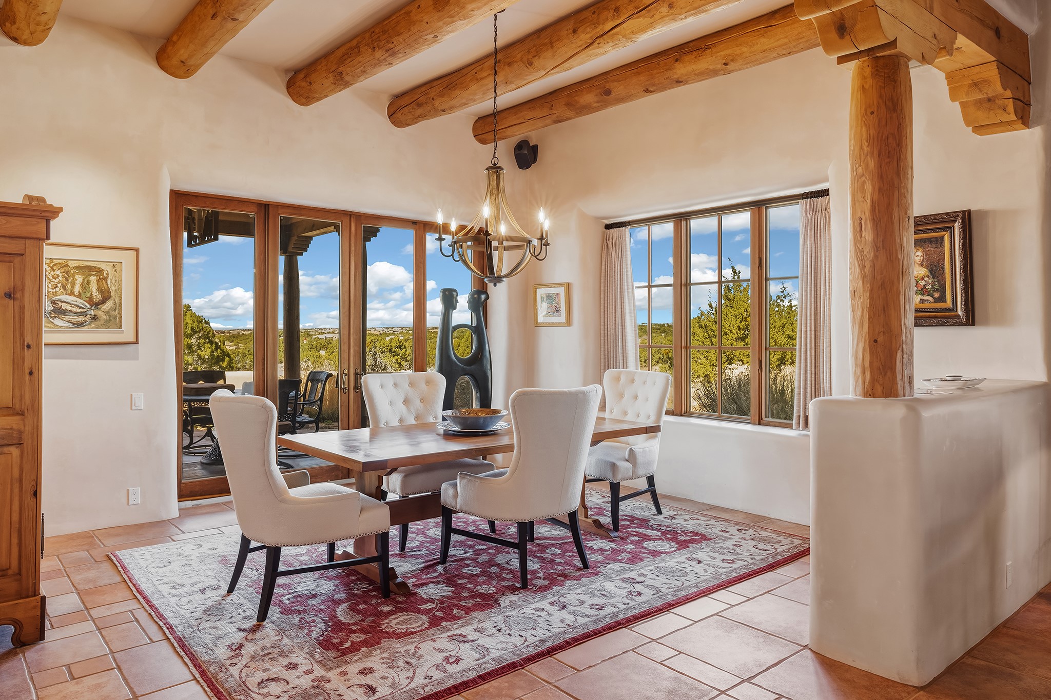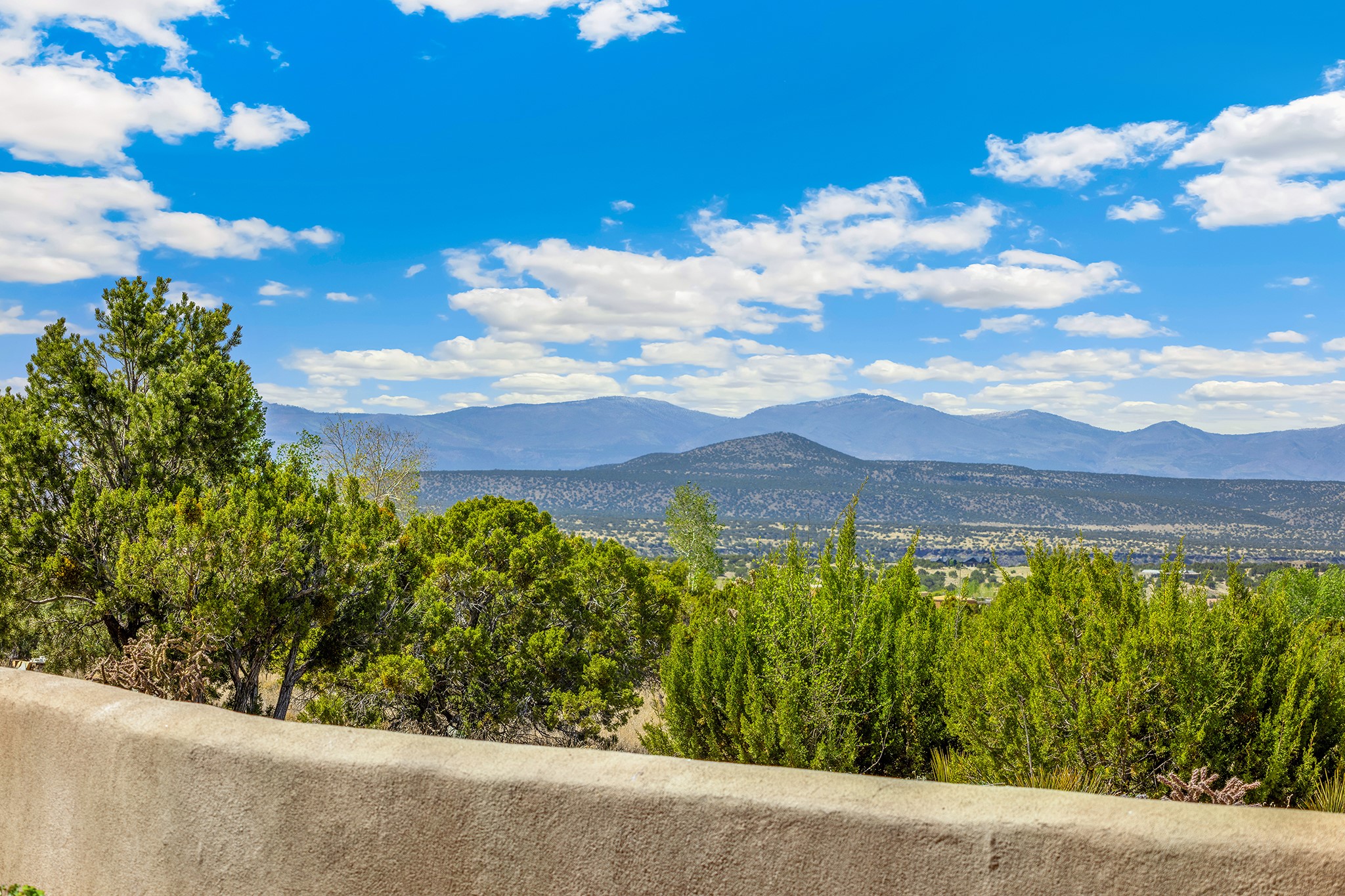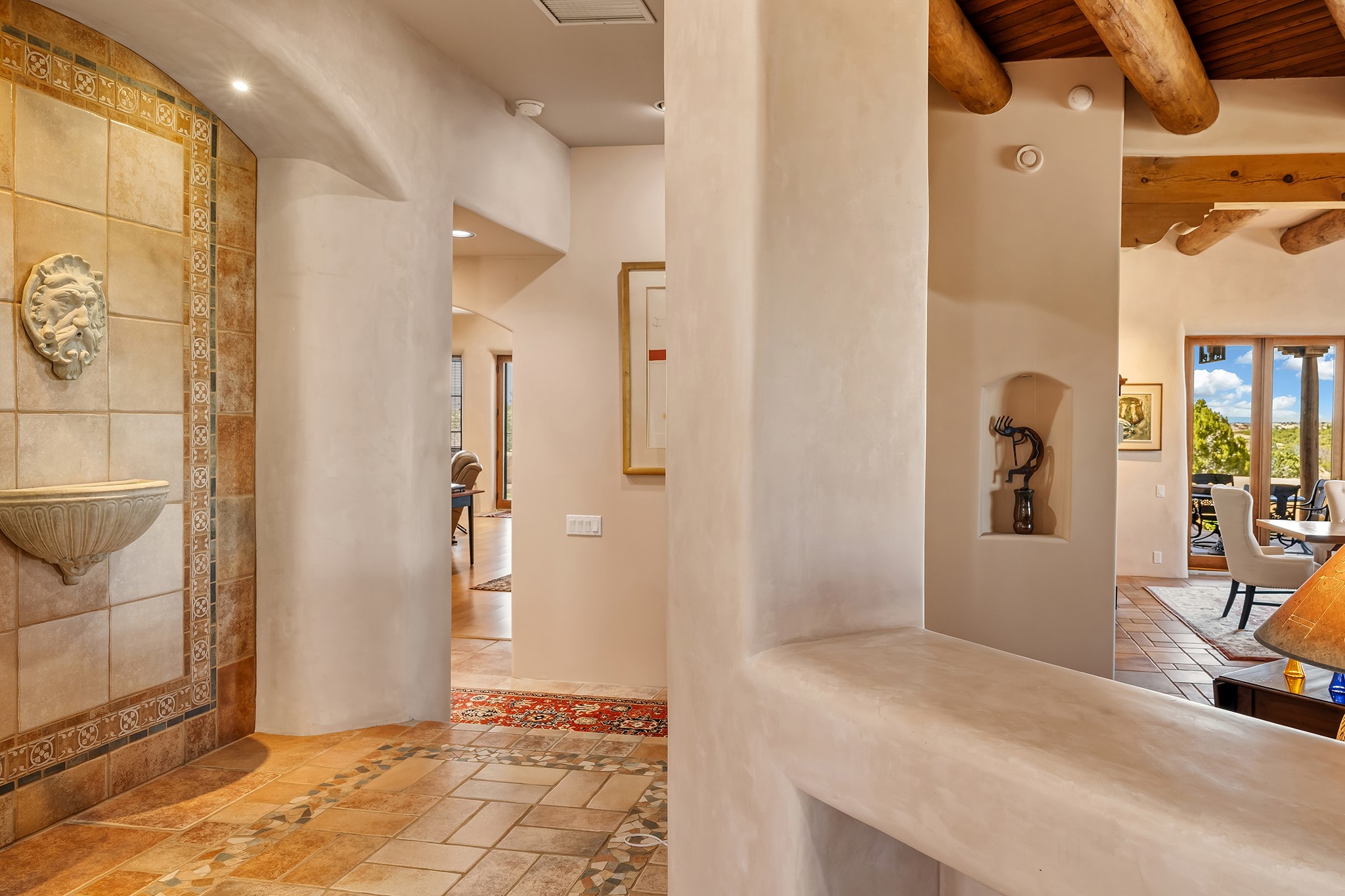 Panoramic views of the Jemez and Sangre de Cristo Mountains set the stage for this beautifully composed 3,833 sq. ft. residence on 2.67 acres in Las Campanas. As you enter the tree-filled front courtyard, a sense of quiet elegance unfolds--an immediate feeling of calm, privacy, and thoughtful design.The entry opens into a formal living room, where vigas fan gracefully toward the horizon, drawing the eye outward to the ever-changing mountain landscape. Just beyond, the dining room opens through glass doors to an expansive covered portal--nearly 1,000 sq. ft.--designed for seamless indoor-outdoor living. An outdoor fireplace and heater create an inviting setting for dining and gathering beneath Santa Fe's vast skies.Arched passageways lead into a striking kitchen and living space, where sculptural curves and a commanding kiva fireplace anchor the room. Granite countertops, stainless steel appliances, double ovens, and a 6-burner gas cooktop are complemented by a generous island with prep sink. A built-in banco offers a quintessential Southwestern moment--casual, intimate, and always oriented toward the view.The primary suite is a private retreat, opening to the portal and framed by breathtaking vistas. Its bath is equally serene, with dual vanities, a soaking tub, and a walk-in shower. A thoughtfully separated guest wing offers two spacious bedrooms, each enjoying its own connection to the surrounding landscape. Even the laundry room captures a quiet view of the front courtyard.Additional features include an 850 sq. ft. three-car garage, radiant in-floor heat, mini-split cooling, new stucco (2021), and a new $120K foam roof to be completed prior to closing.Set on 2.67 acres within Las Campanas, 81 Calle Ventoso W offers a rare opportunity to live immersed in light, landscape, and the timeless beauty of Santa Fe--where every moment is shaped by sky, horizon, and home.
