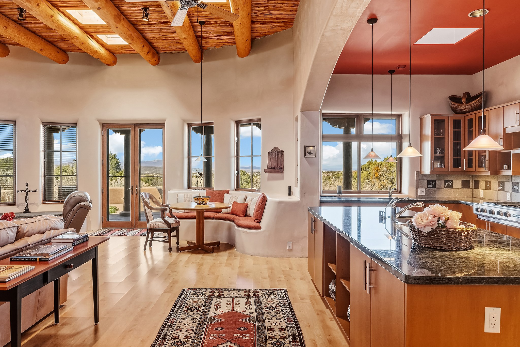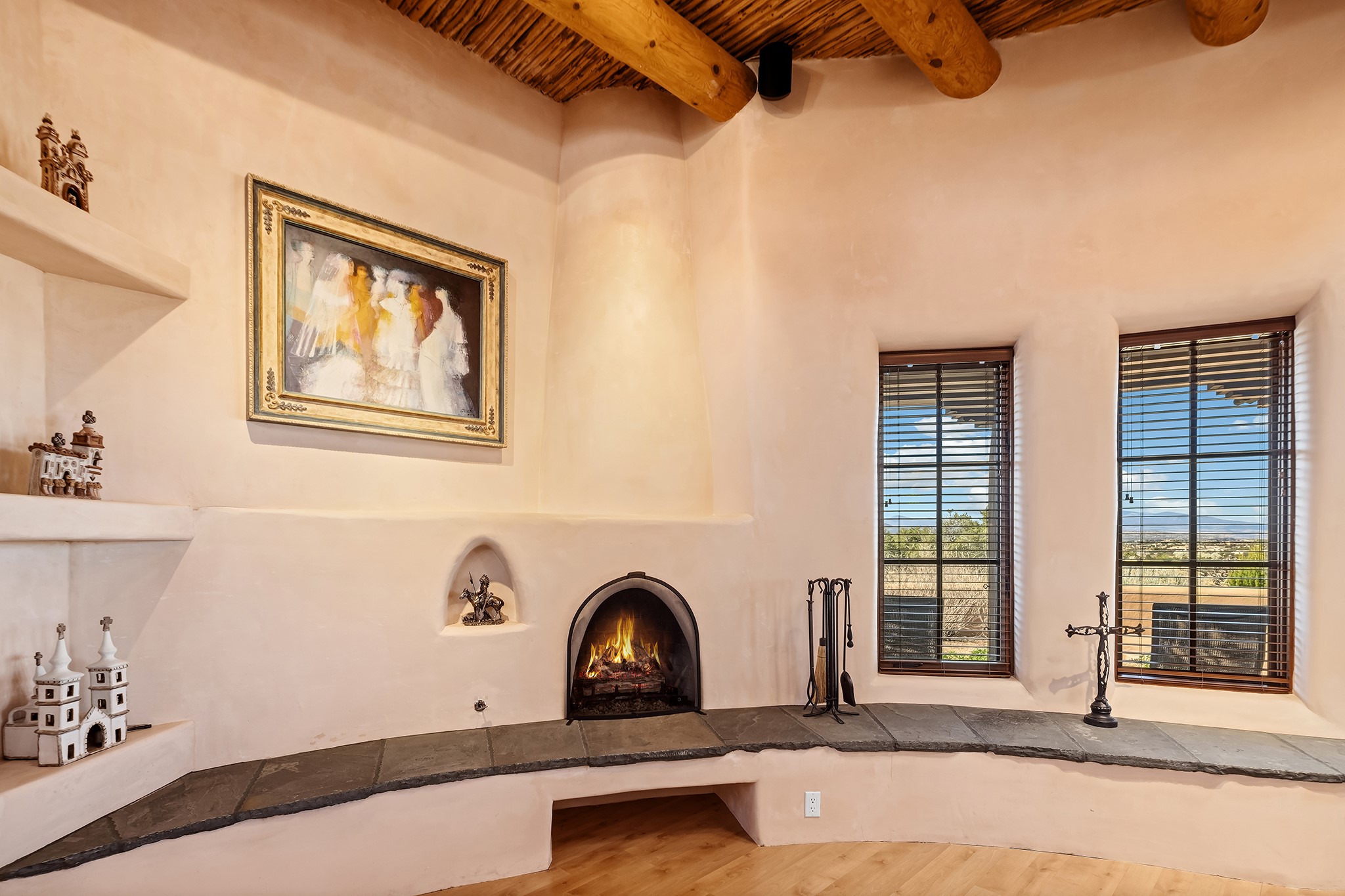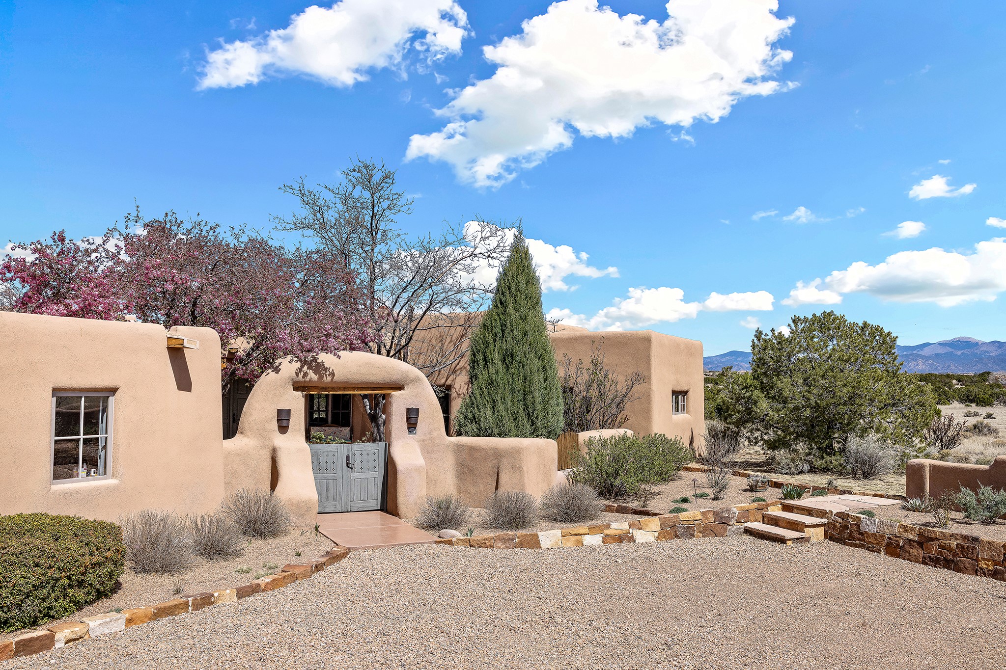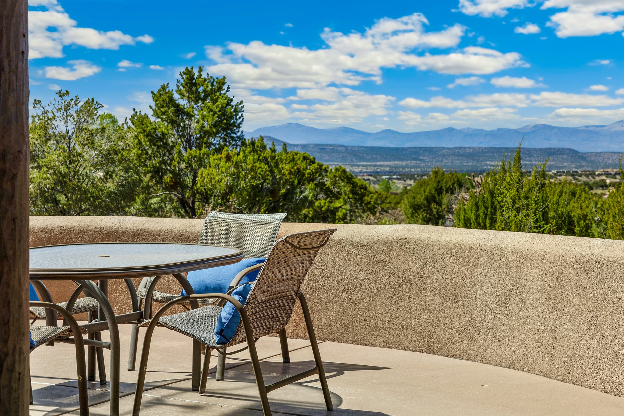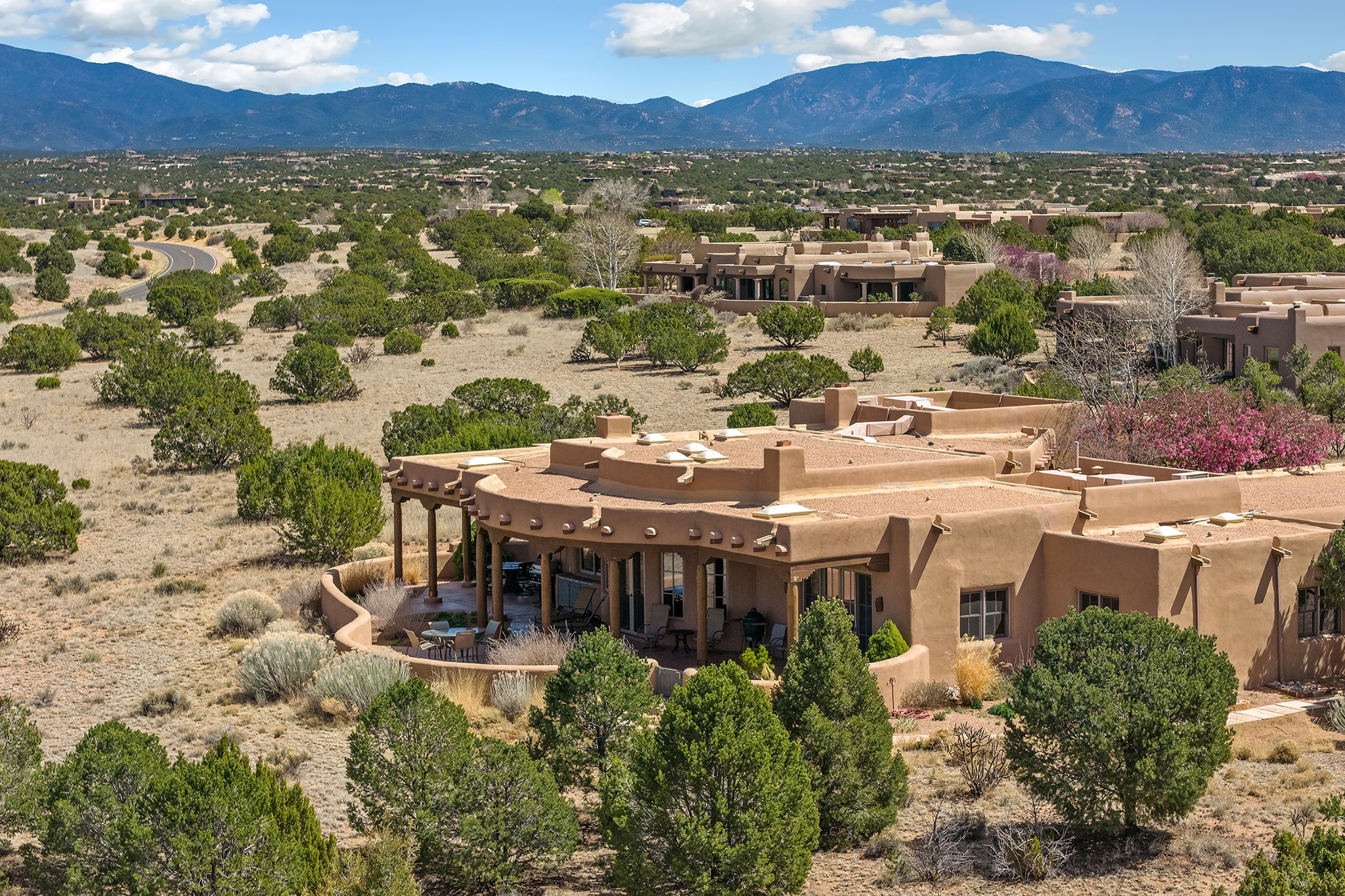 Panoramic views of the Jemez and Sangre de Cristo Mountains set the stage for this beautifully composed 3,833 sq. ft. residence on 2.67 acres in Las Campanas. As you enter the tree-filled front courtyard, a sense of quiet elegance unfolds--an immediate feeling of calm, privacy, and thoughtful design.The entry opens into a formal living room, where vigas fan gracefully toward the horizon, drawing the eye outward to the ever-changing mountain landscape. Just beyond, the dining room opens through glass doors to an expansive covered portal--nearly 1,000 sq. ft.--designed for seamless indoor-outdoor living. An outdoor fireplace and heater create an inviting setting for dining and gathering beneath Santa Fe's vast skies.Arched passageways lead into a striking kitchen and living space, where sculptural curves and a commanding kiva fireplace anchor the room. Granite countertops, stainless steel appliances, double ovens, and a 6-burner gas cooktop are complemented by a generous island with prep sink. A built-in banco offers a quintessential Southwestern moment--casual, intimate, and always oriented toward the view.The primary suite is a private retreat, opening to the portal and framed by breathtaking vistas. Its bath is equally serene, with dual vanities, a soaking tub, and a walk-in shower. A thoughtfully separated guest wing offers two spacious bedrooms, each enjoying its own connection to the surrounding landscape. Even the laundry room captures a quiet view of the front courtyard.Additional features include an 850 sq. ft. three-car garage, radiant in-floor heat, mini-split cooling, new stucco (2021), and a new $120K foam roof to be completed prior to closing.Set on 2.67 acres within Las Campanas, 81 Calle Ventoso W offers a rare opportunity to live immersed in light, landscape, and the timeless beauty of Santa Fe--where every moment is shaped by sky, horizon, and home.