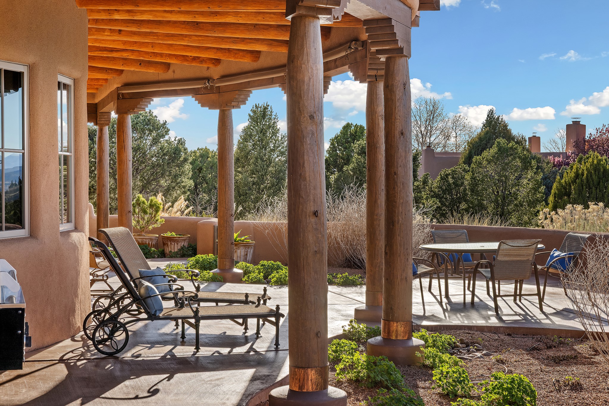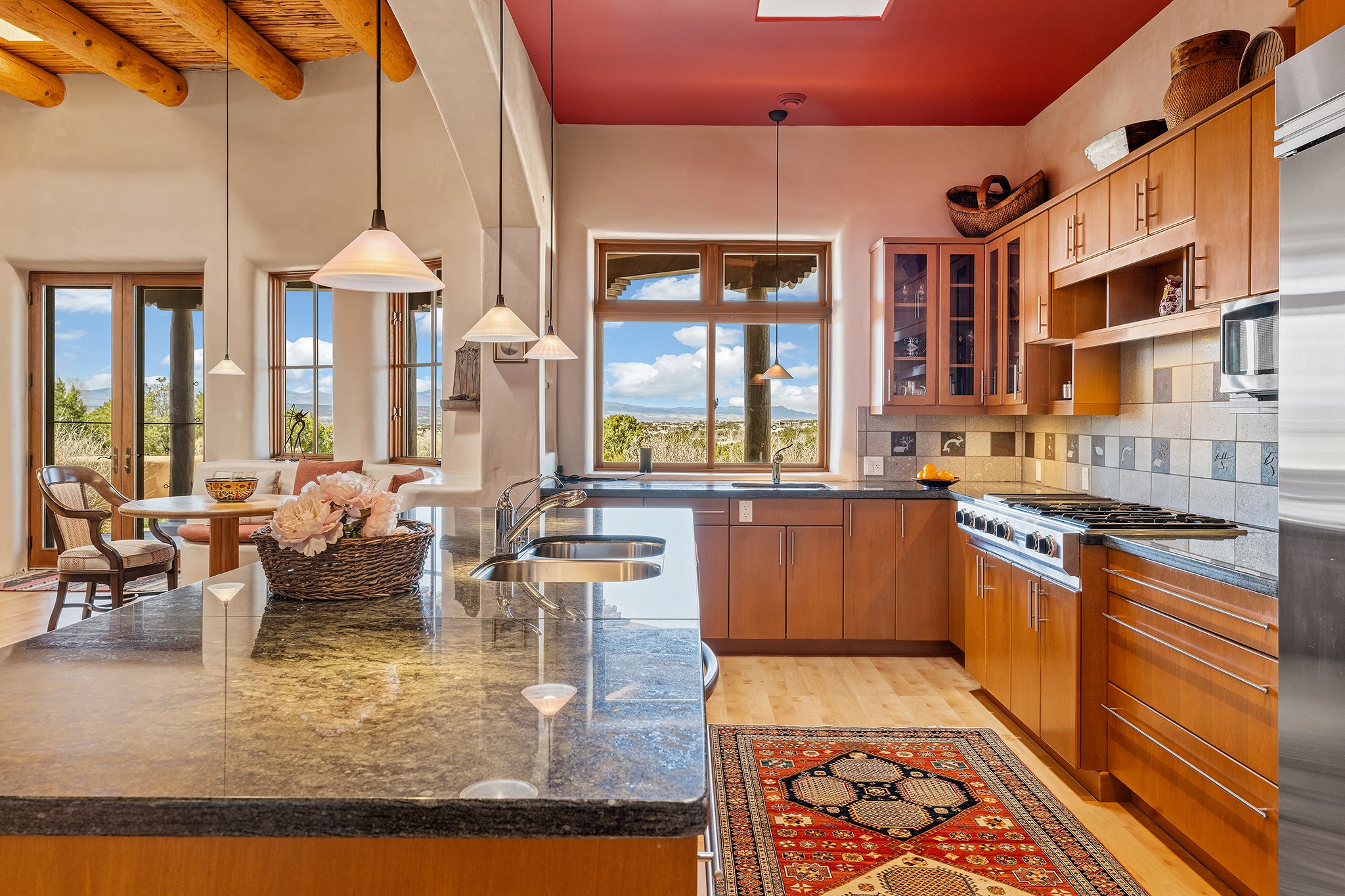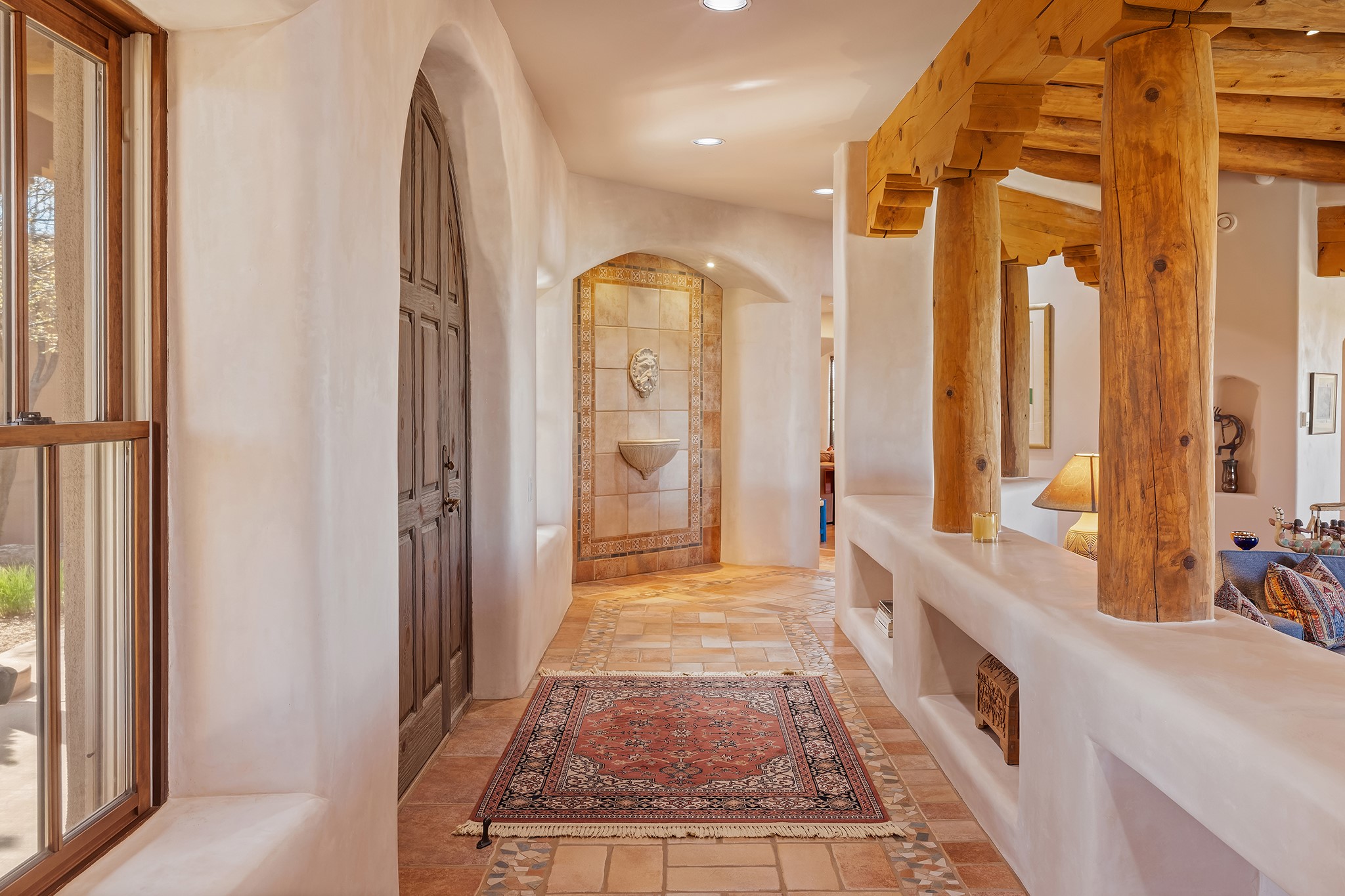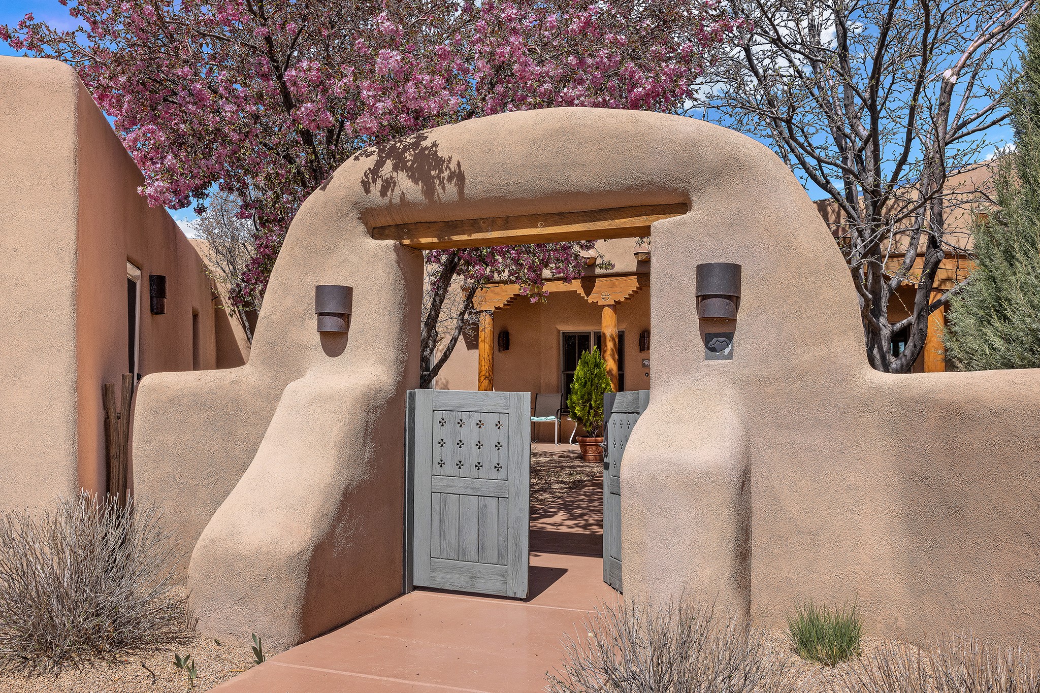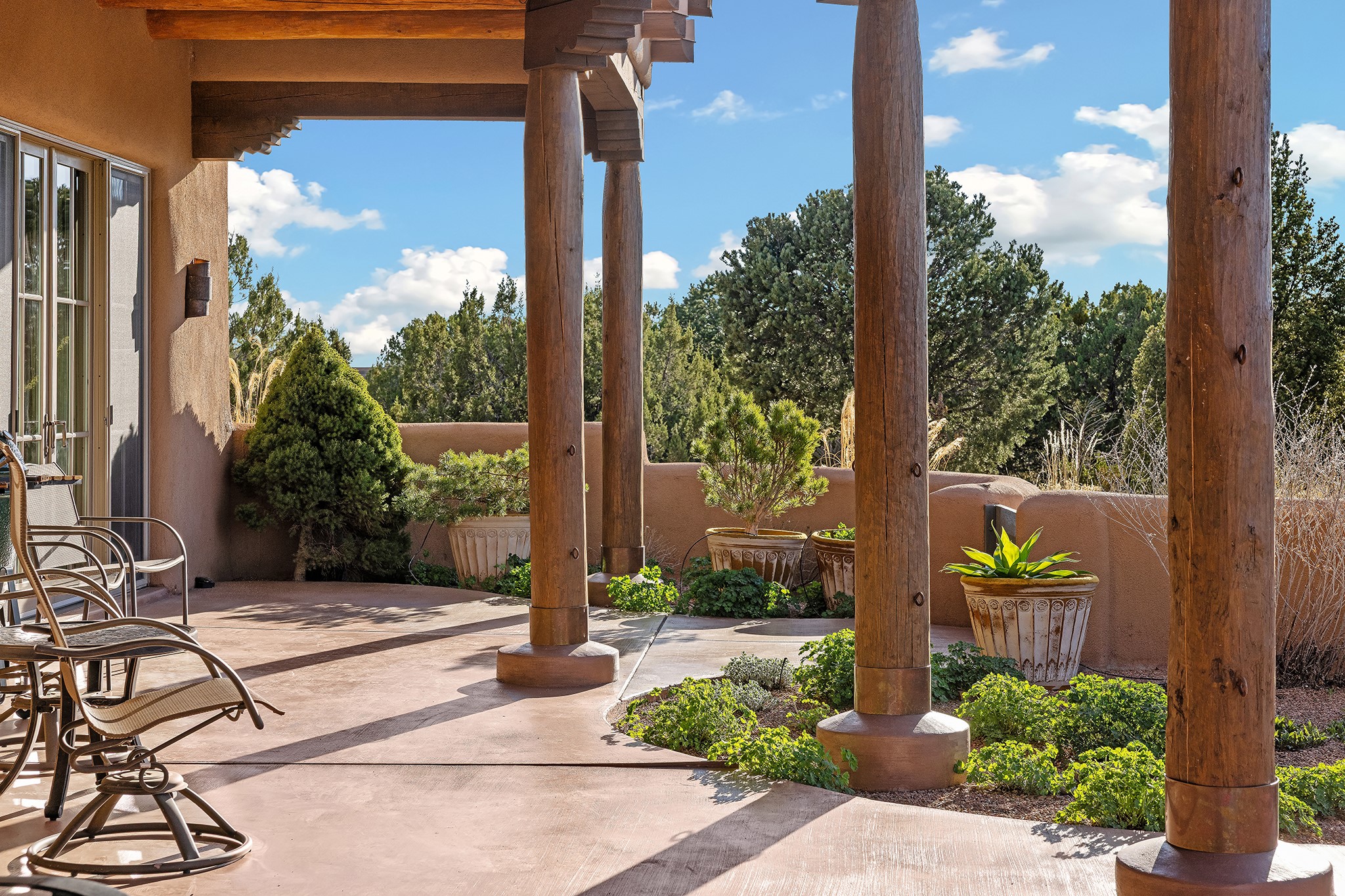 Panoramic views of the Jemez and Sangre de Cristo Mountains set the stage for this beautifully composed 3,833 sq. ft. residence on 2.67 acres in Las Campanas. As you enter the tree-filled front courtyard, a sense of quiet elegance unfolds--an immediate feeling of calm, privacy, and thoughtful design.The entry opens into a formal living room, where vigas fan gracefully toward the horizon, drawing the eye outward to the ever-changing mountain landscape. Just beyond, the dining room opens through glass doors to an expansive covered portal--nearly 1,000 sq. ft.--designed for seamless indoor-outdoor living. An outdoor fireplace and heater create an inviting setting for dining and gathering beneath Santa Fe's vast skies.Arched passageways lead into a striking kitchen and living space, where sculptural curves and a commanding kiva fireplace anchor the room. Granite countertops, stainless steel appliances, double ovens, and a 6-burner gas cooktop are complemented by a generous island with prep sink. A built-in banco offers a quintessential Southwestern moment--casual, intimate, and always oriented toward the view.The primary suite is a private retreat, opening to the portal and framed by breathtaking vistas. Its bath is equally serene, with dual vanities, a soaking tub, and a walk-in shower. A thoughtfully separated guest wing offers two spacious bedrooms, each enjoying its own connection to the surrounding landscape. Even the laundry room captures a quiet view of the front courtyard.Additional features include an 850 sq. ft. three-car garage, radiant in-floor heat, mini-split cooling, new stucco (2021), and a new $120K foam roof to be completed prior to closing.Set on 2.67 acres within Las Campanas, 81 Calle Ventoso W offers a rare opportunity to live immersed in light, landscape, and the timeless beauty of Santa Fe--where every moment is shaped by sky, horizon, and home.