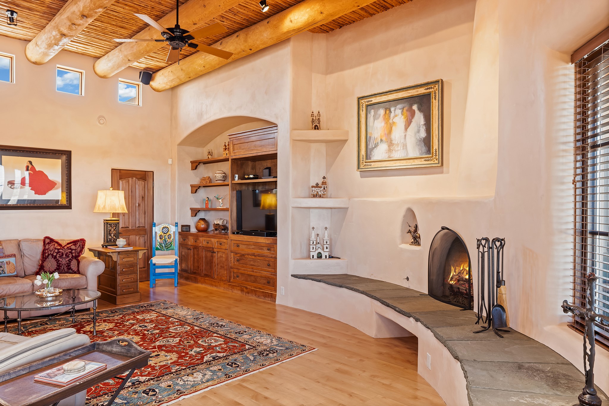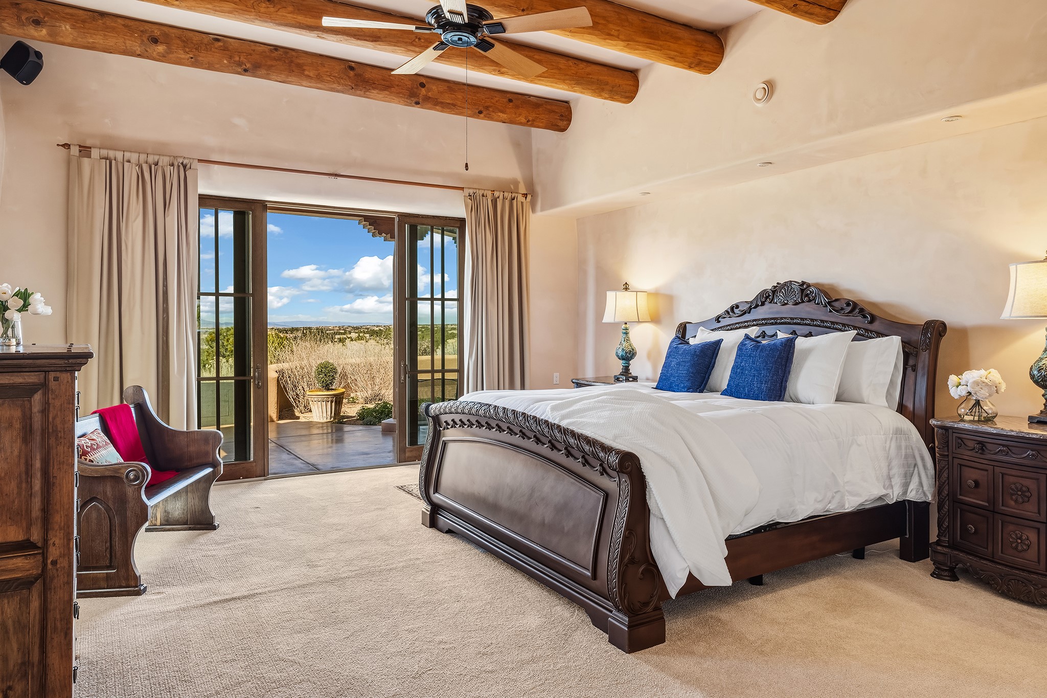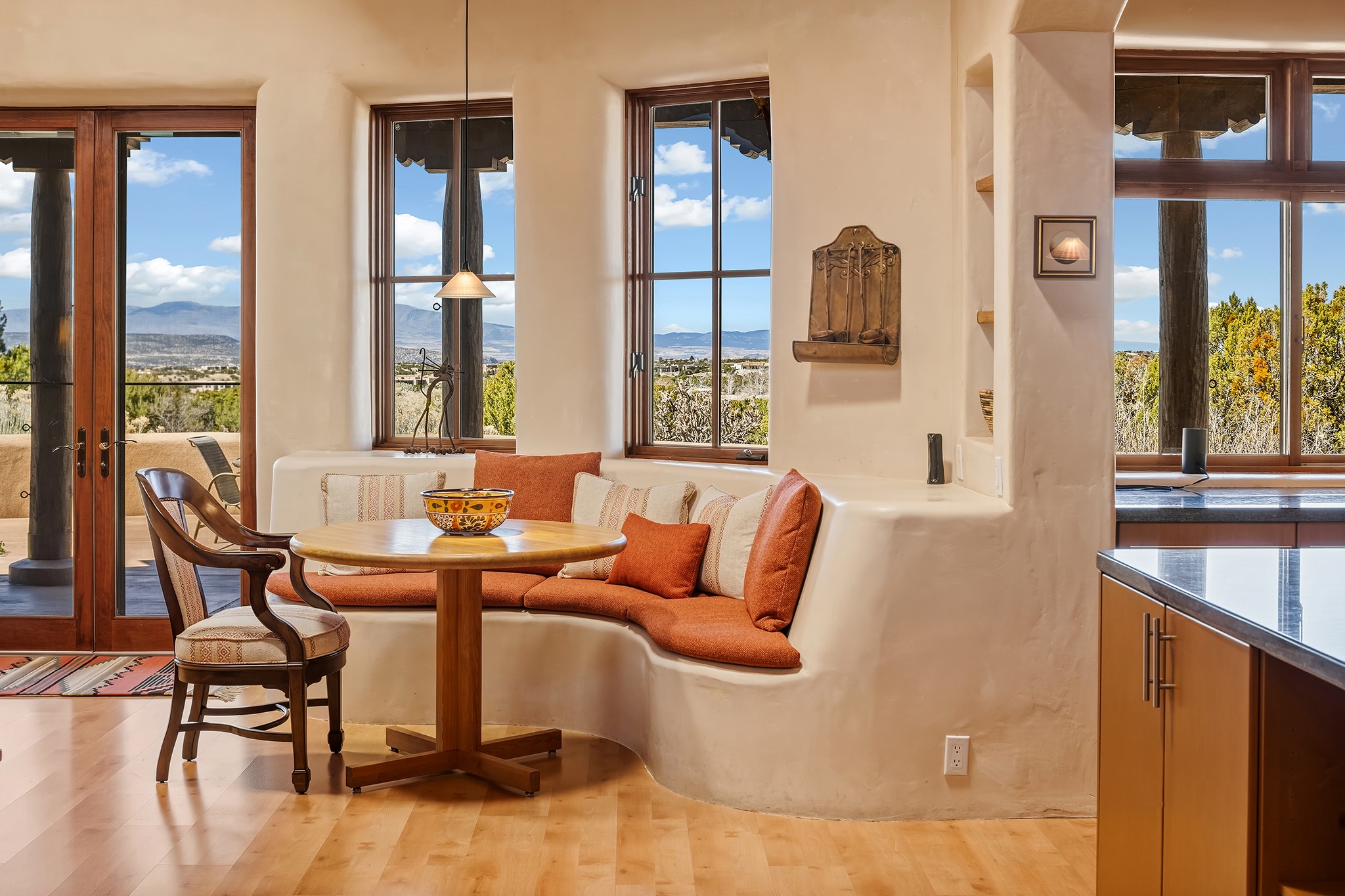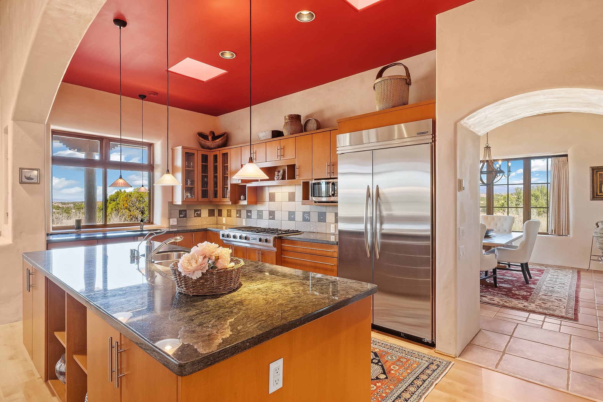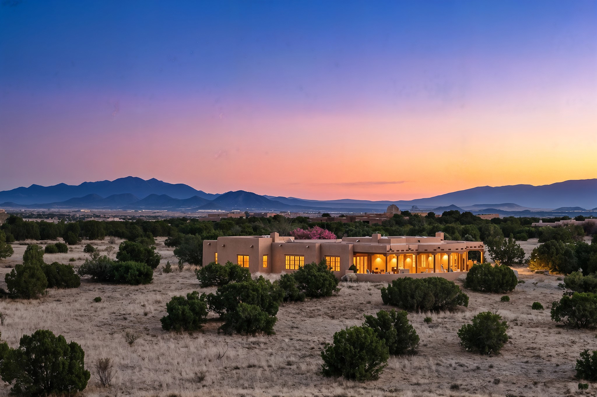 Panoramic views of the Jemez and Sangre de Cristo Mountains set the stage for this beautifully composed 3,833 sq. ft. residence on 2.67 acres in Las Campanas. As you enter the tree-filled front courtyard, a sense of quiet elegance unfolds--an immediate feeling of calm, privacy, and thoughtful design.The entry opens into a formal living room, where vigas fan gracefully toward the horizon, drawing the eye outward to the ever-changing mountain landscape. Just beyond, the dining room opens through glass doors to an expansive covered portal--nearly 1,000 sq. ft.--designed for seamless indoor-outdoor living. An outdoor fireplace and heater create an inviting setting for dining and gathering beneath Santa Fe's vast skies.Arched passageways lead into a striking kitchen and living space, where sculptural curves and a commanding kiva fireplace anchor the room. Granite countertops, stainless steel appliances, double ovens, and a 6-burner gas cooktop are complemented by a generous island with prep sink. A built-in banco offers a quintessential Southwestern moment--casual, intimate, and always oriented toward the view.The primary suite is a private retreat, opening to the portal and framed by breathtaking vistas. Its bath is equally serene, with dual vanities, a soaking tub, and a walk-in shower. A thoughtfully separated guest wing offers two spacious bedrooms, each enjoying its own connection to the surrounding landscape. Even the laundry room captures a quiet view of the front courtyard.Additional features include an 850 sq. ft. three-car garage, radiant in-floor heat, mini-split cooling, new stucco (2021), and a new $120K foam roof to be completed prior to closing.Set on 2.67 acres within Las Campanas, 81 Calle Ventoso W offers a rare opportunity to live immersed in light, landscape, and the timeless beauty of Santa Fe--where every moment is shaped by sky, horizon, and home.