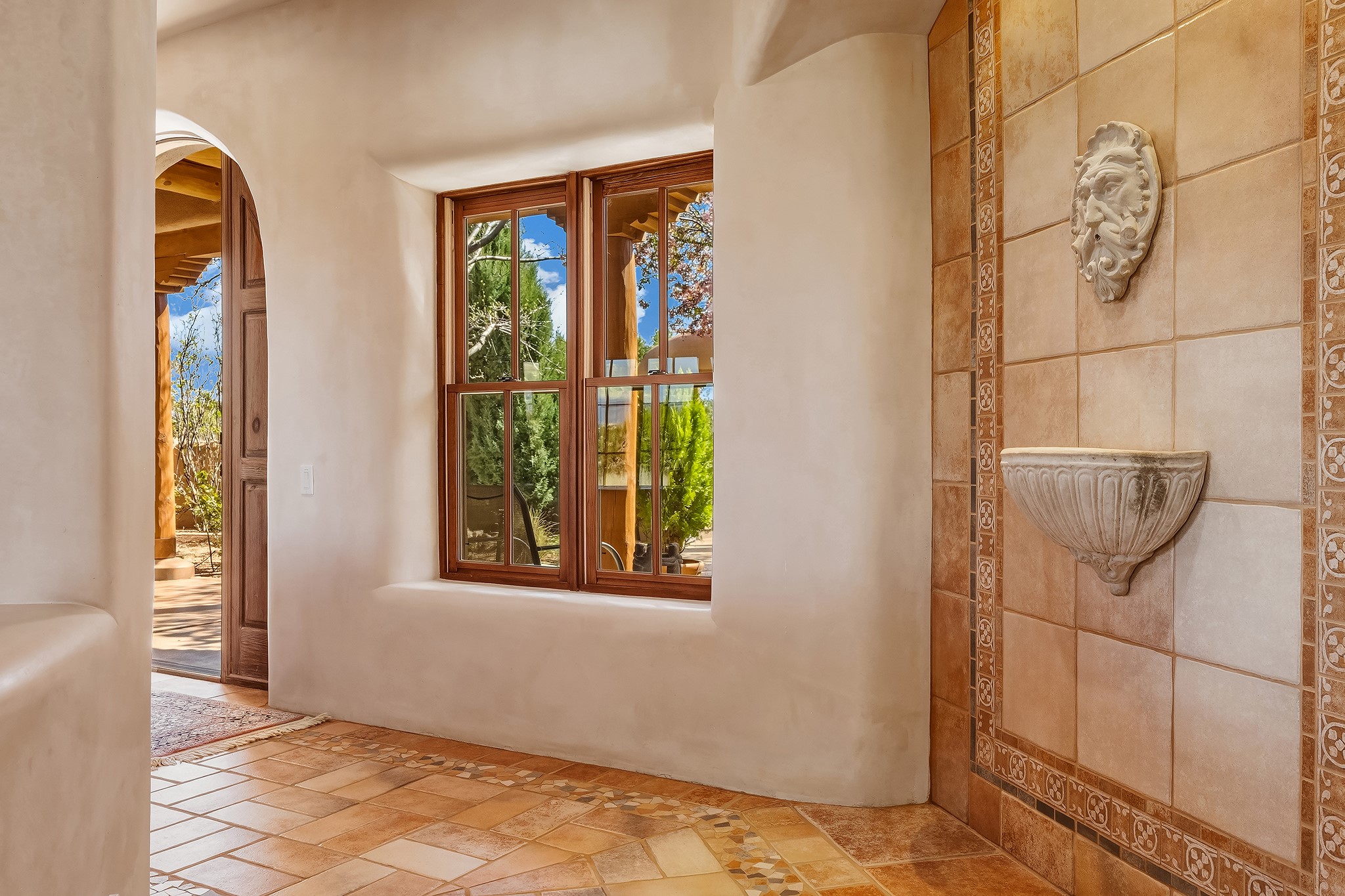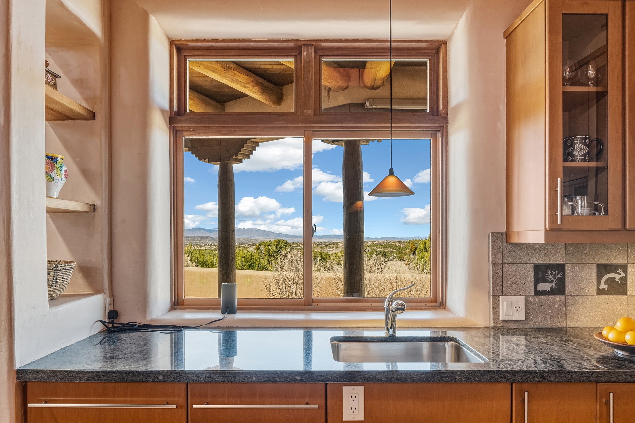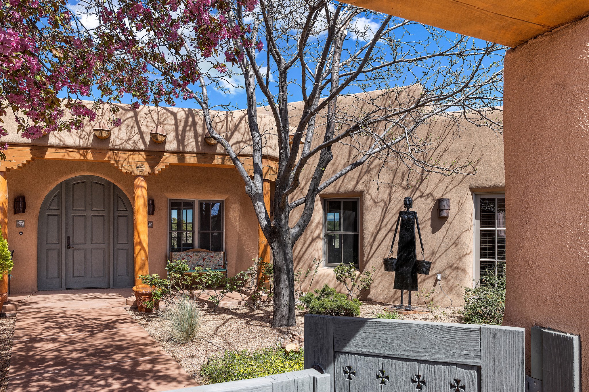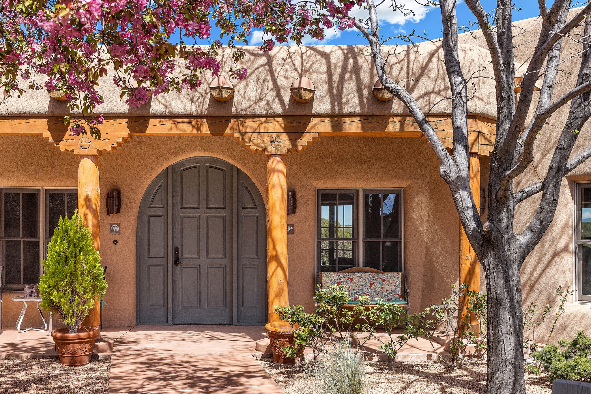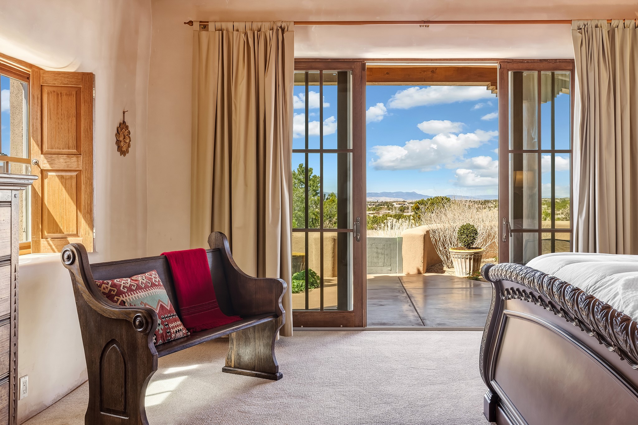 Panoramic views of the Jemez and Sangre de Cristo Mountains set the stage for this beautifully composed 3,833 sq. ft. residence on 2.67 acres in Las Campanas. As you enter the tree-filled front courtyard, a sense of quiet elegance unfolds--an immediate feeling of calm, privacy, and thoughtful design.The entry opens into a formal living room, where vigas fan gracefully toward the horizon, drawing the eye outward to the ever-changing mountain landscape. Just beyond, the dining room opens through glass doors to an expansive covered portal--nearly 1,000 sq. ft.--designed for seamless indoor-outdoor living. An outdoor fireplace and heater create an inviting setting for dining and gathering beneath Santa Fe's vast skies.Arched passageways lead into a striking kitchen and living space, where sculptural curves and a commanding kiva fireplace anchor the room. Granite countertops, stainless steel appliances, double ovens, and a 6-burner gas cooktop are complemented by a generous island with prep sink. A built-in banco offers a quintessential Southwestern moment--casual, intimate, and always oriented toward the view.The primary suite is a private retreat, opening to the portal and framed by breathtaking vistas. Its bath is equally serene, with dual vanities, a soaking tub, and a walk-in shower. A thoughtfully separated guest wing offers two spacious bedrooms, each enjoying its own connection to the surrounding landscape. Even the laundry room captures a quiet view of the front courtyard.Additional features include an 850 sq. ft. three-car garage, radiant in-floor heat, mini-split cooling, new stucco (2021), and a new $120K foam roof to be completed prior to closing.Set on 2.67 acres within Las Campanas, 81 Calle Ventoso W offers a rare opportunity to live immersed in light, landscape, and the timeless beauty of Santa Fe--where every moment is shaped by sky, horizon, and home.