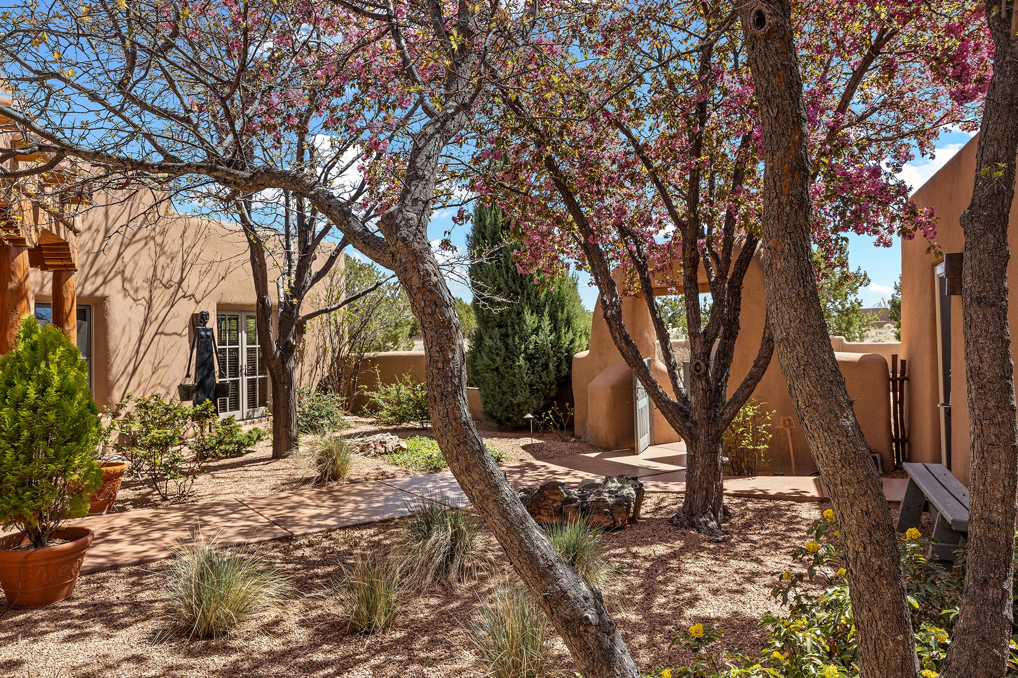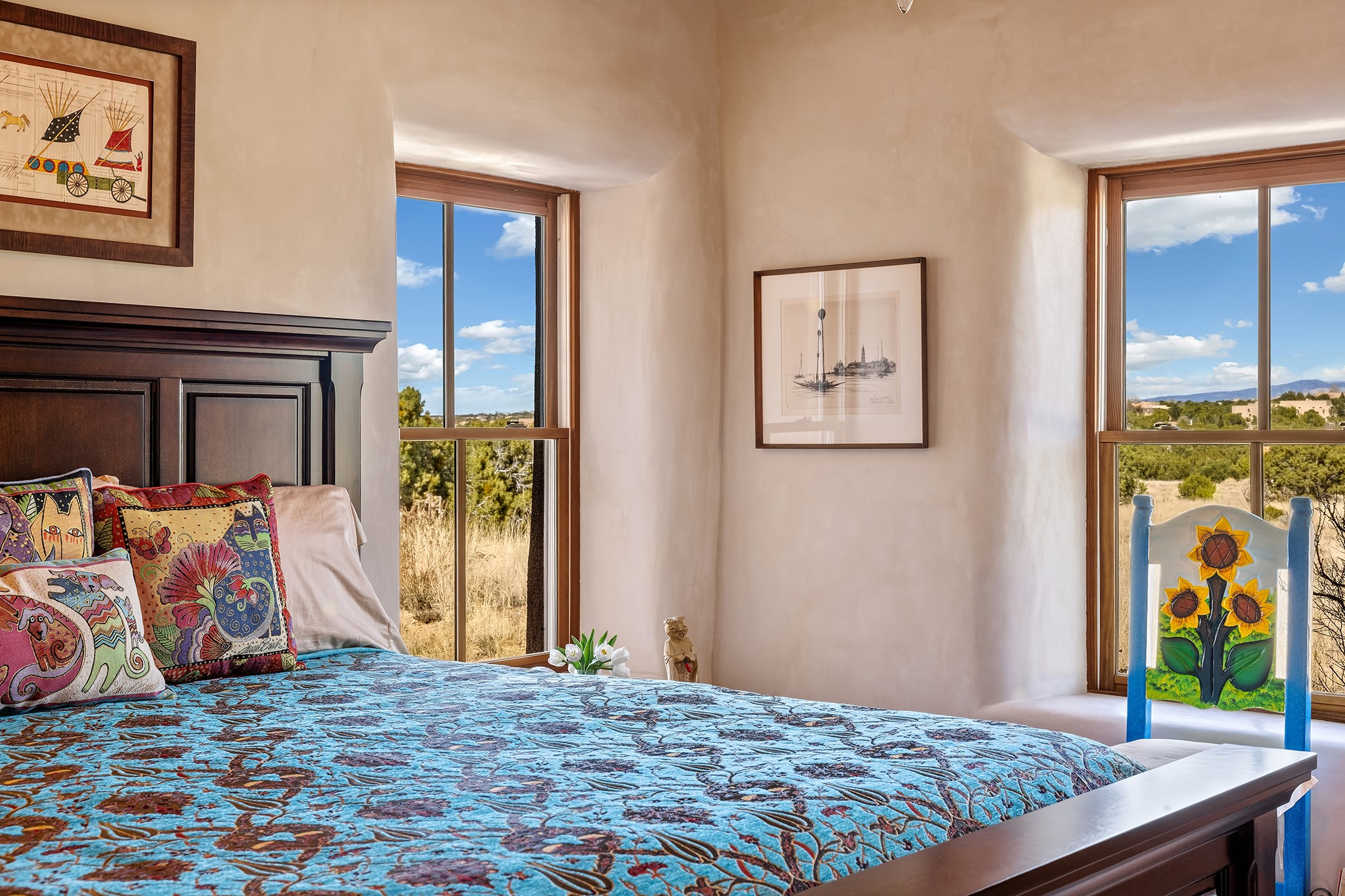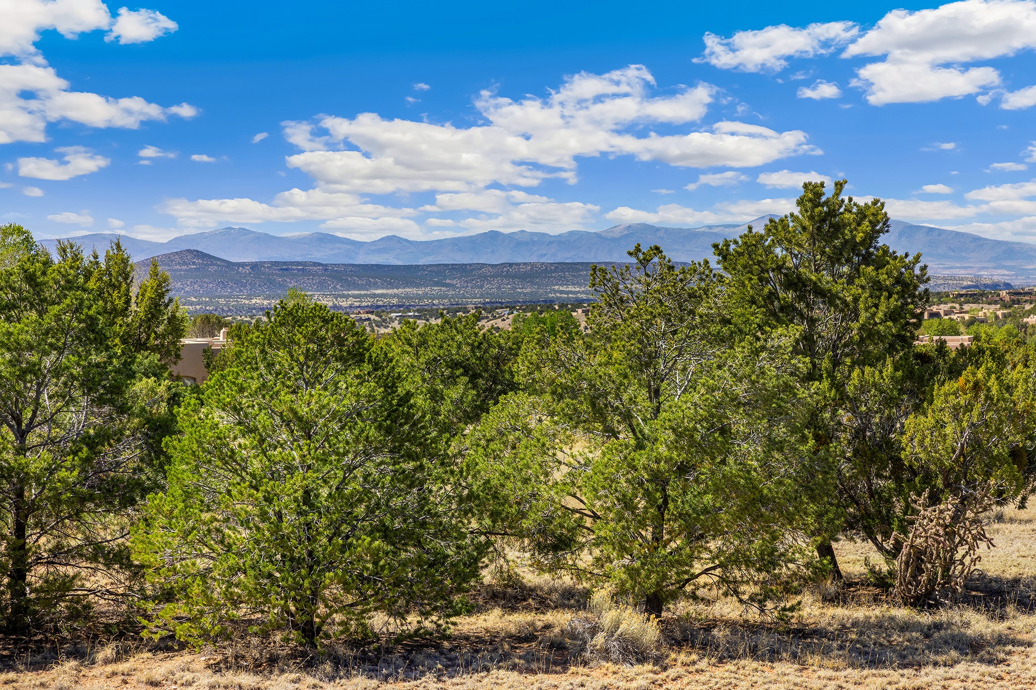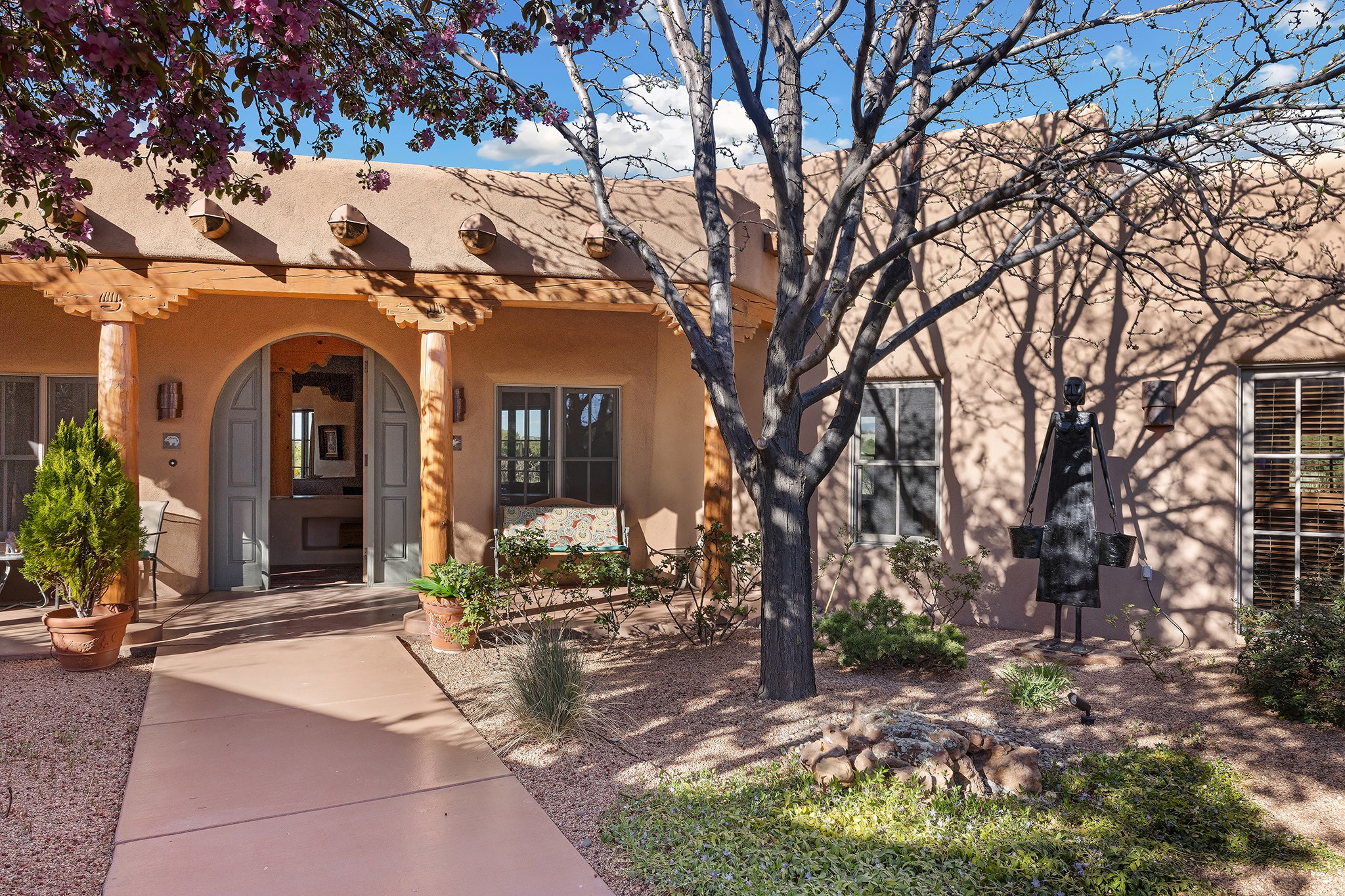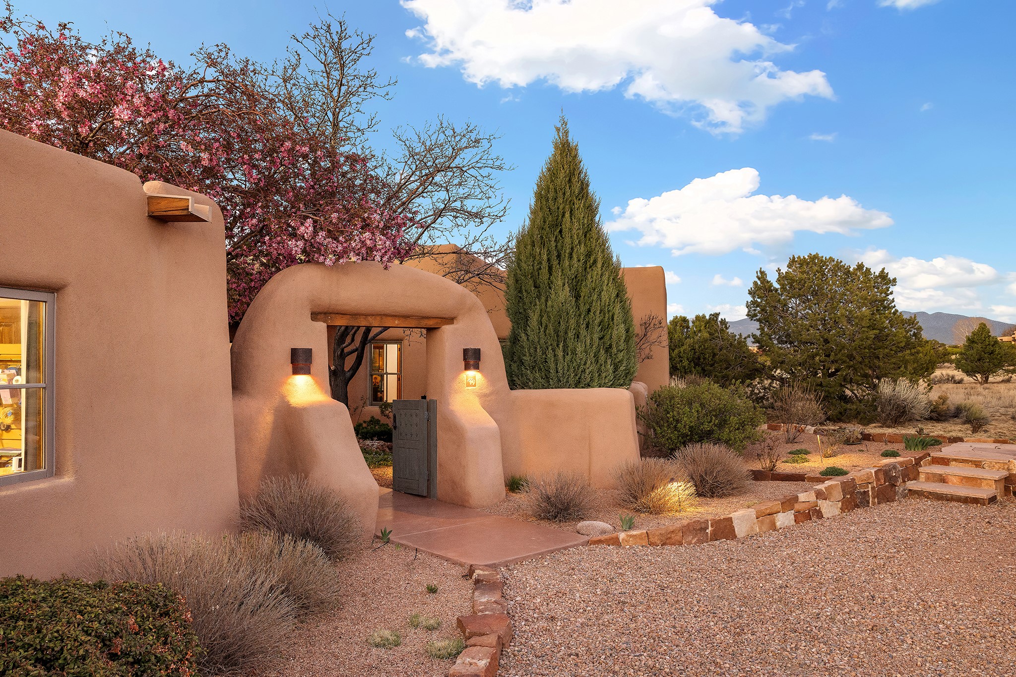 Panoramic views of the Jemez and Sangre de Cristo Mountains set the stage for this beautifully composed 3,833 sq. ft. residence on 2.67 acres in Las Campanas. As you enter the tree-filled front courtyard, a sense of quiet elegance unfolds--an immediate feeling of calm, privacy, and thoughtful design.The entry opens into a formal living room, where vigas fan gracefully toward the horizon, drawing the eye outward to the ever-changing mountain landscape. Just beyond, the dining room opens through glass doors to an expansive covered portal--nearly 1,000 sq. ft.--designed for seamless indoor-outdoor living. An outdoor fireplace and heater create an inviting setting for dining and gathering beneath Santa Fe's vast skies.Arched passageways lead into a striking kitchen and living space, where sculptural curves and a commanding kiva fireplace anchor the room. Granite countertops, stainless steel appliances, double ovens, and a 6-burner gas cooktop are complemented by a generous island with prep sink. A built-in banco offers a quintessential Southwestern moment--casual, intimate, and always oriented toward the view.The primary suite is a private retreat, opening to the portal and framed by breathtaking vistas. Its bath is equally serene, with dual vanities, a soaking tub, and a walk-in shower. A thoughtfully separated guest wing offers two spacious bedrooms, each enjoying its own connection to the surrounding landscape. Even the laundry room captures a quiet view of the front courtyard.Additional features include an 850 sq. ft. three-car garage, radiant in-floor heat, mini-split cooling, new stucco (2021), and a new $120K foam roof to be completed prior to closing.Set on 2.67 acres within Las Campanas, 81 Calle Ventoso W offers a rare opportunity to live immersed in light, landscape, and the timeless beauty of Santa Fe--where every moment is shaped by sky, horizon, and home.