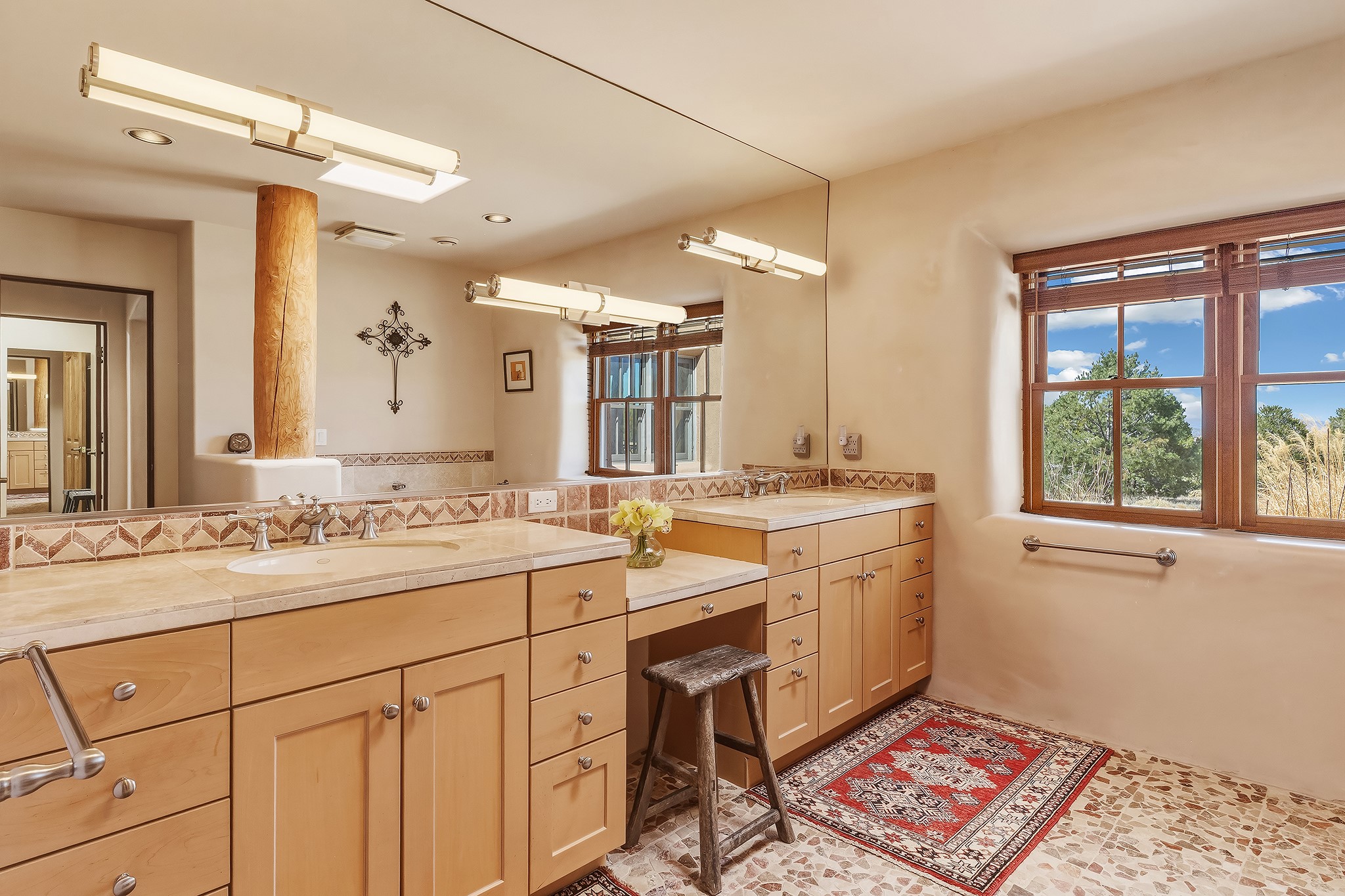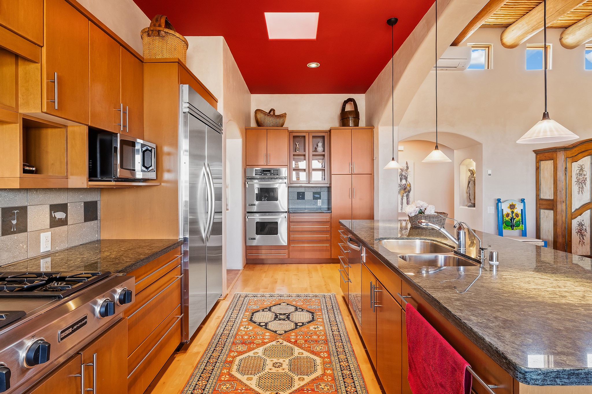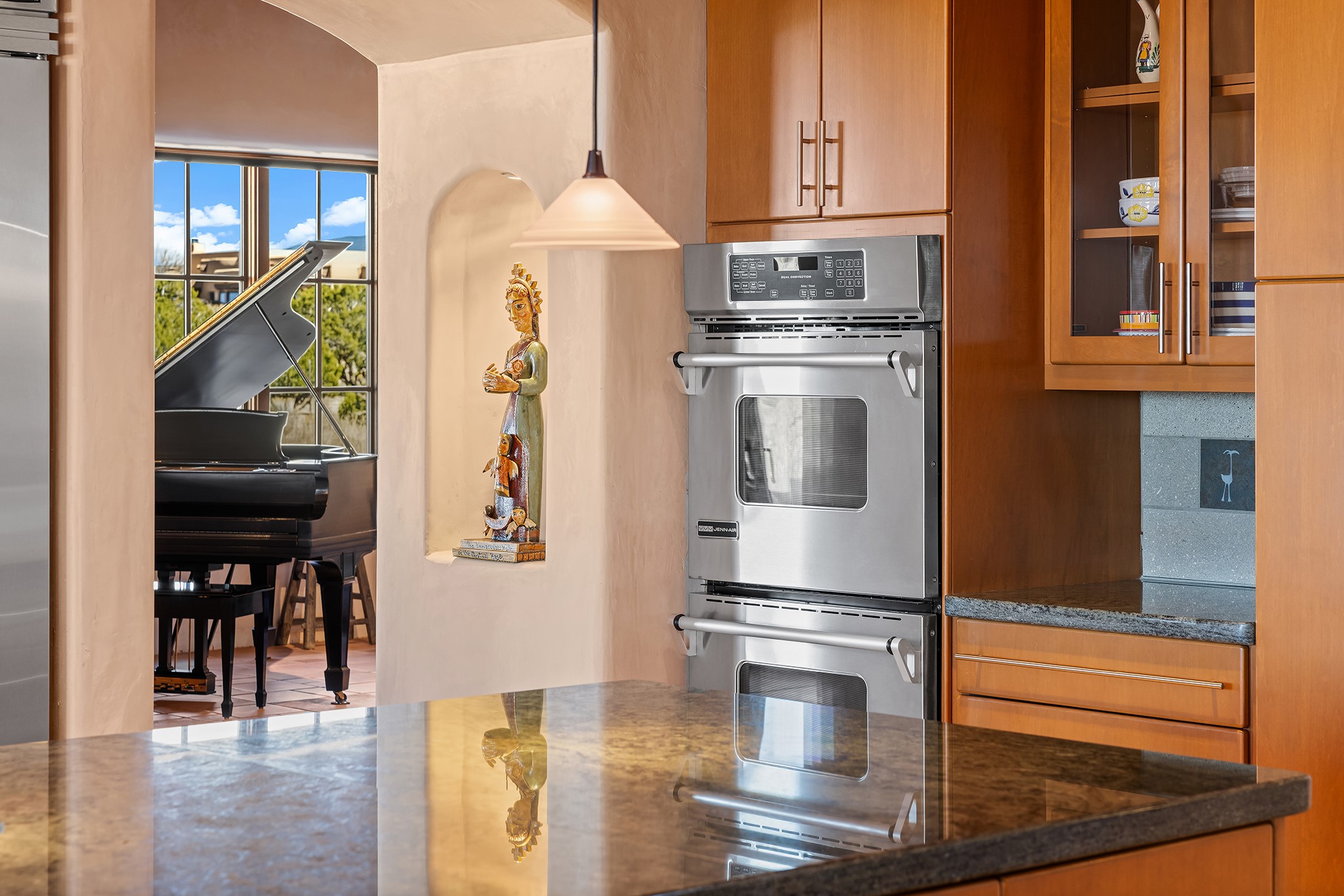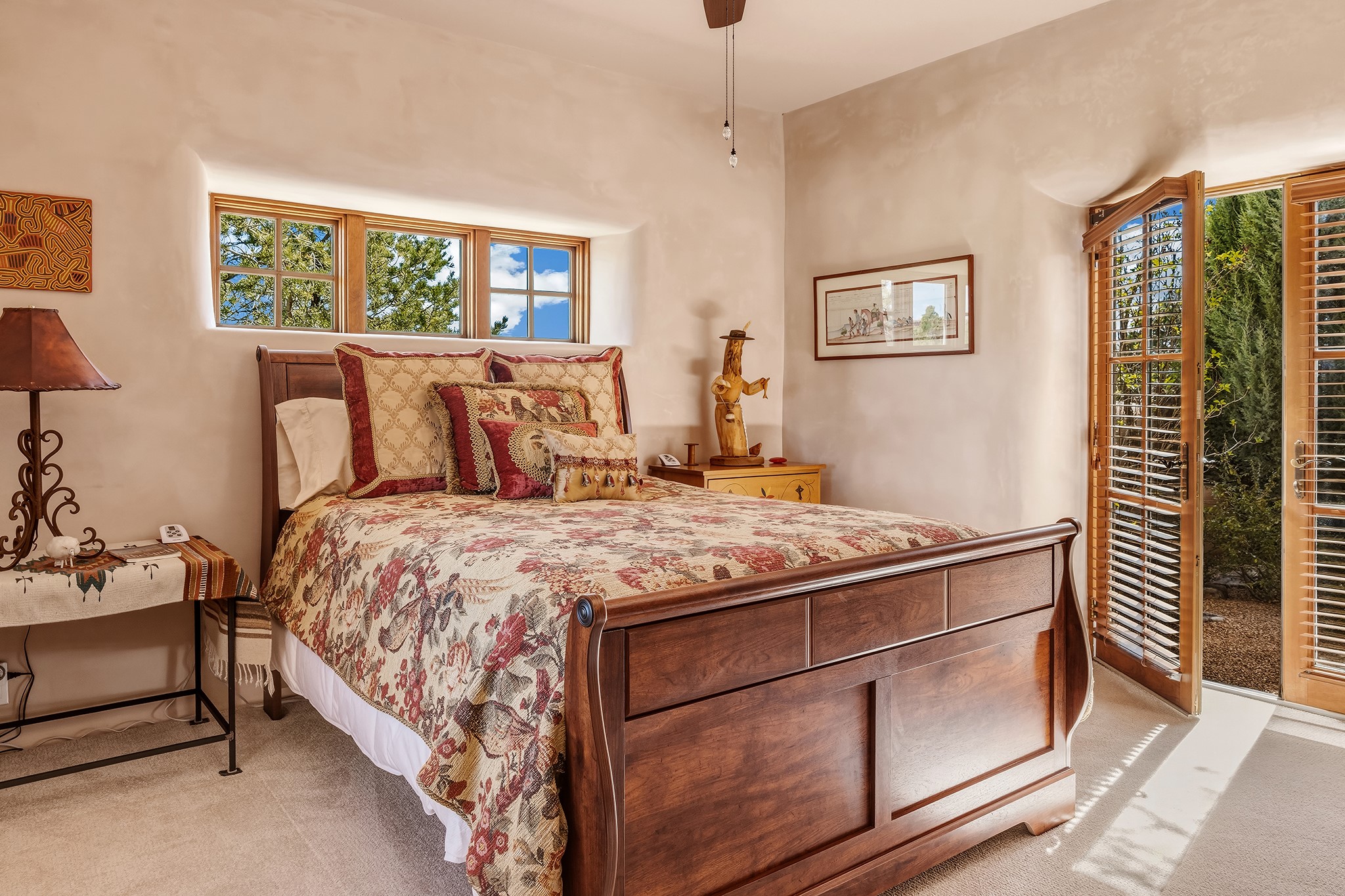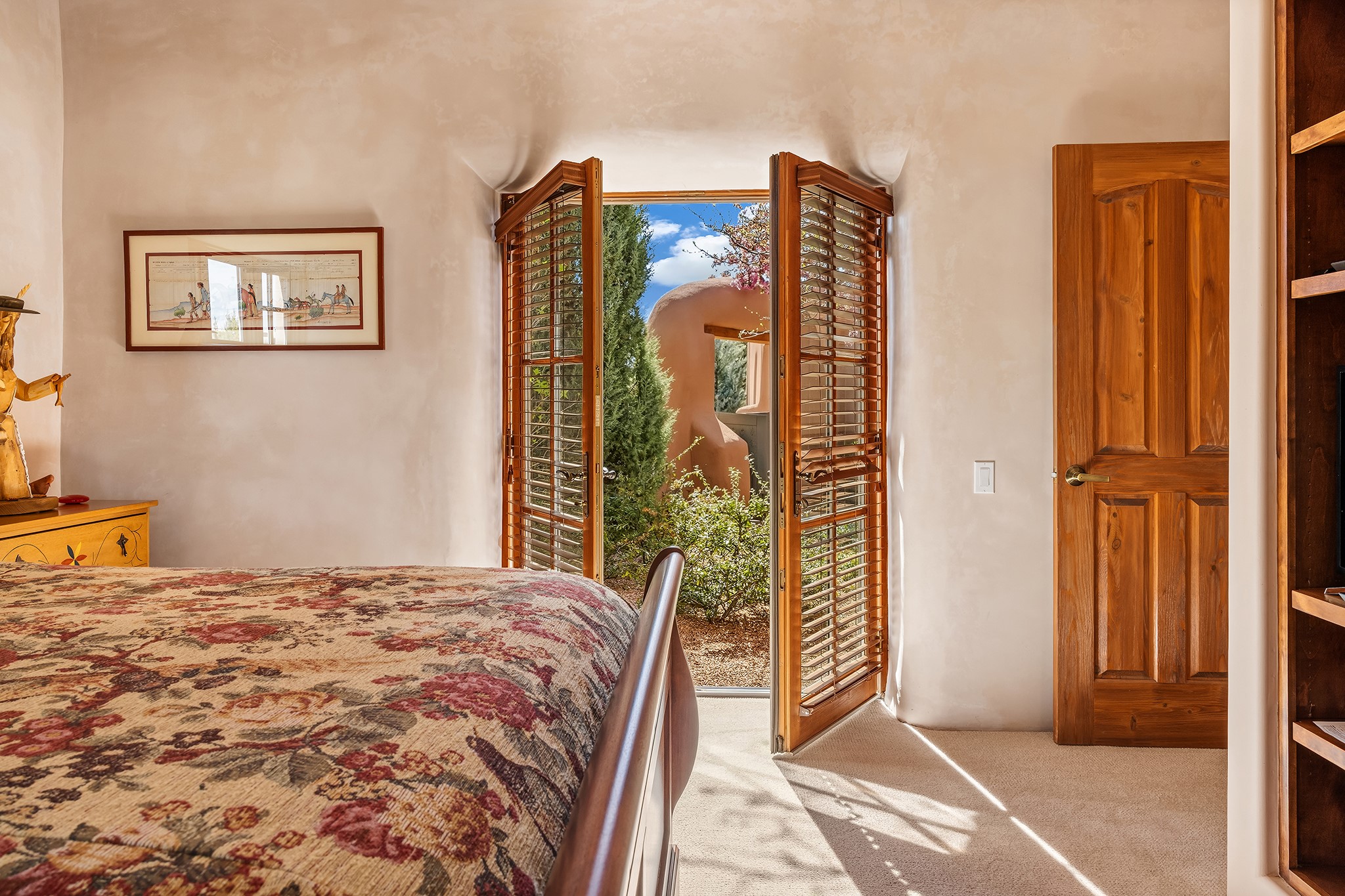 Panoramic views of the Jemez and Sangre de Cristo Mountains set the stage for this beautifully composed 3,833 sq. ft. residence on 2.67 acres in Las Campanas. As you enter the tree-filled front courtyard, a sense of quiet elegance unfolds--an immediate feeling of calm, privacy, and thoughtful design.The entry opens into a formal living room, where vigas fan gracefully toward the horizon, drawing the eye outward to the ever-changing mountain landscape. Just beyond, the dining room opens through glass doors to an expansive covered portal--nearly 1,000 sq. ft.--designed for seamless indoor-outdoor living. An outdoor fireplace and heater create an inviting setting for dining and gathering beneath Santa Fe's vast skies.Arched passageways lead into a striking kitchen and living space, where sculptural curves and a commanding kiva fireplace anchor the room. Granite countertops, stainless steel appliances, double ovens, and a 6-burner gas cooktop are complemented by a generous island with prep sink. A built-in banco offers a quintessential Southwestern moment--casual, intimate, and always oriented toward the view.The primary suite is a private retreat, opening to the portal and framed by breathtaking vistas. Its bath is equally serene, with dual vanities, a soaking tub, and a walk-in shower. A thoughtfully separated guest wing offers two spacious bedrooms, each enjoying its own connection to the surrounding landscape. Even the laundry room captures a quiet view of the front courtyard.Additional features include an 850 sq. ft. three-car garage, radiant in-floor heat, mini-split cooling, new stucco (2021), and a new $120K foam roof to be completed prior to closing.Set on 2.67 acres within Las Campanas, 81 Calle Ventoso W offers a rare opportunity to live immersed in light, landscape, and the timeless beauty of Santa Fe--where every moment is shaped by sky, horizon, and home.