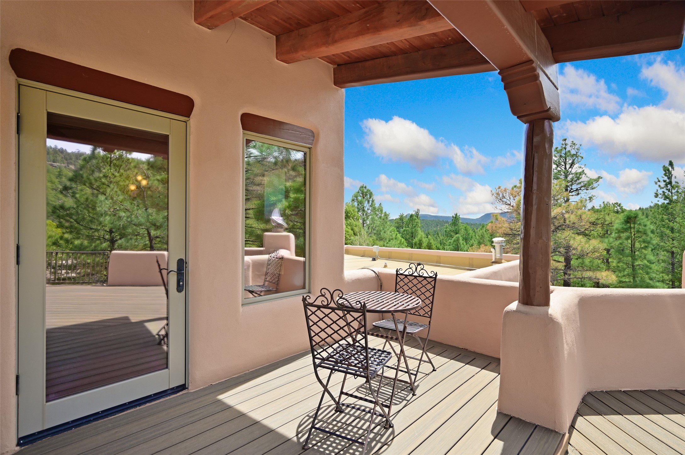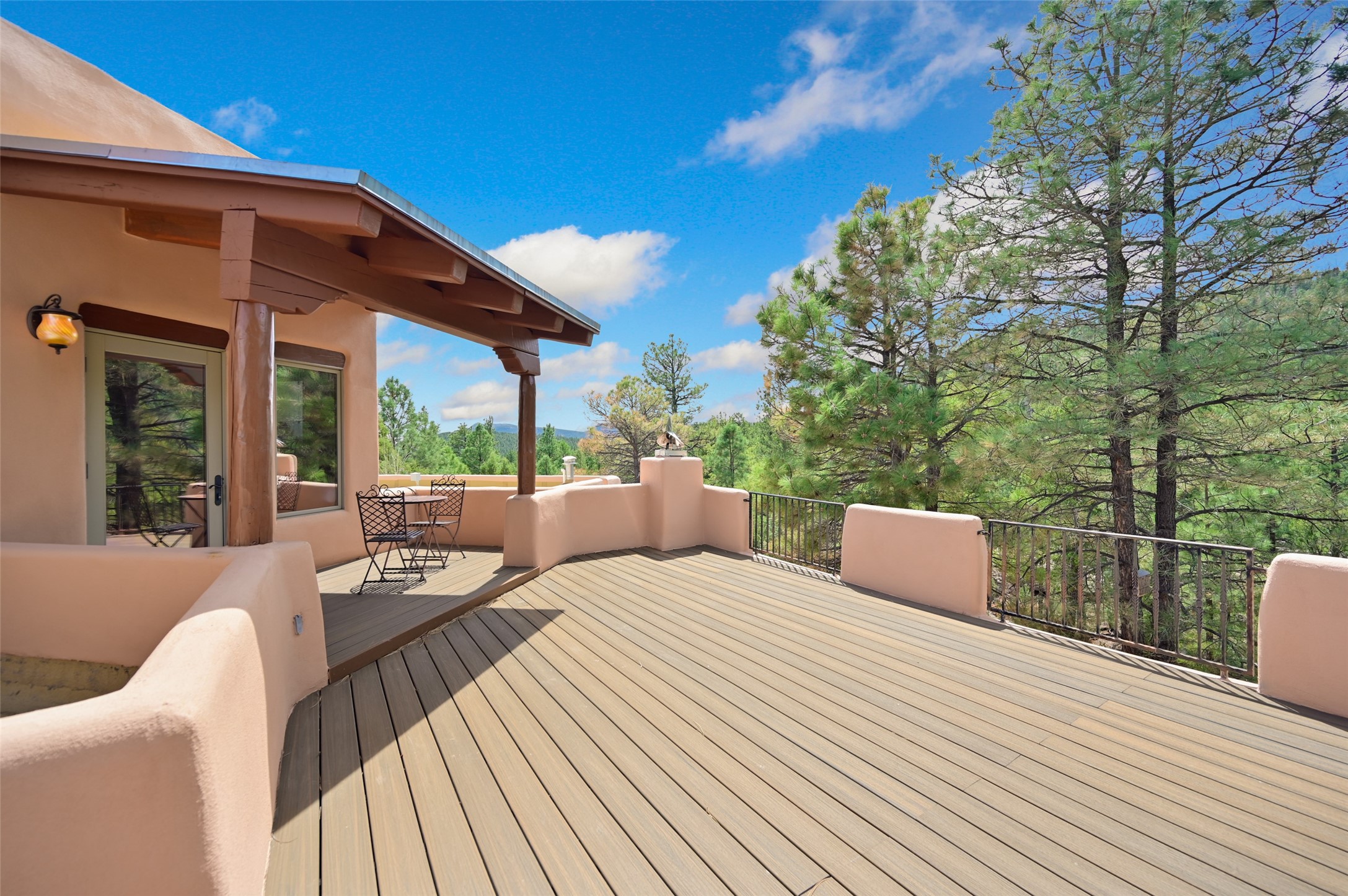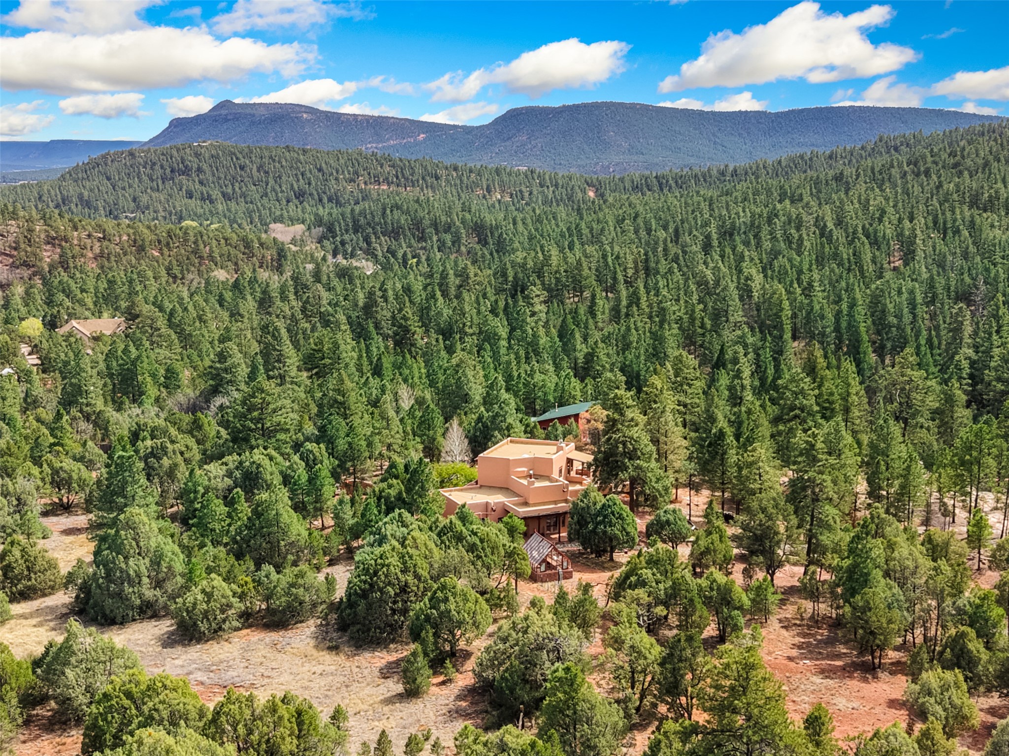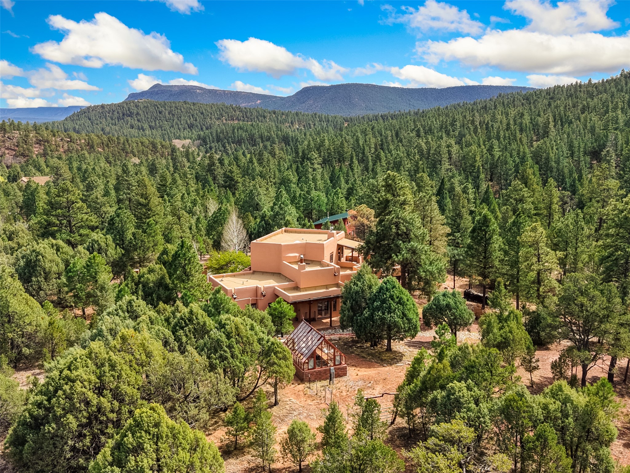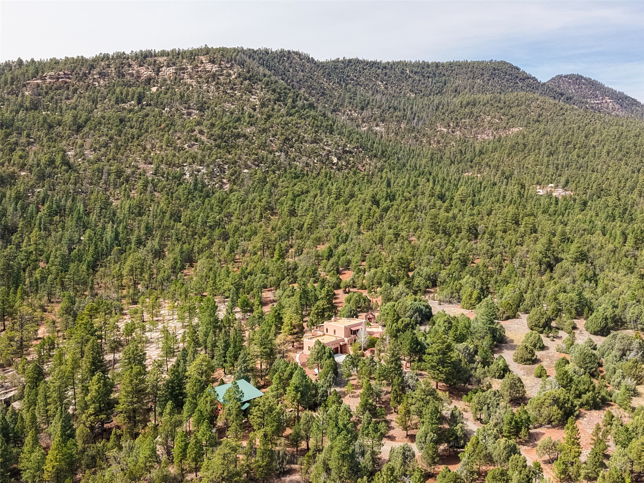Life is beautifully slow at this elegant retreat set on 27+ acres, adjacent to the Santa Fe National Forest. Tucked in a quiet canyon, the main home features a great room with a stone kiva fireplace, a cozy den off the kitchen, dining room, two bedrooms and bath, 1/2 bath and a large utility room area with abundance of storage. The primary suite located on the upper floor of this home offers an additional living area, wood floors, kiva fireplace and a spa-like bathroom with a steam shower, plus a generous deck perfect for enjoying expansive skies both night and day - truly a luxurious treetop perch. The rear of the main home opens to a grand portal - an expansive outdoor living area with plenty of room for entertaining, dining or just relaxing. The kiva fireplace in this roomy portal ensures warmth and cozy ambiance through the various seasons, extending comfortable year-round living to the outdoors. The guest house is a large yet snug, comfortable and warm space for your guests. The rear of this space opens to a deck overlooking the forest creating a wonderful experience for family and friends. The interior has a kitchenette and wood stove enhancing the livability of this great space. This property is located at the end of the trail/road and entry to the property is through a custom gate.