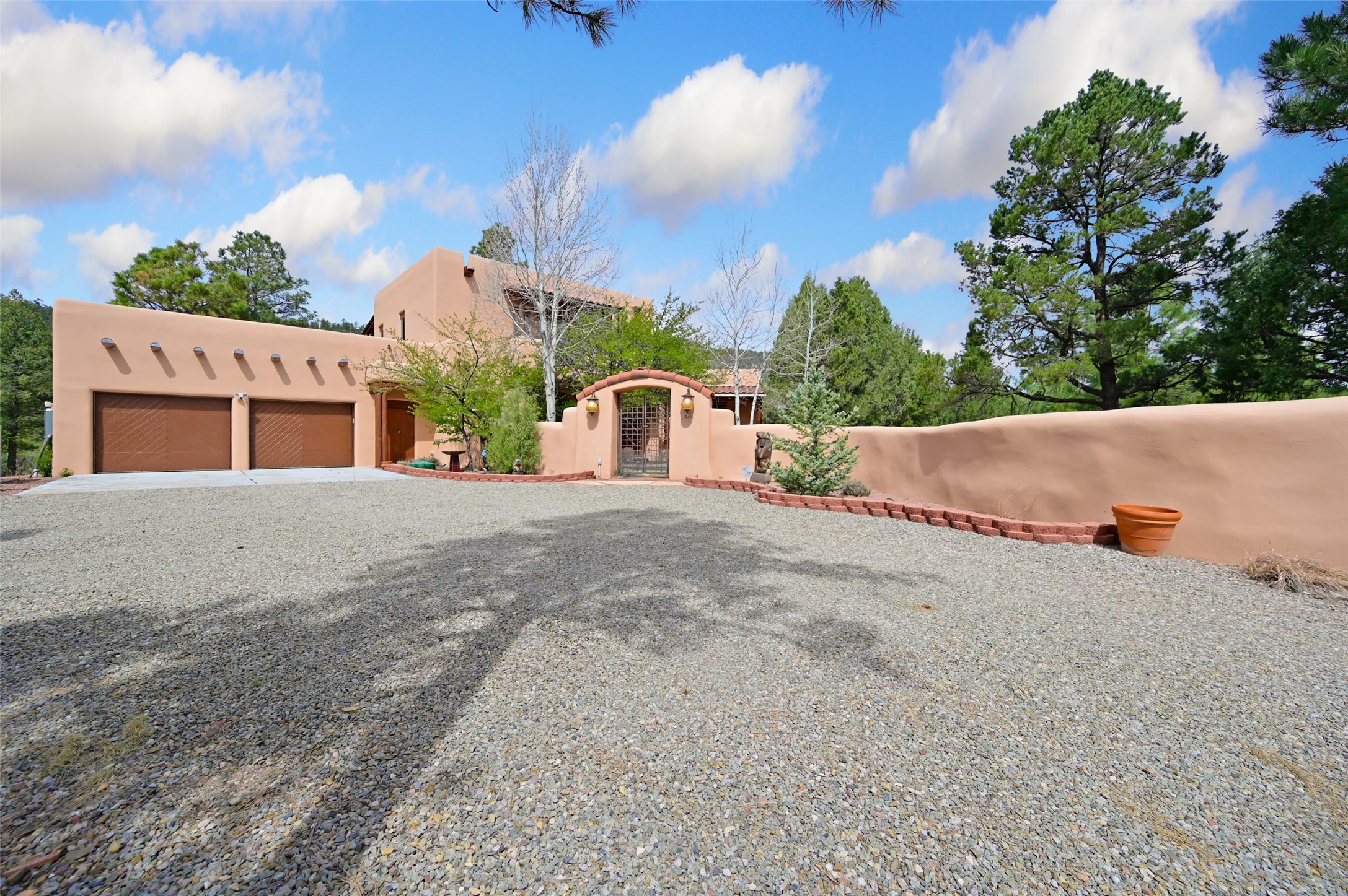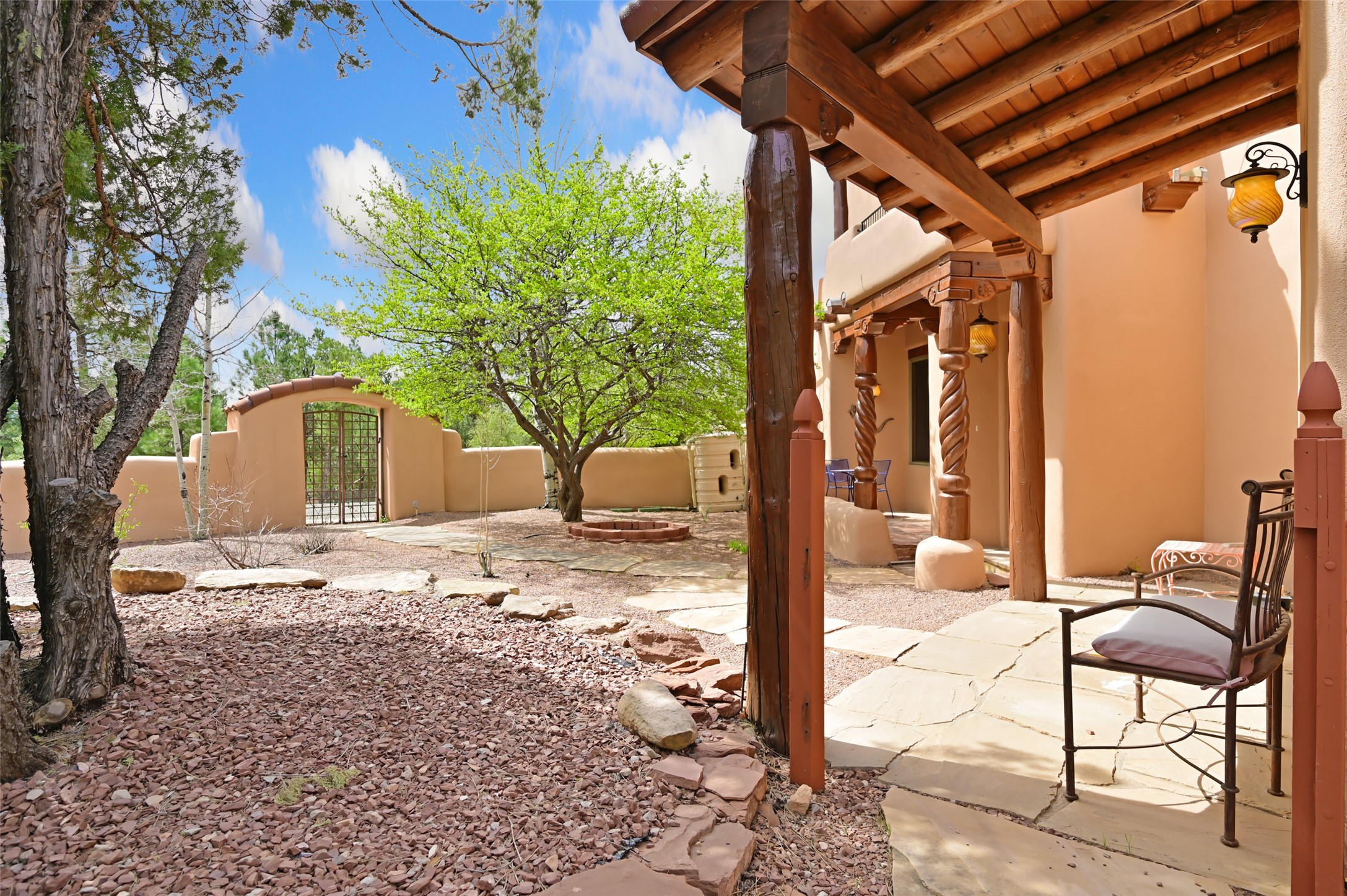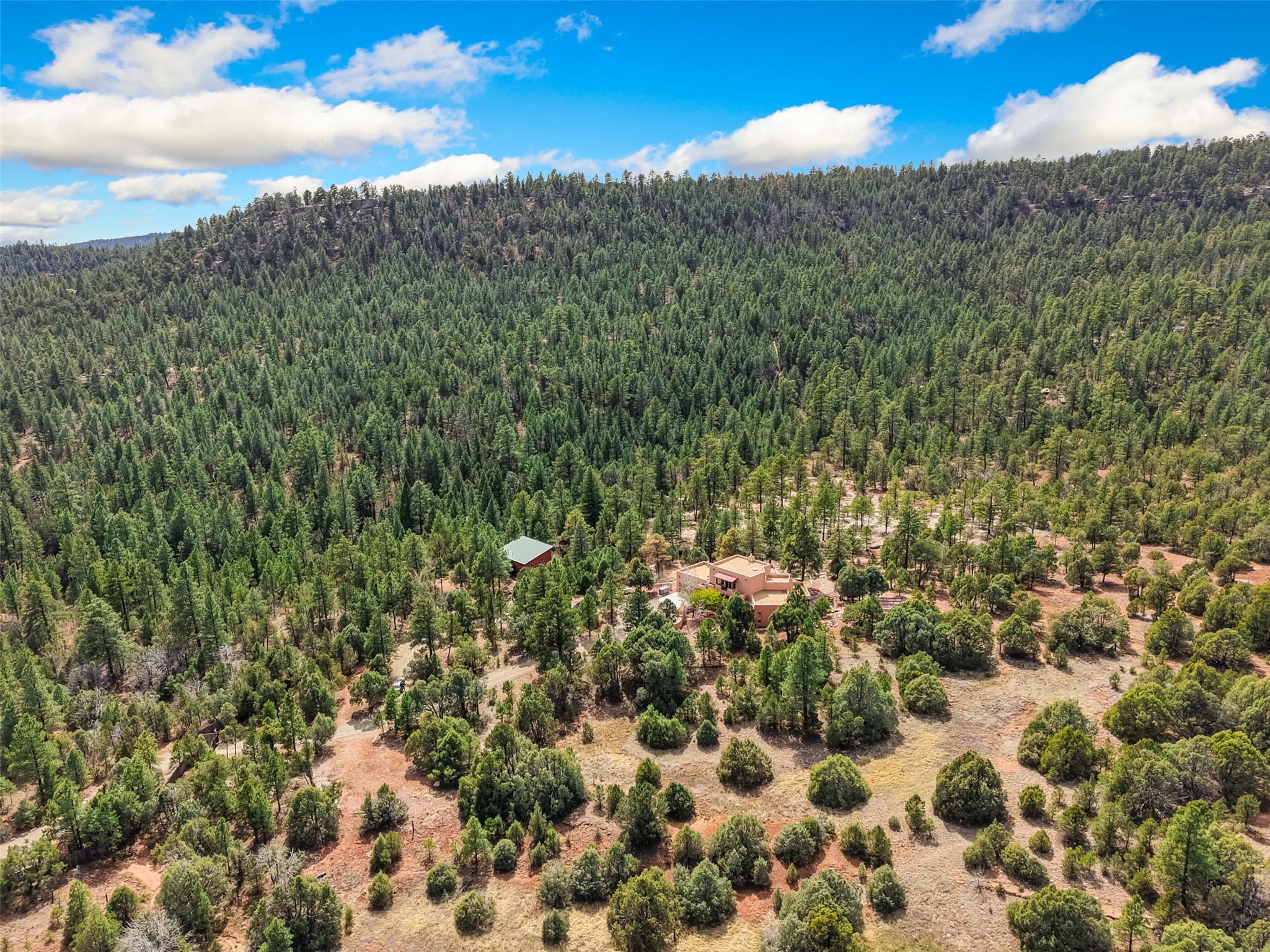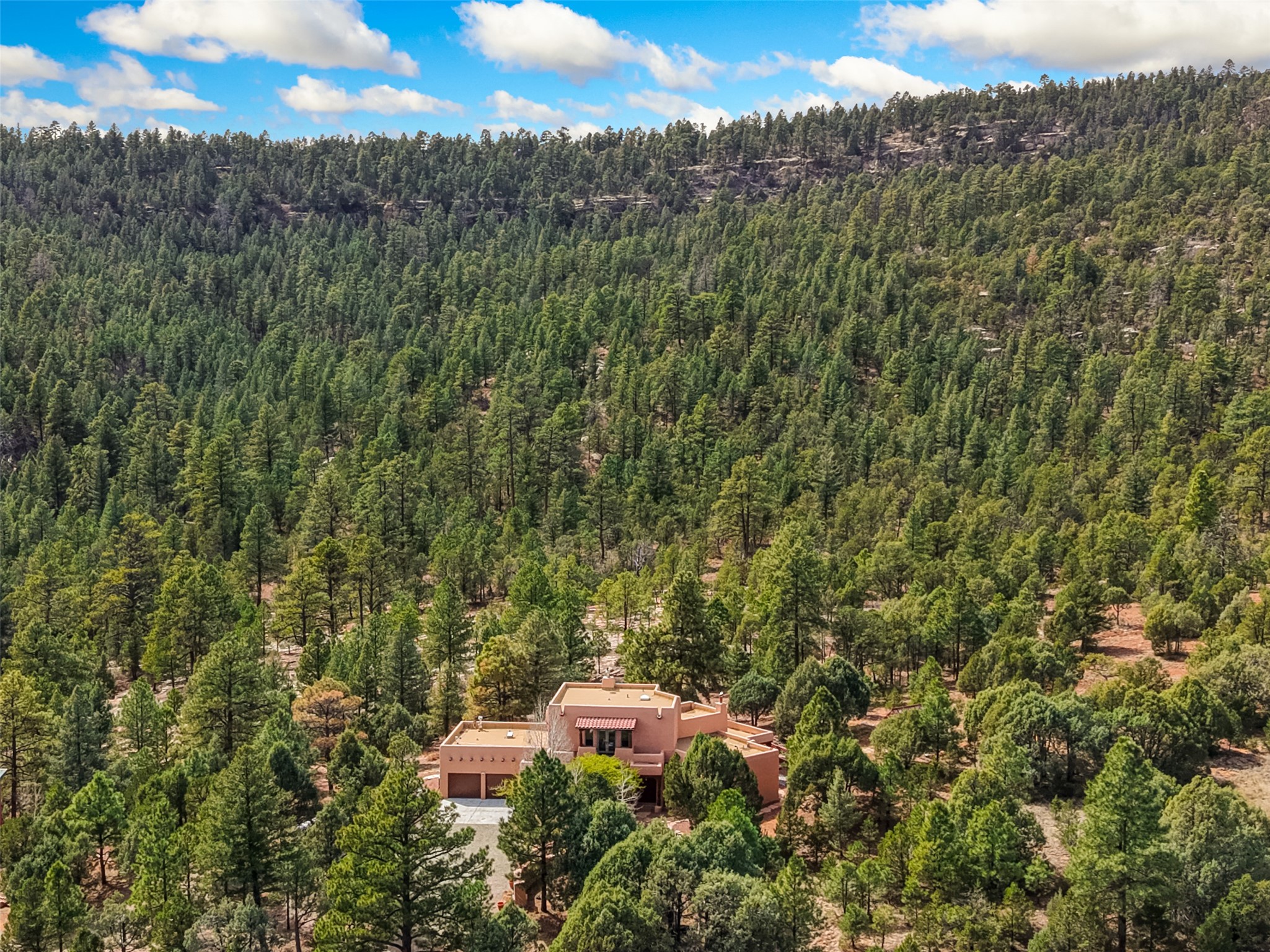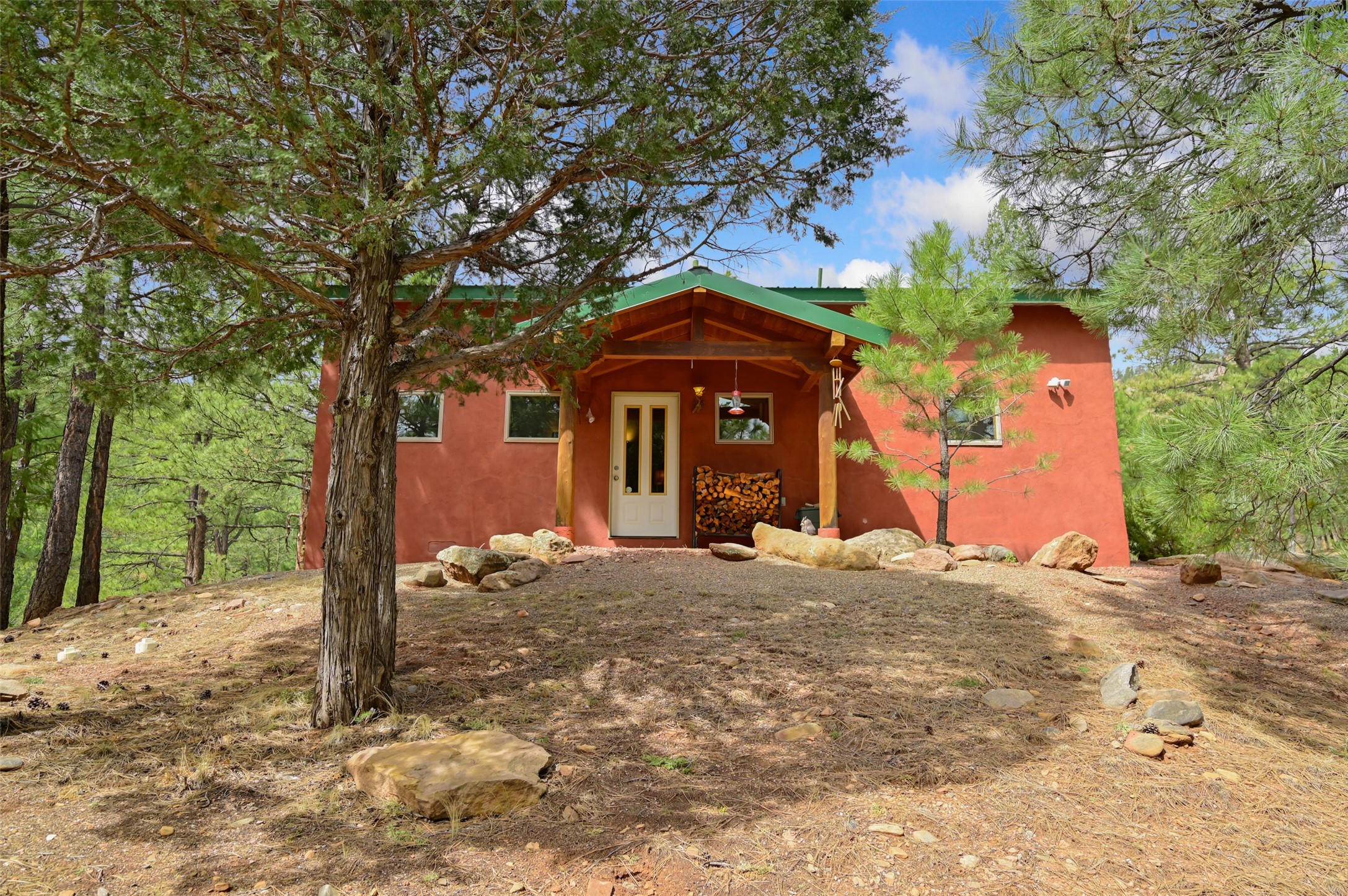 Life is beautifully slow at this elegant retreat set on 27+ acres, adjacent to the Santa Fe National Forest. Tucked in a quiet canyon, the main home features a great room with a stone kiva fireplace, a cozy den off the kitchen, dining room, two bedrooms and bath, 1/2 bath and a large utility room area with abundance of storage. The primary suite located on the upper floor of this home offers an additional living area, wood floors, kiva fireplace and a spa-like bathroom with a steam shower, plus a generous deck perfect for enjoying expansive skies both night and day - truly a luxurious treetop perch. The rear of the main home opens to a grand portal - an expansive outdoor living area with plenty of room for entertaining, dining or just relaxing. The kiva fireplace in this roomy portal ensures warmth and cozy ambiance through the various seasons, extending comfortable year-round living to the outdoors. The guest house is a large yet snug, comfortable and warm space for your guests. The rear of this space opens to a deck overlooking the forest creating a wonderful experience for family and friends. The interior has a kitchenette and wood stove enhancing the livability of this great space. This property is located at the end of the trail/road and entry to the property is through a custom gate.