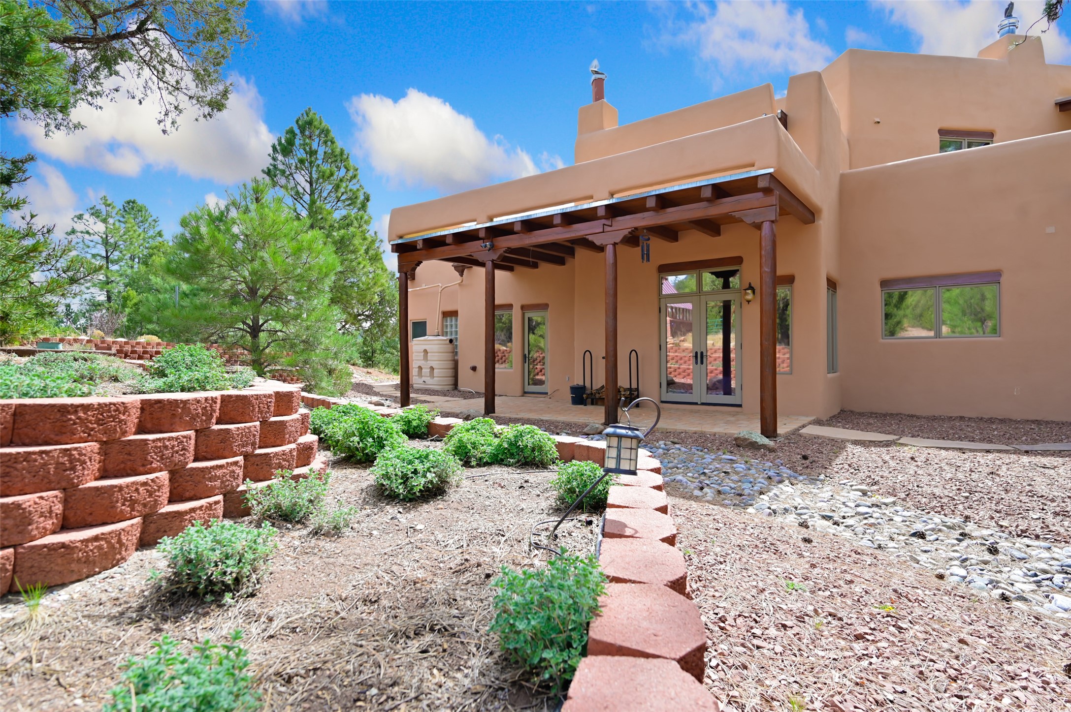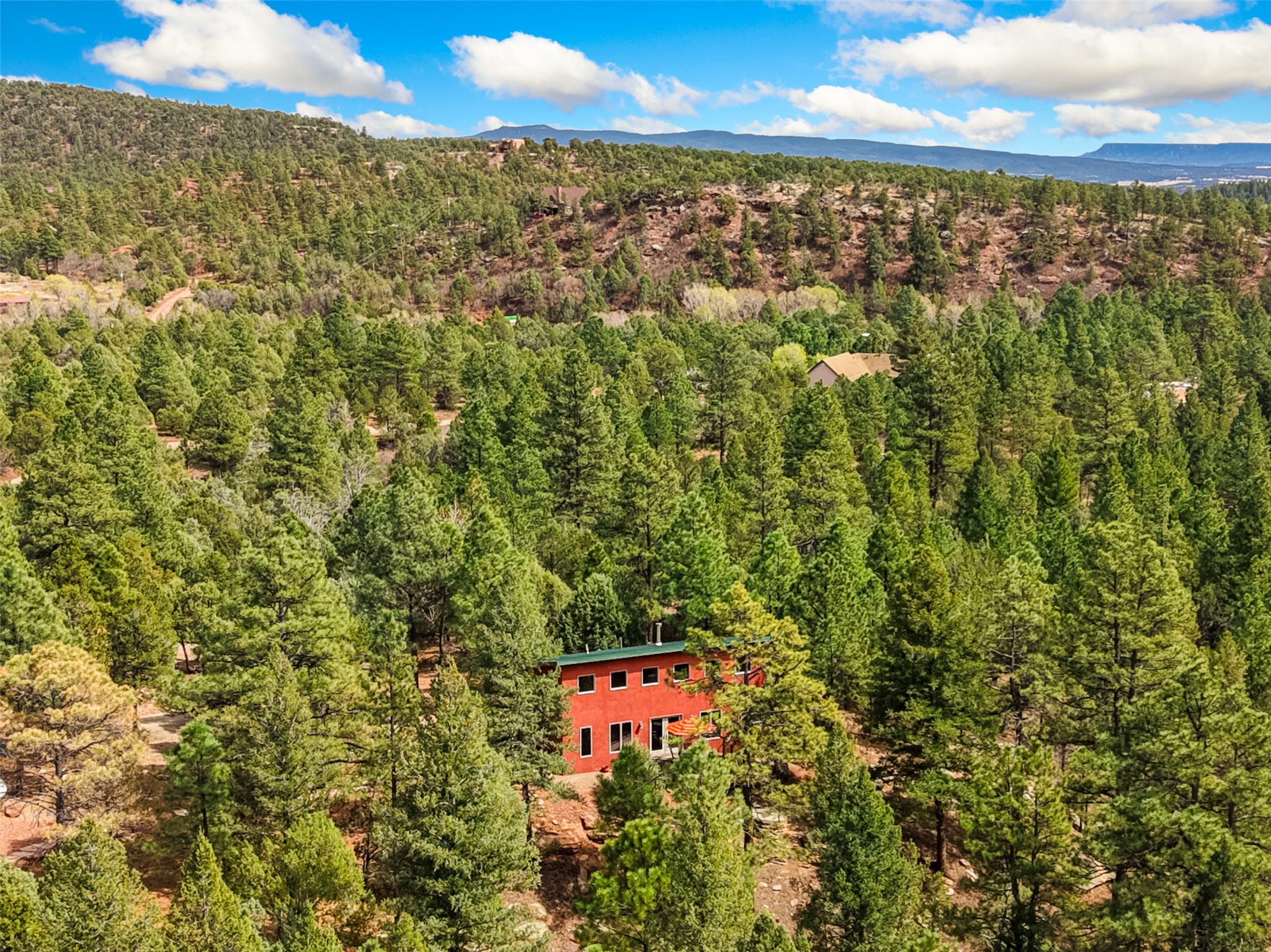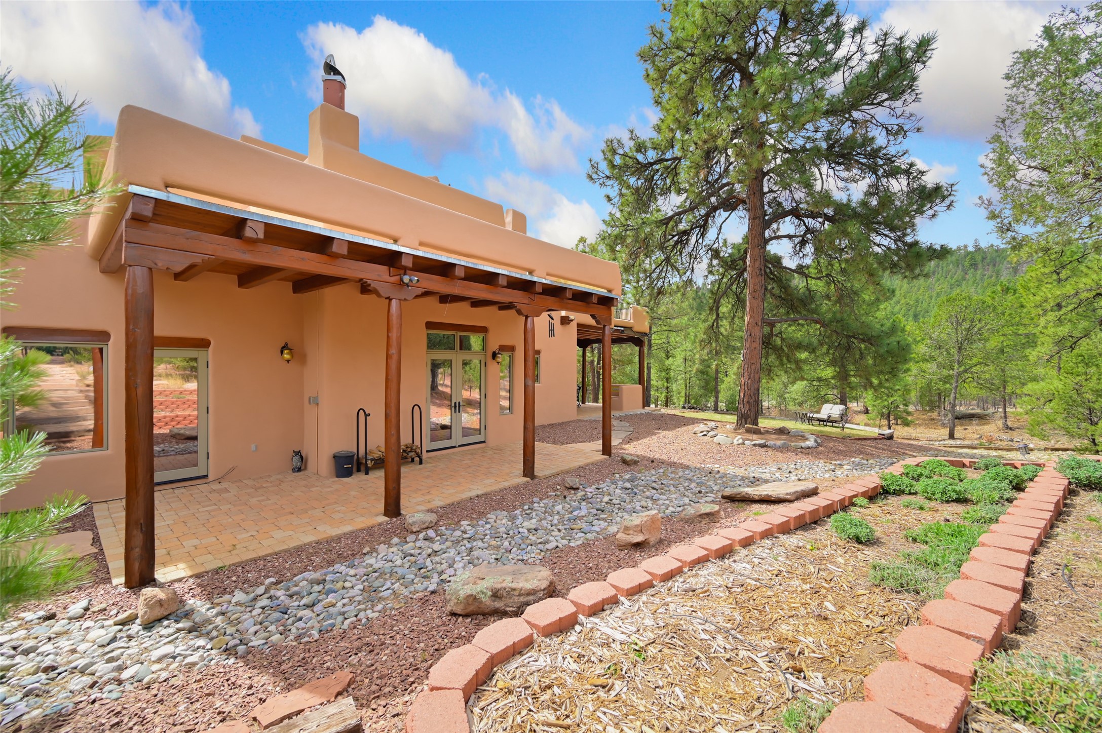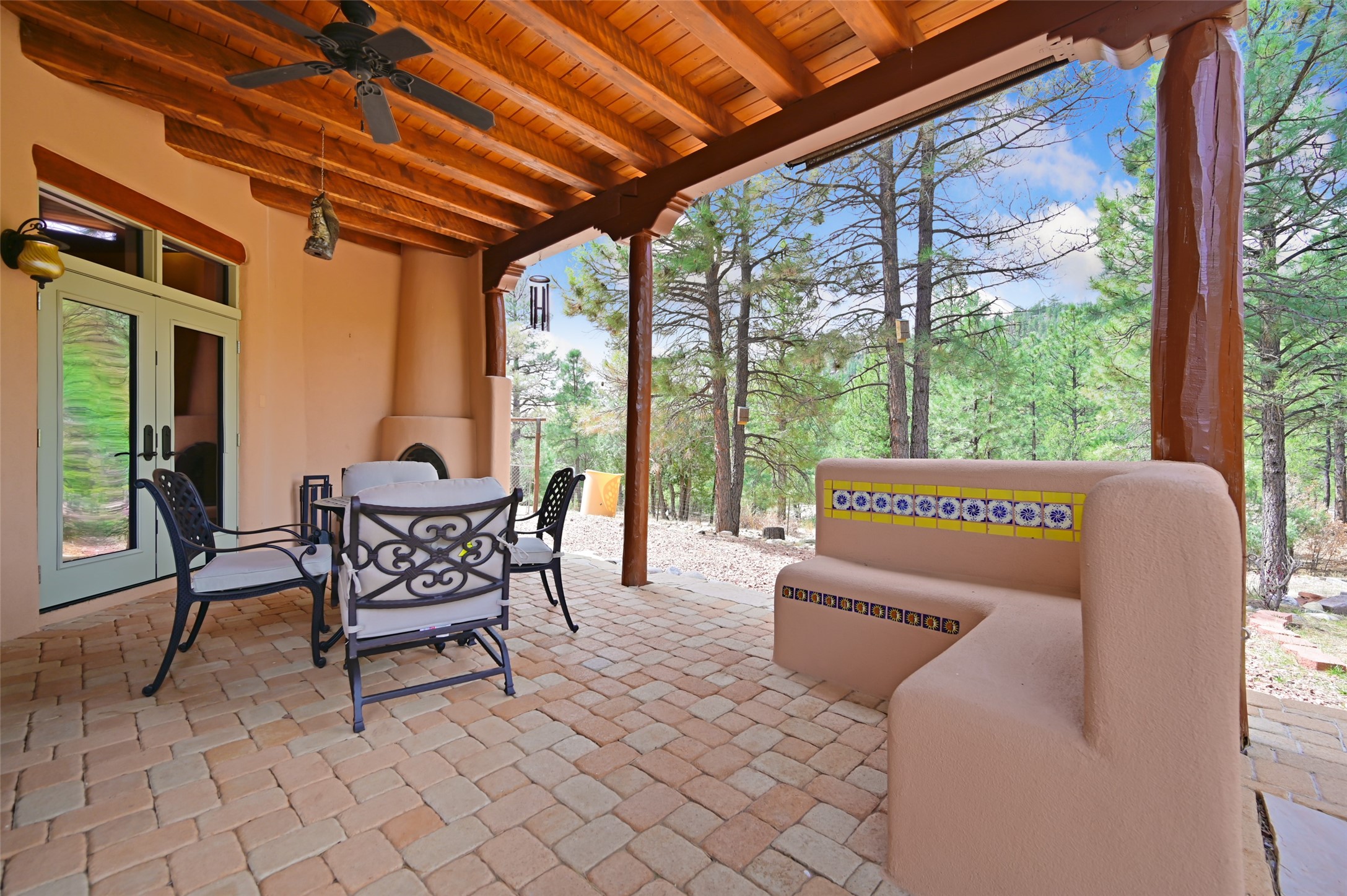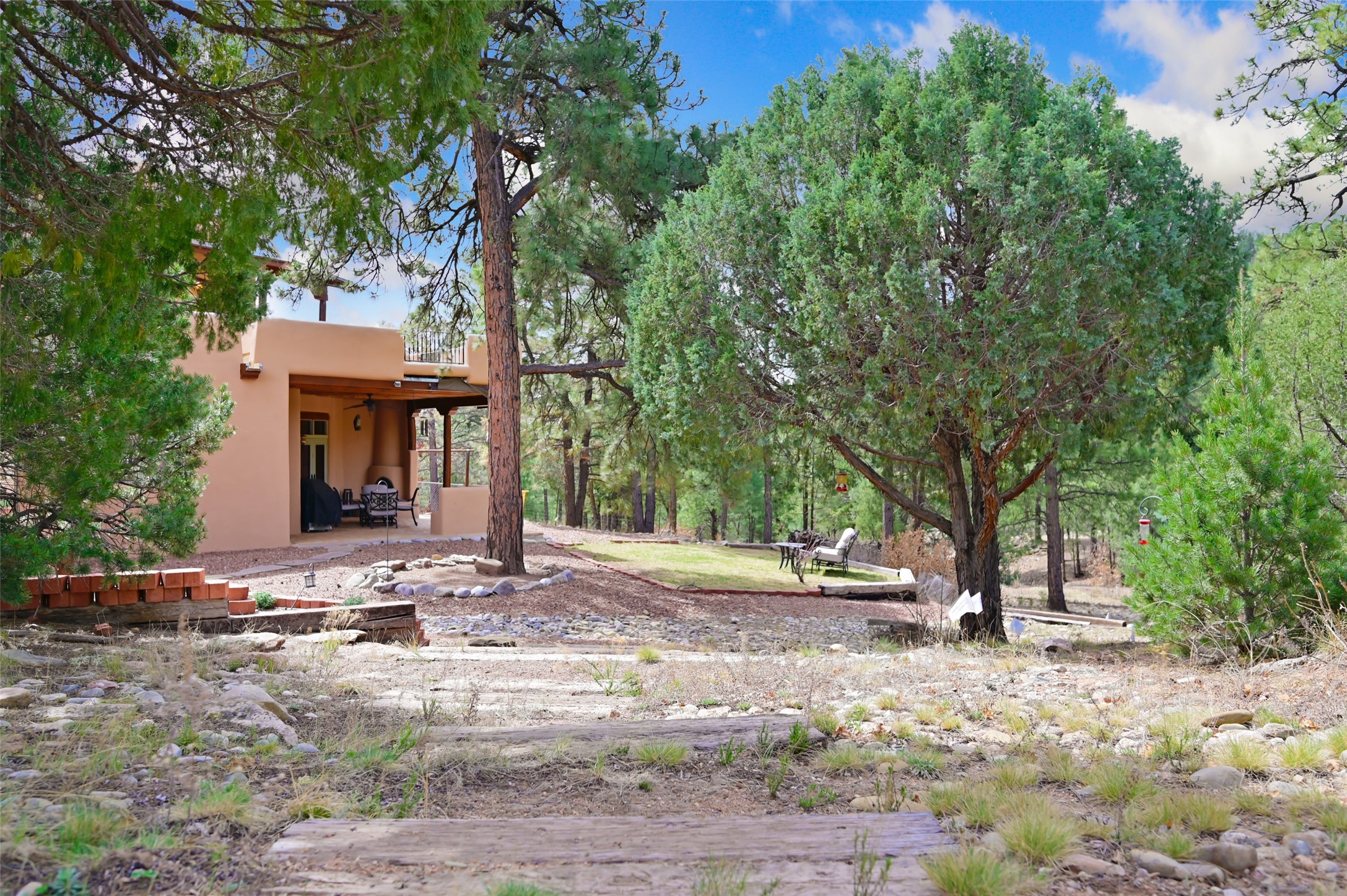 Life is beautifully slow at this elegant retreat set on 27+ acres, adjacent to the Santa Fe National Forest. Tucked in a quiet canyon, the main home features a great room with a stone kiva fireplace, a cozy den off the kitchen, dining room, two bedrooms and bath, 1/2 bath and a large utility room area with abundance of storage. The primary suite located on the upper floor of this home offers an additional living area, wood floors, kiva fireplace and a spa-like bathroom with a steam shower, plus a generous deck perfect for enjoying expansive skies both night and day - truly a luxurious treetop perch. The rear of the main home opens to a grand portal - an expansive outdoor living area with plenty of room for entertaining, dining or just relaxing. The kiva fireplace in this roomy portal ensures warmth and cozy ambiance through the various seasons, extending comfortable year-round living to the outdoors. The guest house is a large yet snug, comfortable and warm space for your guests. The rear of this space opens to a deck overlooking the forest creating a wonderful experience for family and friends. The interior has a kitchenette and wood stove enhancing the livability of this great space. This property is located at the end of the trail/road and entry to the property is through a custom gate.