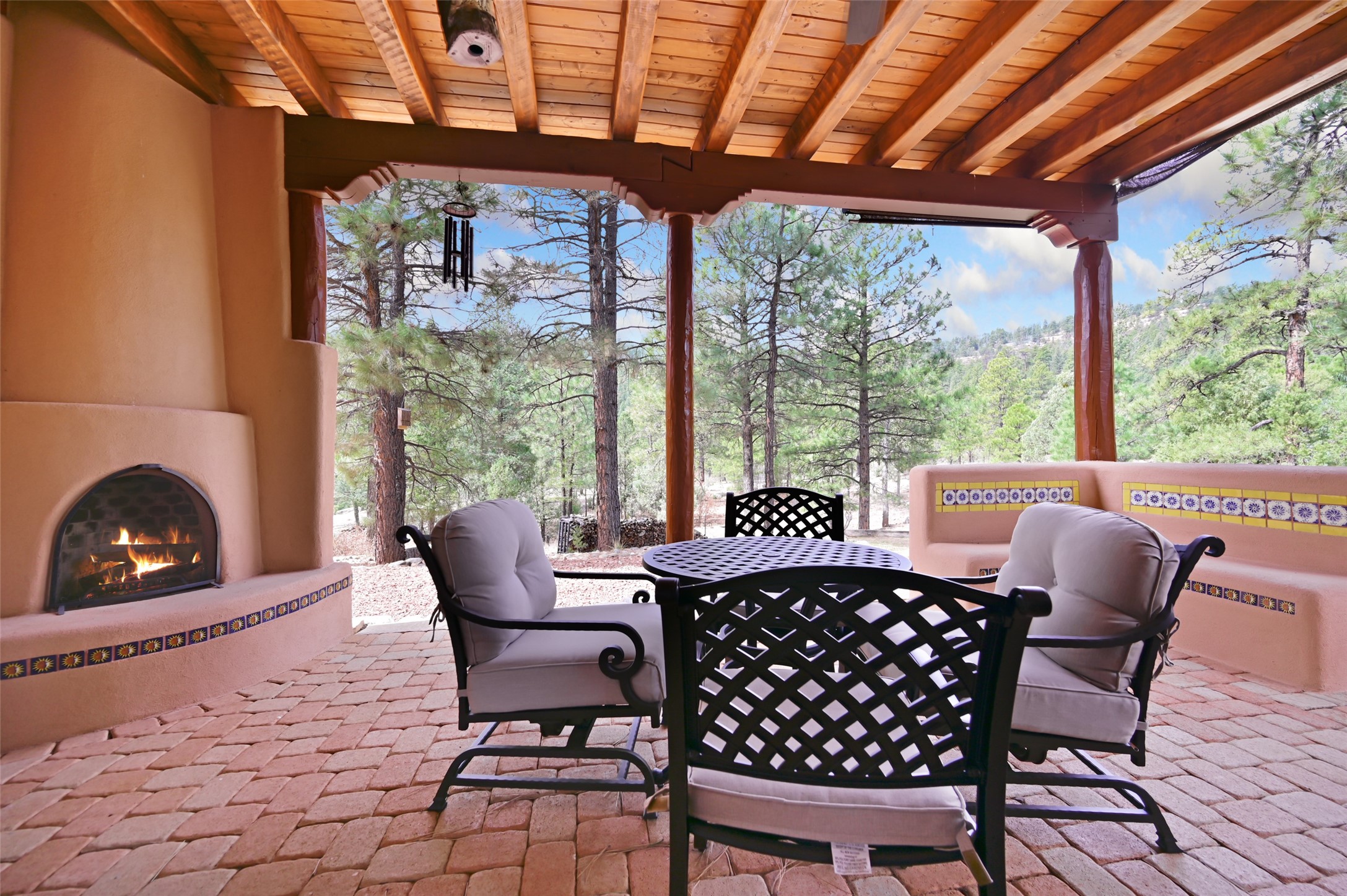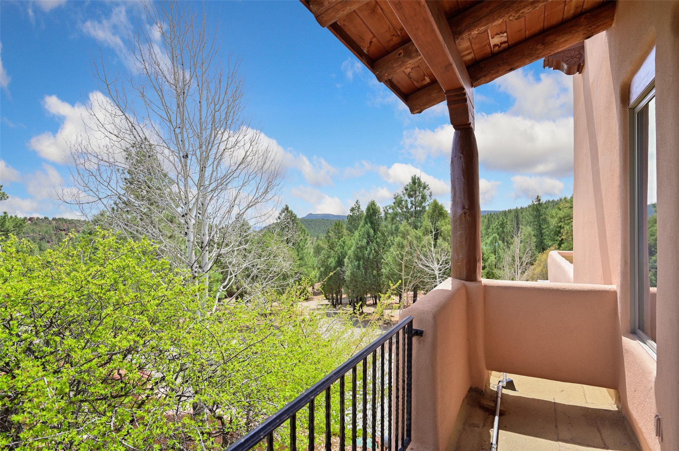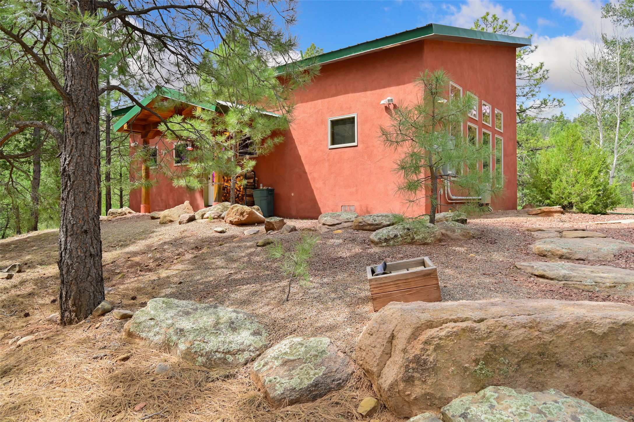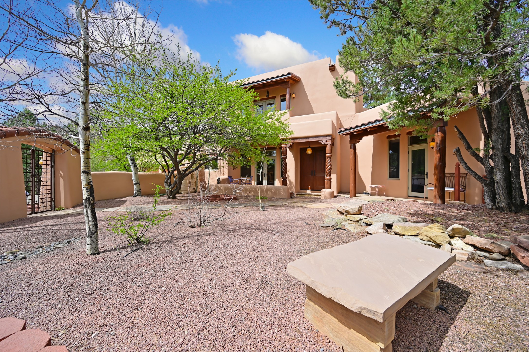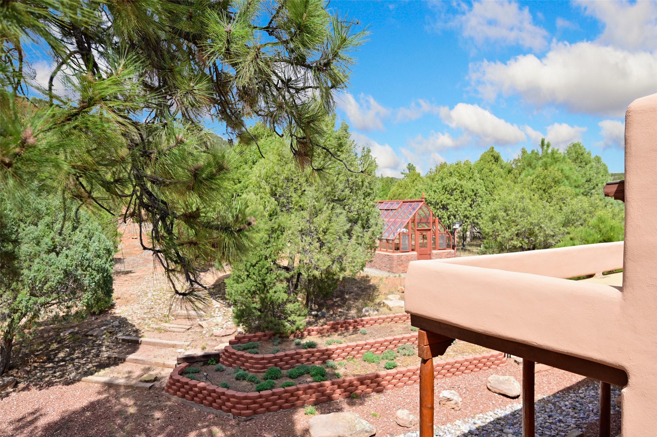Life is beautifully slow at this elegant retreat set on 27+ acres, adjacent to the Santa Fe National Forest. Tucked in a quiet canyon, the main home features a great room with a stone kiva fireplace, a cozy den off the kitchen, dining room, two bedrooms and bath, 1/2 bath and a large utility room area with abundance of storage. The primary suite located on the upper floor of this home offers an additional living area, wood floors, kiva fireplace and a spa-like bathroom with a steam shower, plus a generous deck perfect for enjoying expansive skies both night and day - truly a luxurious treetop perch. The rear of the main home opens to a grand portal - an expansive outdoor living area with plenty of room for entertaining, dining or just relaxing. The kiva fireplace in this roomy portal ensures warmth and cozy ambiance through the various seasons, extending comfortable year-round living to the outdoors. The guest house is a large yet snug, comfortable and warm space for your guests. The rear of this space opens to a deck overlooking the forest creating a wonderful experience for family and friends. The interior has a kitchenette and wood stove enhancing the livability of this great space. This property is located at the end of the trail/road and entry to the property is through a custom gate.