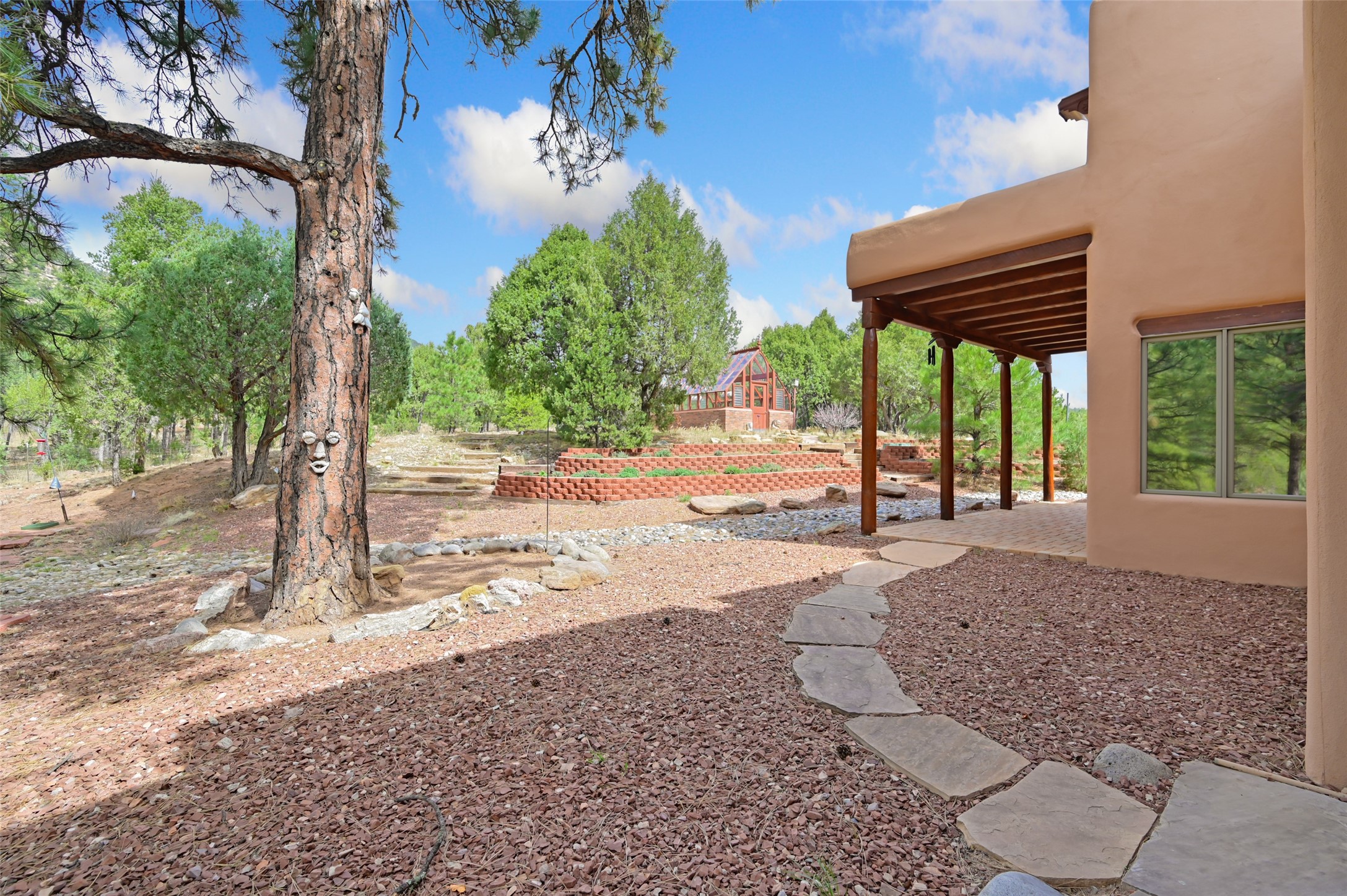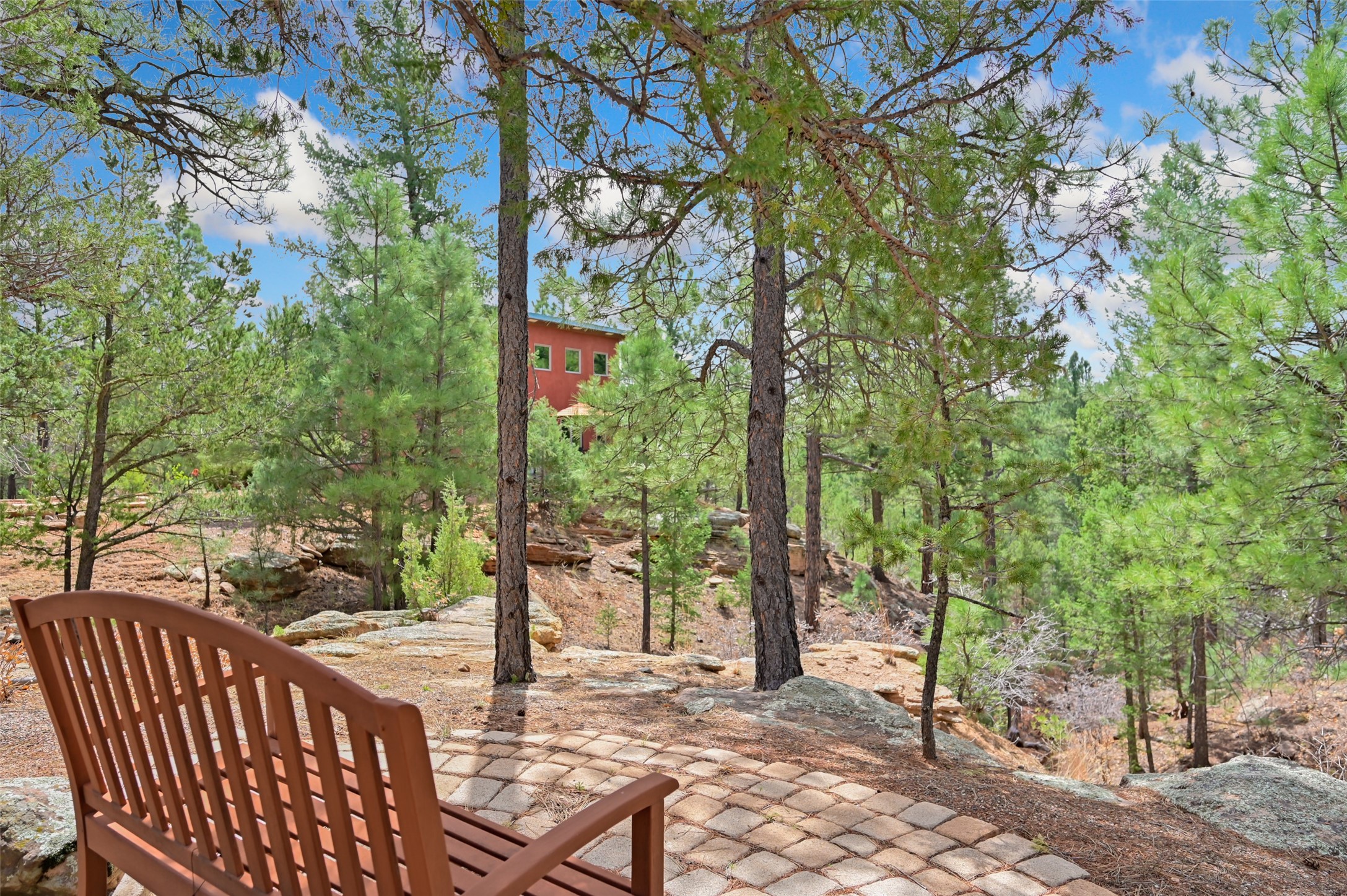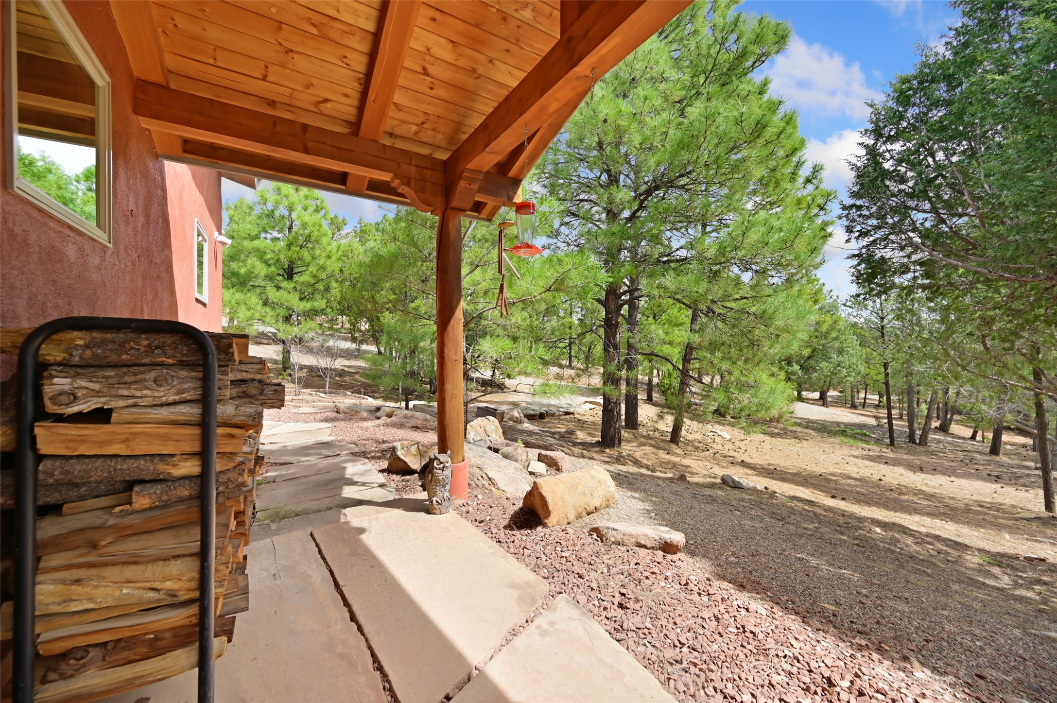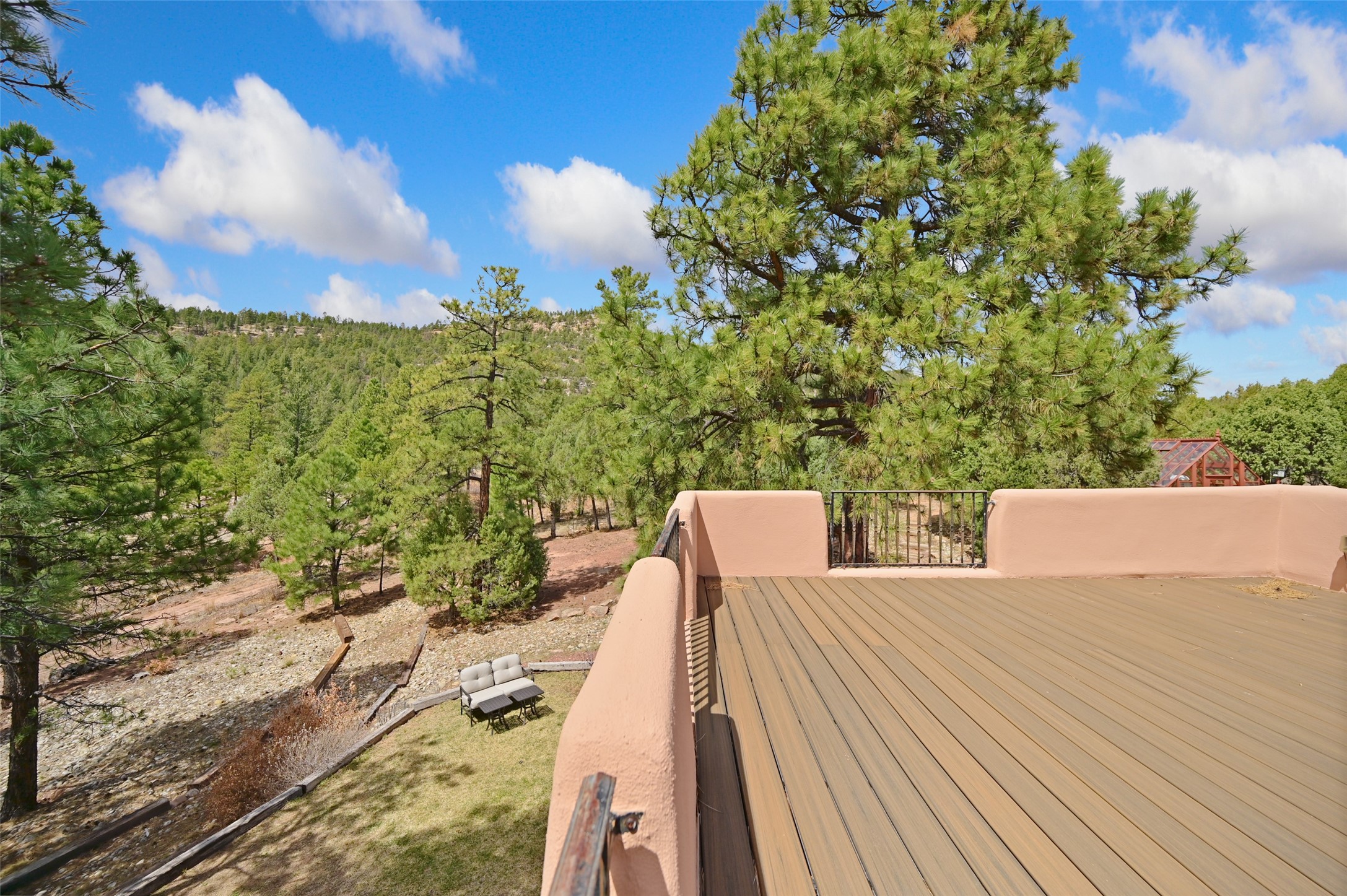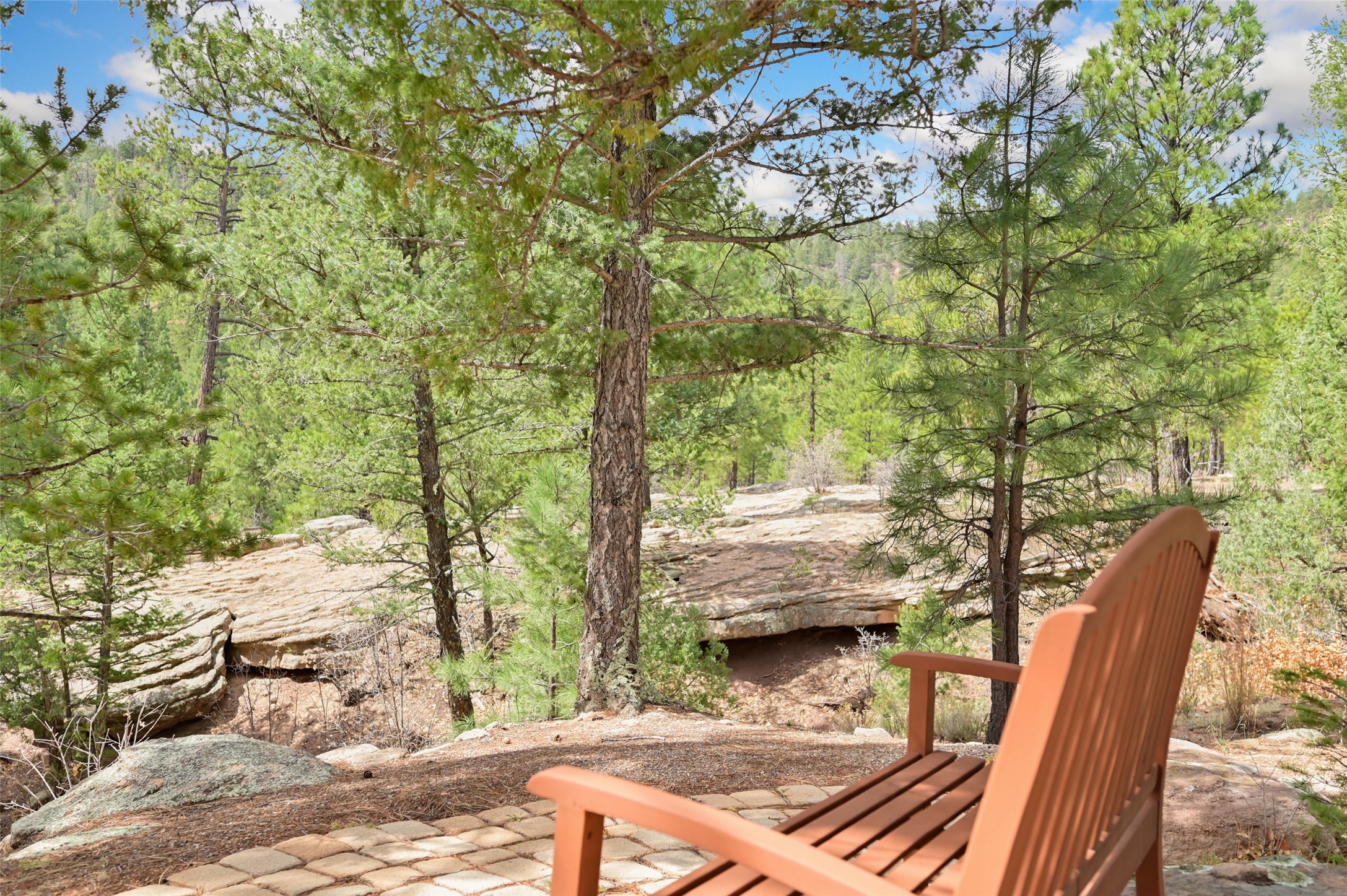 Life is beautifully slow at this elegant retreat set on 27+ acres, adjacent to the Santa Fe National Forest. Tucked in a quiet canyon, the main home features a great room with a stone kiva fireplace, a cozy den off the kitchen, dining room, two bedrooms and bath, 1/2 bath and a large utility room area with abundance of storage. The primary suite located on the upper floor of this home offers an additional living area, wood floors, kiva fireplace and a spa-like bathroom with a steam shower, plus a generous deck perfect for enjoying expansive skies both night and day - truly a luxurious treetop perch. The rear of the main home opens to a grand portal - an expansive outdoor living area with plenty of room for entertaining, dining or just relaxing. The kiva fireplace in this roomy portal ensures warmth and cozy ambiance through the various seasons, extending comfortable year-round living to the outdoors. The guest house is a large yet snug, comfortable and warm space for your guests. The rear of this space opens to a deck overlooking the forest creating a wonderful experience for family and friends. The interior has a kitchenette and wood stove enhancing the livability of this great space. This property is located at the end of the trail/road and entry to the property is through a custom gate.