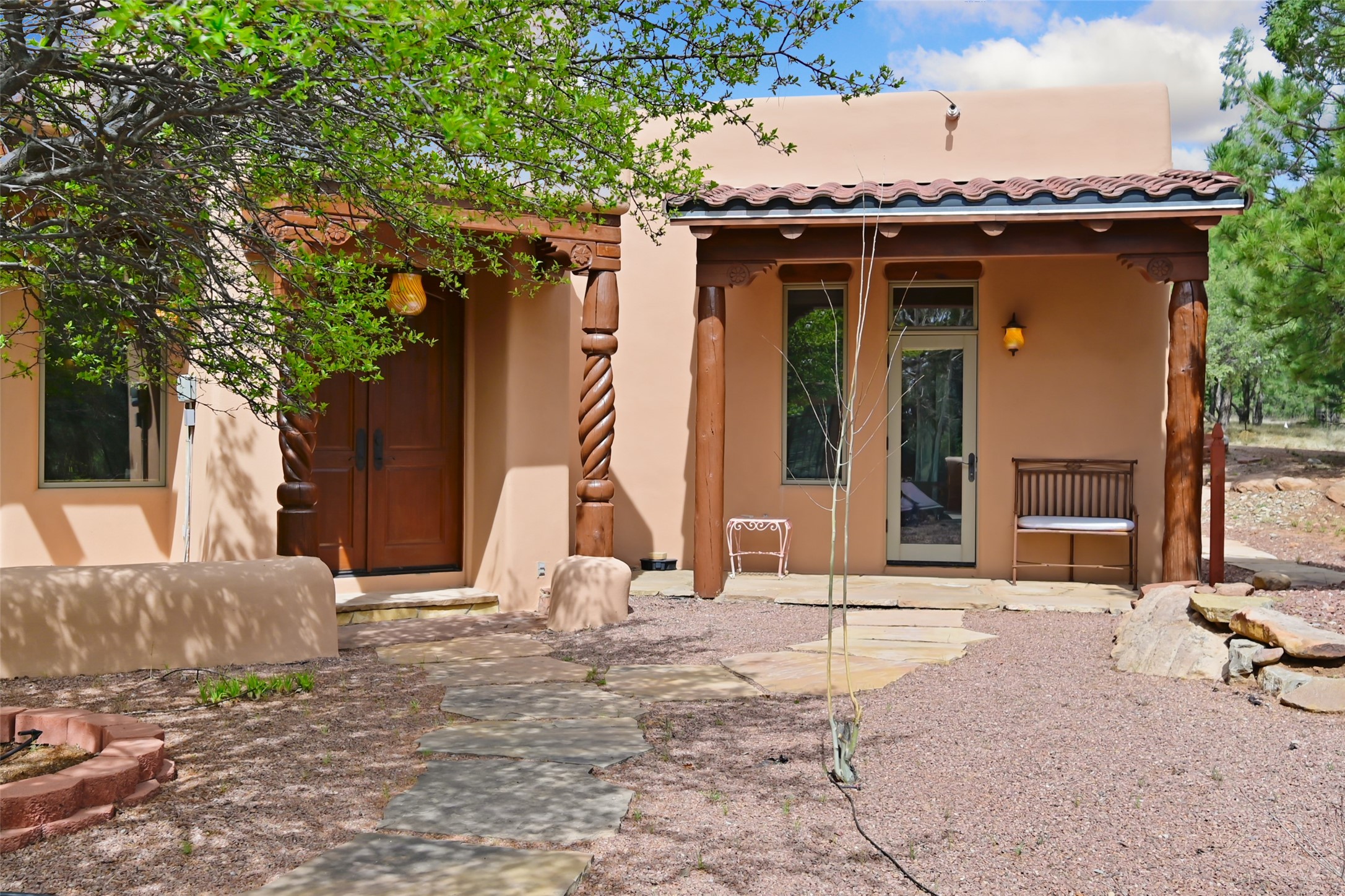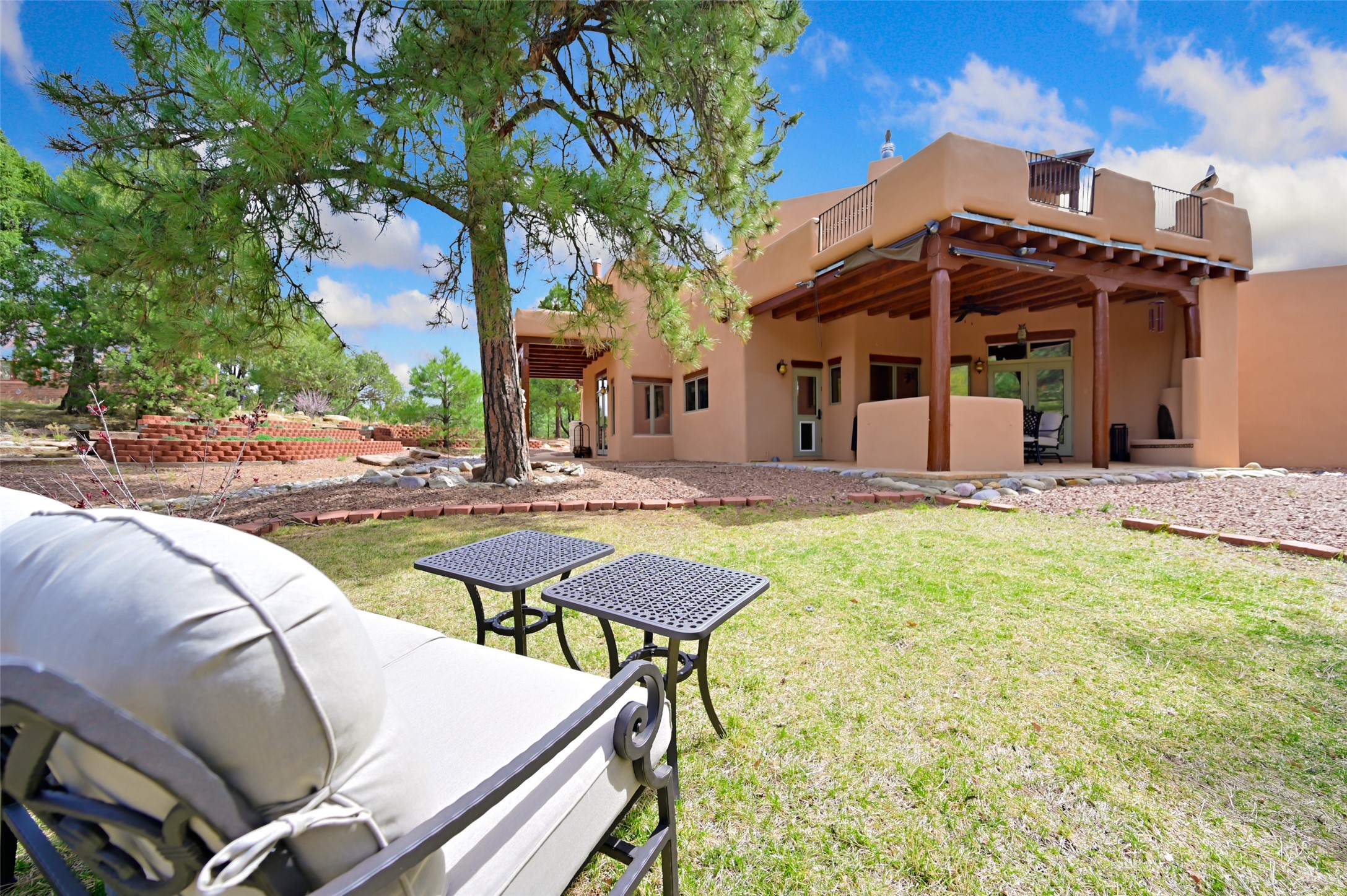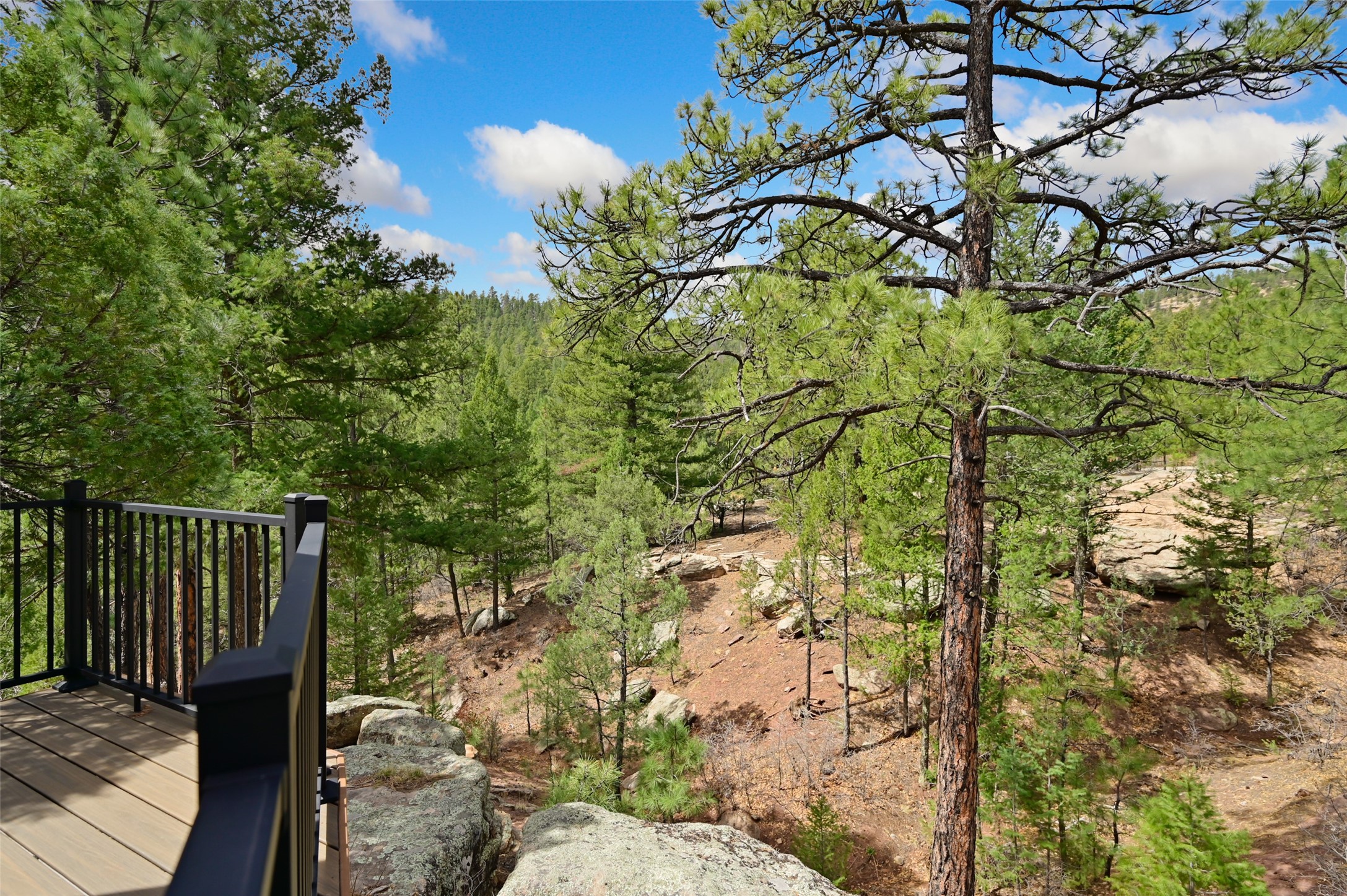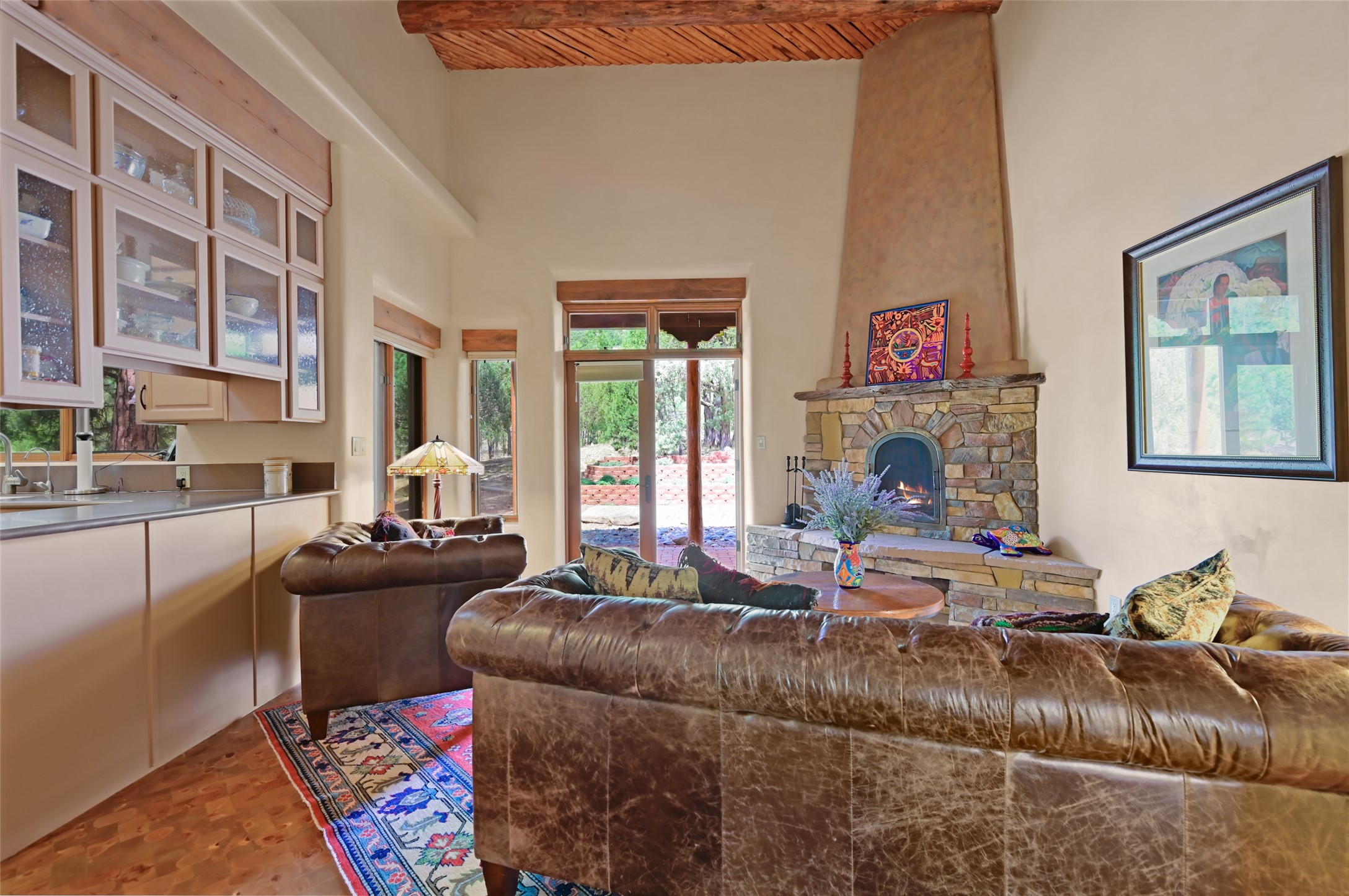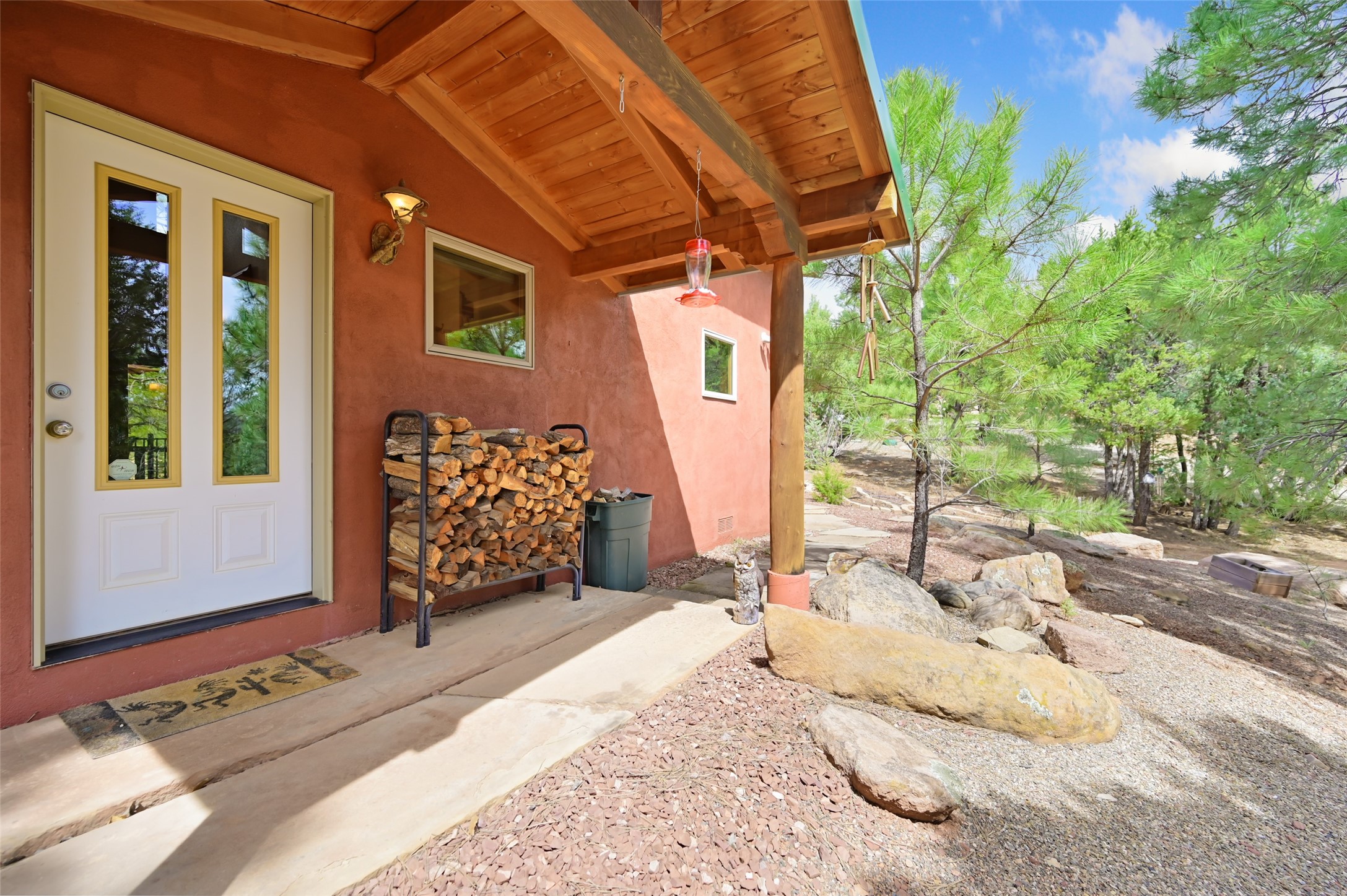 Life is beautifully slow at this elegant retreat set on 27+ acres, adjacent to the Santa Fe National Forest. Tucked in a quiet canyon, the main home features a great room with a stone kiva fireplace, a cozy den off the kitchen, dining room, two bedrooms and bath, 1/2 bath and a large utility room area with abundance of storage. The primary suite located on the upper floor of this home offers an additional living area, wood floors, kiva fireplace and a spa-like bathroom with a steam shower, plus a generous deck perfect for enjoying expansive skies both night and day - truly a luxurious treetop perch. The rear of the main home opens to a grand portal - an expansive outdoor living area with plenty of room for entertaining, dining or just relaxing. The kiva fireplace in this roomy portal ensures warmth and cozy ambiance through the various seasons, extending comfortable year-round living to the outdoors. The guest house is a large yet snug, comfortable and warm space for your guests. The rear of this space opens to a deck overlooking the forest creating a wonderful experience for family and friends. The interior has a kitchenette and wood stove enhancing the livability of this great space. This property is located at the end of the trail/road and entry to the property is through a custom gate.