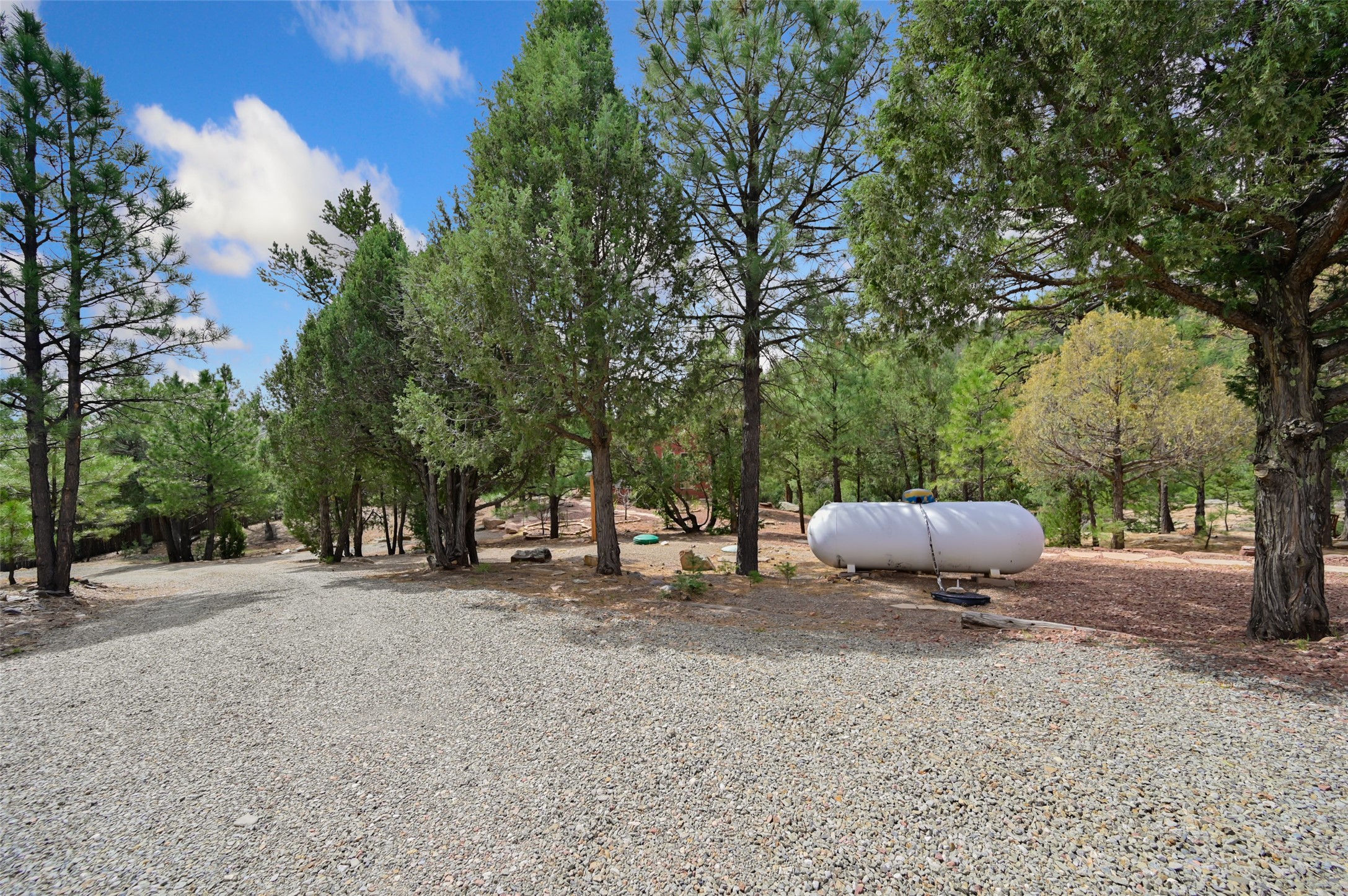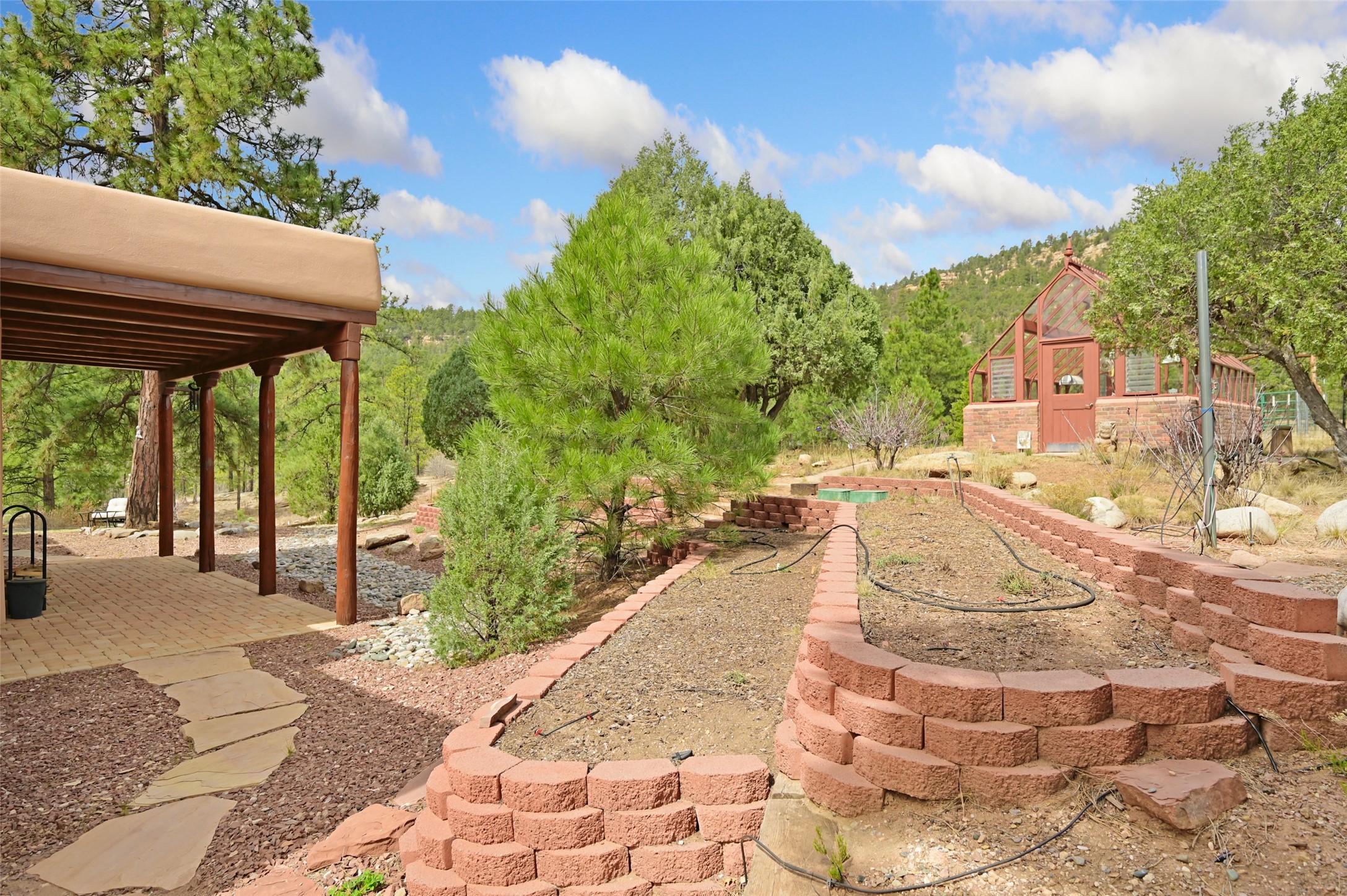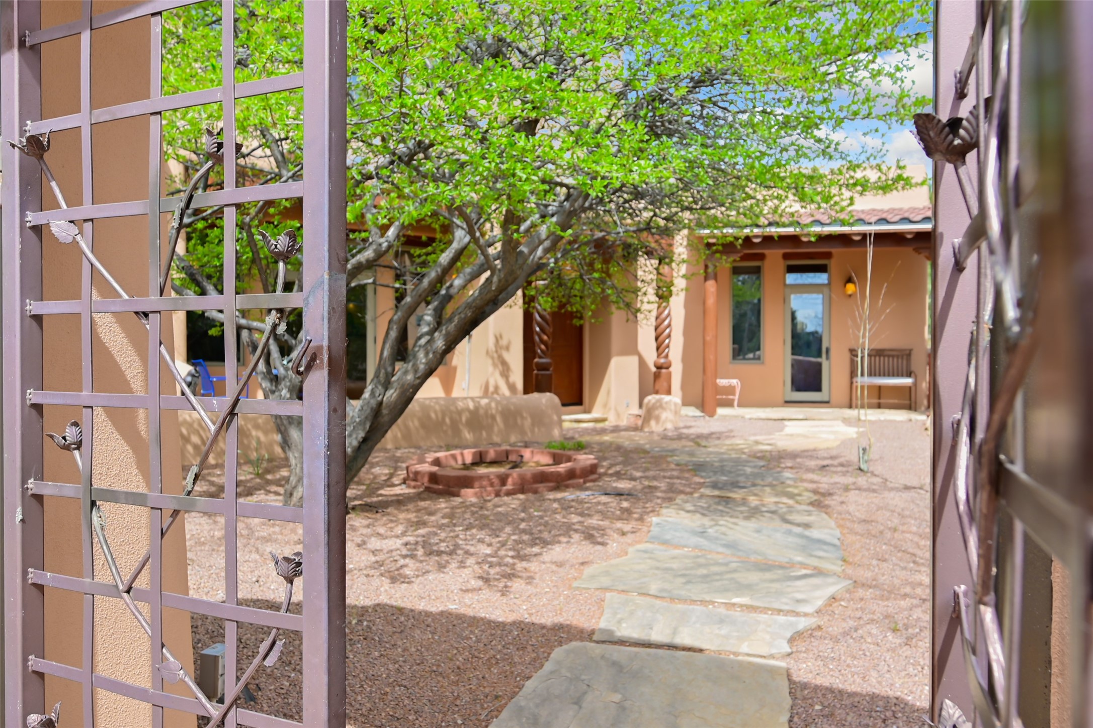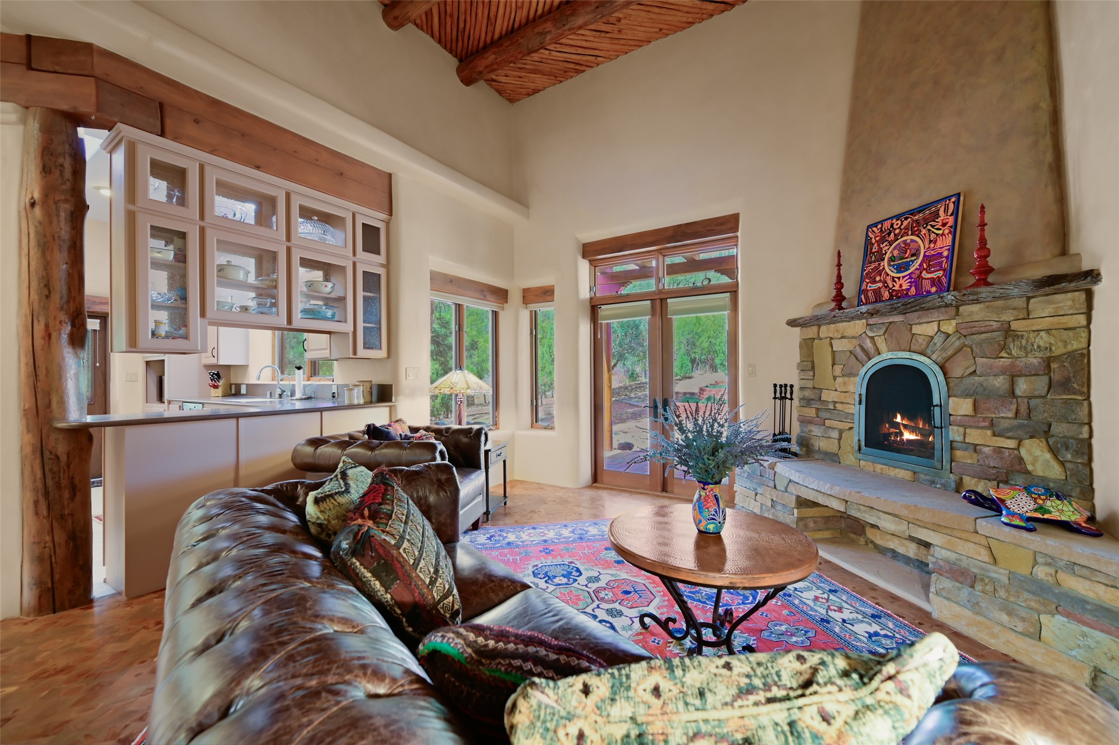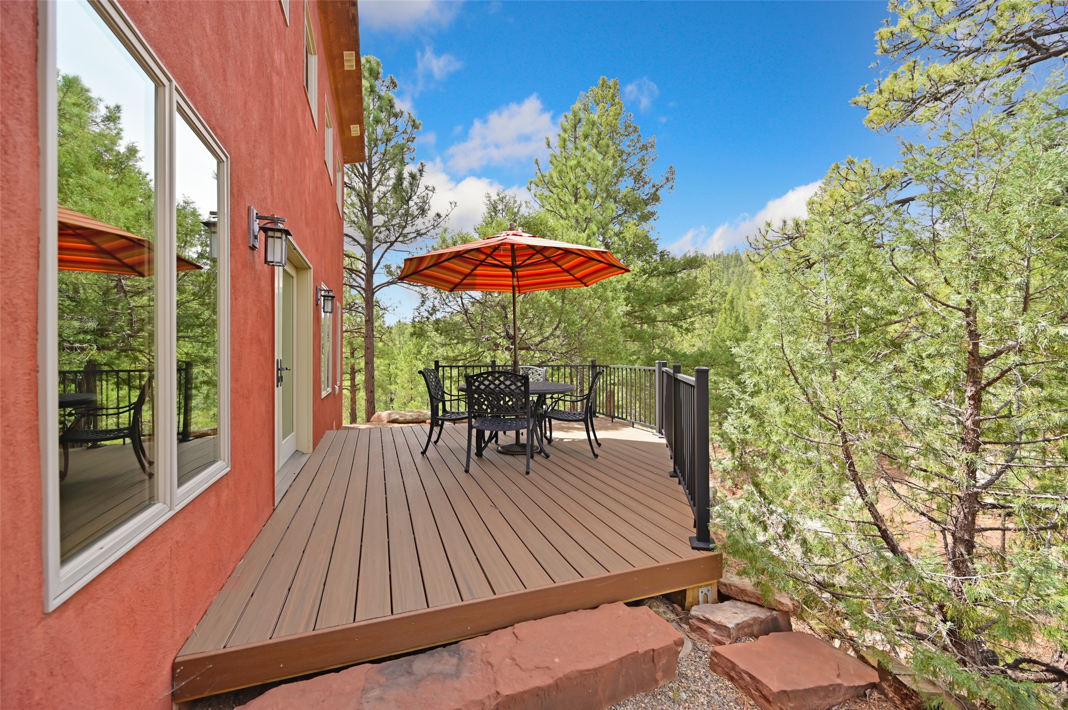 Life is beautifully slow at this elegant retreat set on 27+ acres, adjacent to the Santa Fe National Forest. Tucked in a quiet canyon, the main home features a great room with a stone kiva fireplace, a cozy den off the kitchen, dining room, two bedrooms and bath, 1/2 bath and a large utility room area with abundance of storage. The primary suite located on the upper floor of this home offers an additional living area, wood floors, kiva fireplace and a spa-like bathroom with a steam shower, plus a generous deck perfect for enjoying expansive skies both night and day - truly a luxurious treetop perch. The rear of the main home opens to a grand portal - an expansive outdoor living area with plenty of room for entertaining, dining or just relaxing. The kiva fireplace in this roomy portal ensures warmth and cozy ambiance through the various seasons, extending comfortable year-round living to the outdoors. The guest house is a large yet snug, comfortable and warm space for your guests. The rear of this space opens to a deck overlooking the forest creating a wonderful experience for family and friends. The interior has a kitchenette and wood stove enhancing the livability of this great space. This property is located at the end of the trail/road and entry to the property is through a custom gate.