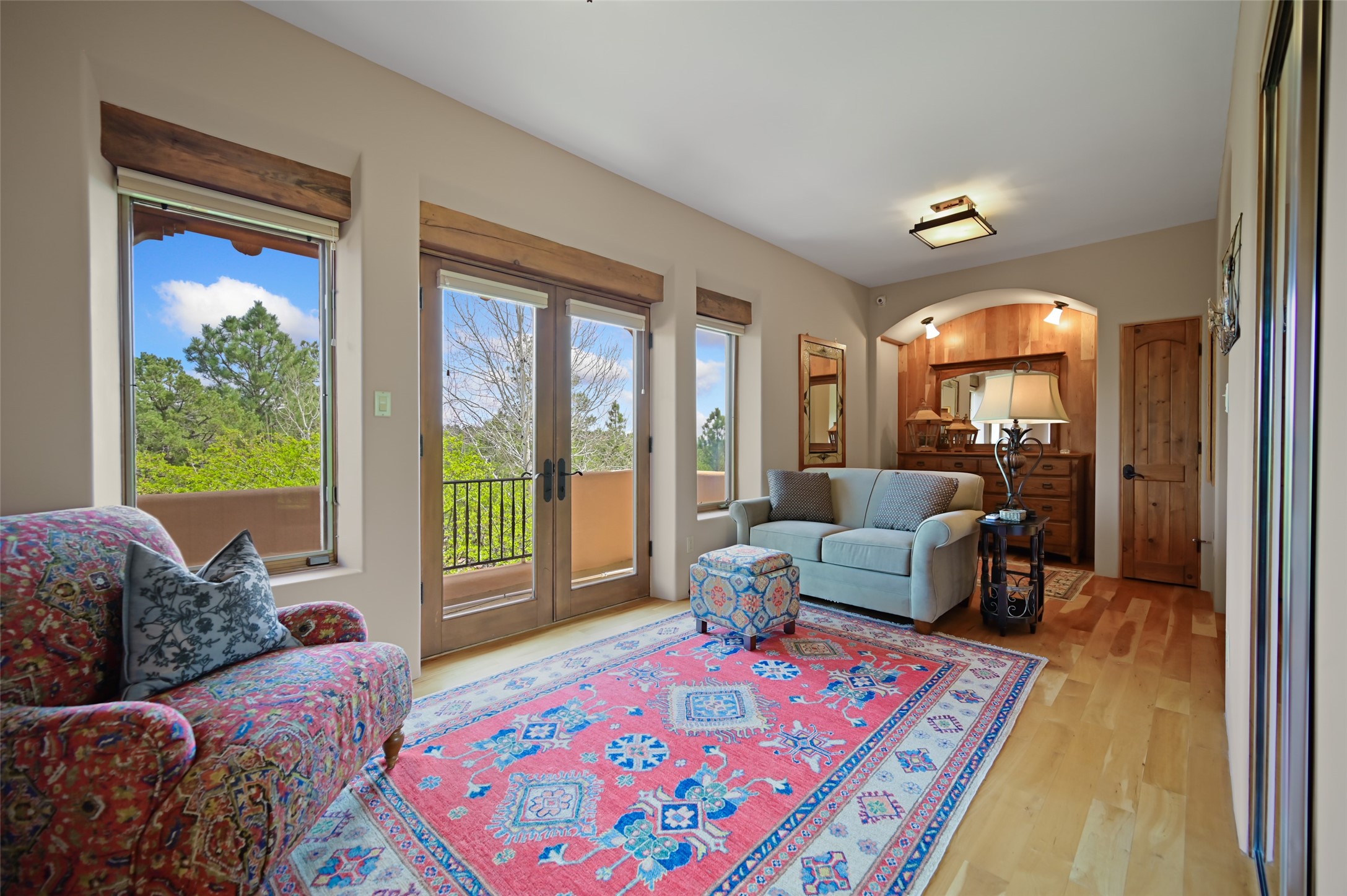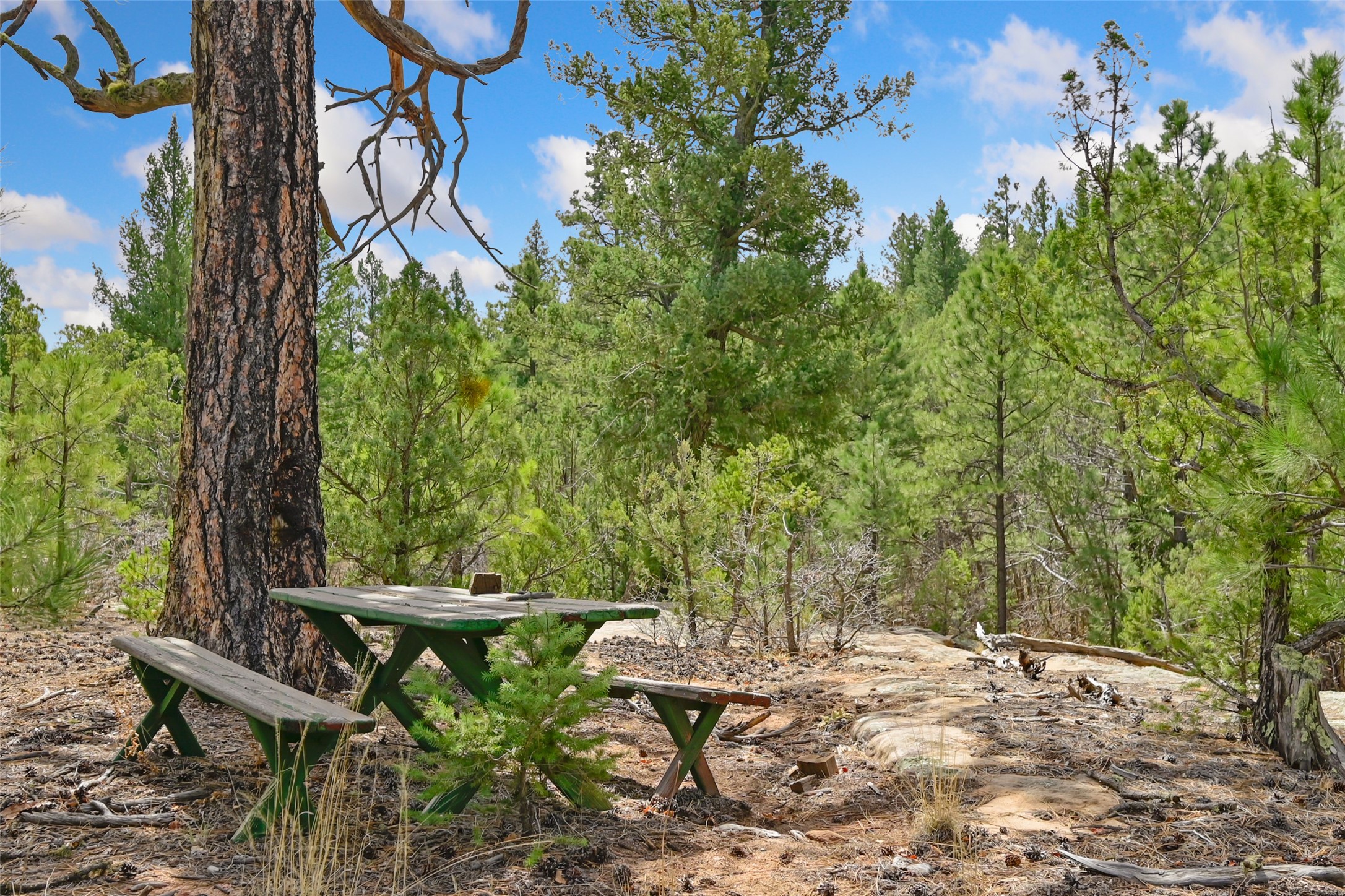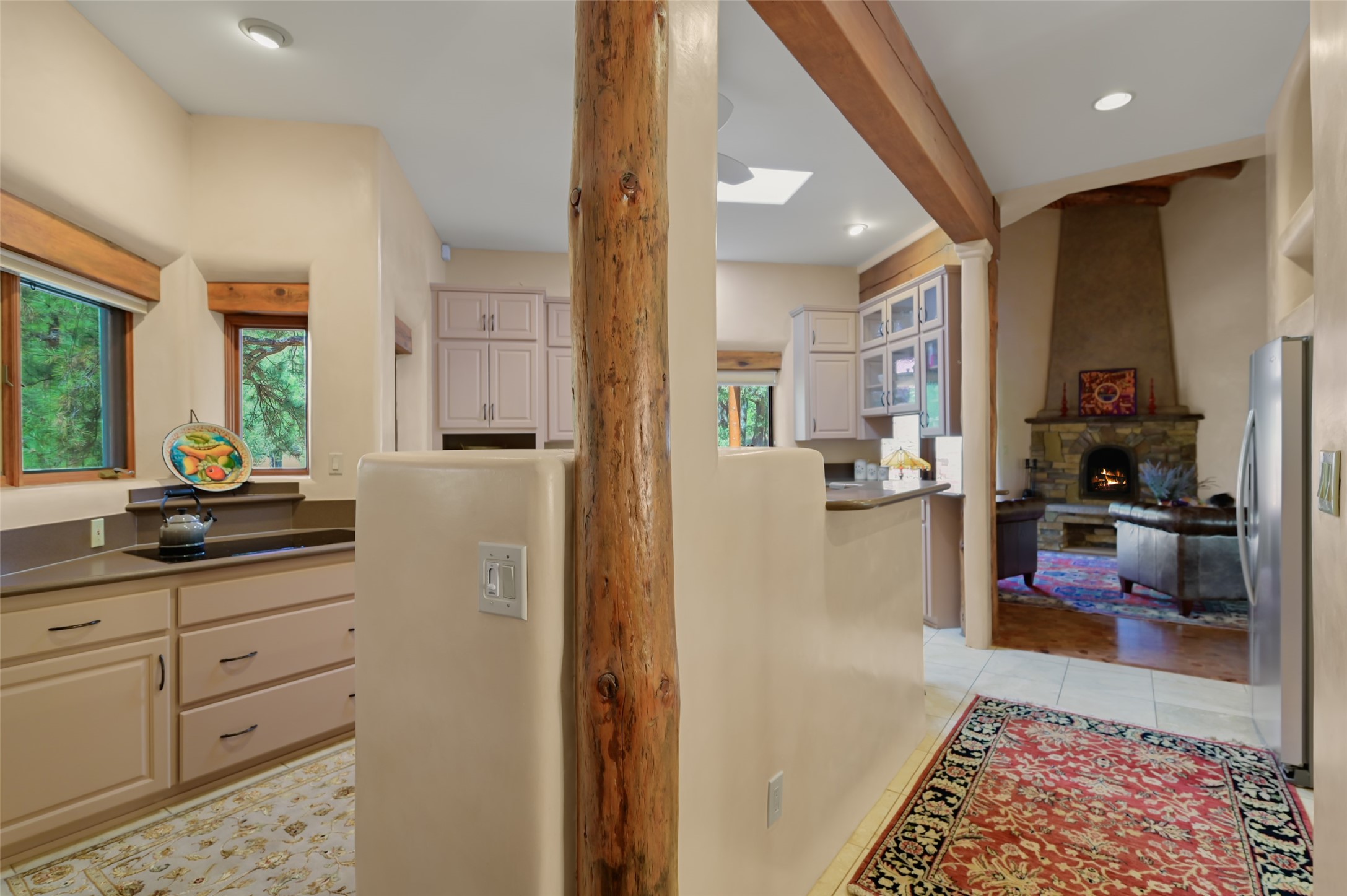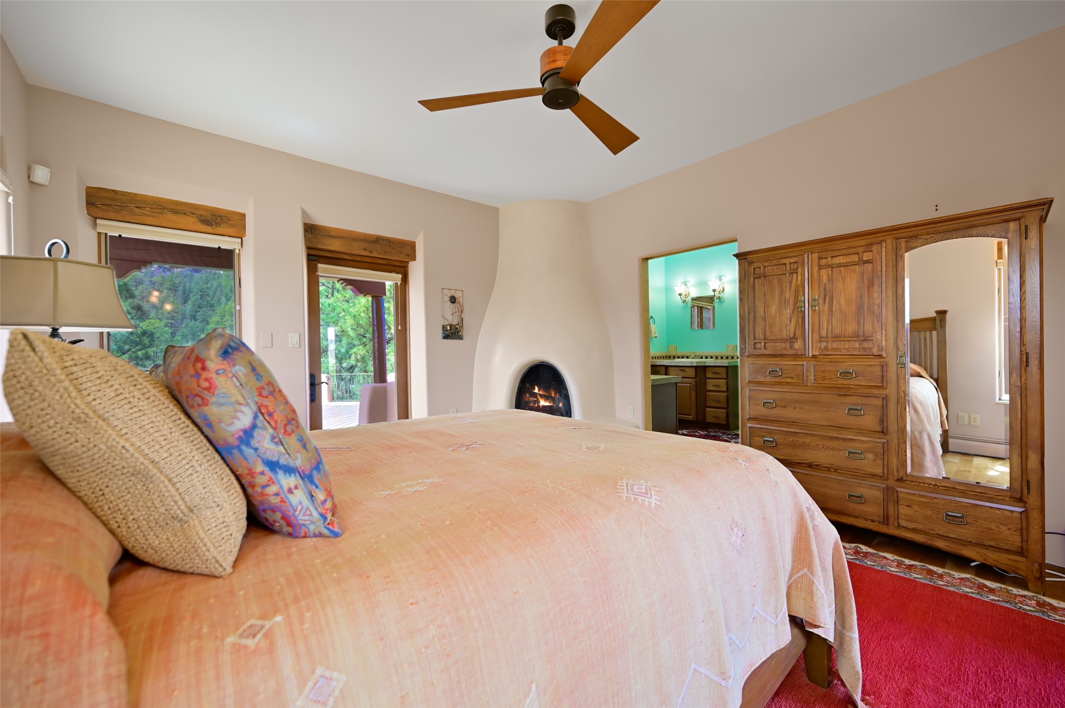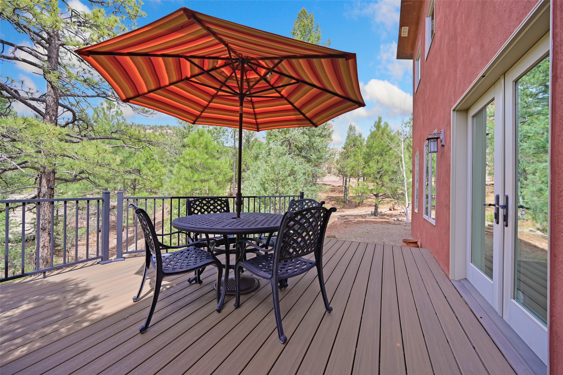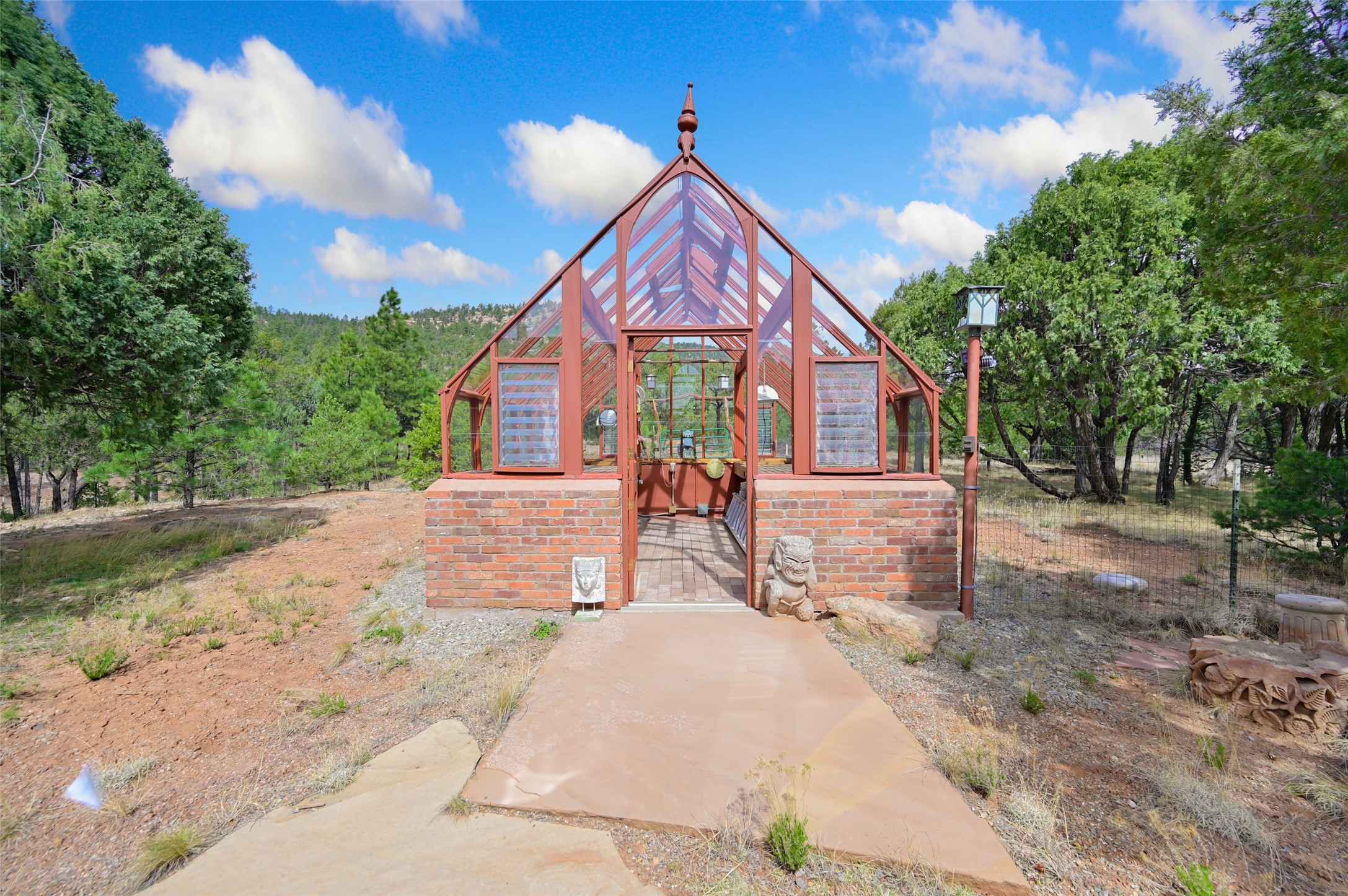 Life is beautifully slow at this elegant retreat set on 27+ acres, adjacent to the Santa Fe National Forest. Tucked in a quiet canyon, the main home features a great room with a stone kiva fireplace, a cozy den off the kitchen, dining room, two bedrooms and bath, 1/2 bath and a large utility room area with abundance of storage. The primary suite located on the upper floor of this home offers an additional living area, wood floors, kiva fireplace and a spa-like bathroom with a steam shower, plus a generous deck perfect for enjoying expansive skies both night and day - truly a luxurious treetop perch. The rear of the main home opens to a grand portal - an expansive outdoor living area with plenty of room for entertaining, dining or just relaxing. The kiva fireplace in this roomy portal ensures warmth and cozy ambiance through the various seasons, extending comfortable year-round living to the outdoors. The guest house is a large yet snug, comfortable and warm space for your guests. The rear of this space opens to a deck overlooking the forest creating a wonderful experience for family and friends. The interior has a kitchenette and wood stove enhancing the livability of this great space. This property is located at the end of the trail/road and entry to the property is through a custom gate.