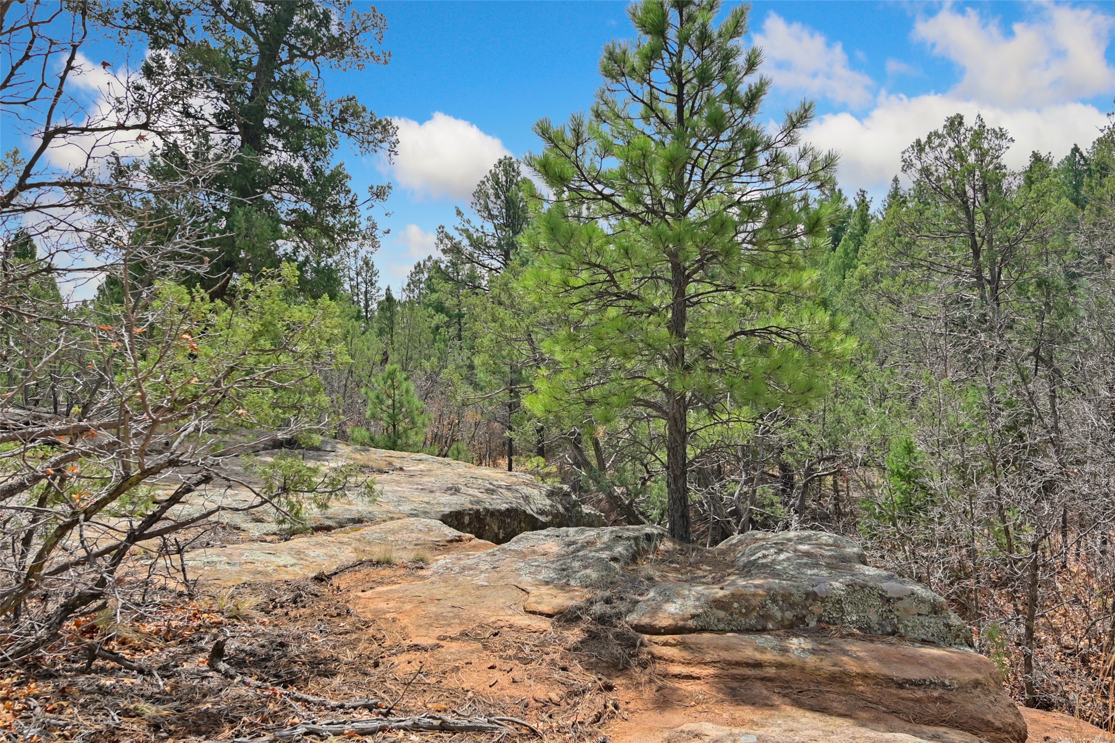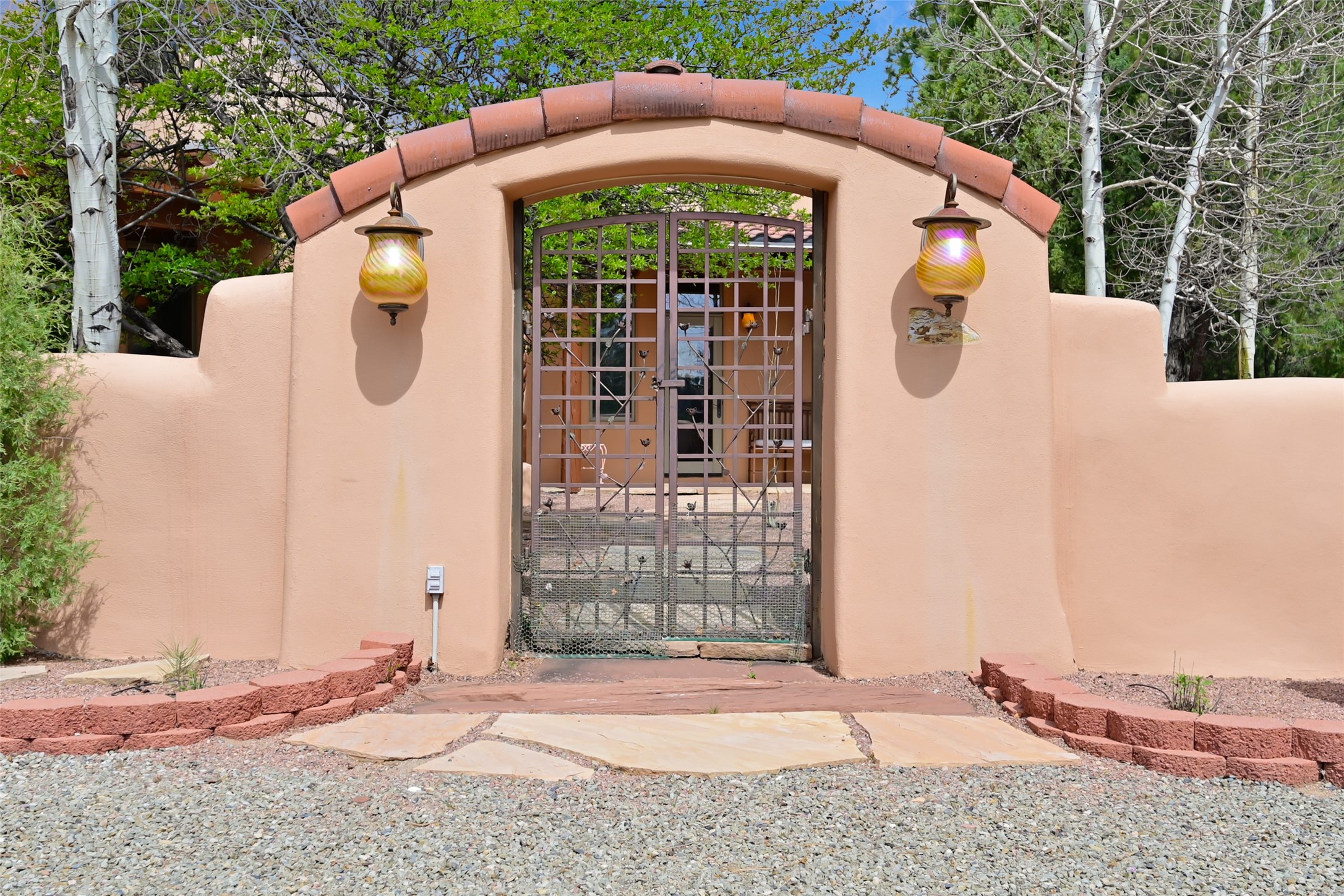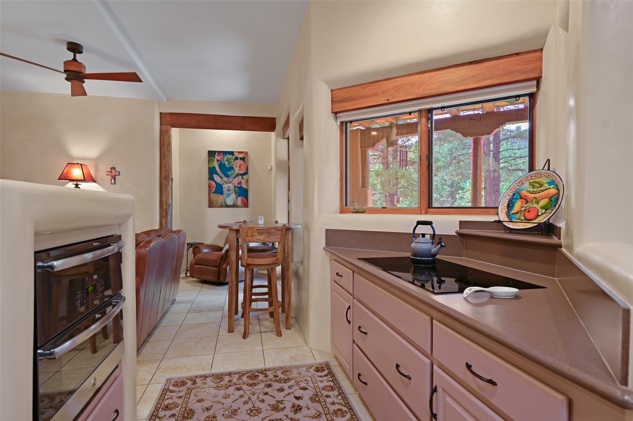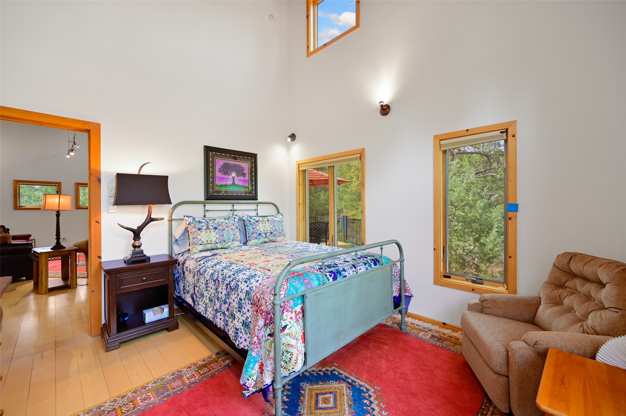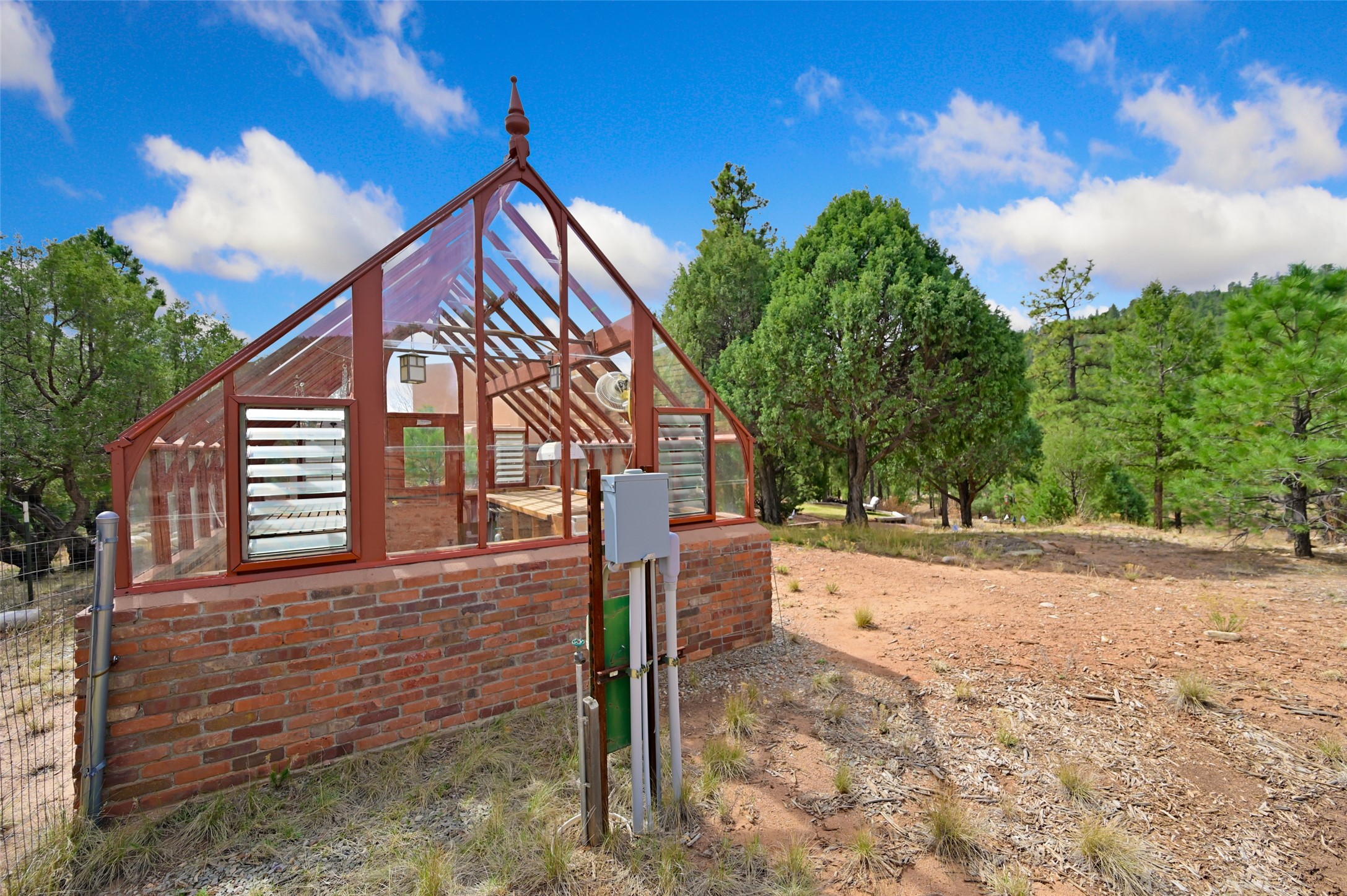 Life is beautifully slow at this elegant retreat set on 27+ acres, adjacent to the Santa Fe National Forest. Tucked in a quiet canyon, the main home features a great room with a stone kiva fireplace, a cozy den off the kitchen, dining room, two bedrooms and bath, 1/2 bath and a large utility room area with abundance of storage. The primary suite located on the upper floor of this home offers an additional living area, wood floors, kiva fireplace and a spa-like bathroom with a steam shower, plus a generous deck perfect for enjoying expansive skies both night and day - truly a luxurious treetop perch. The rear of the main home opens to a grand portal - an expansive outdoor living area with plenty of room for entertaining, dining or just relaxing. The kiva fireplace in this roomy portal ensures warmth and cozy ambiance through the various seasons, extending comfortable year-round living to the outdoors. The guest house is a large yet snug, comfortable and warm space for your guests. The rear of this space opens to a deck overlooking the forest creating a wonderful experience for family and friends. The interior has a kitchenette and wood stove enhancing the livability of this great space. This property is located at the end of the trail/road and entry to the property is through a custom gate.