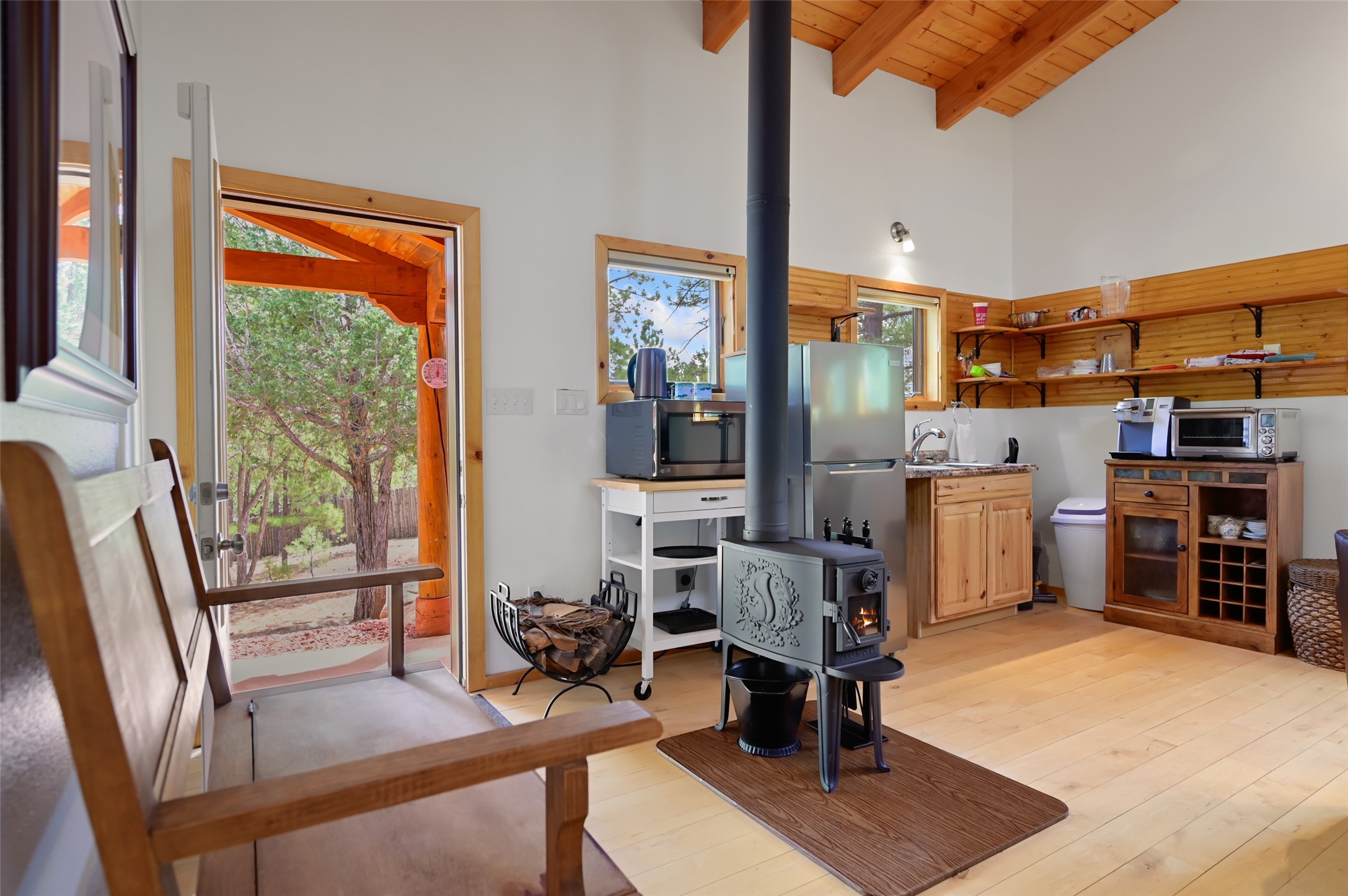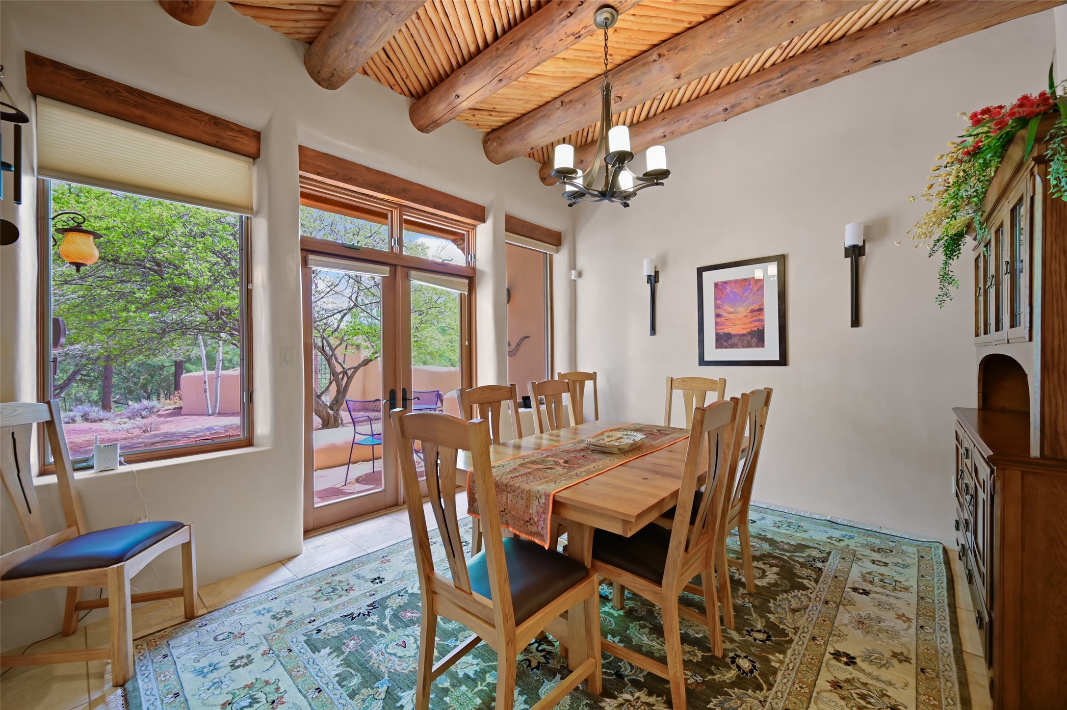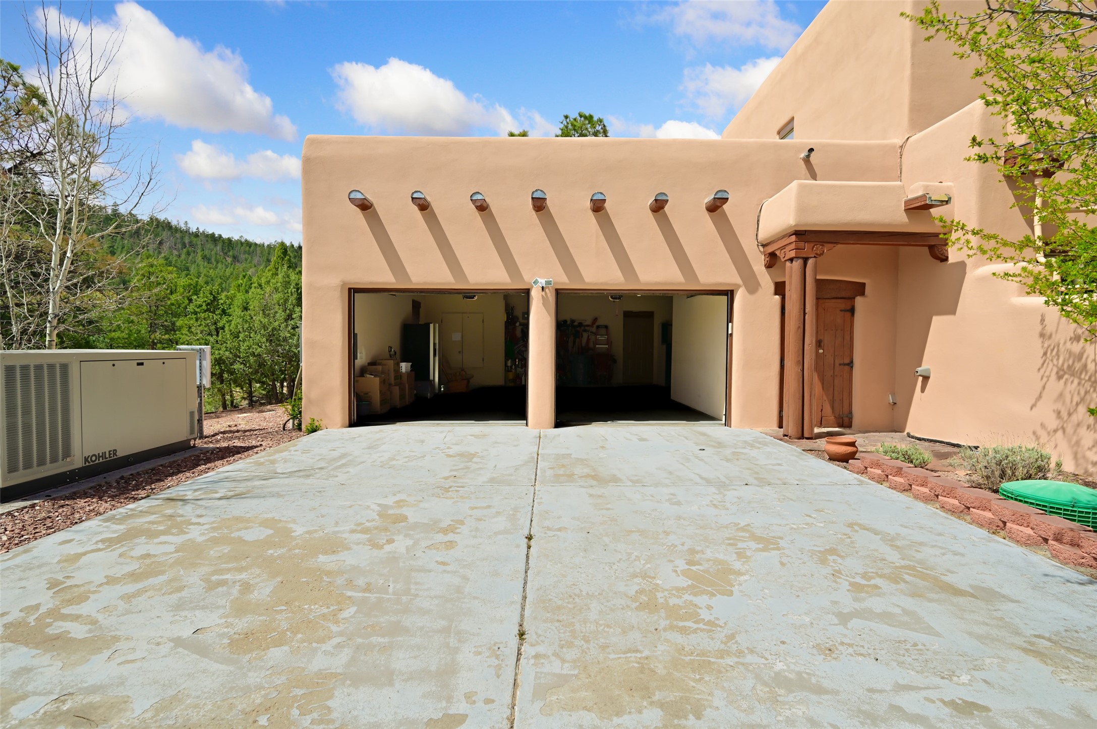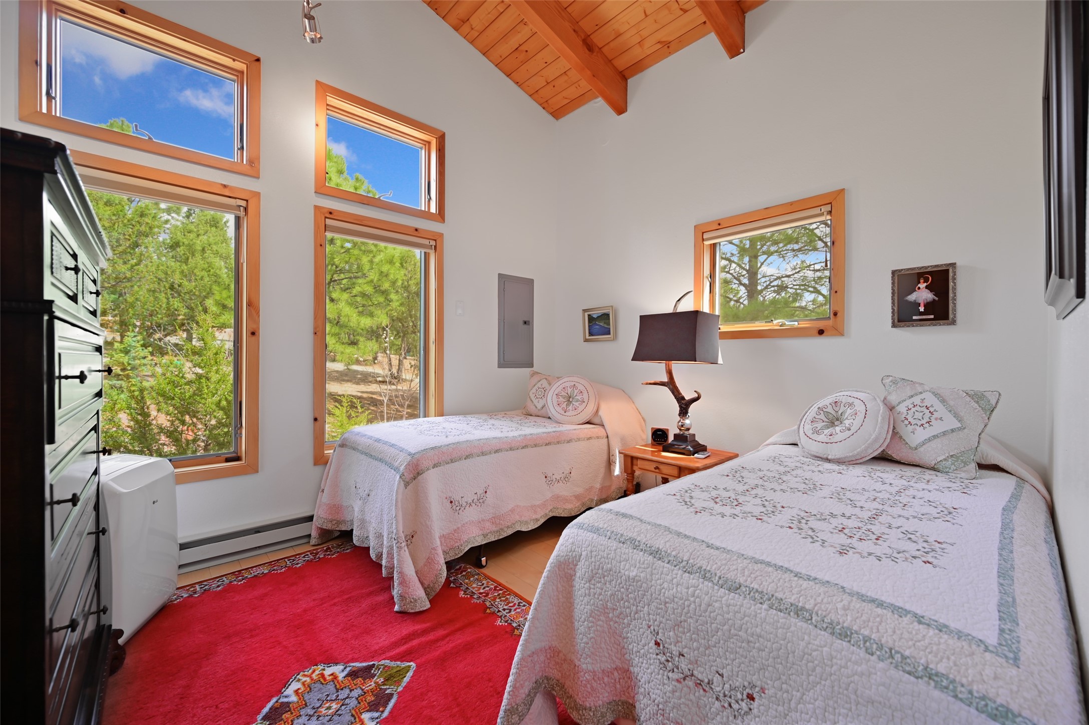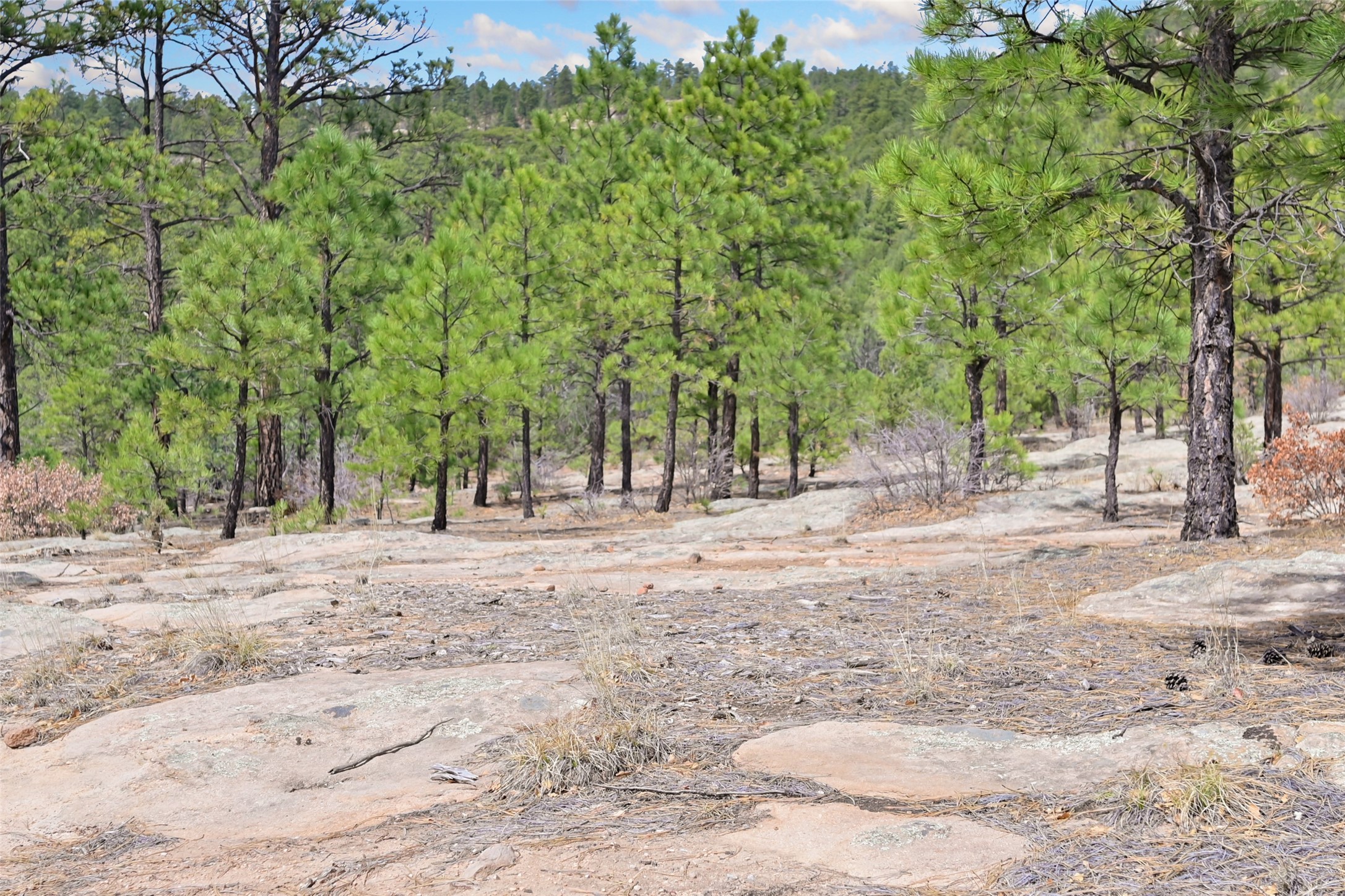 Life is beautifully slow at this elegant retreat set on 27+ acres, adjacent to the Santa Fe National Forest. Tucked in a quiet canyon, the main home features a great room with a stone kiva fireplace, a cozy den off the kitchen, dining room, two bedrooms and bath, 1/2 bath and a large utility room area with abundance of storage. The primary suite located on the upper floor of this home offers an additional living area, wood floors, kiva fireplace and a spa-like bathroom with a steam shower, plus a generous deck perfect for enjoying expansive skies both night and day - truly a luxurious treetop perch. The rear of the main home opens to a grand portal - an expansive outdoor living area with plenty of room for entertaining, dining or just relaxing. The kiva fireplace in this roomy portal ensures warmth and cozy ambiance through the various seasons, extending comfortable year-round living to the outdoors. The guest house is a large yet snug, comfortable and warm space for your guests. The rear of this space opens to a deck overlooking the forest creating a wonderful experience for family and friends. The interior has a kitchenette and wood stove enhancing the livability of this great space. This property is located at the end of the trail/road and entry to the property is through a custom gate.