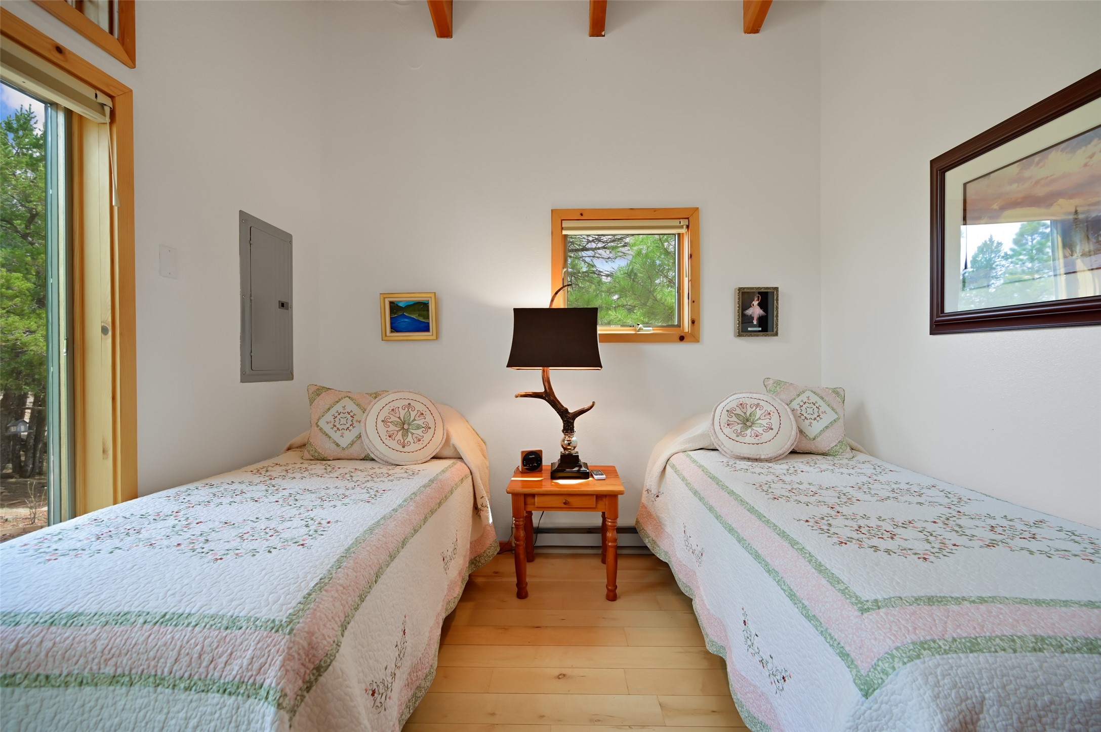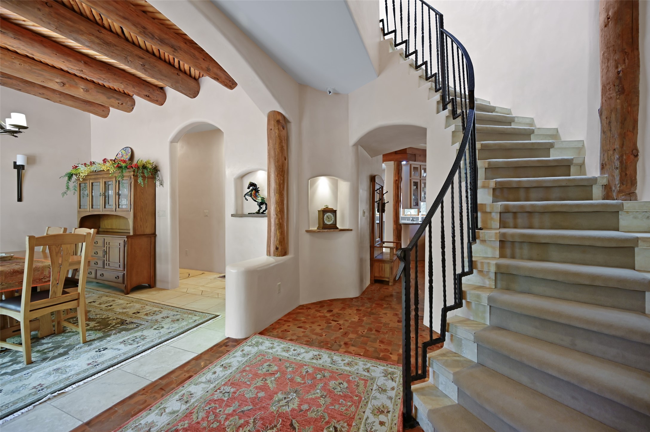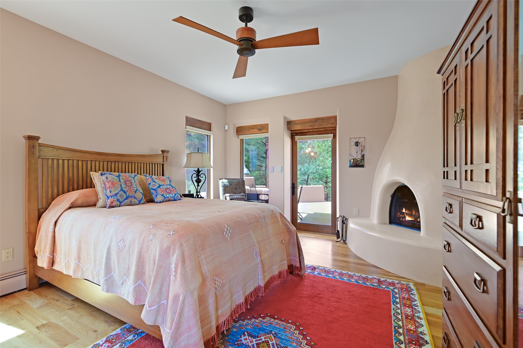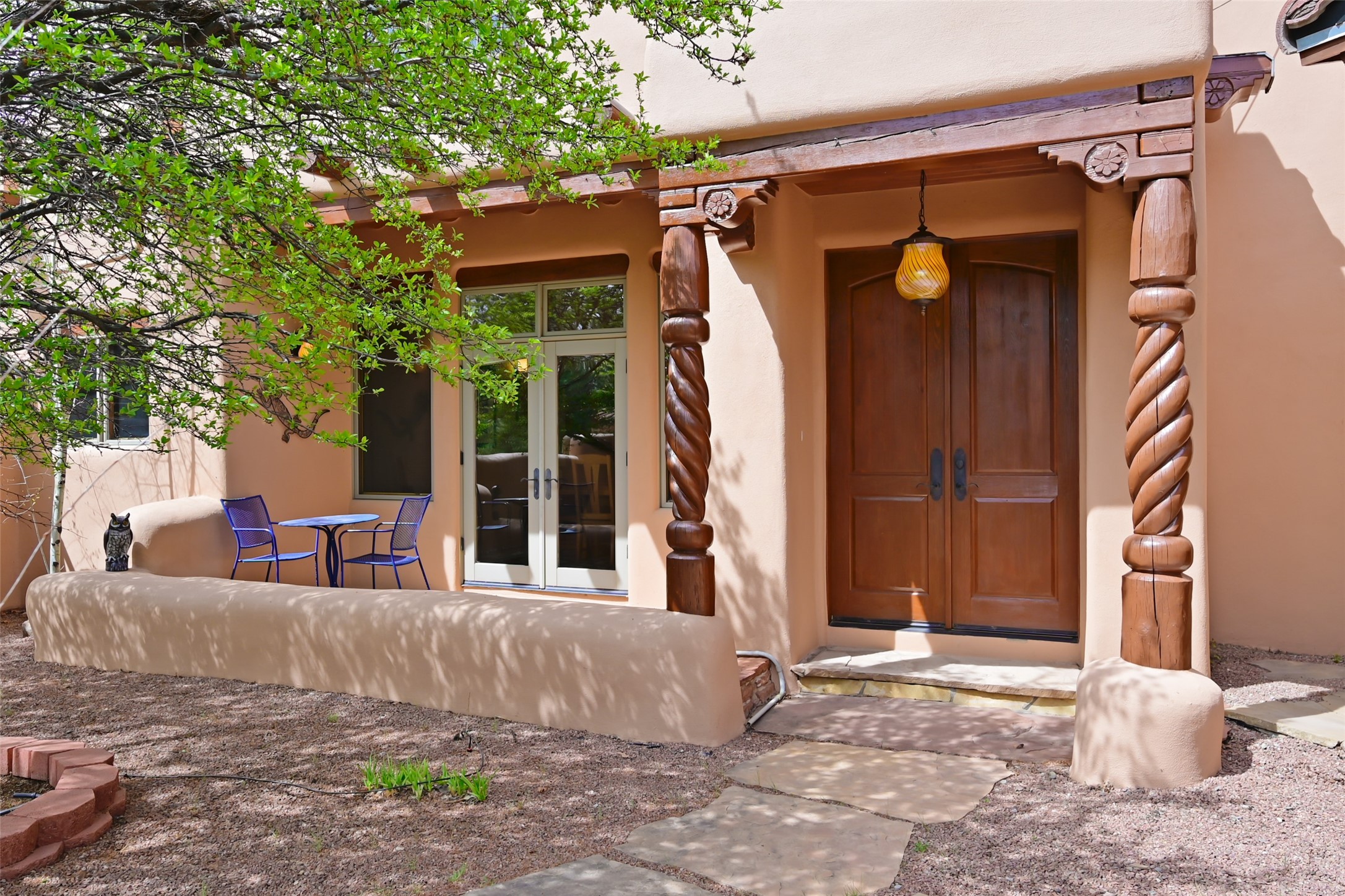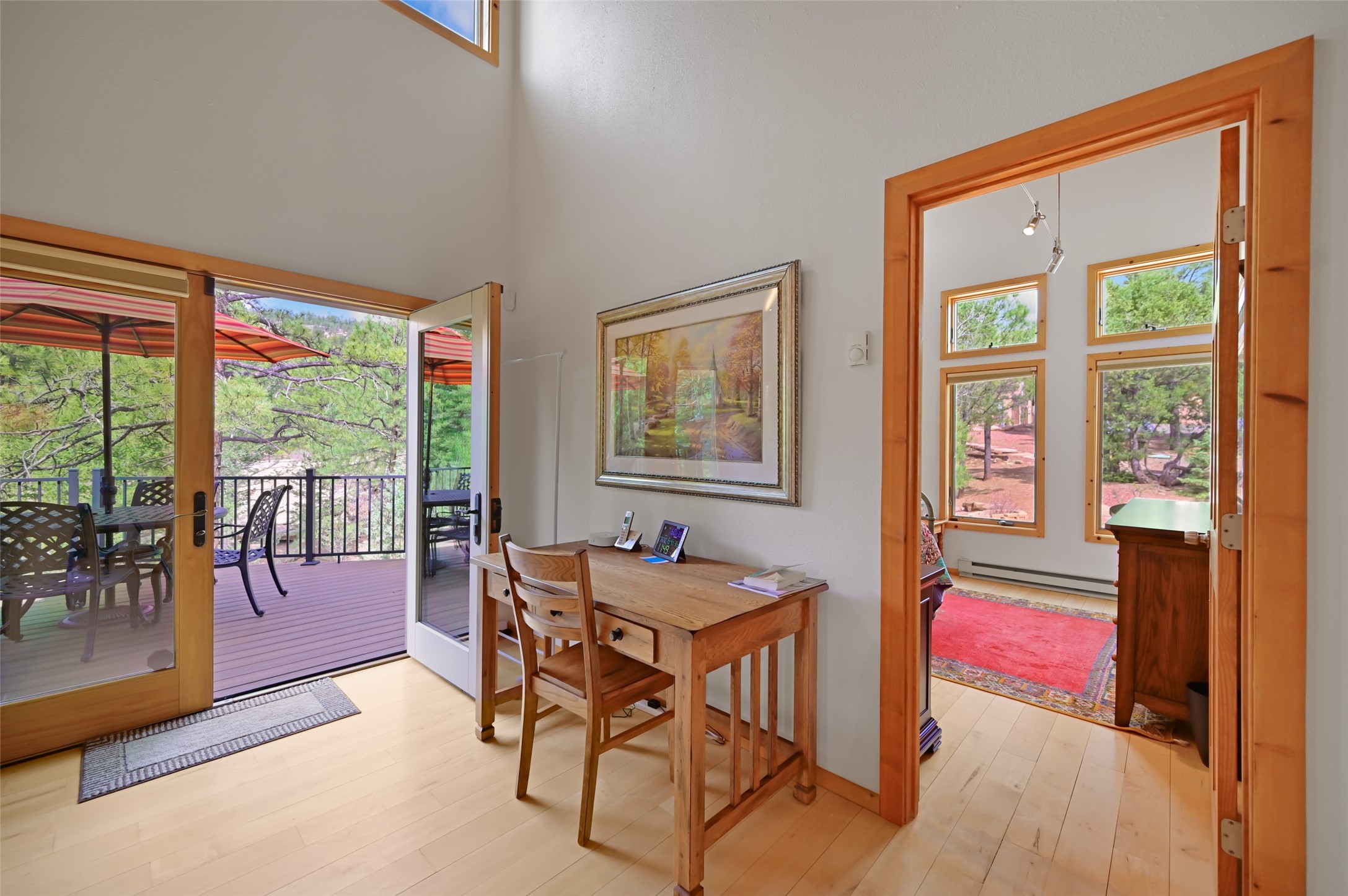 Life is beautifully slow at this elegant retreat set on 27+ acres, adjacent to the Santa Fe National Forest. Tucked in a quiet canyon, the main home features a great room with a stone kiva fireplace, a cozy den off the kitchen, dining room, two bedrooms and bath, 1/2 bath and a large utility room area with abundance of storage. The primary suite located on the upper floor of this home offers an additional living area, wood floors, kiva fireplace and a spa-like bathroom with a steam shower, plus a generous deck perfect for enjoying expansive skies both night and day - truly a luxurious treetop perch. The rear of the main home opens to a grand portal - an expansive outdoor living area with plenty of room for entertaining, dining or just relaxing. The kiva fireplace in this roomy portal ensures warmth and cozy ambiance through the various seasons, extending comfortable year-round living to the outdoors. The guest house is a large yet snug, comfortable and warm space for your guests. The rear of this space opens to a deck overlooking the forest creating a wonderful experience for family and friends. The interior has a kitchenette and wood stove enhancing the livability of this great space. This property is located at the end of the trail/road and entry to the property is through a custom gate.