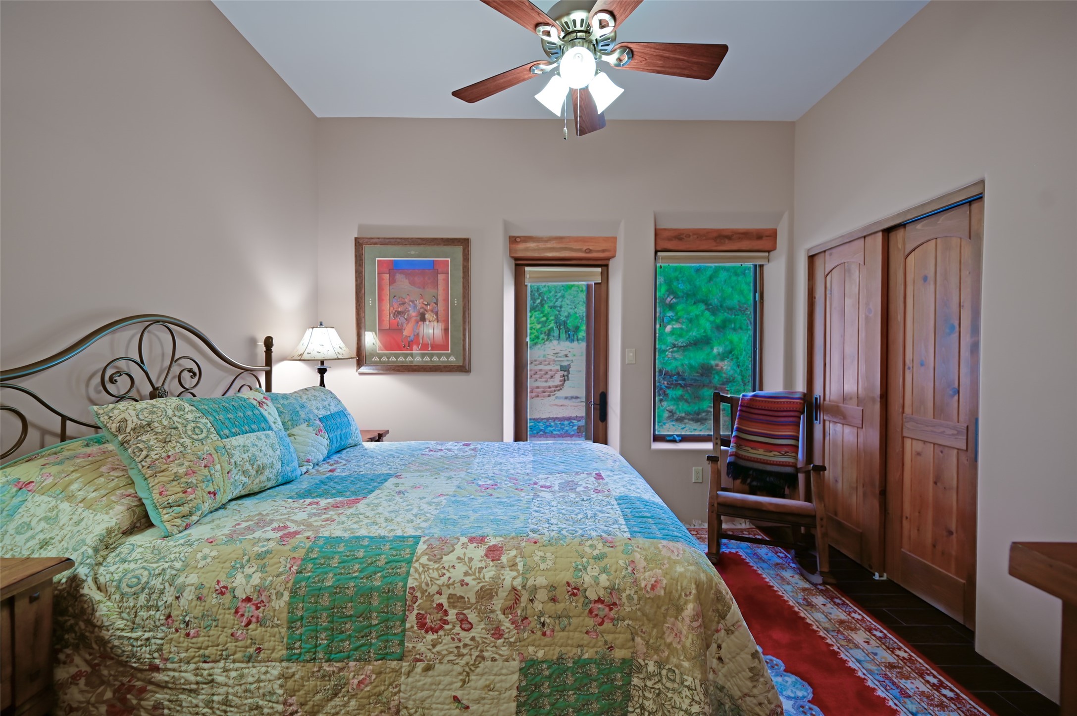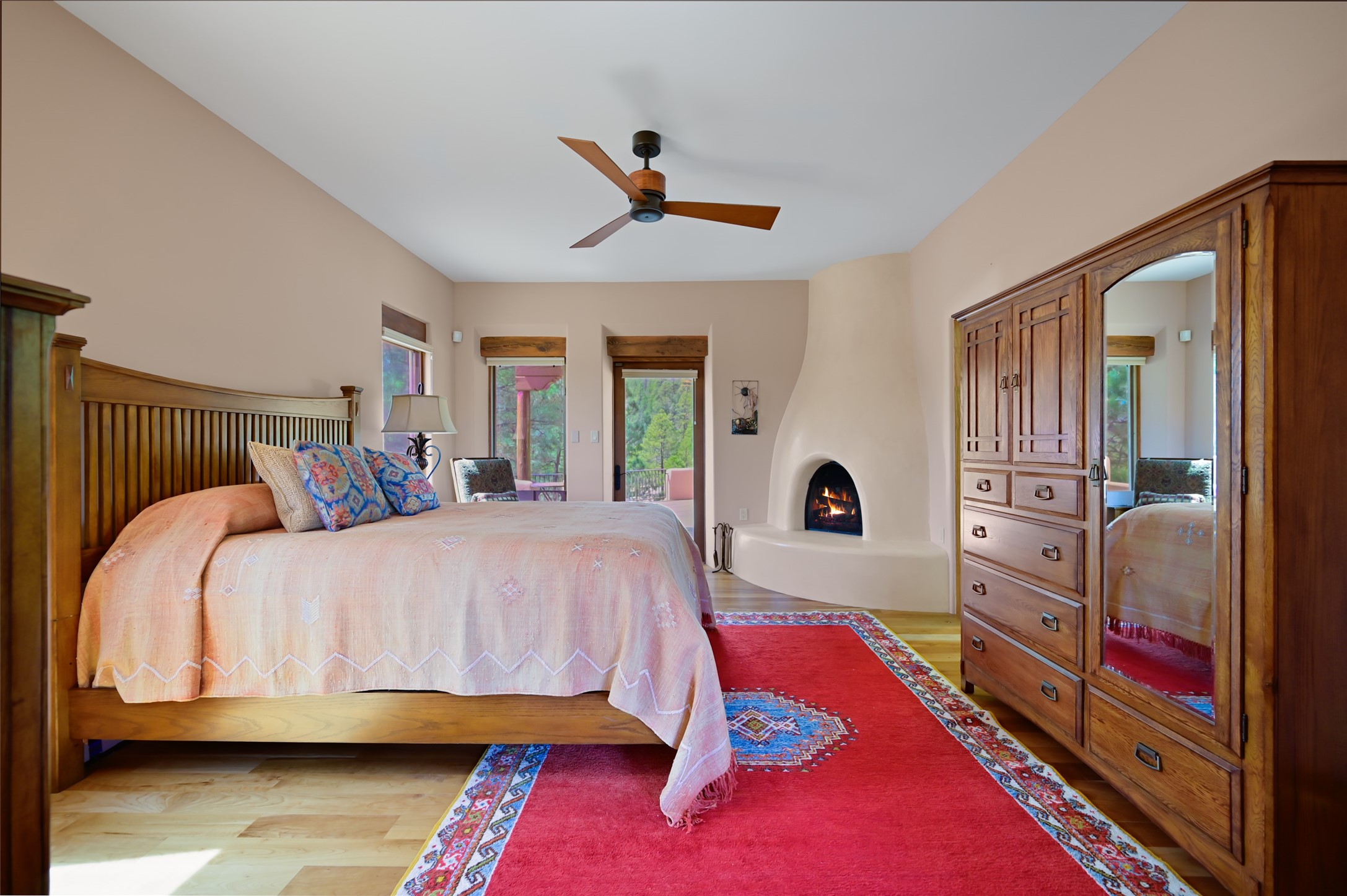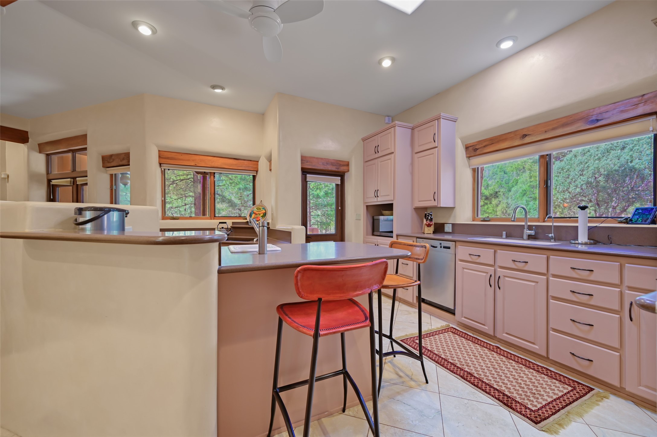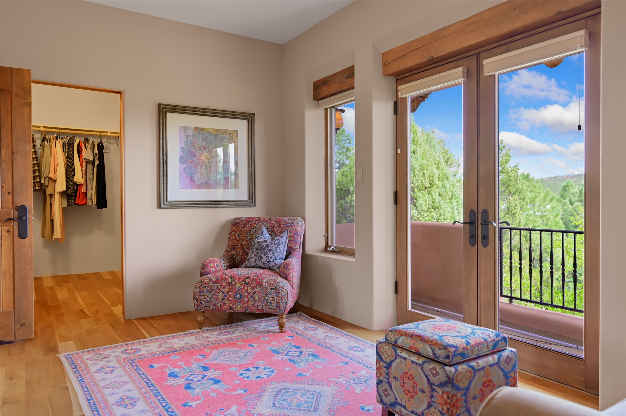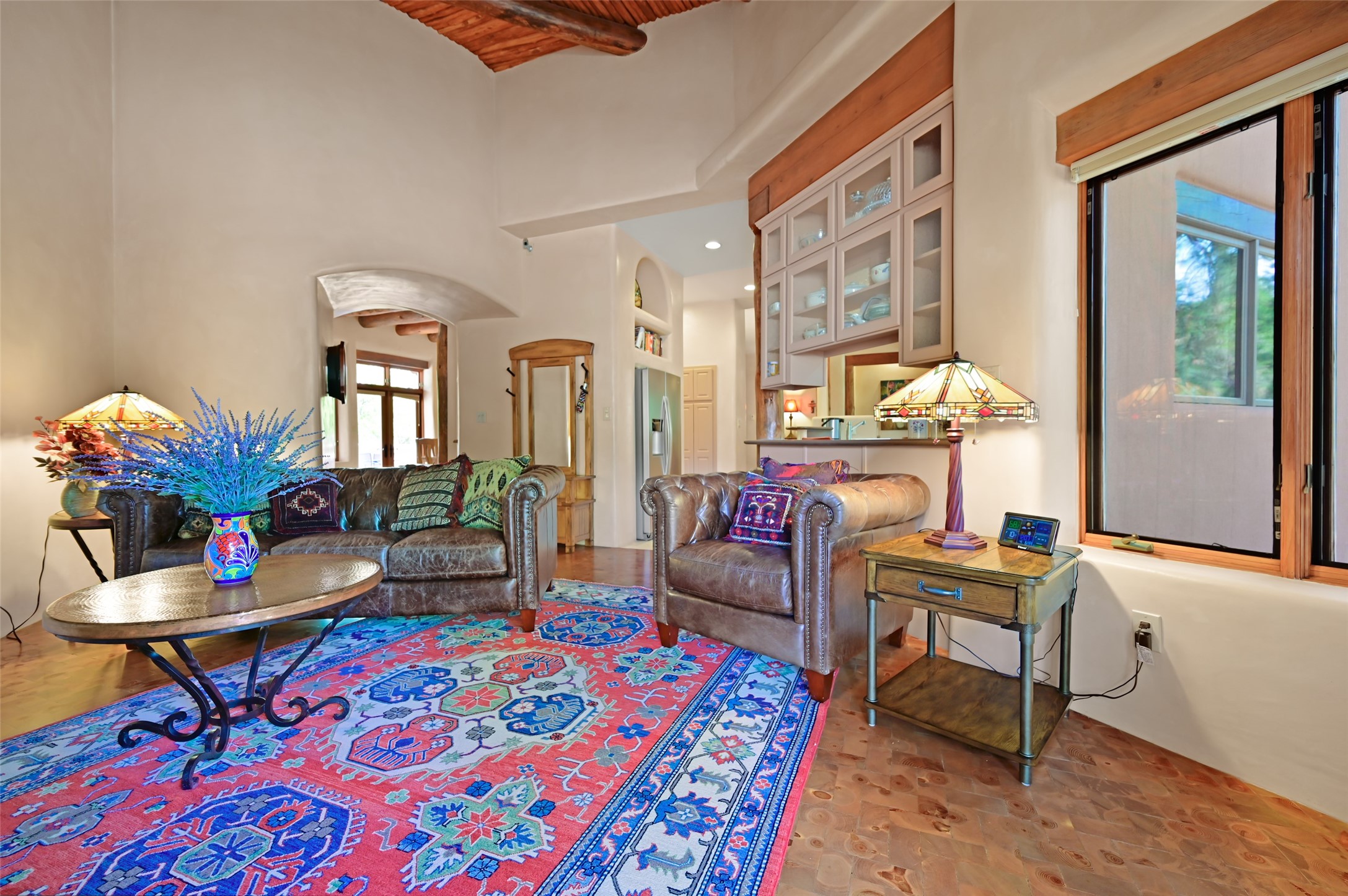 Life is beautifully slow at this elegant retreat set on 27+ acres, adjacent to the Santa Fe National Forest. Tucked in a quiet canyon, the main home features a great room with a stone kiva fireplace, a cozy den off the kitchen, dining room, two bedrooms and bath, 1/2 bath and a large utility room area with abundance of storage. The primary suite located on the upper floor of this home offers an additional living area, wood floors, kiva fireplace and a spa-like bathroom with a steam shower, plus a generous deck perfect for enjoying expansive skies both night and day - truly a luxurious treetop perch. The rear of the main home opens to a grand portal - an expansive outdoor living area with plenty of room for entertaining, dining or just relaxing. The kiva fireplace in this roomy portal ensures warmth and cozy ambiance through the various seasons, extending comfortable year-round living to the outdoors. The guest house is a large yet snug, comfortable and warm space for your guests. The rear of this space opens to a deck overlooking the forest creating a wonderful experience for family and friends. The interior has a kitchenette and wood stove enhancing the livability of this great space. This property is located at the end of the trail/road and entry to the property is through a custom gate.