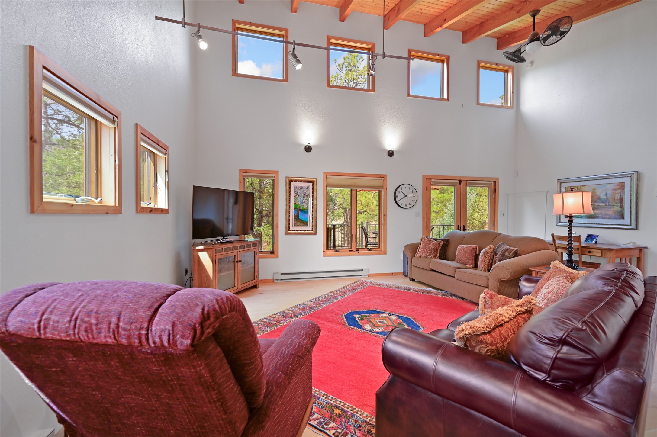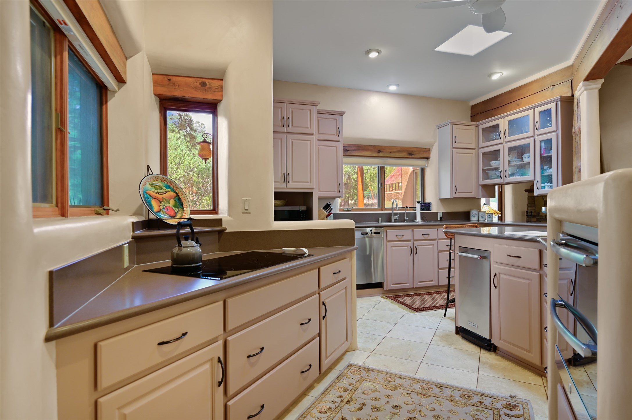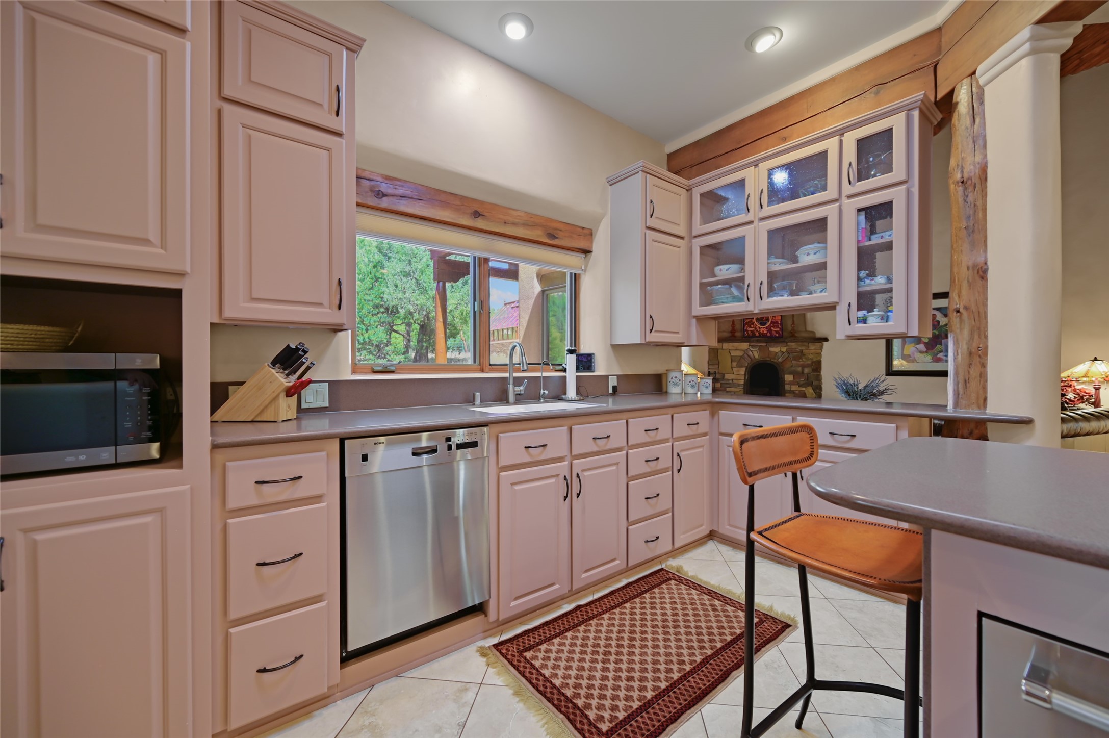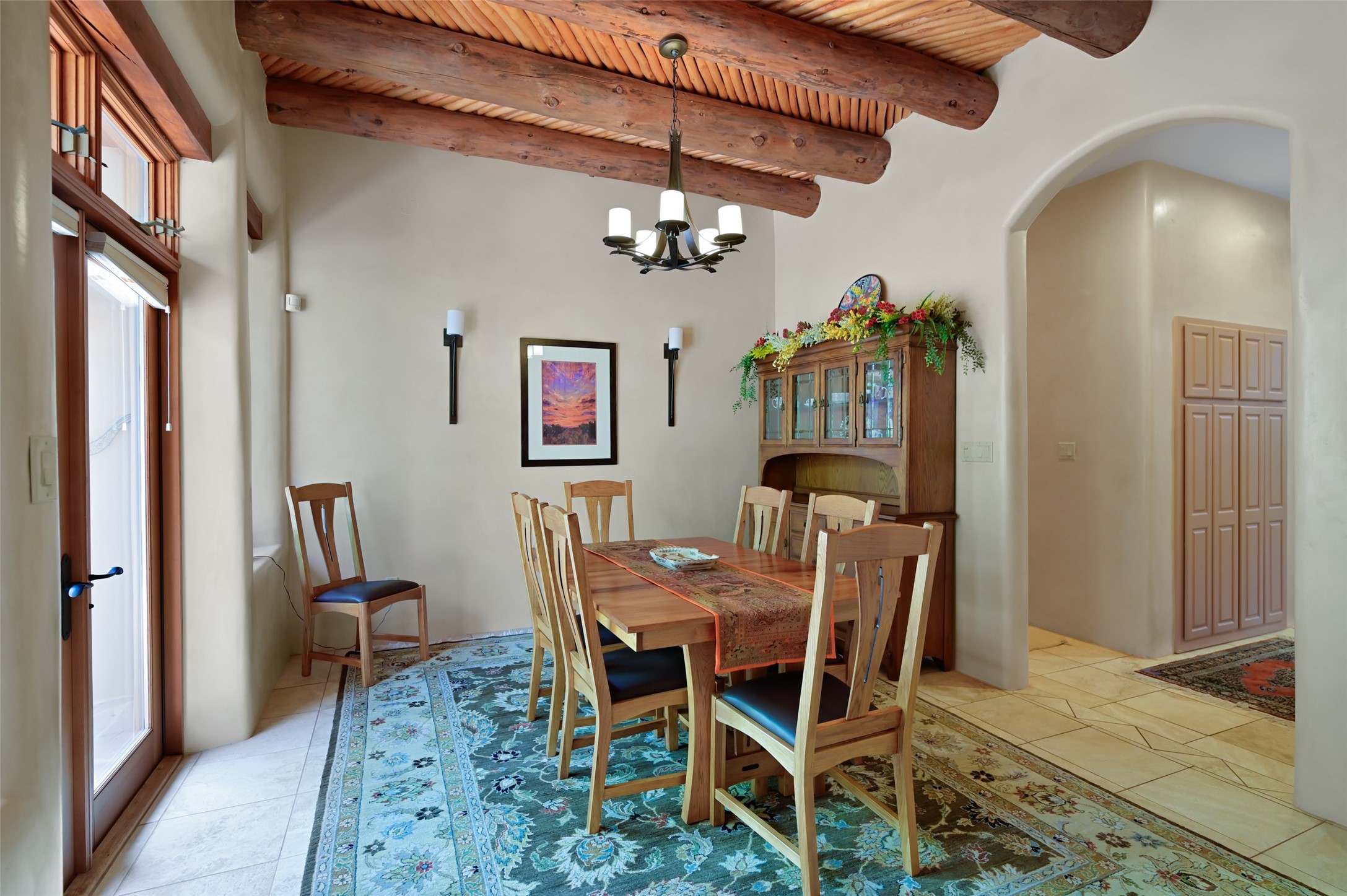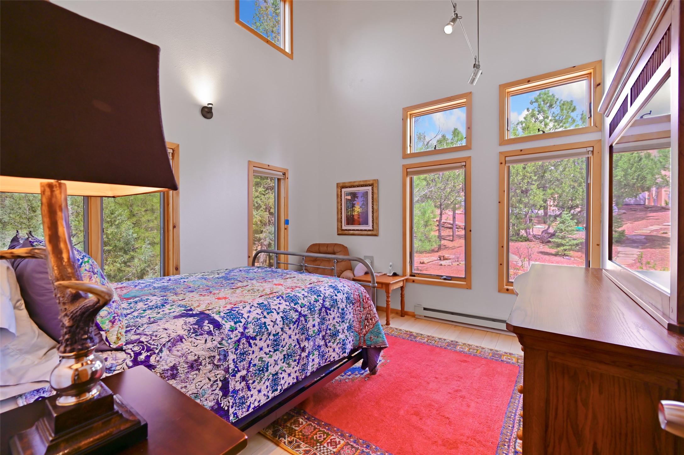 Life is beautifully slow at this elegant retreat set on 27+ acres, adjacent to the Santa Fe National Forest. Tucked in a quiet canyon, the main home features a great room with a stone kiva fireplace, a cozy den off the kitchen, dining room, two bedrooms and bath, 1/2 bath and a large utility room area with abundance of storage. The primary suite located on the upper floor of this home offers an additional living area, wood floors, kiva fireplace and a spa-like bathroom with a steam shower, plus a generous deck perfect for enjoying expansive skies both night and day - truly a luxurious treetop perch. The rear of the main home opens to a grand portal - an expansive outdoor living area with plenty of room for entertaining, dining or just relaxing. The kiva fireplace in this roomy portal ensures warmth and cozy ambiance through the various seasons, extending comfortable year-round living to the outdoors. The guest house is a large yet snug, comfortable and warm space for your guests. The rear of this space opens to a deck overlooking the forest creating a wonderful experience for family and friends. The interior has a kitchenette and wood stove enhancing the livability of this great space. This property is located at the end of the trail/road and entry to the property is through a custom gate.