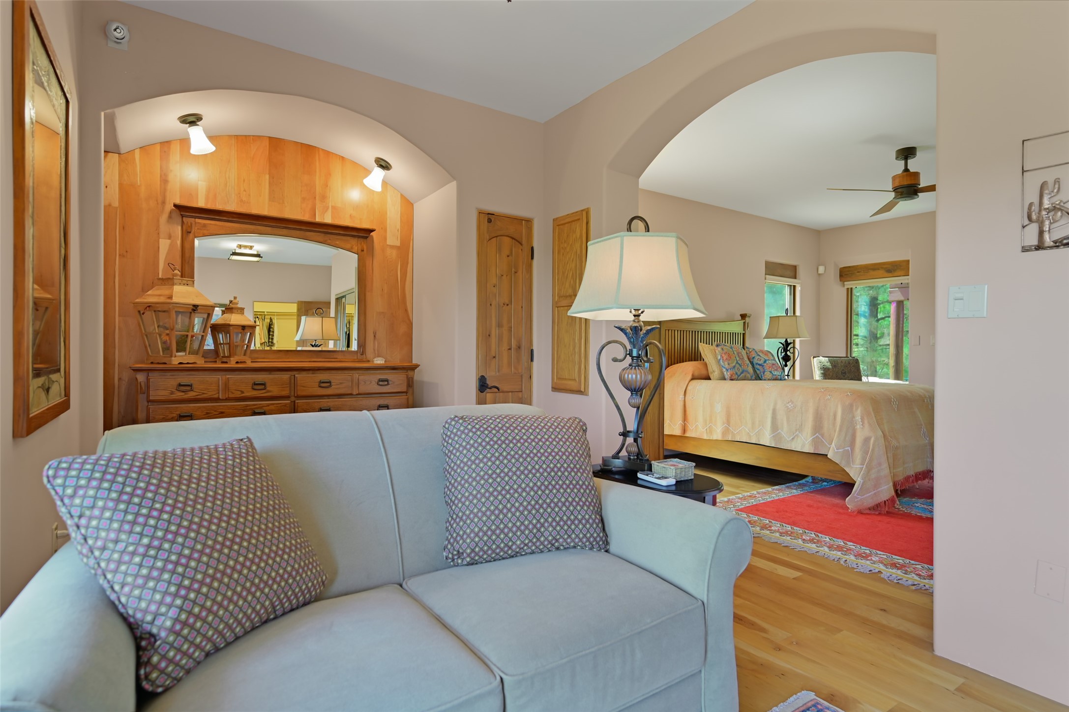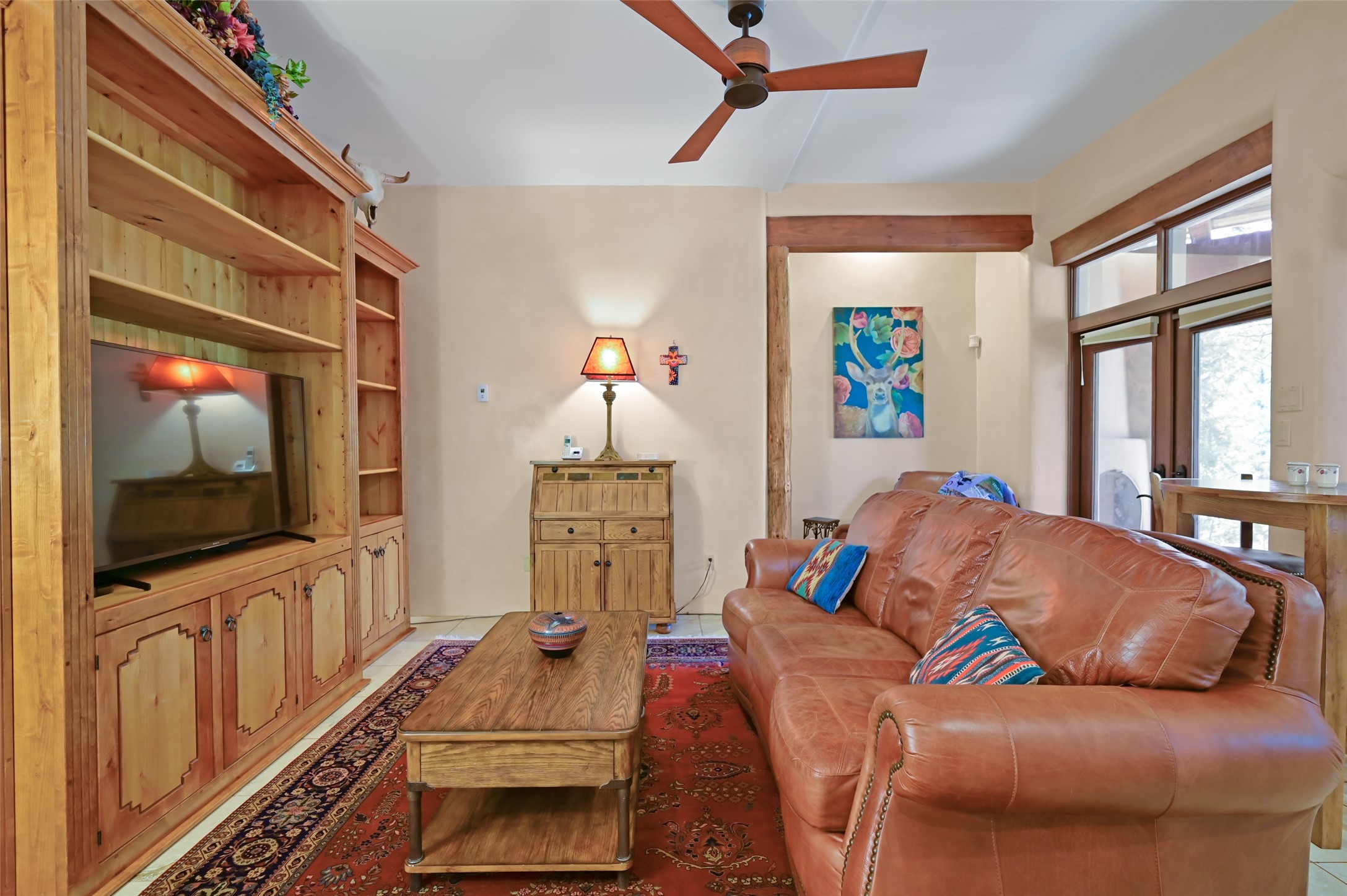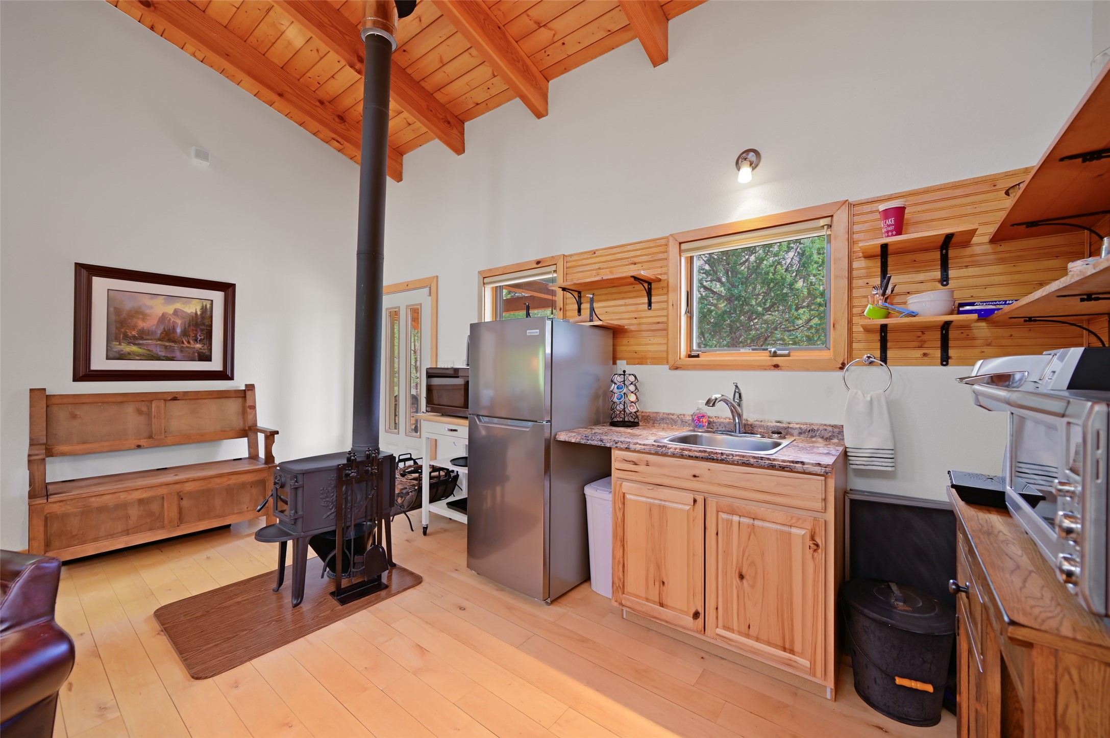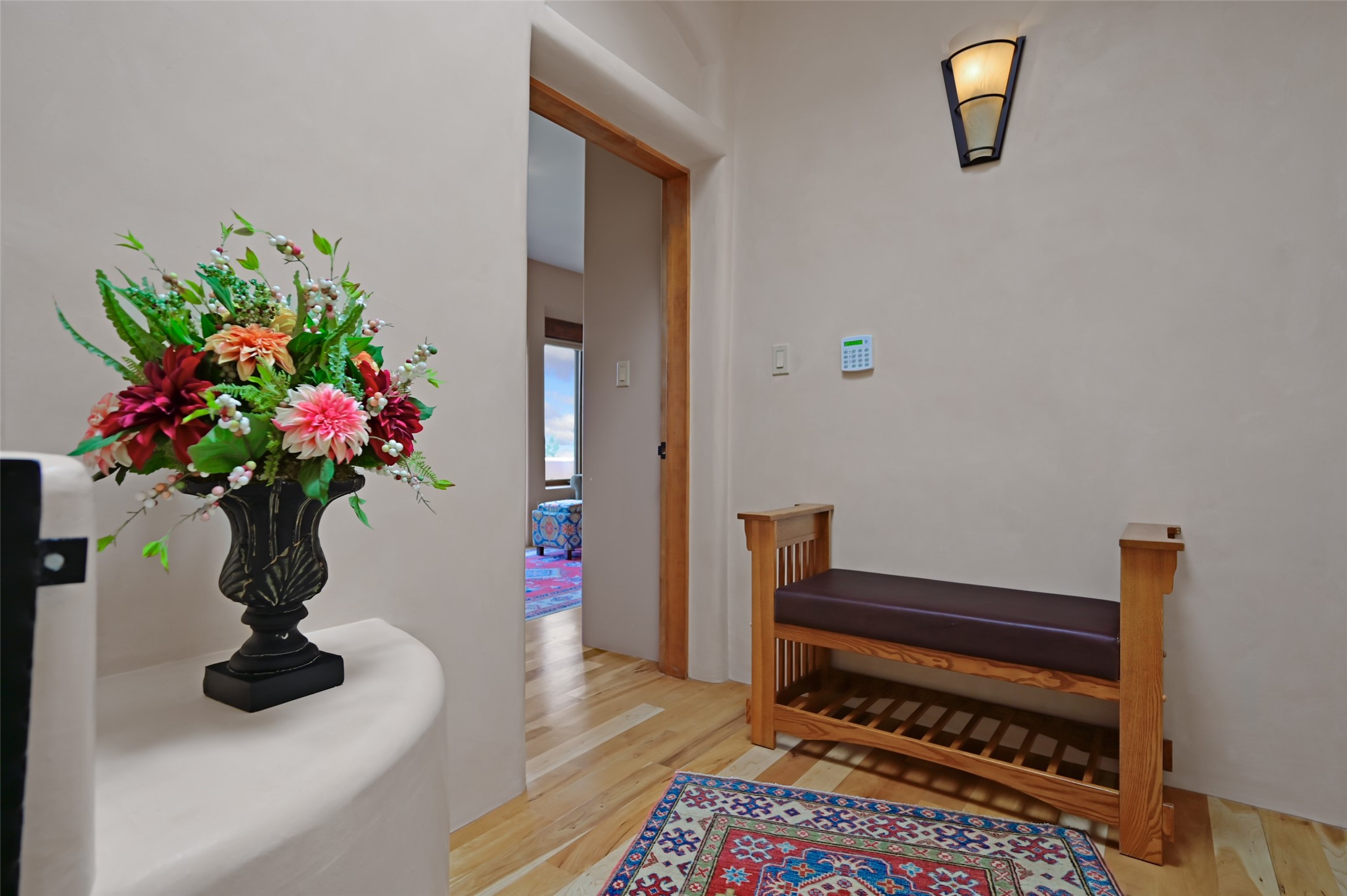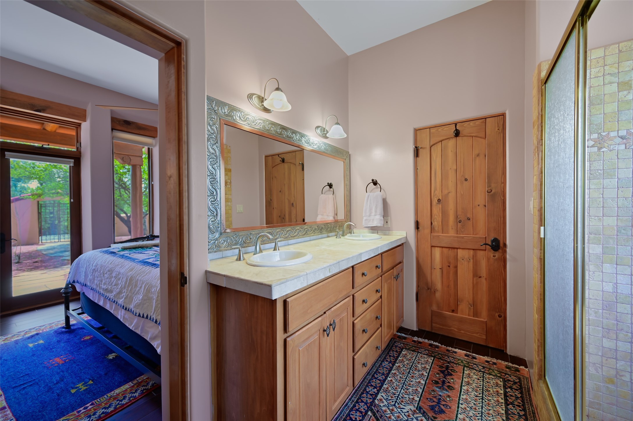 Life is beautifully slow at this elegant retreat set on 27+ acres, adjacent to the Santa Fe National Forest. Tucked in a quiet canyon, the main home features a great room with a stone kiva fireplace, a cozy den off the kitchen, dining room, two bedrooms and bath, 1/2 bath and a large utility room area with abundance of storage. The primary suite located on the upper floor of this home offers an additional living area, wood floors, kiva fireplace and a spa-like bathroom with a steam shower, plus a generous deck perfect for enjoying expansive skies both night and day - truly a luxurious treetop perch. The rear of the main home opens to a grand portal - an expansive outdoor living area with plenty of room for entertaining, dining or just relaxing. The kiva fireplace in this roomy portal ensures warmth and cozy ambiance through the various seasons, extending comfortable year-round living to the outdoors. The guest house is a large yet snug, comfortable and warm space for your guests. The rear of this space opens to a deck overlooking the forest creating a wonderful experience for family and friends. The interior has a kitchenette and wood stove enhancing the livability of this great space. This property is located at the end of the trail/road and entry to the property is through a custom gate.